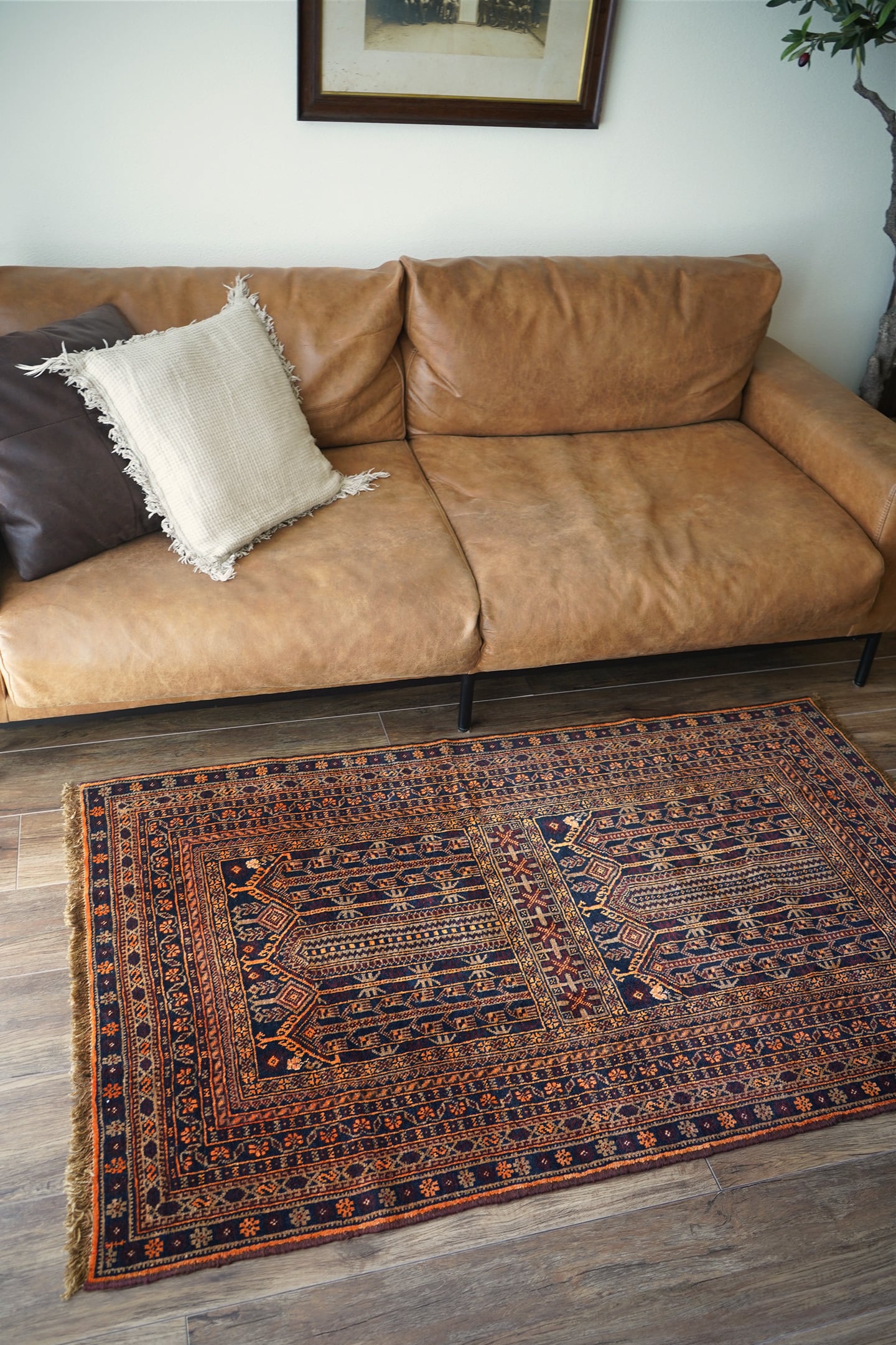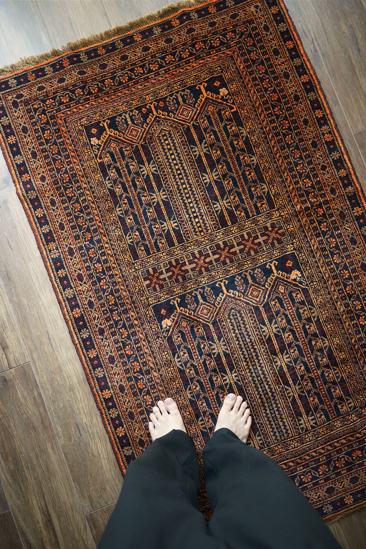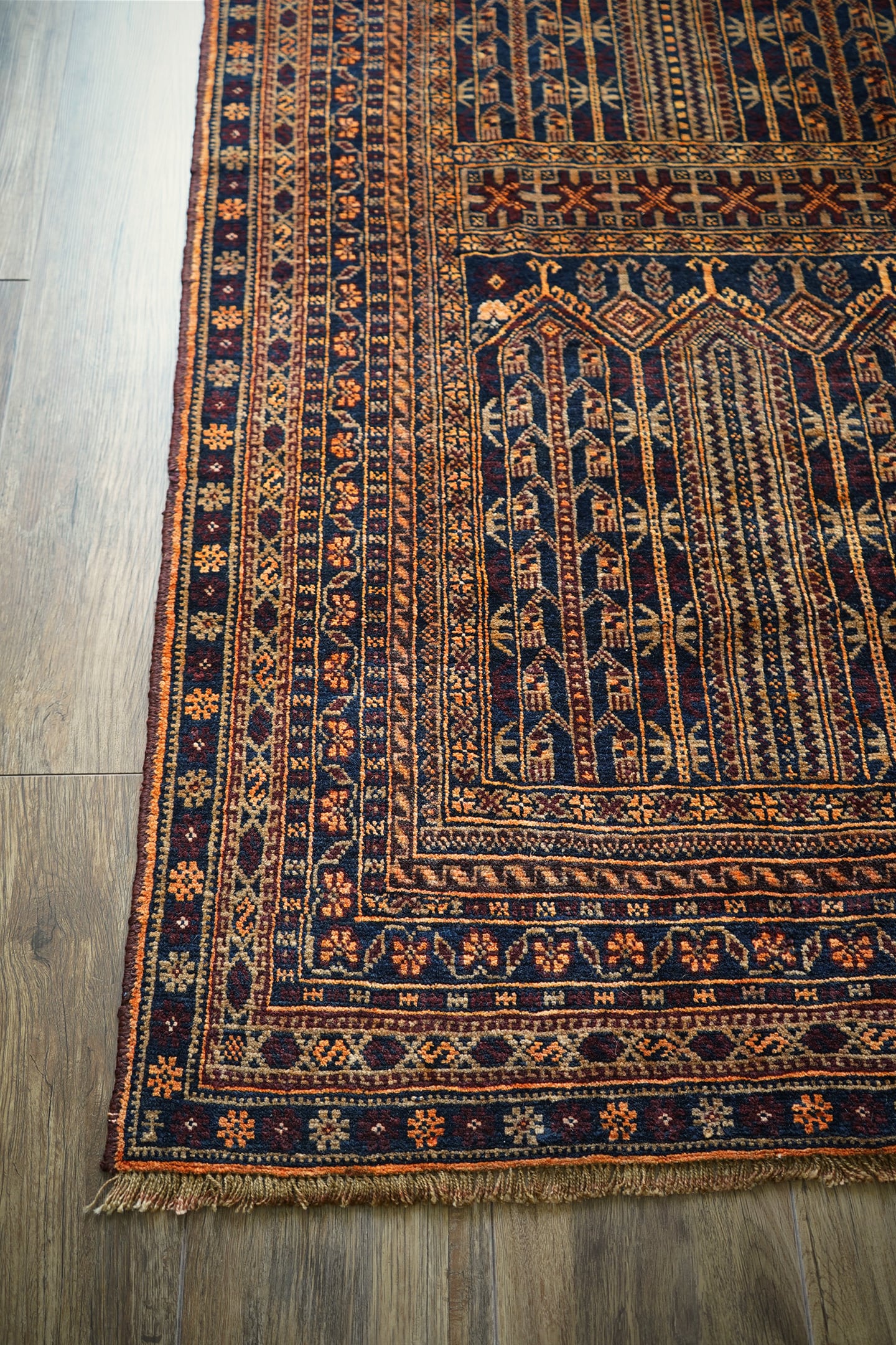約30年ほど前にトルクメン族によって織られたアリホジャラグ。ミフラーブ"と呼ばれるイスラム建築由来の紋様デザインで、繊細な紋様の数々が連続して美しく織り込まれています。厚みは6mm程度で、表面のパイルはふわっと柔らかく優しい肌触りをしています。質感も非常に良く、使用頻度もほとんど感じられないパーフェクトなコンディション。鮮やかなオレンジと濃紺のコントラストが目を惹く一枚で、お部屋にちょっとした色味のアクセントが欲しい方にオススメです。