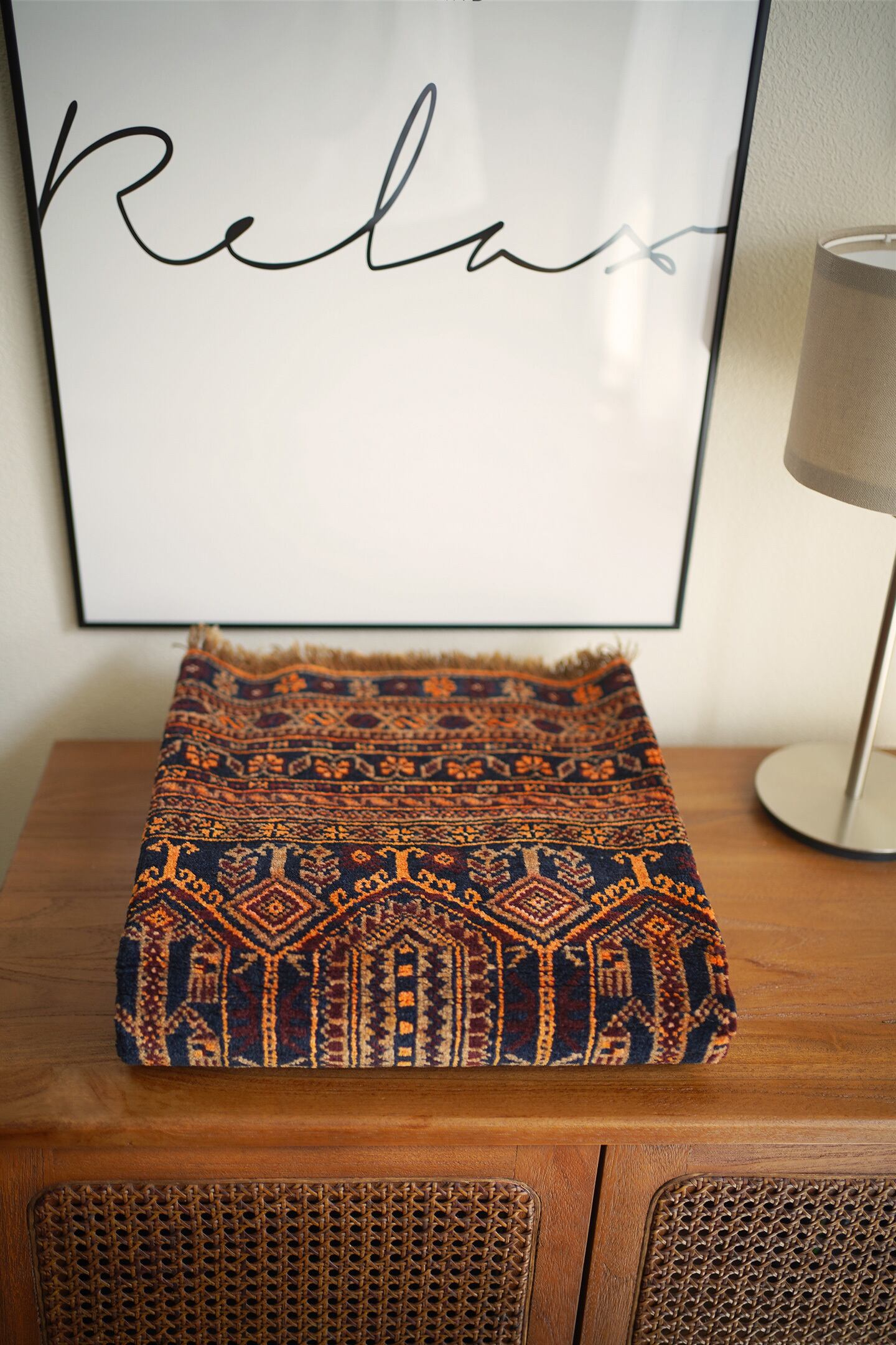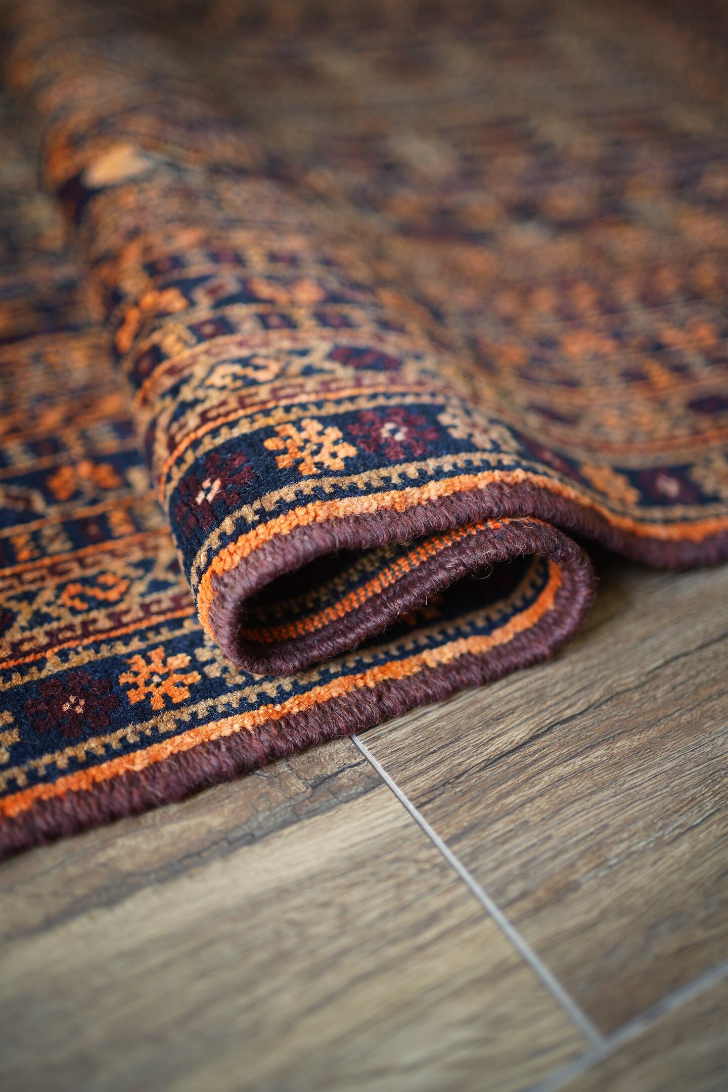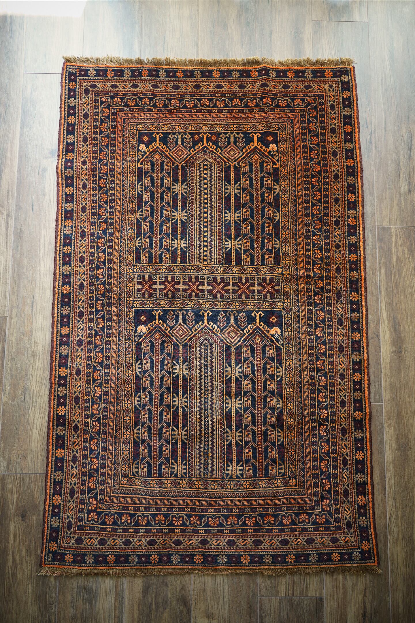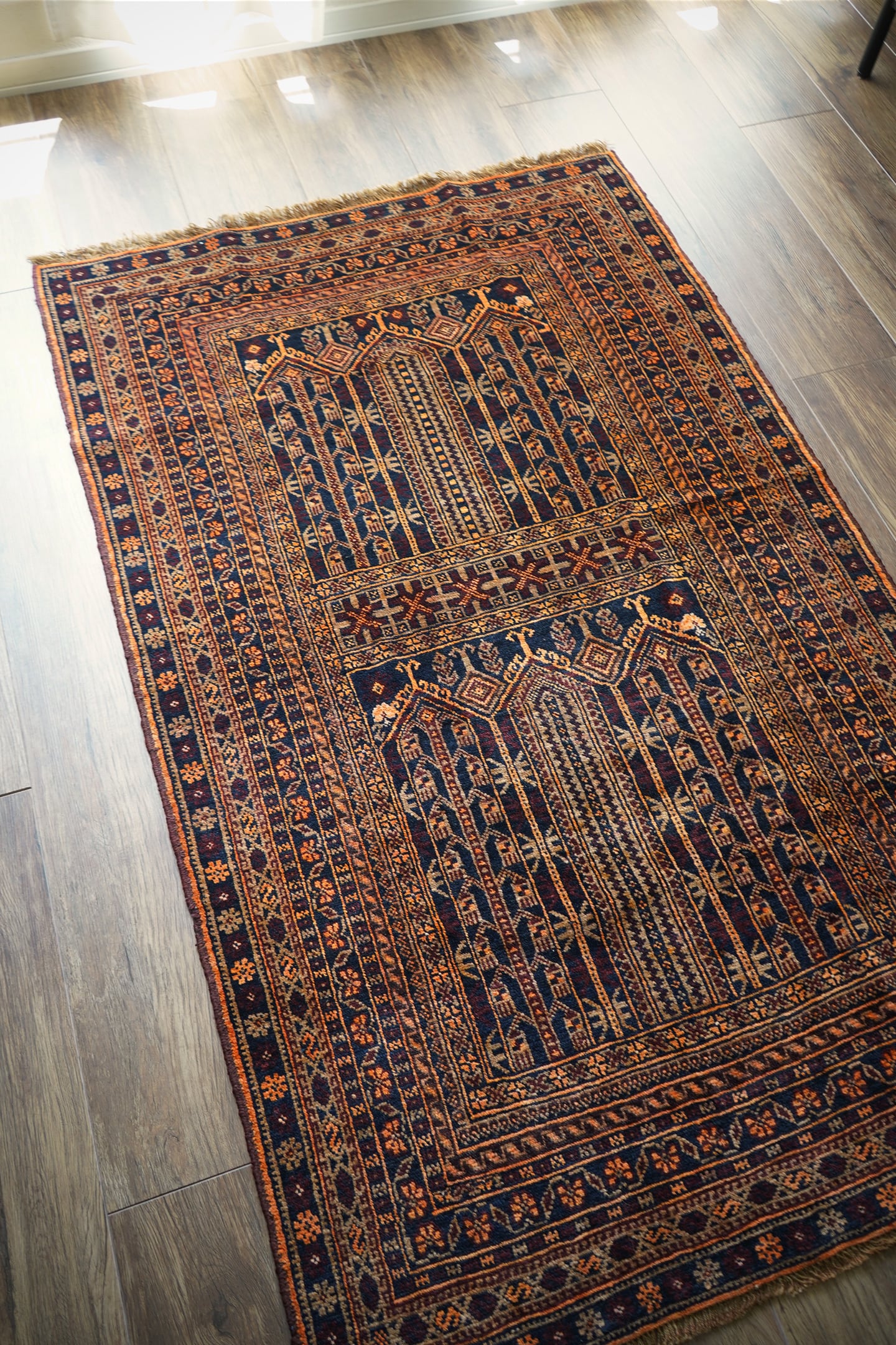 約30年ほど前にトルクメン族によって織られたアリホジャラグ。ミフラーブ"と呼ばれるイスラム建築由来の紋様デザインで、繊細な紋様の数々が連続して美しく織り込まれています。厚みは6mm程度で、表面のパイルはふわっと柔らかく優しい肌触りをしています。質感も非常に良く、使用頻度もほとんど感じられないパーフェクトなコンディション。鮮やかなオレンジと濃紺のコントラストが目を惹く一枚で、お部屋にちょっとした色味のアクセントが欲しい方にオススメです。