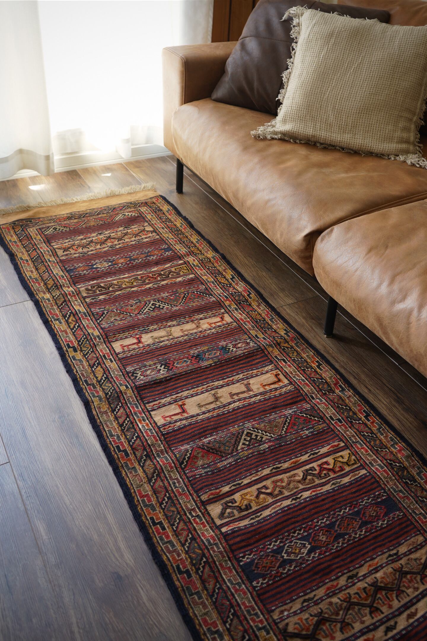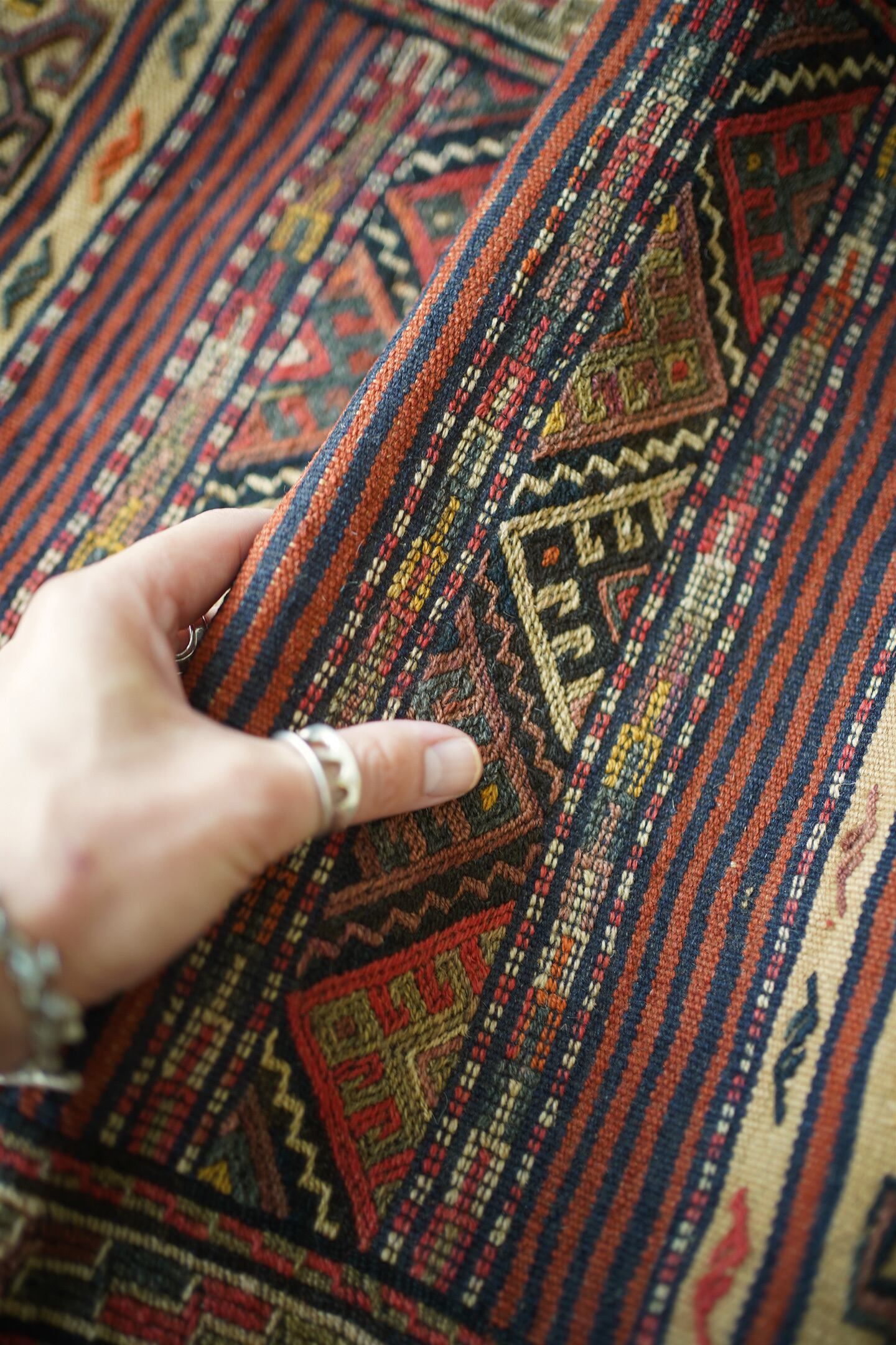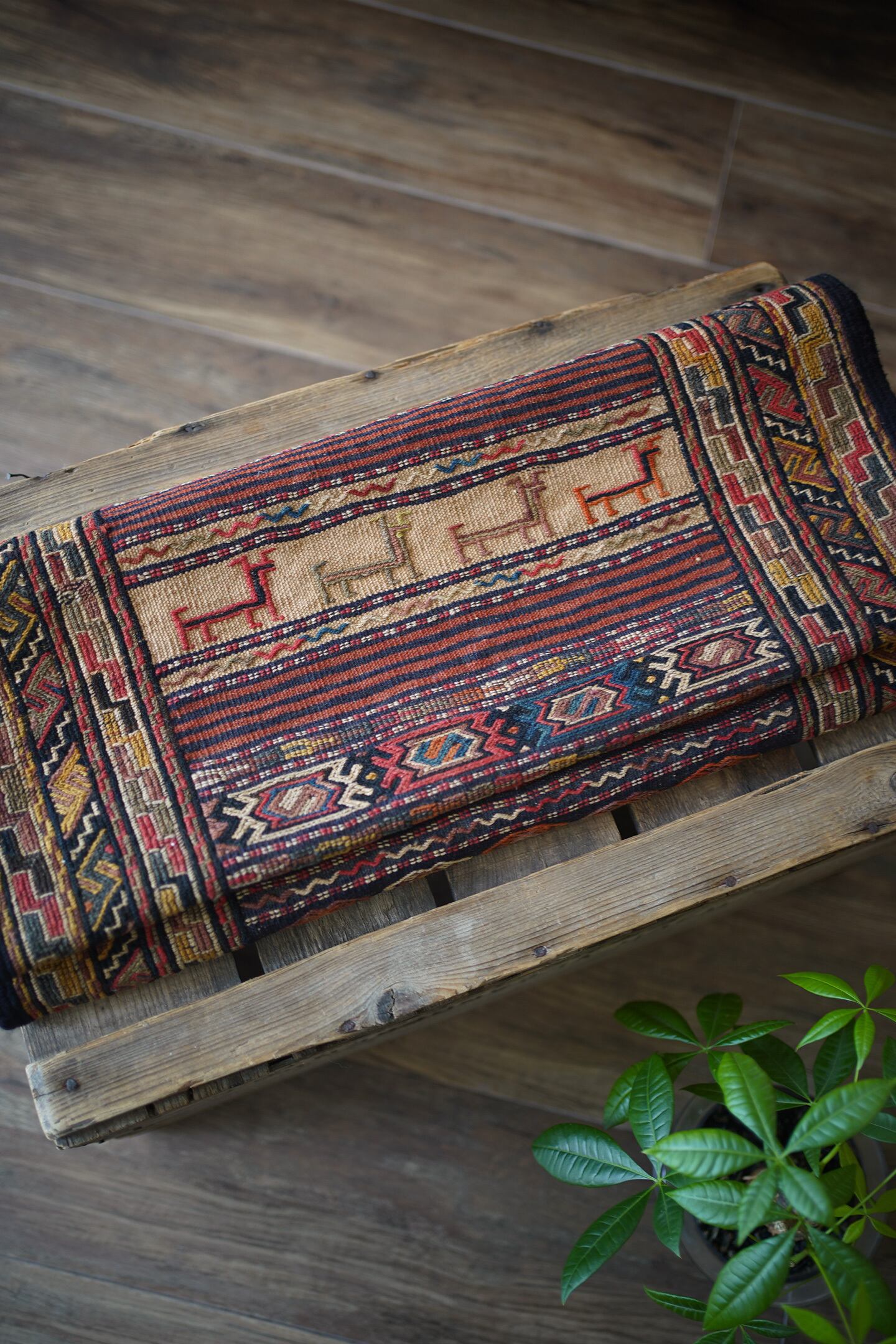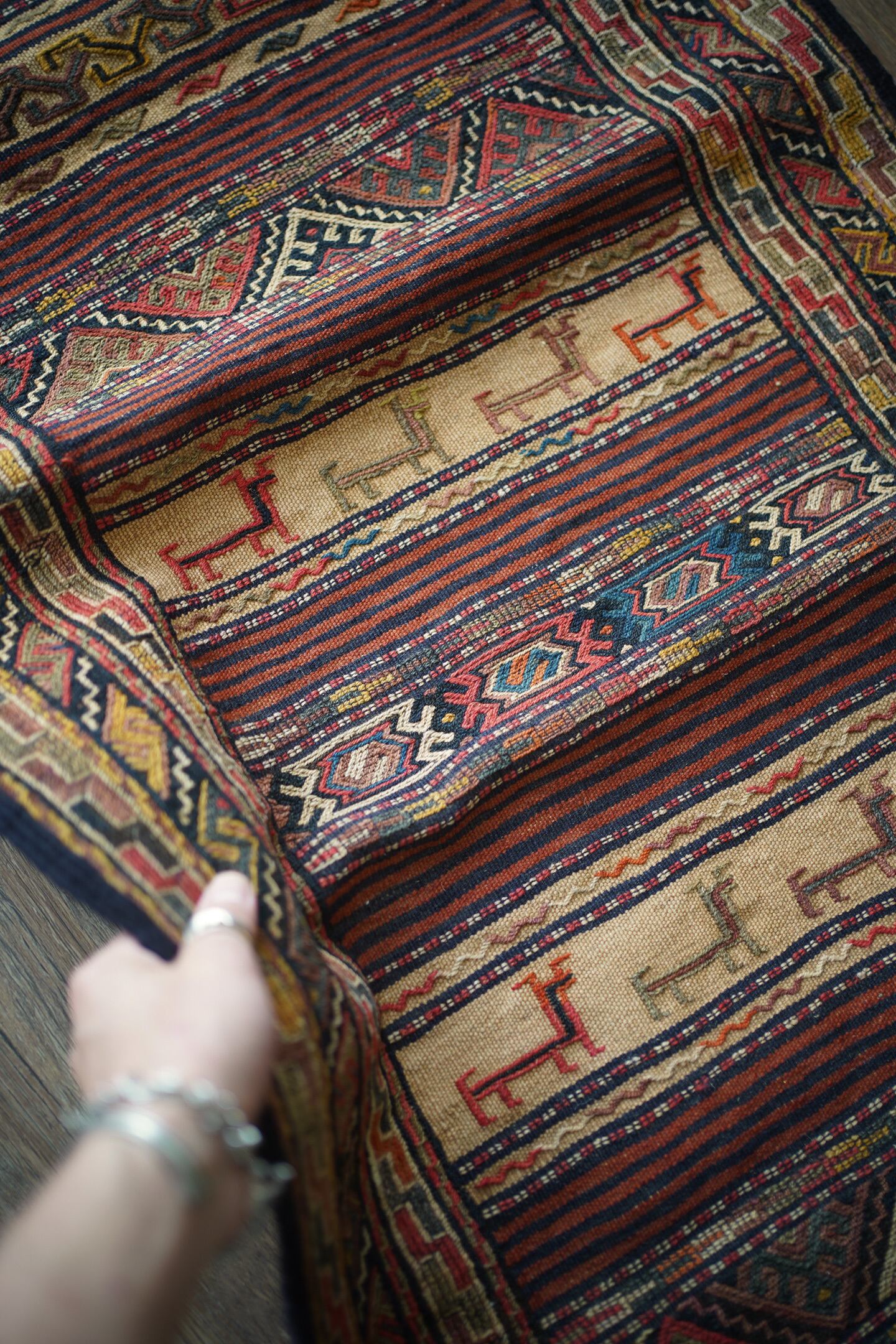トルコ、イラン、イラクなどの国境地域に住むクルド族によって織られた経年30年ほどのキリム。ベージュ、朱色、黄土色、ブラウン、ブラックなどのマルチカラーが魅力的で、ボーダー状に様々なパターンの紋様が織り込まれています。中央あたりには鹿のような動物の紋様も見受けられ可愛らしい一面も。表面はサラッとした乾いた肌触りで、厚みは3mm〜4mm程度。使用感もほとんど見られず、パーフェクトなコンディション。ランナータイプなので幅のあるキャビネット前に敷いたり、廊下や土間、キッチンなどにもよろしいかと思います。