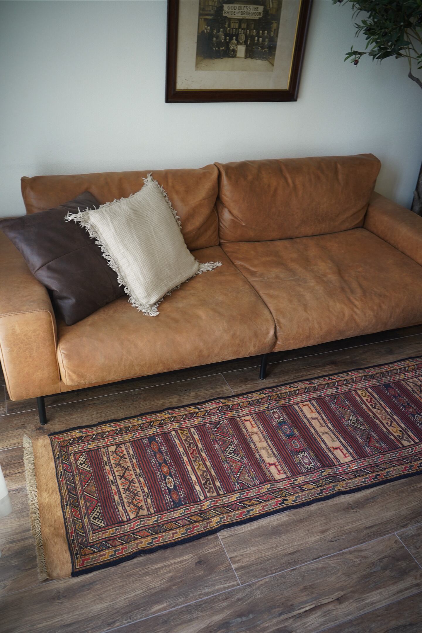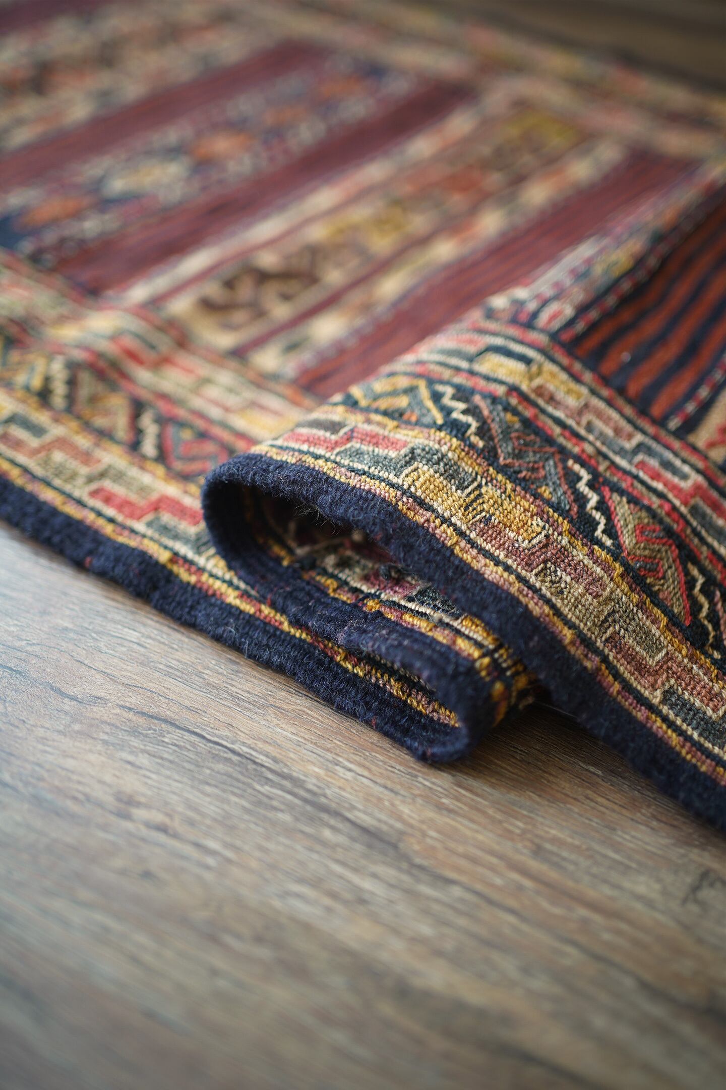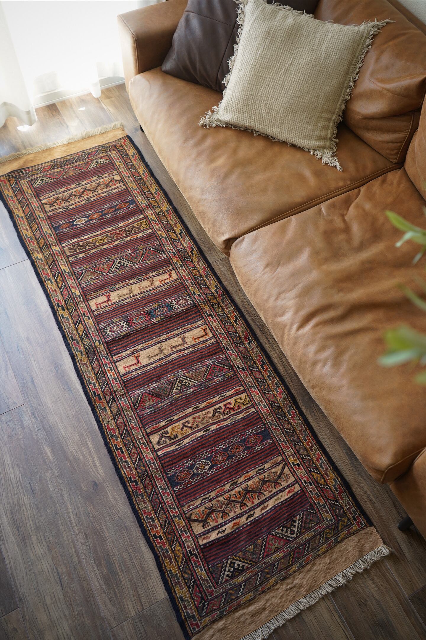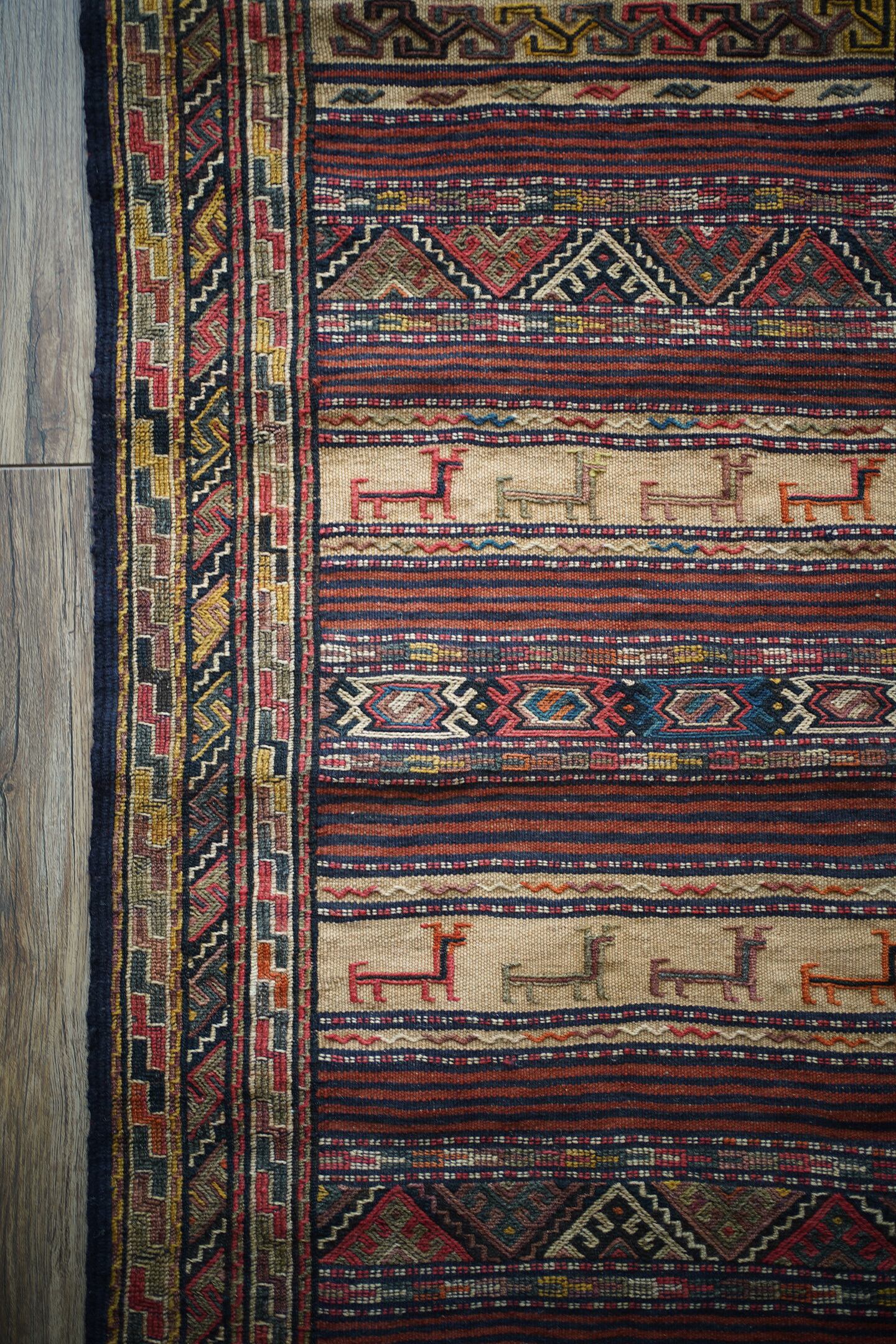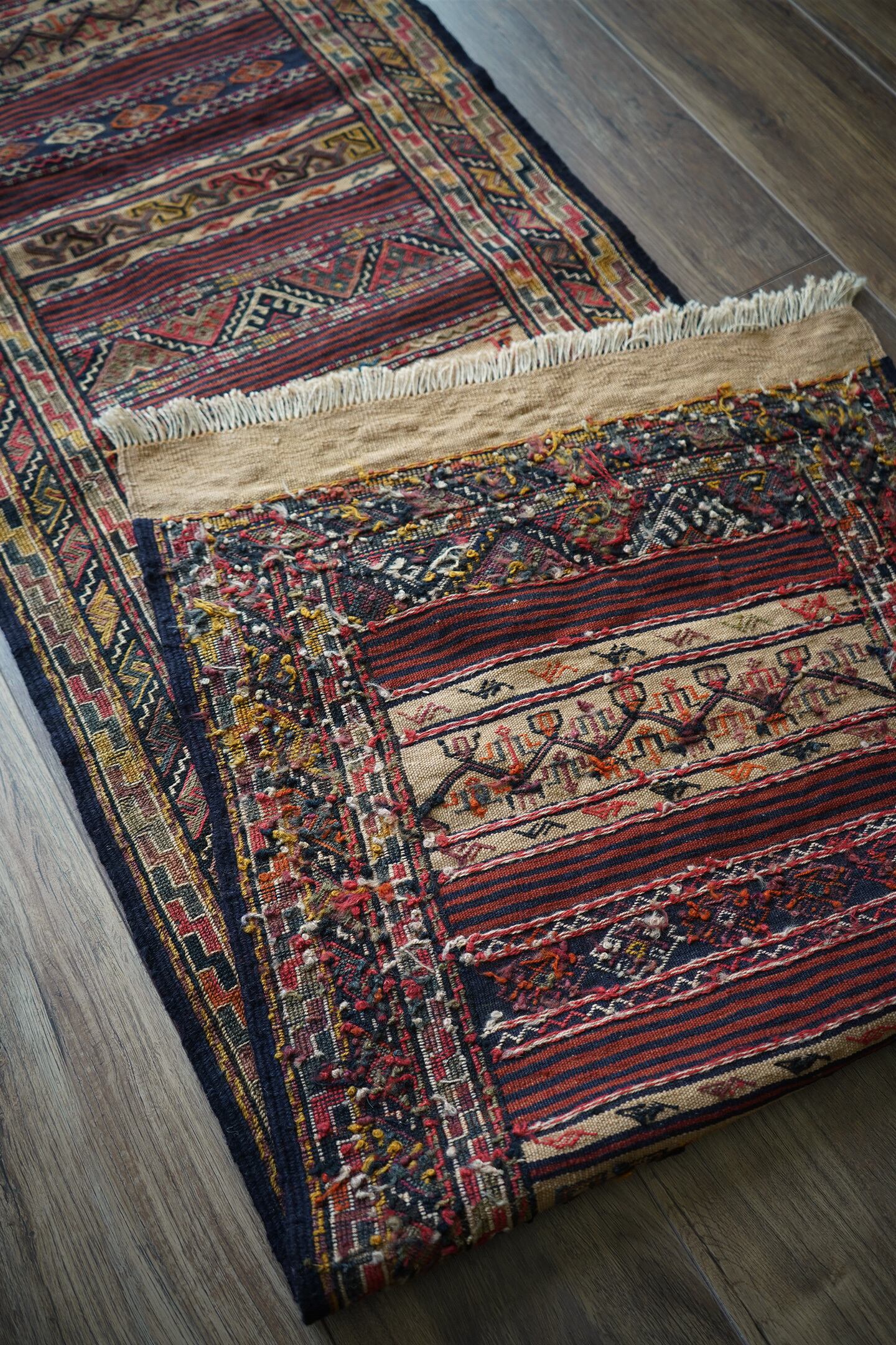 トルコ、イラン、イラクなどの国境地域に住むクルド族によって織られた経年30年ほどのキリム。ベージュ、朱色、黄土色、ブラウン、ブラックなどのマルチカラーが魅力的で、ボーダー状に様々なパターンの紋様が織り込まれています。中央あたりには鹿のような動物の紋様も見受けられ可愛らしい一面も。表面はサラッとした乾いた肌触りで、厚みは3mm〜4mm程度。使用感もほとんど見られず、パーフェクトなコンディション。ランナータイプなので幅のあるキャビネット前に敷いたり、廊下や土間、キッチンなどにもよろしいかと思います。
