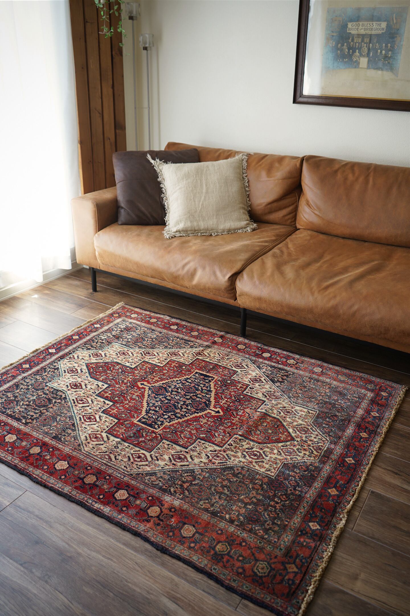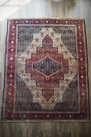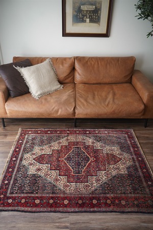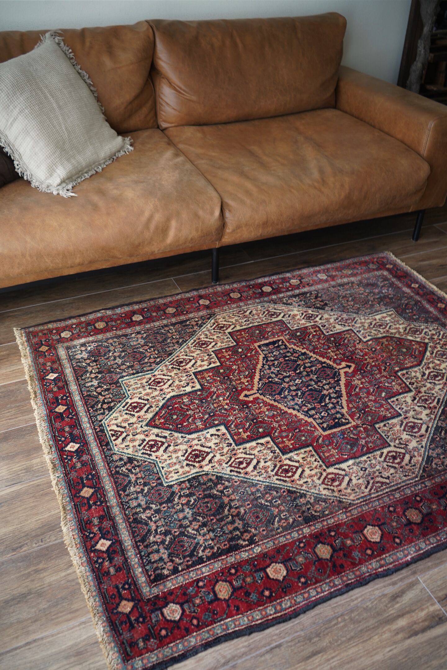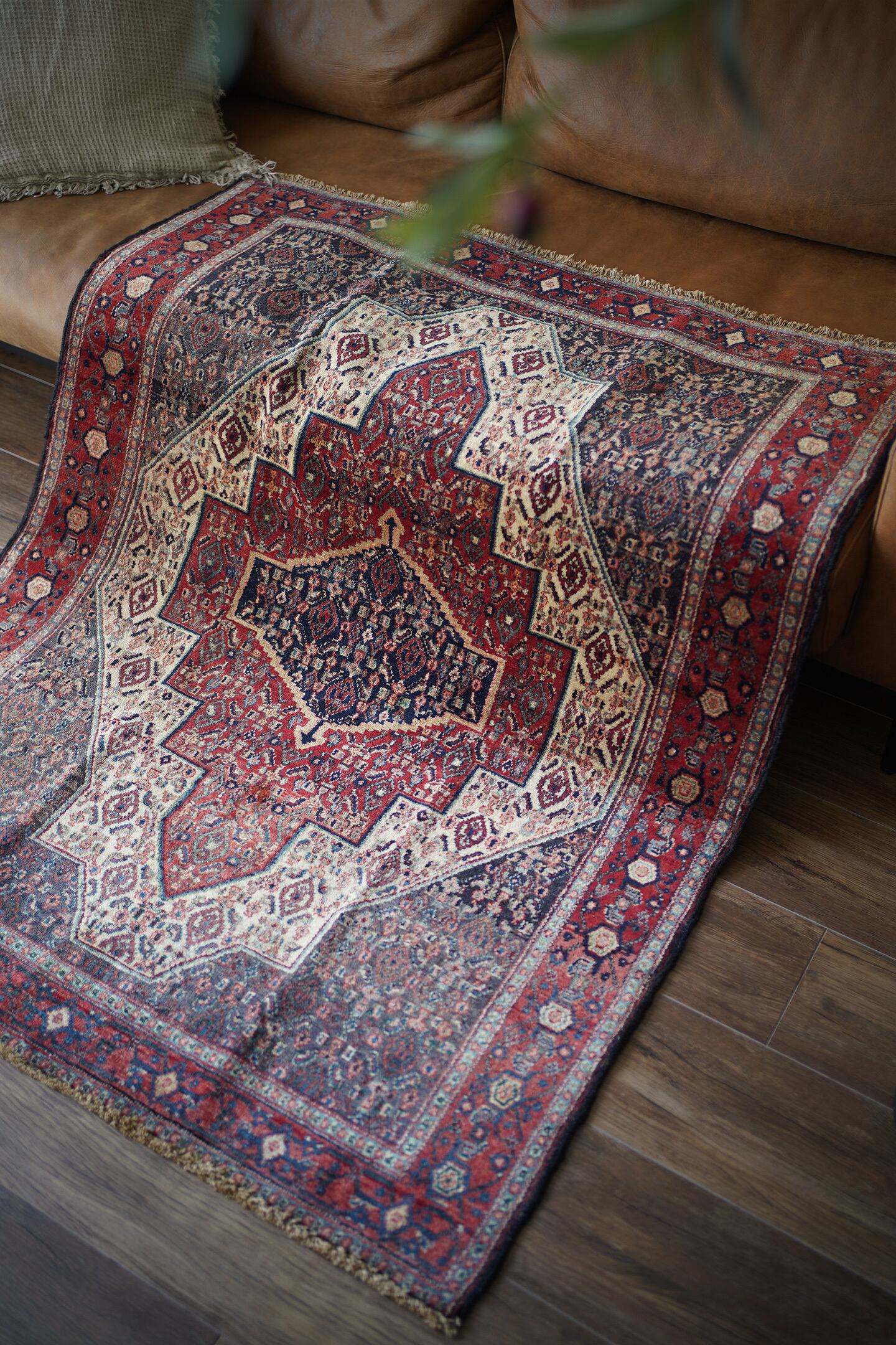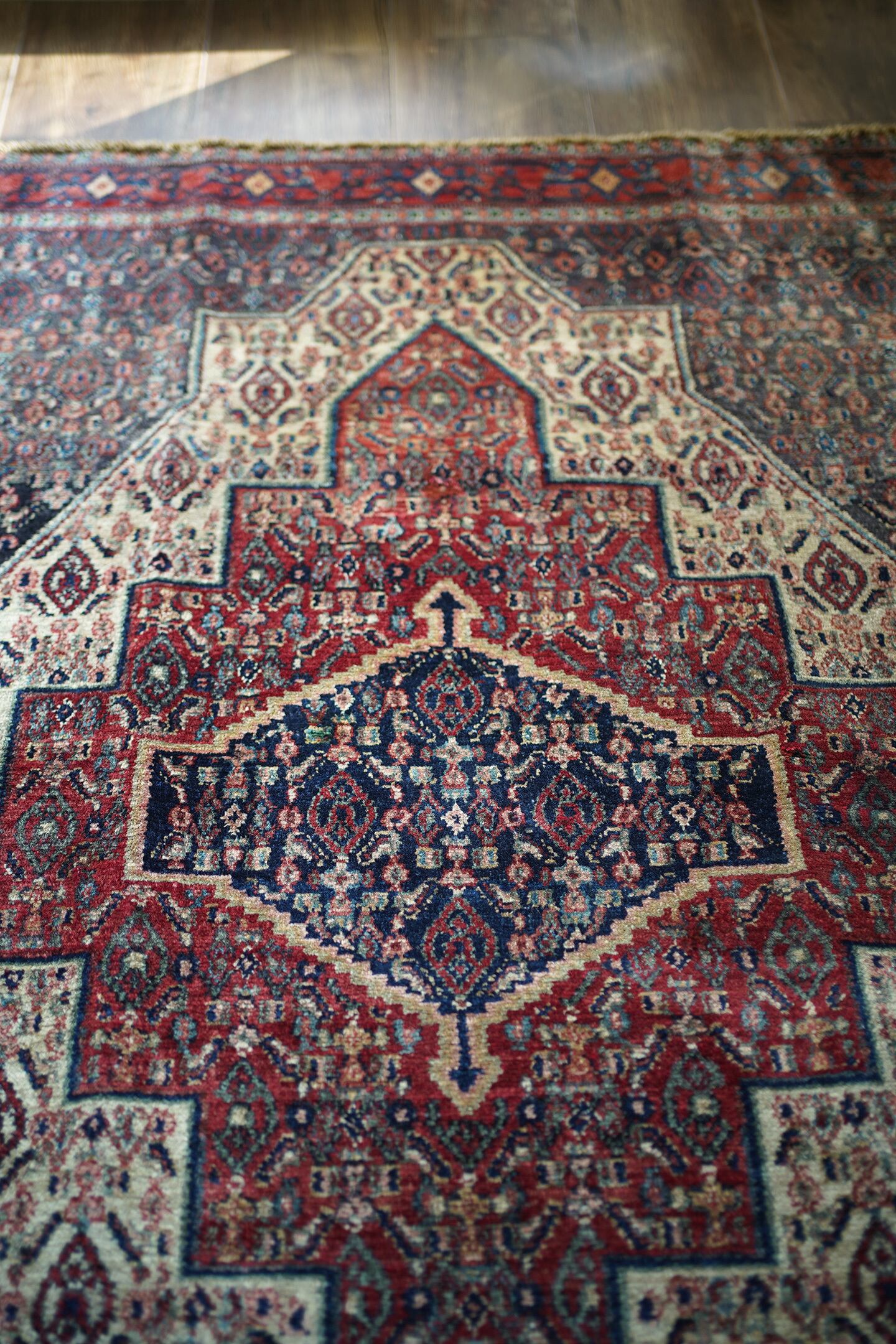 イランの北西部にある絨毯の産地セネ(現:サナンダジ)で織られたヴィンテージラグ。パイルに光が差し込むと薄らとパイルに艶も感じられる美しい一枚で、色褪せたヴィンテージの風合いも持ち合わせており非常に素敵です。配色は濃紺、ピンクレッド、オフホワイト、グレー、淡いピンク、ライトブルーなど。毛足は短めで、表面はサラッと滑らかな肌触り。厚みは5mm〜6mm程度で、程よく重みもありズレる心配もありません。ちょっとしたスペースや小さめのデスク下などにも。