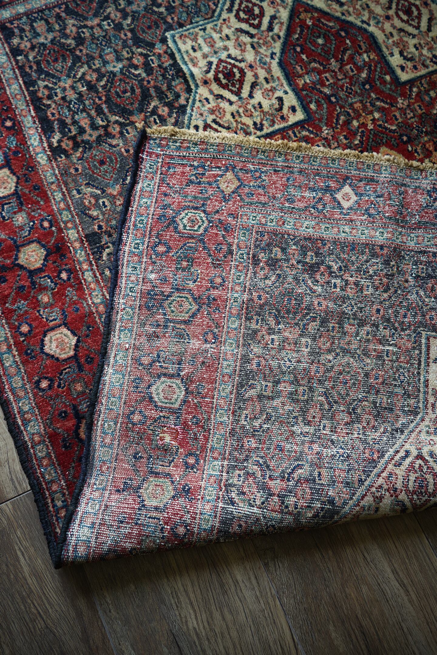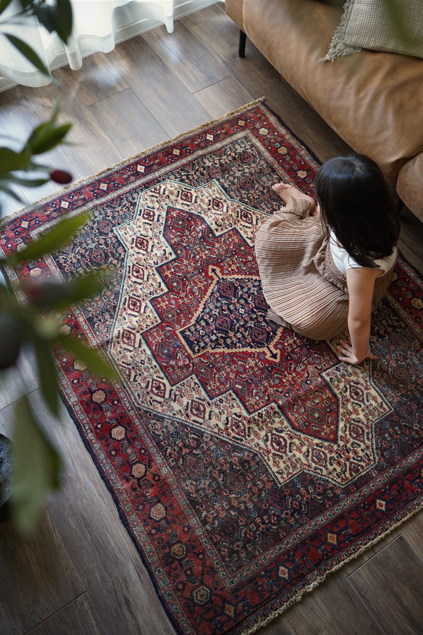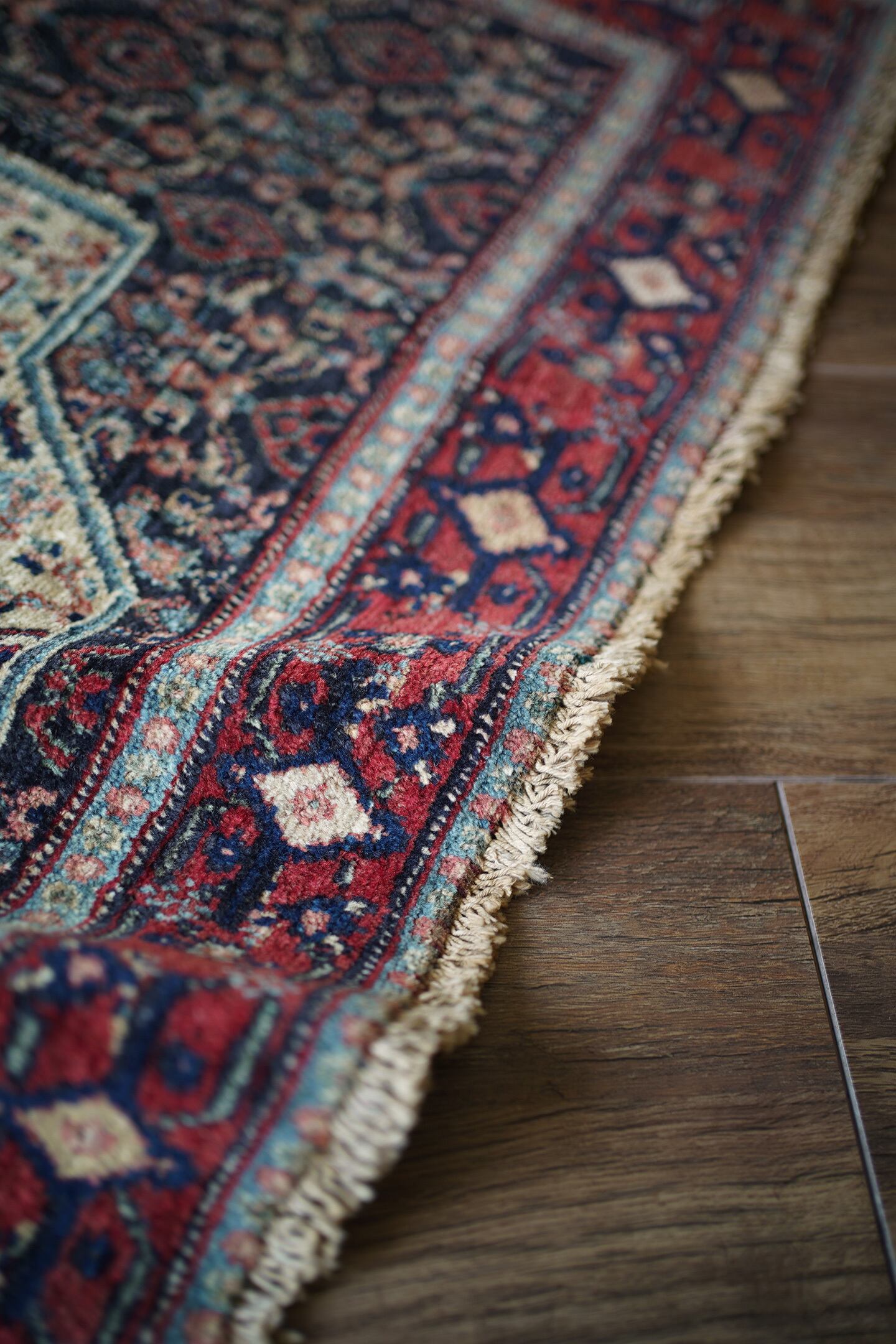 イランの北西部にある絨毯の産地セネ(現:サナンダジ)で織られたヴィンテージラグ。パイルに光が差し込むと薄らとパイルに艶も感じられる美しい一枚で、色褪せたヴィンテージの風合いも持ち合わせており非常に素敵です。配色は濃紺、ピンクレッド、オフホワイト、グレー、淡いピンク、ライトブルーなど。毛足は短めで、表面はサラッと滑らかな肌触り。厚みは5mm〜6mm程度で、程よく重みもありズレる心配もありません。ちょっとしたスペースや小さめのデスク下などにも。