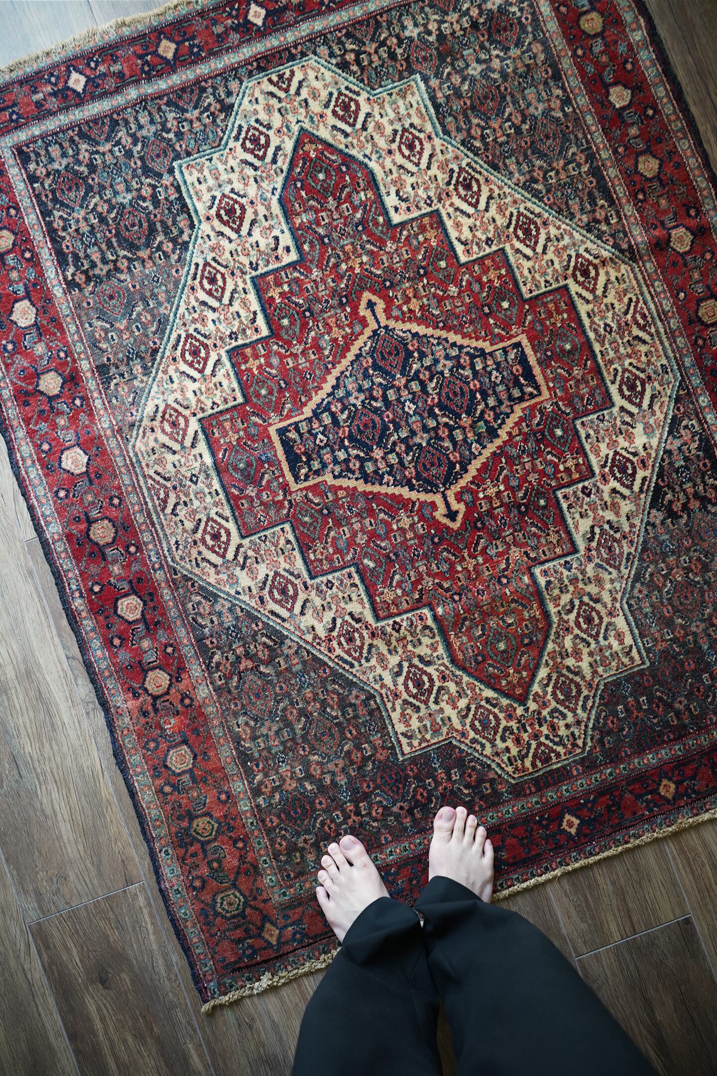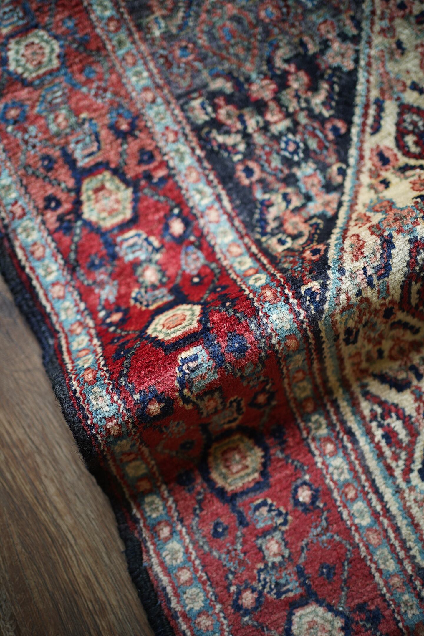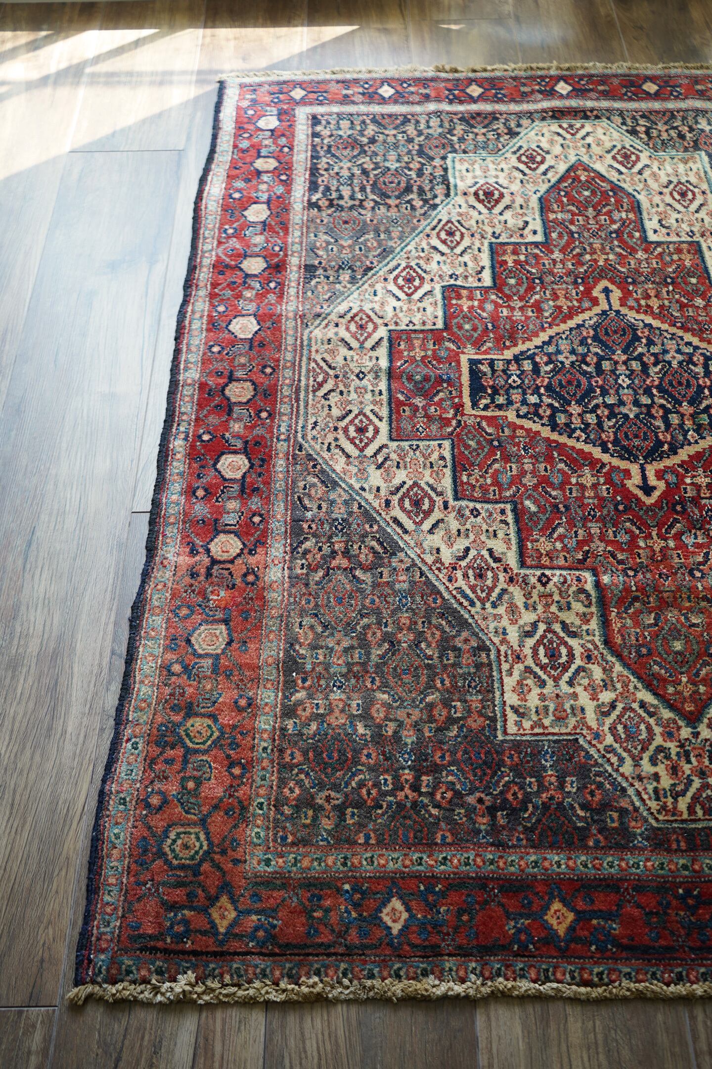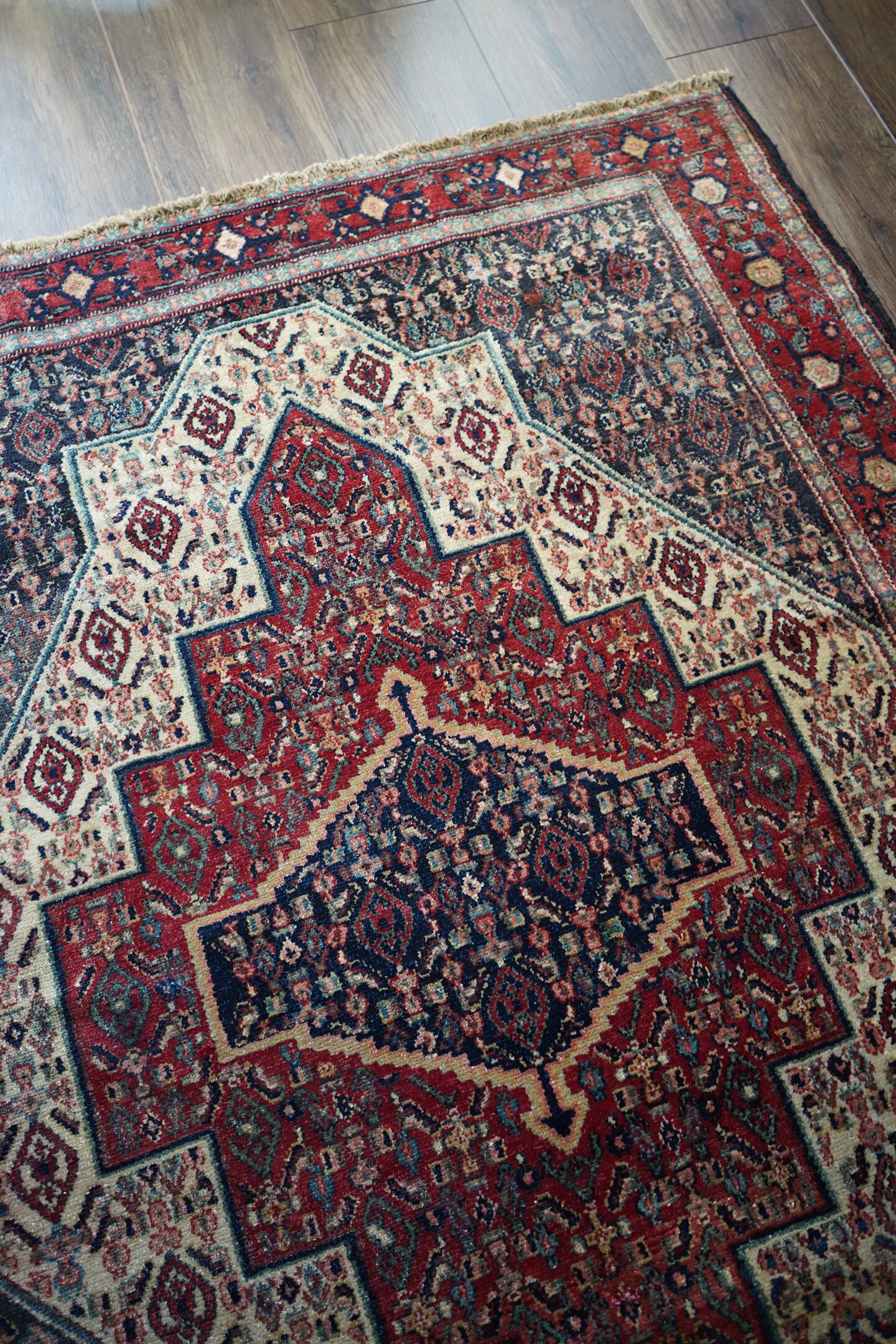 イランの北西部にある絨毯の産地セネ(現:サナンダジ)で織られたヴィンテージラグ。パイルに光が差し込むと薄らとパイルに艶も感じられる美しい一枚で、色褪せたヴィンテージの風合いも持ち合わせており非常に素敵です。配色は濃紺、ピンクレッド、オフホワイト、グレー、淡いピンク、ライトブルーなど。毛足は短めで、表面はサラッと滑らかな肌触り。厚みは5mm〜6mm程度で、程よく重みもありズレる心配もありません。ちょっとしたスペースや小さめのデスク下などにも。