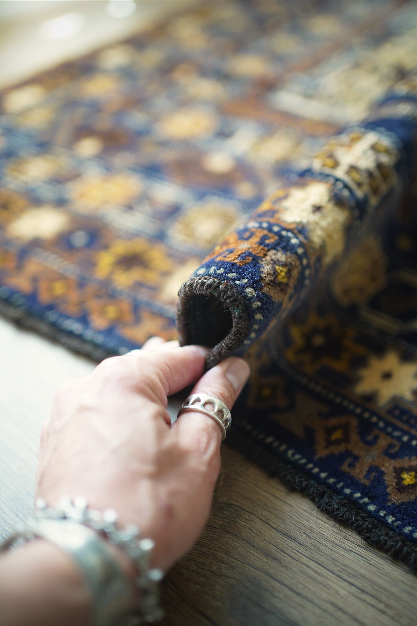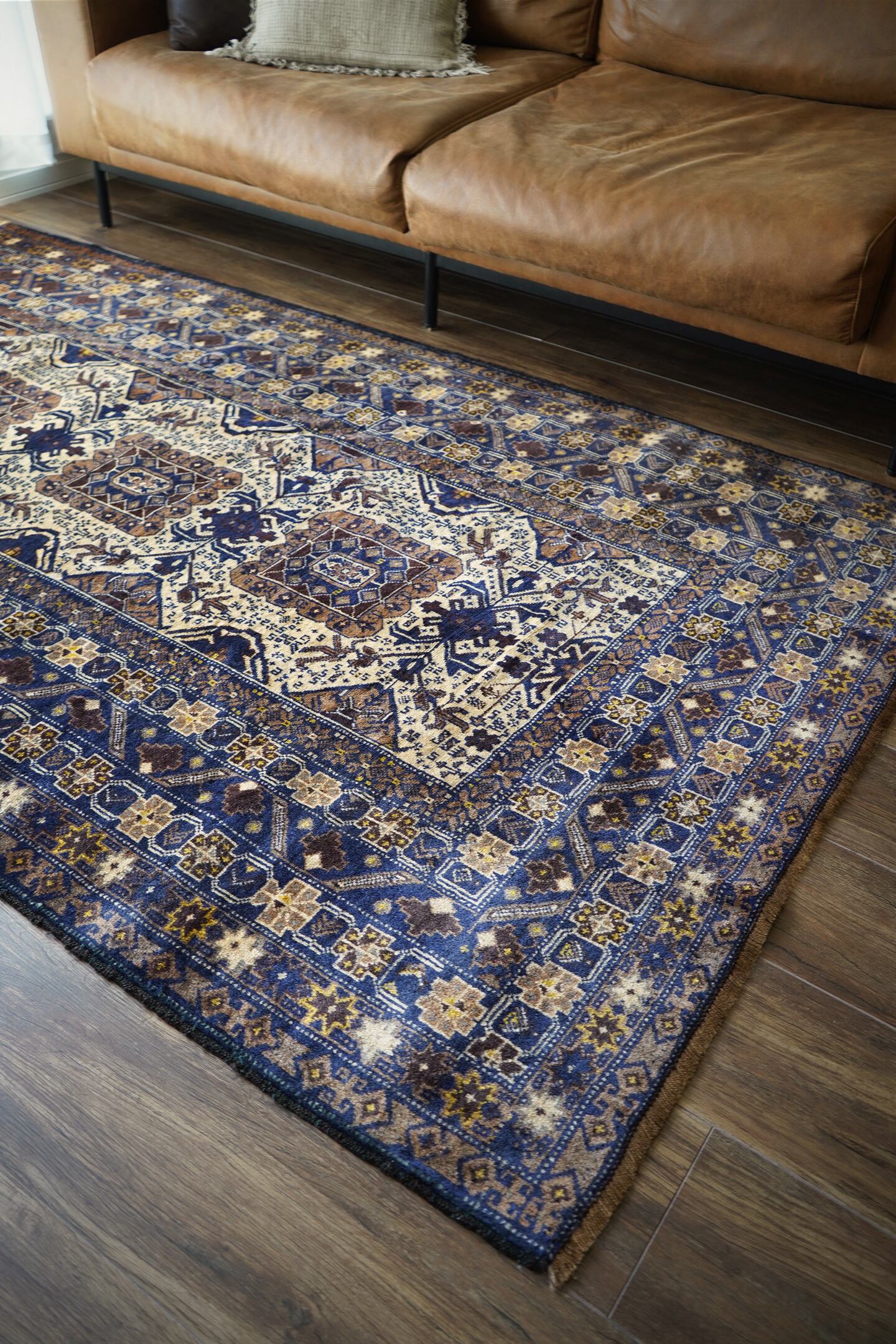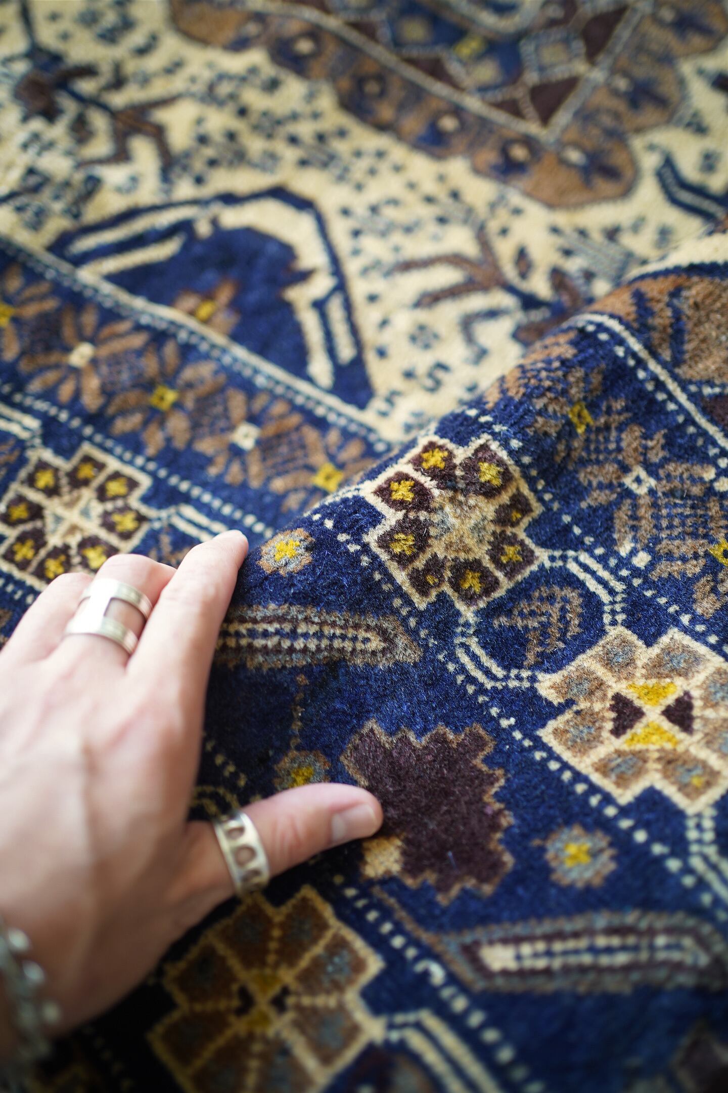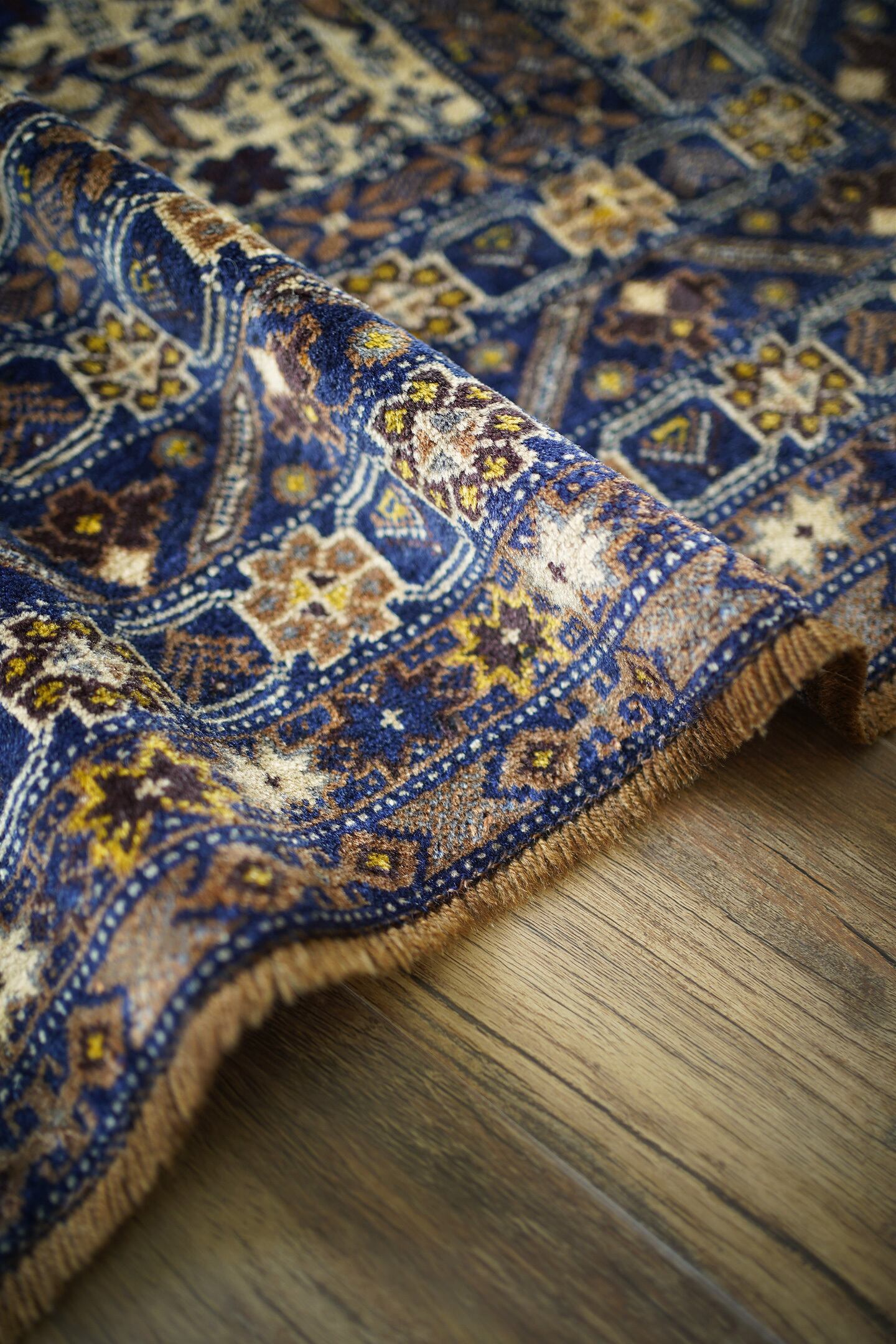 経年約40年のアフガニスタン産のバルーチラグ。落ち着いたネイビーカラーで、太陽光に当たると青々としたブルーに見えます。薄らと艶も感じられる美しいラグで、1枚お部屋に敷くだけで雰囲気もガラッと変わるかと思います。ソフトウールで表面はふわっと柔らかく、滑らかで気持ちの良い肌触り。通年で気持ちよく敷いていただけるかと思います。厚みは5mm程度。ダメージや補修跡もなく、大変良好なコンディション。リビングのソファ前や寝室のベットサイドなどにどうぞ。