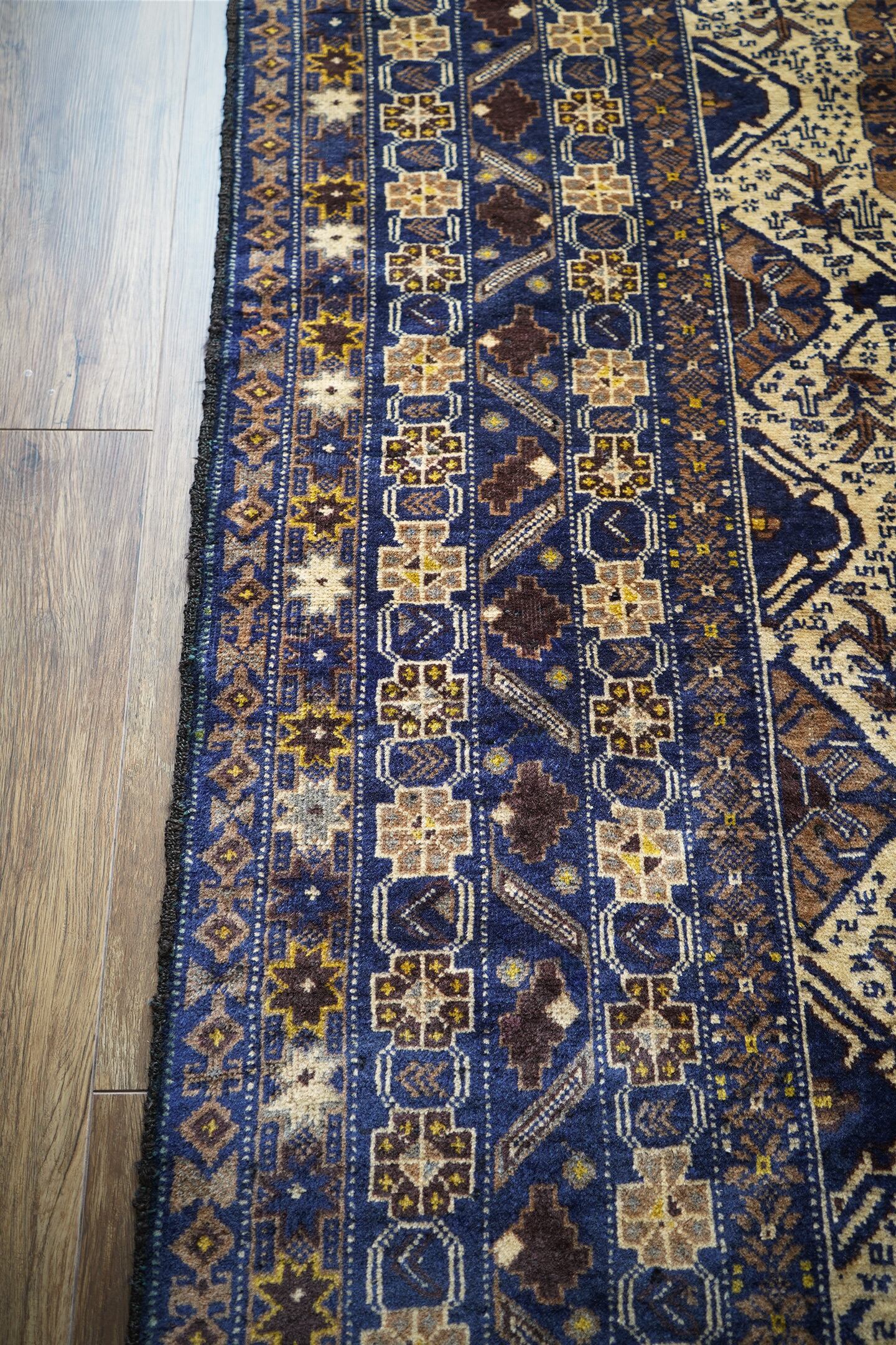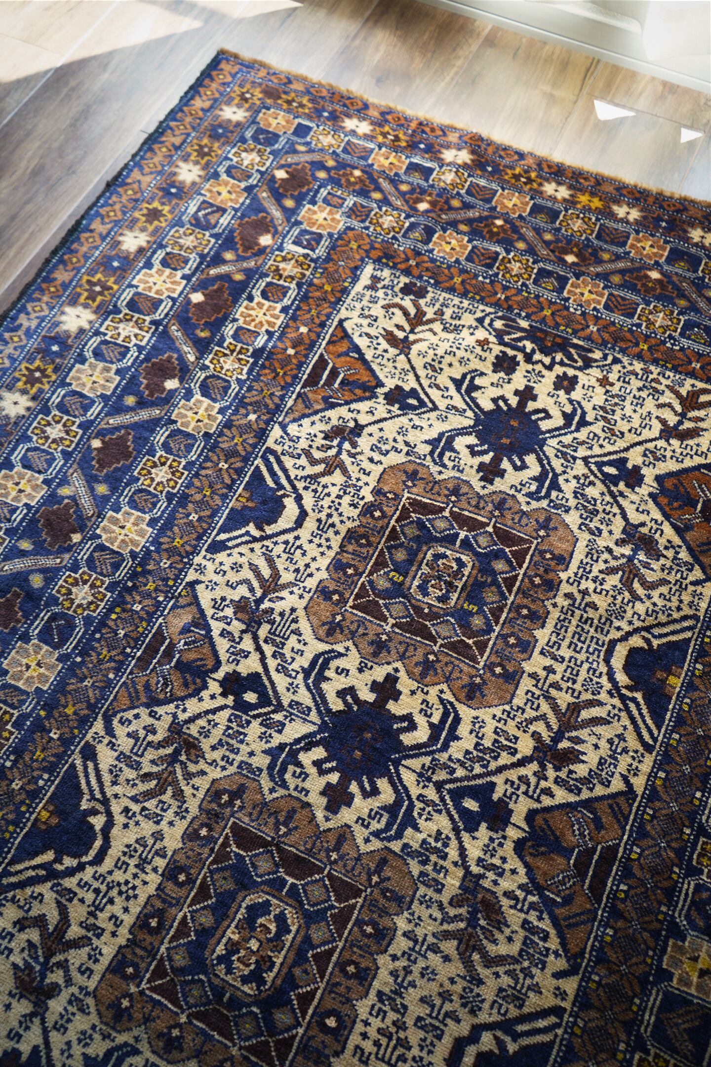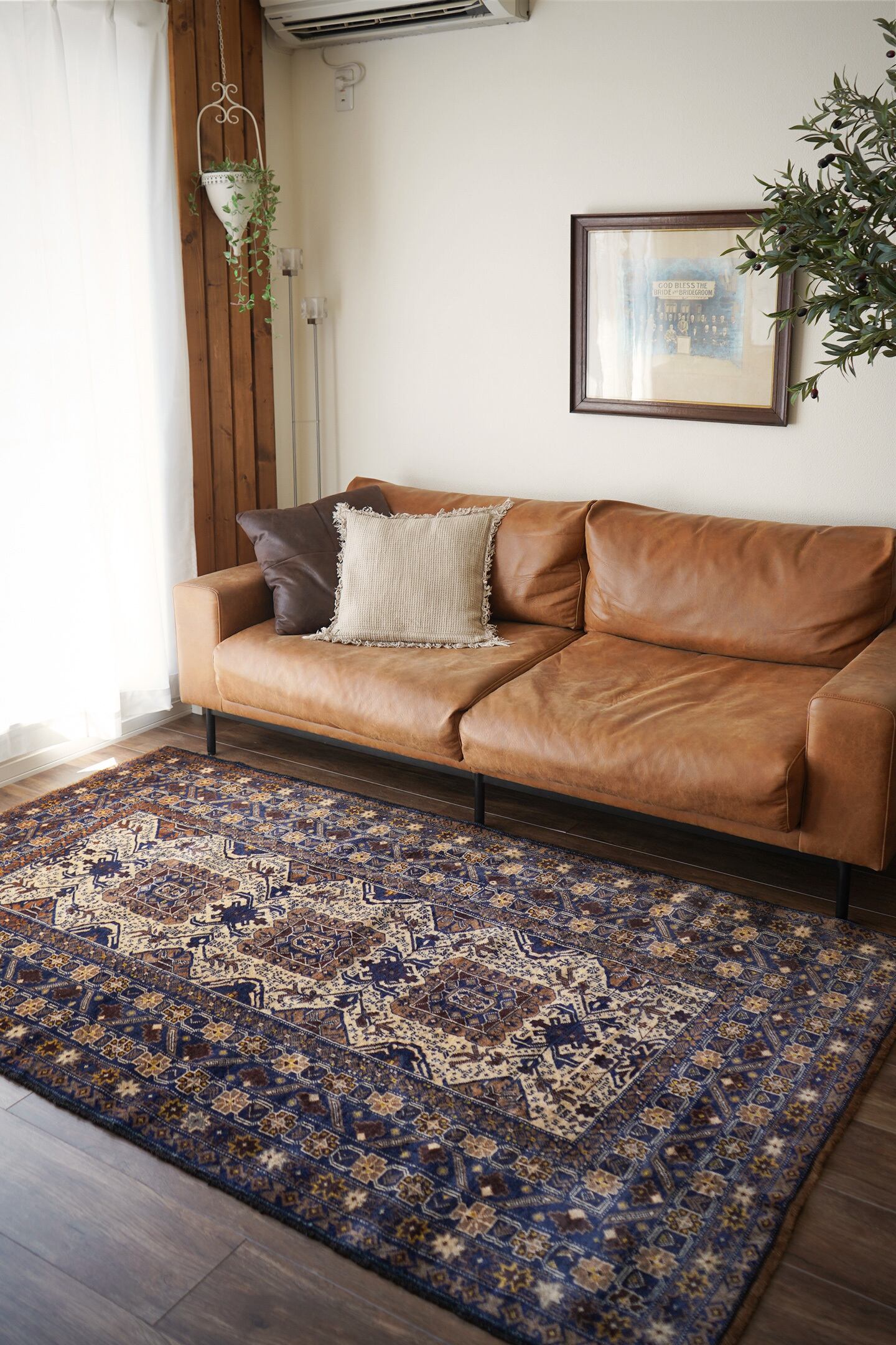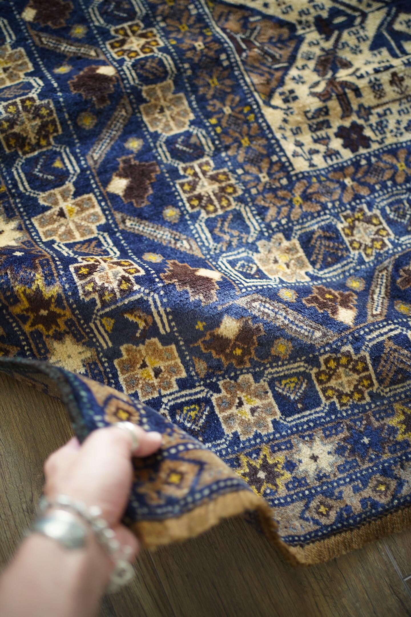経年約40年のアフガニスタン産のバルーチラグ。落ち着いたネイビーカラーで、太陽光に当たると青々としたブルーに見えます。薄らと艶も感じられる美しいラグで、1枚お部屋に敷くだけで雰囲気もガラッと変わるかと思います。ソフトウールで表面はふわっと柔らかく、滑らかで気持ちの良い肌触り。通年で気持ちよく敷いていただけるかと思います。厚みは5mm程度。ダメージや補修跡もなく、大変良好なコンディション。リビングのソファ前や寝室のベットサイドなどにどうぞ。