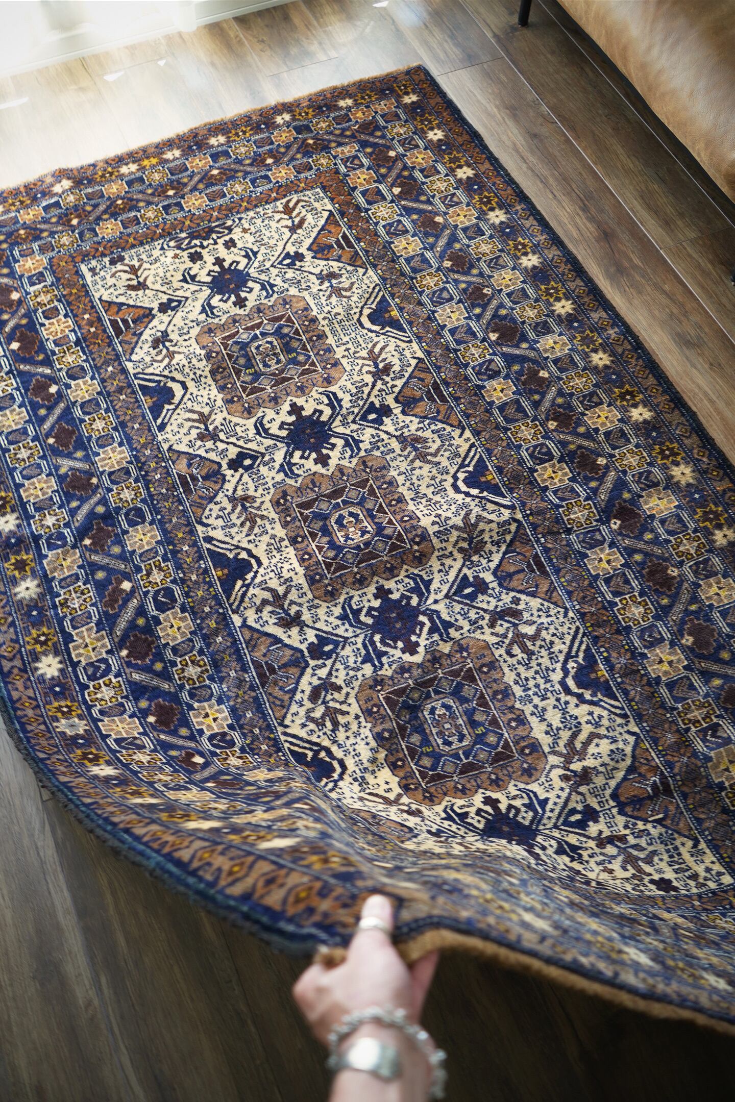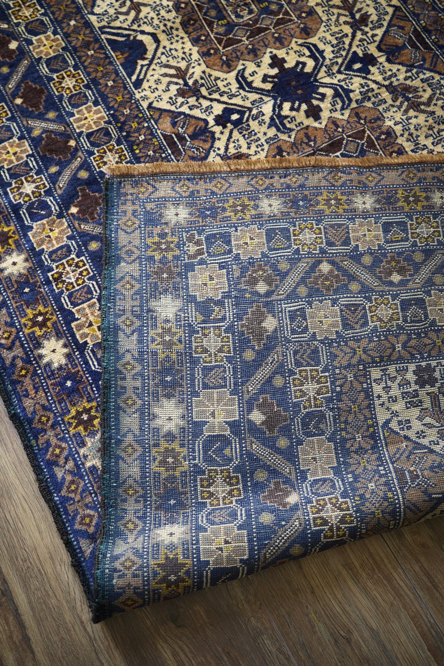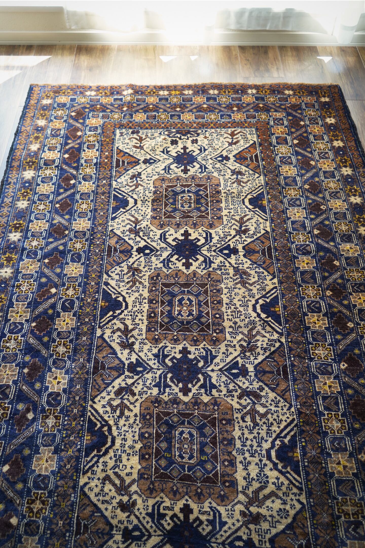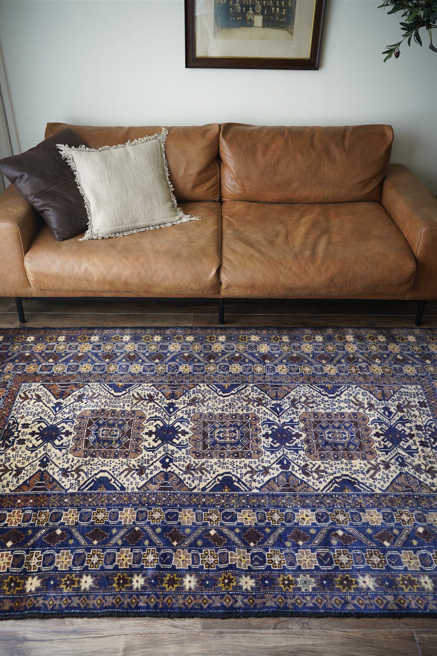 経年約40年のアフガニスタン産のバルーチラグ。落ち着いたネイビーカラーで、太陽光に当たると青々としたブルーに見えます。薄らと艶も感じられる美しいラグで、1枚お部屋に敷くだけで雰囲気もガラッと変わるかと思います。ソフトウールで表面はふわっと柔らかく、滑らかで気持ちの良い肌触り。通年で気持ちよく敷いていただけるかと思います。厚みは5mm程度。ダメージや補修跡もなく、大変良好なコンディション。リビングのソファ前や寝室のベットサイドなどにどうぞ。