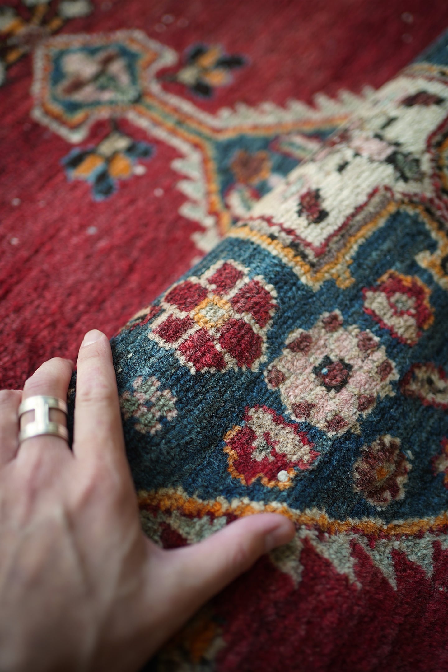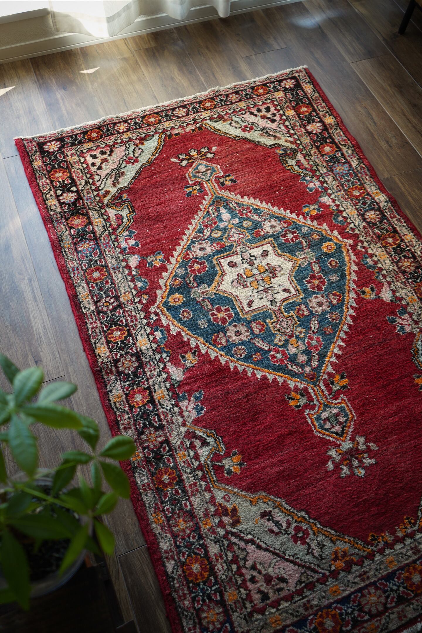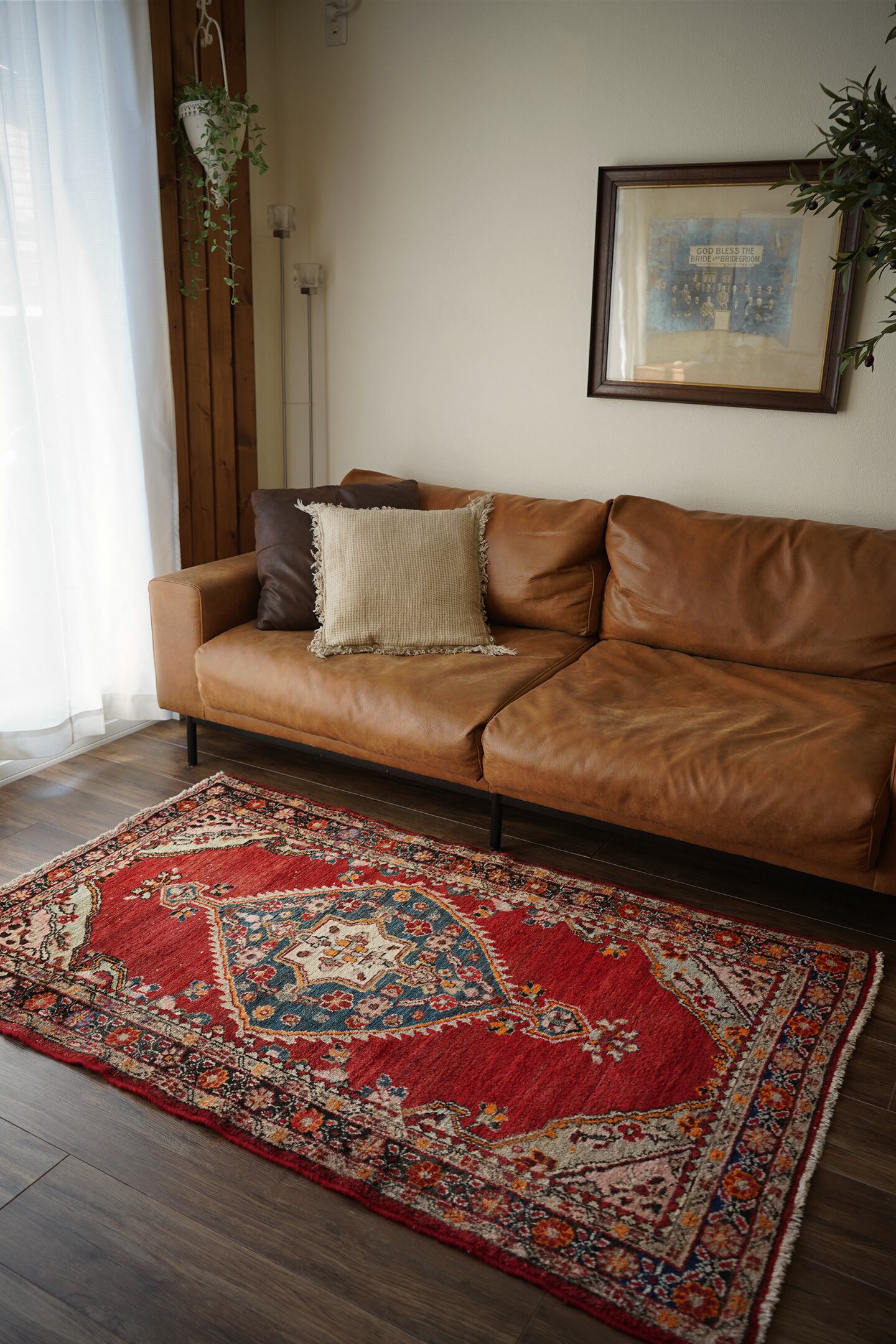 おおよそ40年前に織られたイラン・ハマダン産のヴィンテージラグです。鮮やかな赤にブルーグリーンの可愛らしいメダリオンが目を惹く素敵な一枚。花モチーフの可憐なデザインに、ざっくりしたパイルの質感で素朴な雰囲気も持ち合わせています。表面はサラふわっとした柔らかい肌触りをしており、厚みは8mm程度です。目立ったダメージなどもなく、良好なコンディション。存在感のある魅力的なラグをお探しの方に。