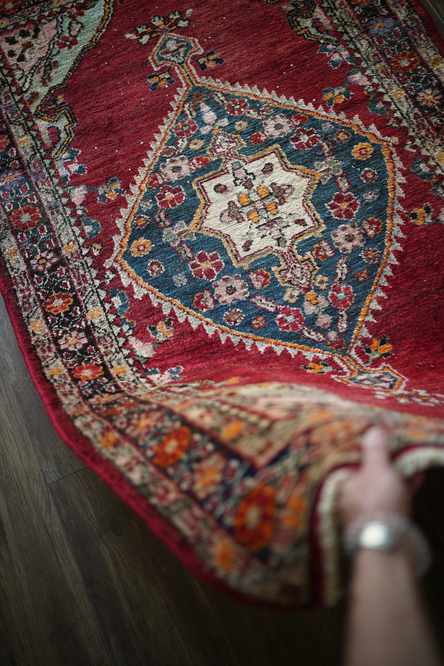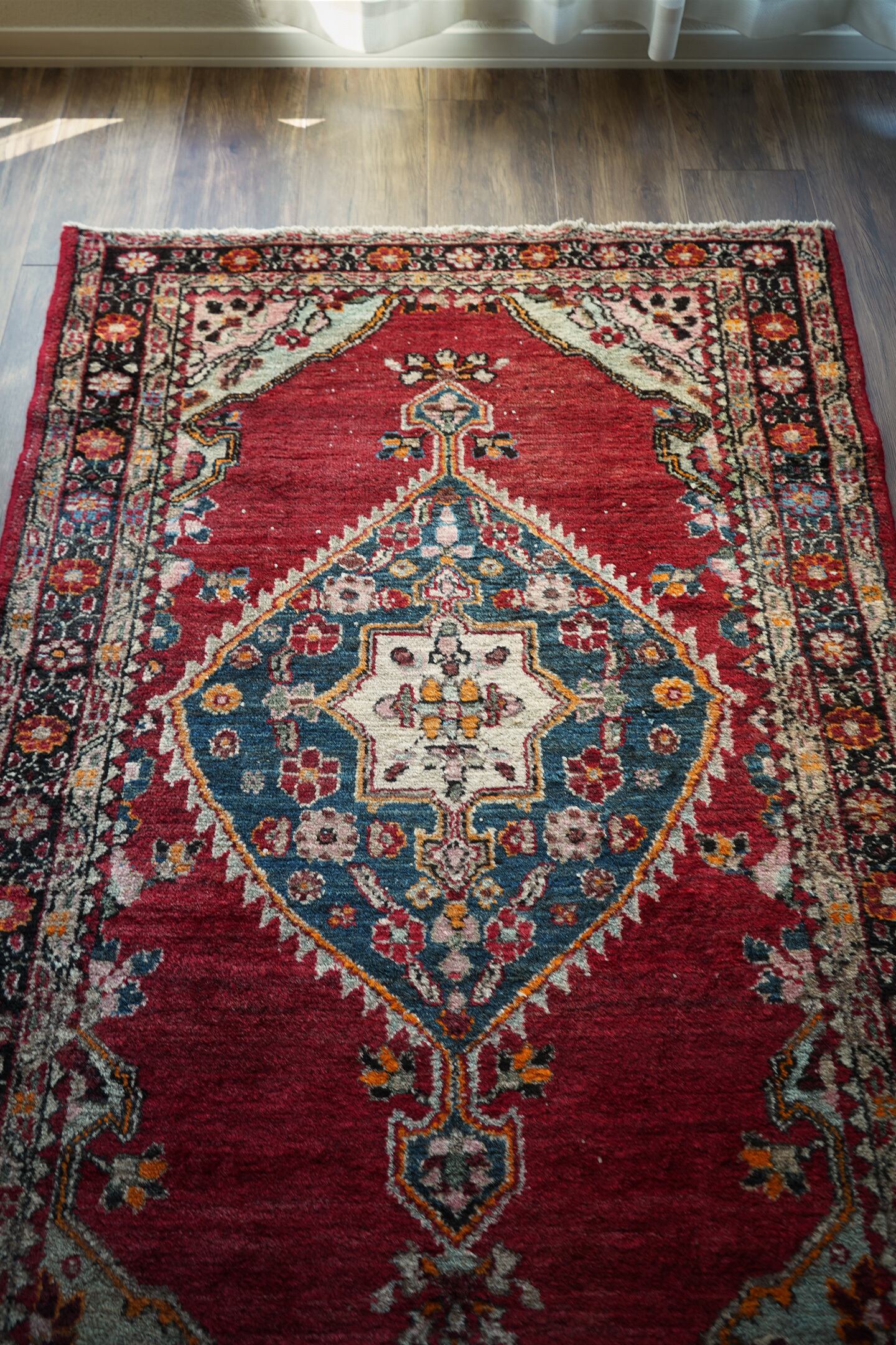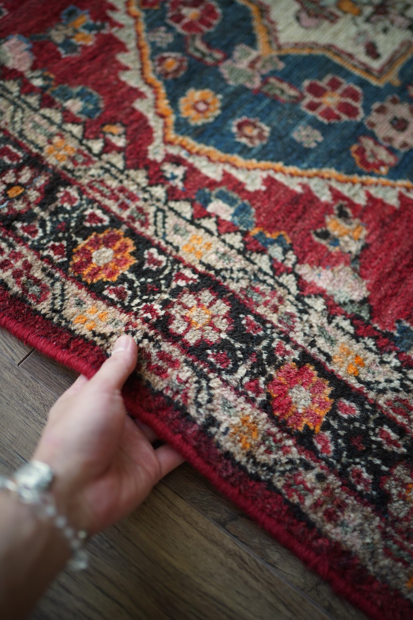 おおよそ40年前に織られたイラン・ハマダン産のヴィンテージラグです。鮮やかな赤にブルーグリーンの可愛らしいメダリオンが目を惹く素敵な一枚。花モチーフの可憐なデザインに、ざっくりしたパイルの質感で素朴な雰囲気も持ち合わせています。表面はサラふわっとした柔らかい肌触りをしており、厚みは8mm程度です。目立ったダメージなどもなく、良好なコンディション。存在感のある魅力的なラグをお探しの方に。