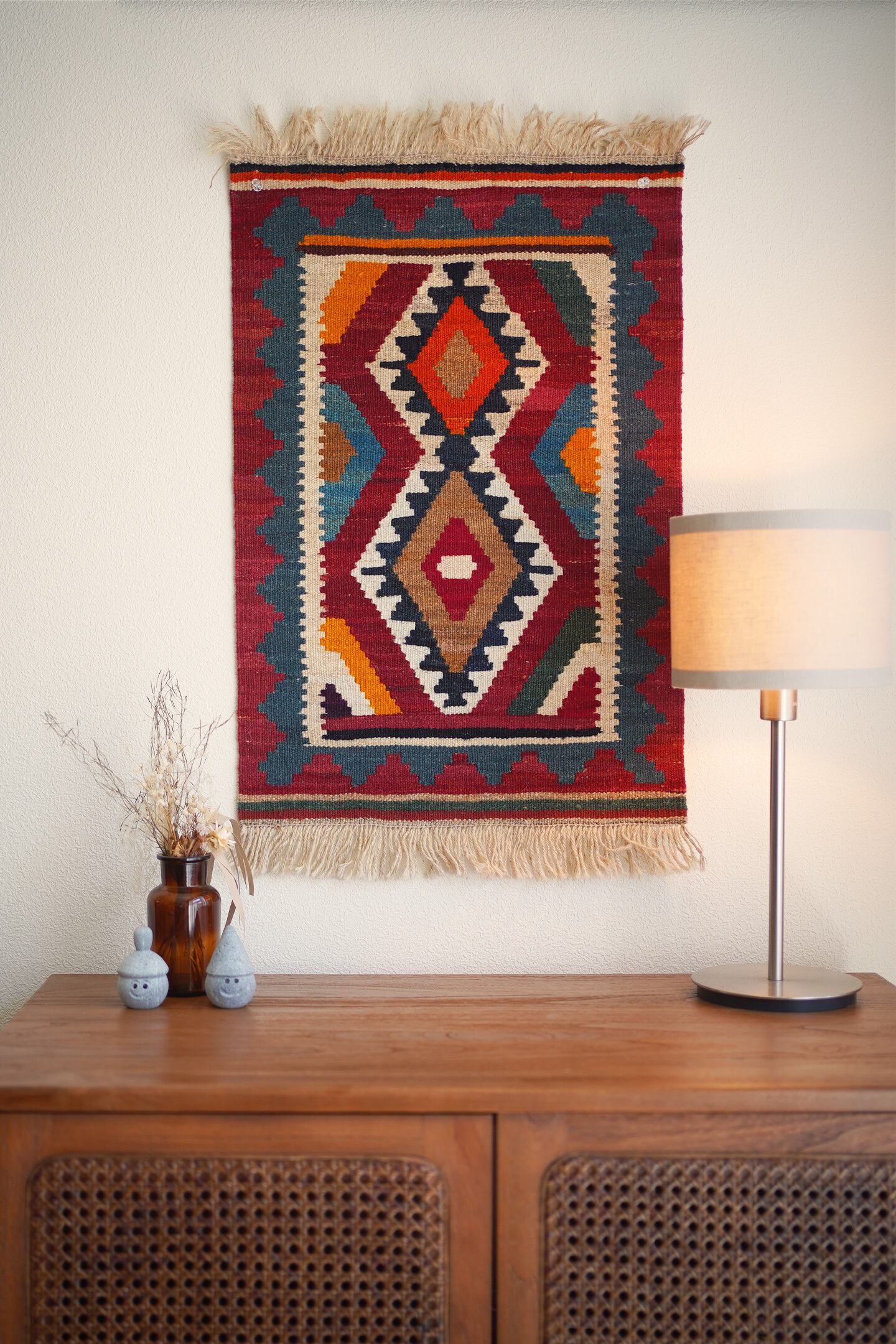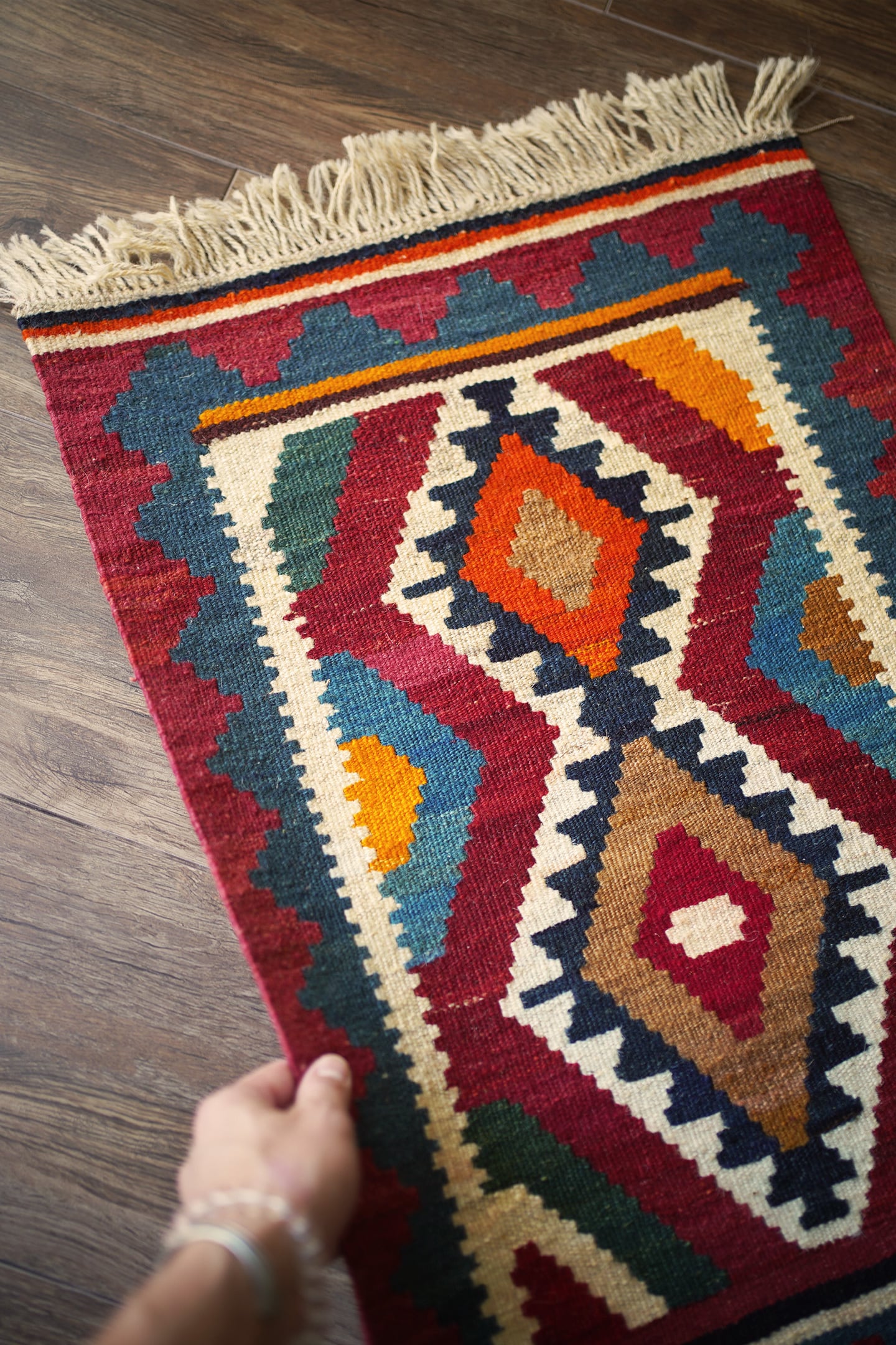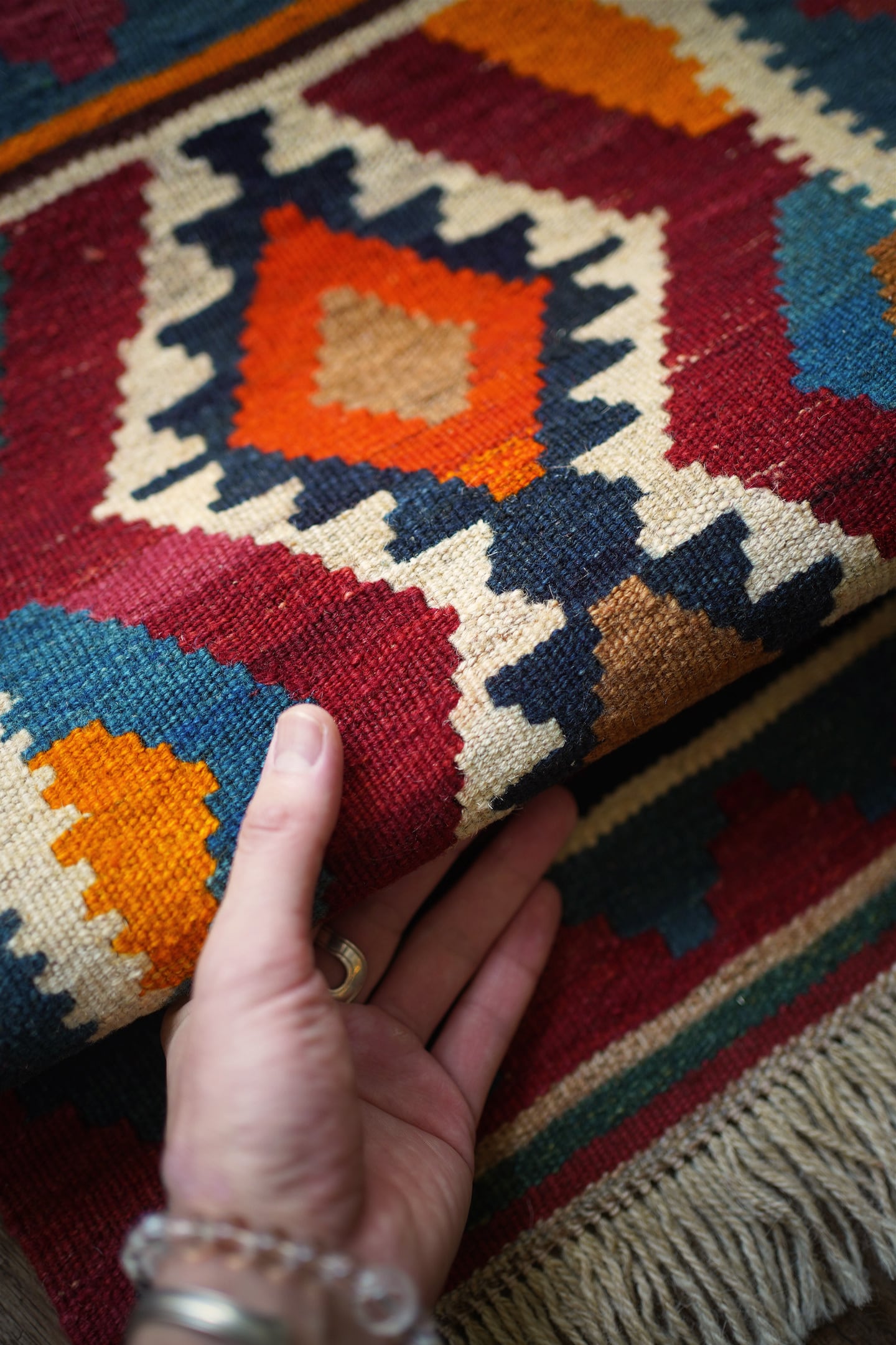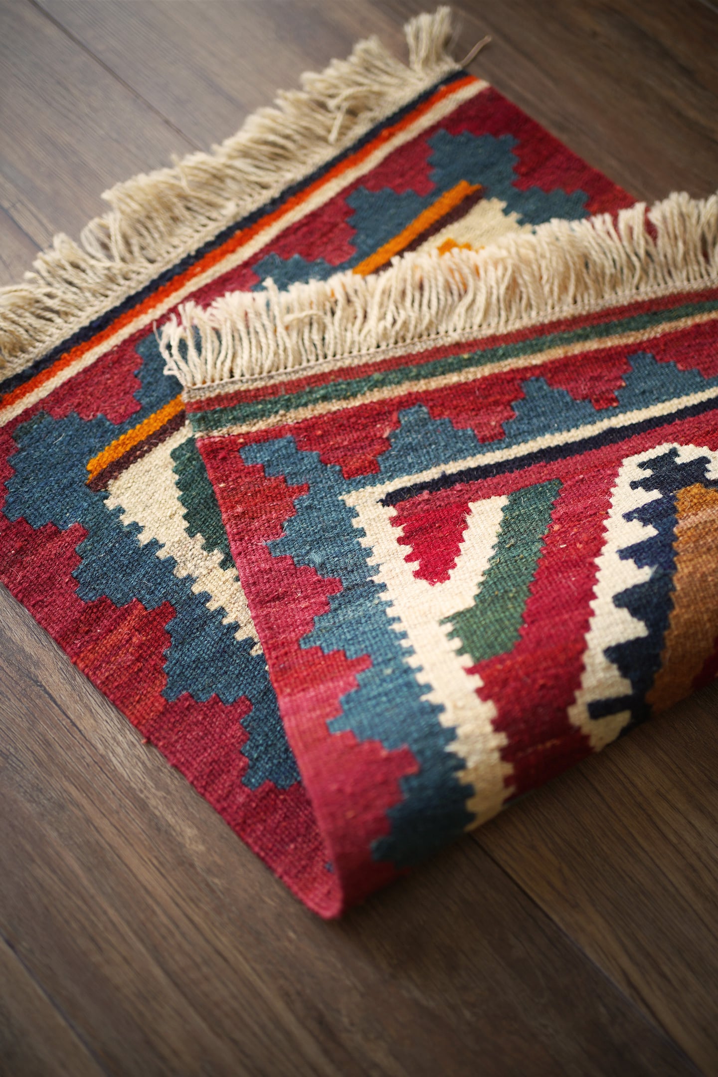 当店では基本的に新品のお品は扱っていないのですが、こちらは未使用品の新しいアフガニスタン産キリムです。いつもご家庭に馴染みやすい落ち着いた色味のラグやキリムを選ぶことが多いのですが、こちらのキリムはカラフルで心踊るようなワクワク感を与えてくれる一枚だったため仕入れを決めました。ビビットカラーではないので、どこか落ち着きのある雰囲気も持ち合わせており、お部屋のアクセントとしてちょうど良いかと思います。表面は乾いたサラッとした肌触りで、厚みは3mm〜4mm程度。キャビネットなどの上に敷いたり、タペストリーとして壁に飾っていただくと大変素敵かと思います。見るだけで気分を明るくさせてくれる不思議な魅力があり、カラフルっていいなぁと改めて感じさせてくれる一枚です。