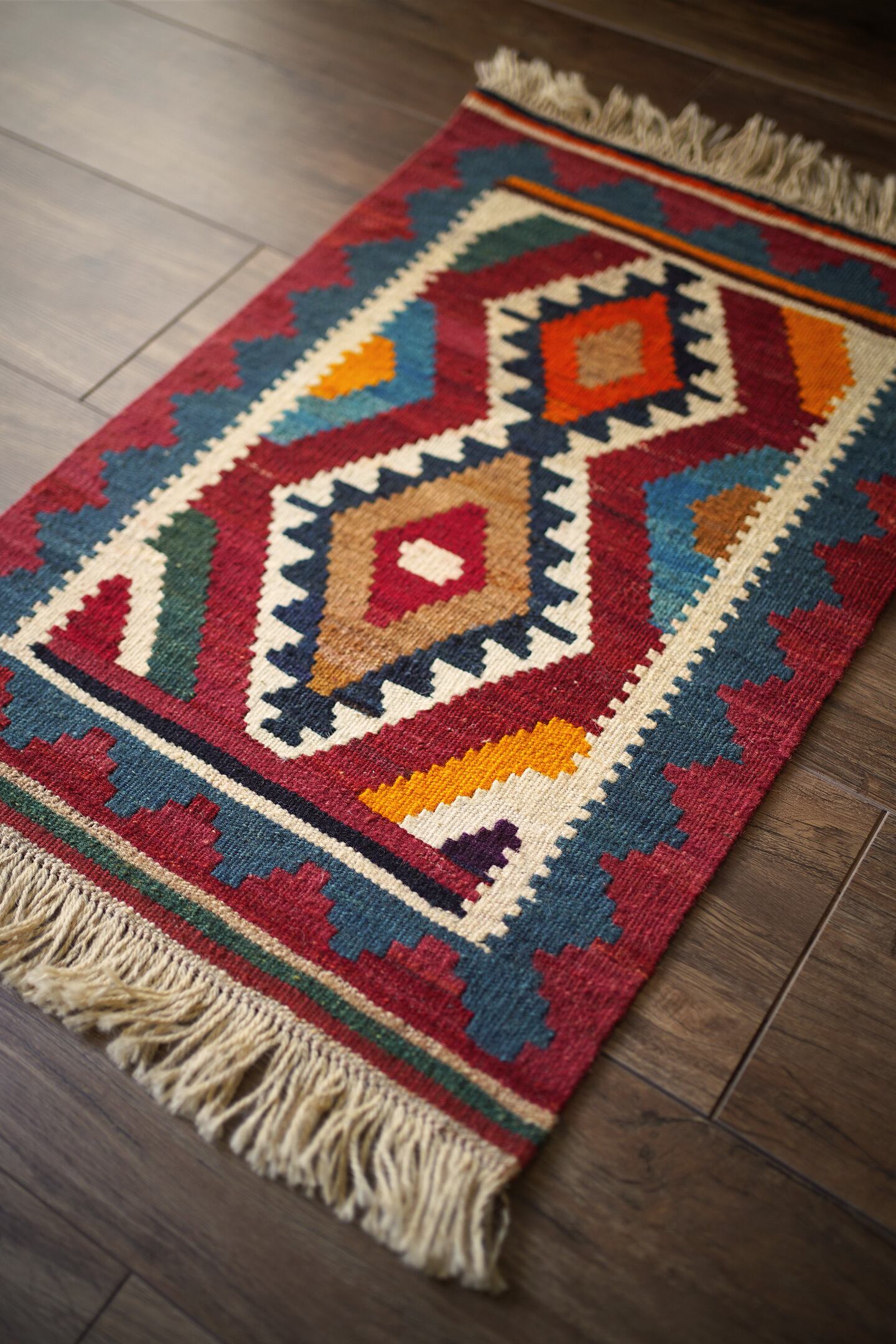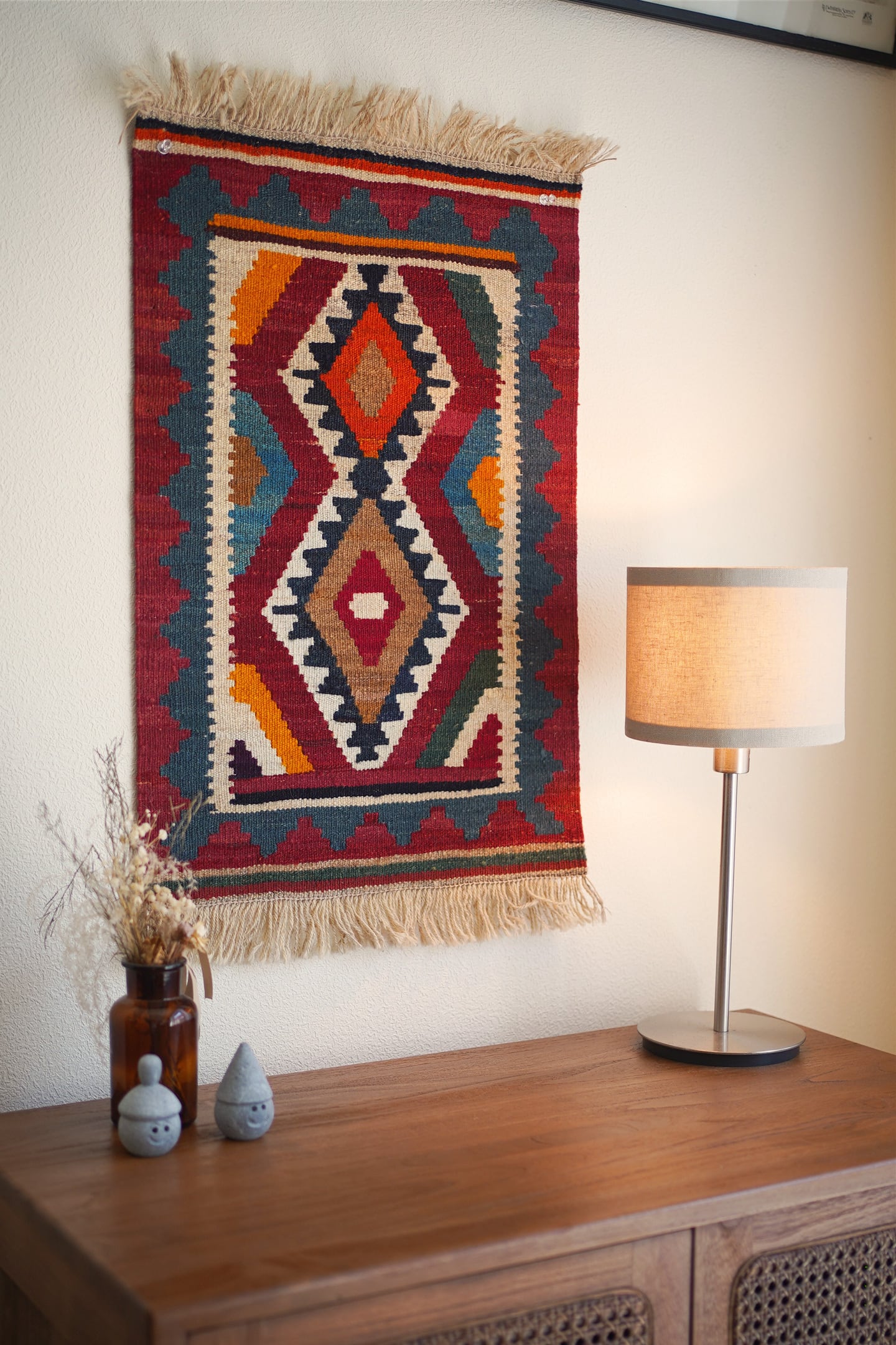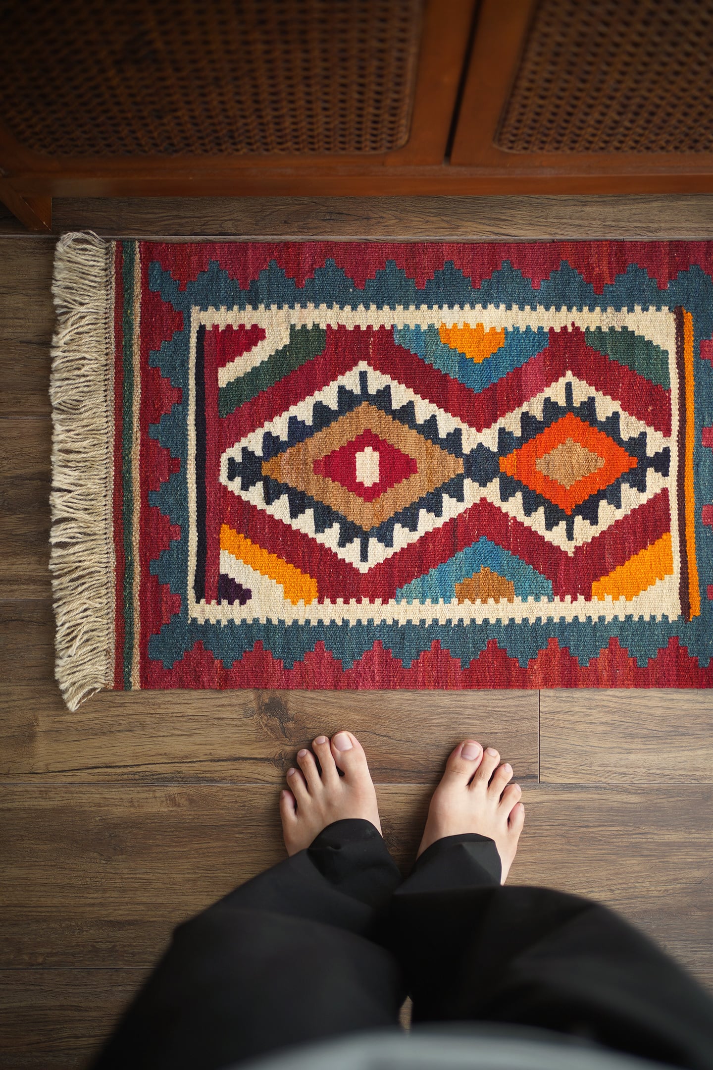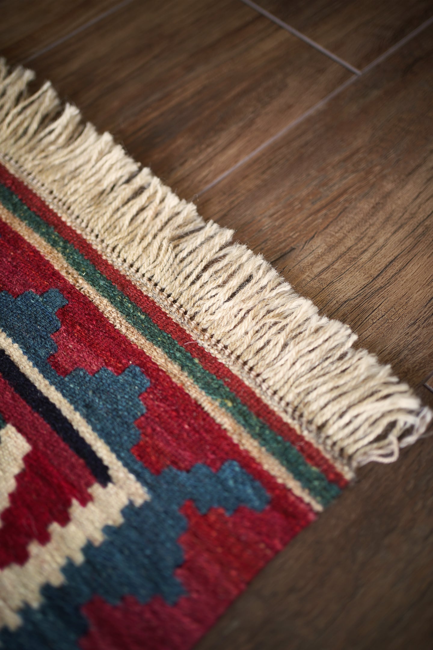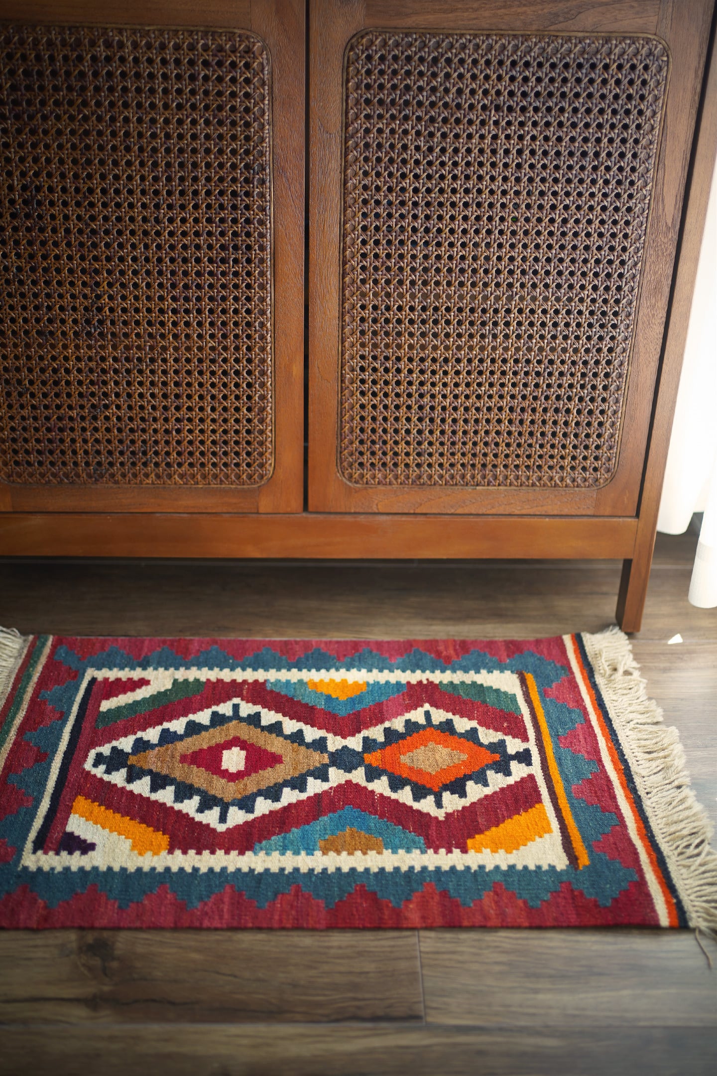 当店では基本的に新品のお品は扱っていないのですが、こちらは未使用品の新しいアフガニスタン産キリムです。いつもご家庭に馴染みやすい落ち着いた色味のラグやキリムを選ぶことが多いのですが、こちらのキリムはカラフルで心踊るようなワクワク感を与えてくれる一枚だったため仕入れを決めました。ビビットカラーではないので、どこか落ち着きのある雰囲気も持ち合わせており、お部屋のアクセントとしてちょうど良いかと思います。表面は乾いたサラッとした肌触りで、厚みは3mm〜4mm程度。キャビネットなどの上に敷いたり、タペストリーとして壁に飾っていただくと大変素敵かと思います。見るだけで気分を明るくさせてくれる不思議な魅力があり、カラフルっていいなぁと改めて感じさせてくれる一枚です。