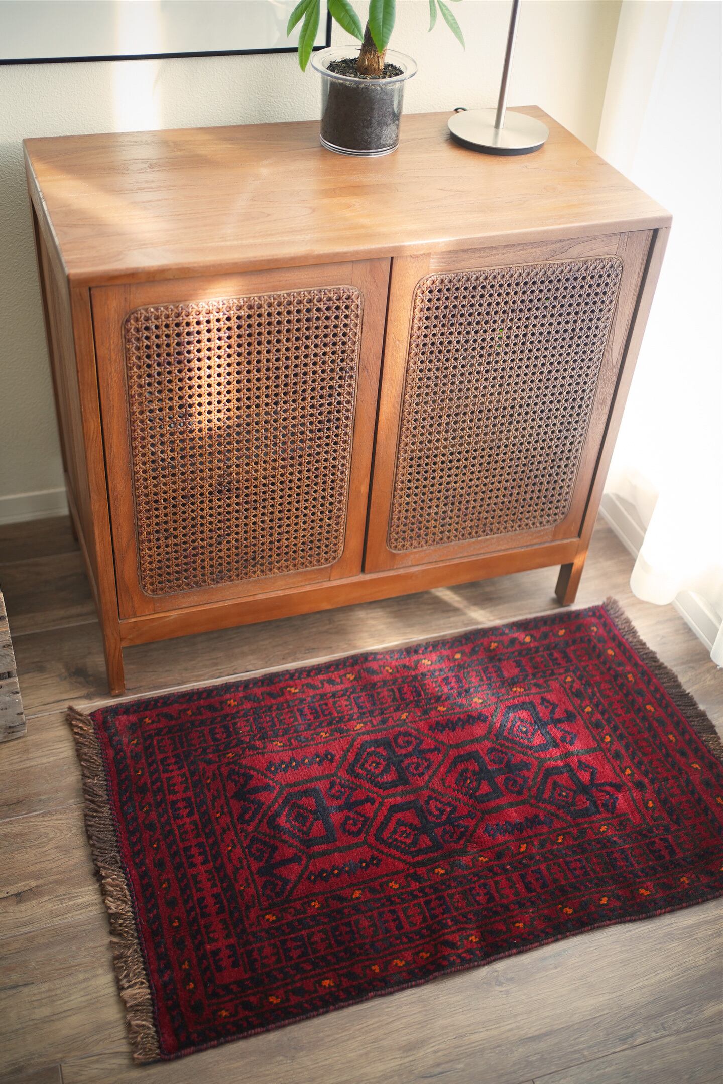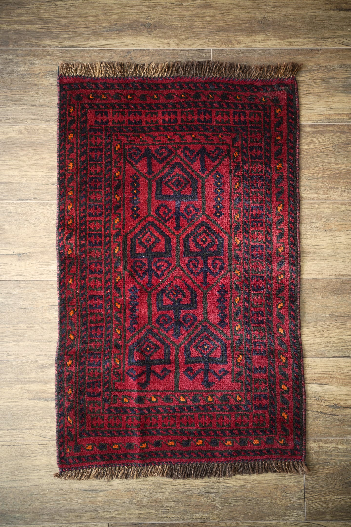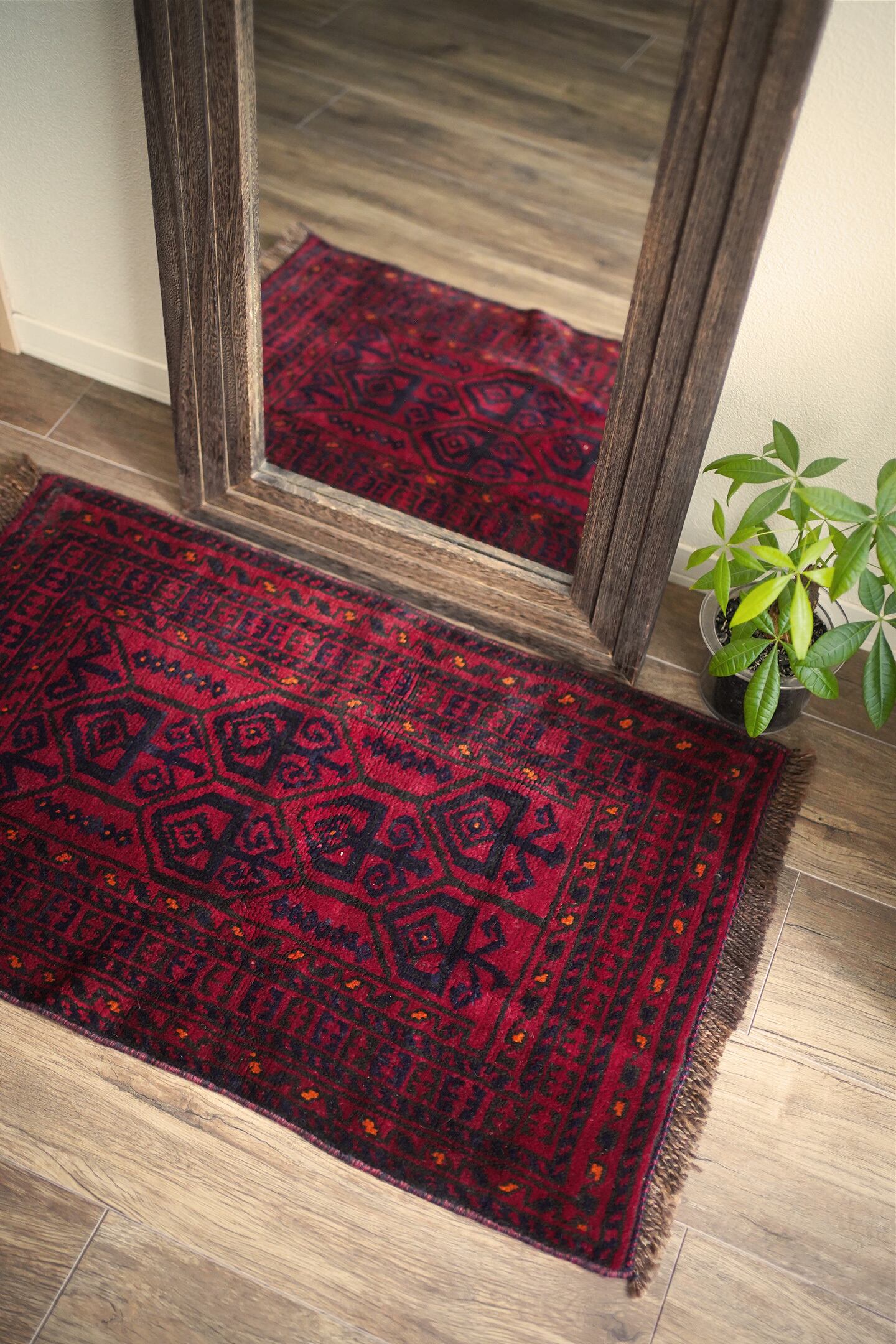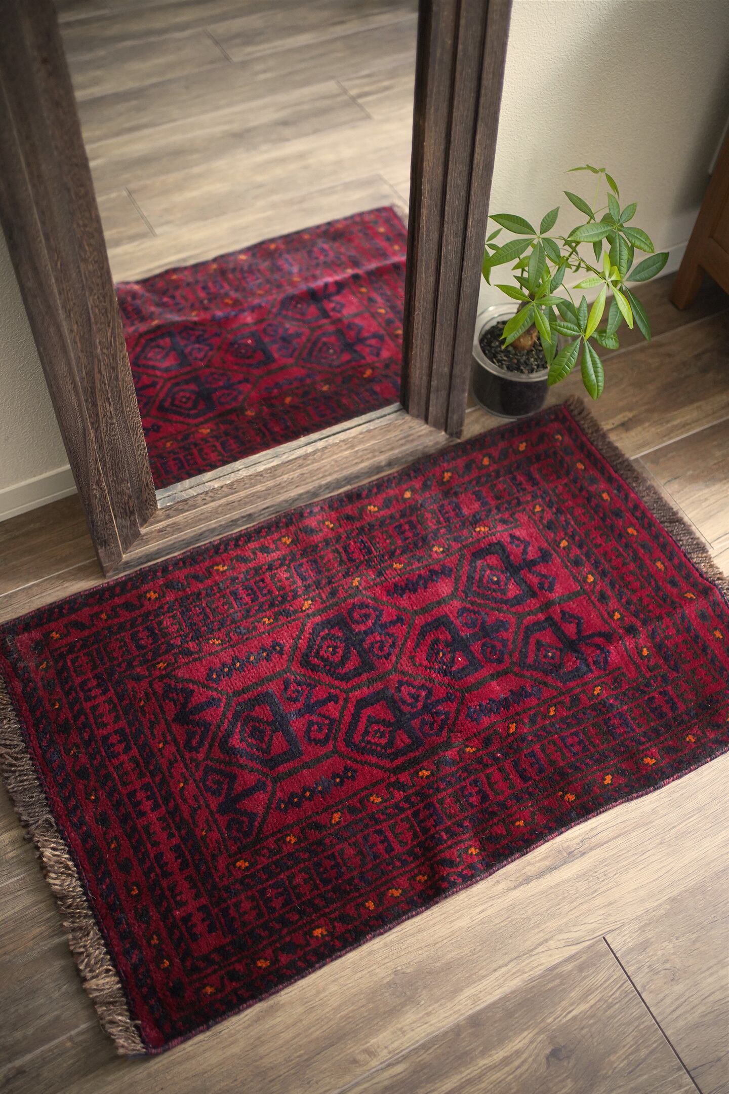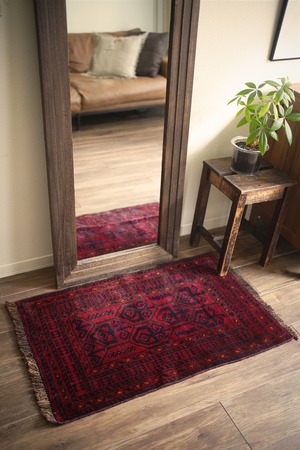 約40年前に織られたアフガニスタン産のバルーチラグ。落ち着いた赤に濃紺の組み合わせで、パイルに艶も感じられる美しい一枚です。表面はふわっと柔らかく優しい肌触りで、厚みは8mm程度。ダメージや補修された跡もなく、大変良好なコンディション。玄関スペースをはじめ、全身鏡の前に敷いたり、キャビネットやラックの前などにもオススメです。小さめの赤いラグをお探しの方に。