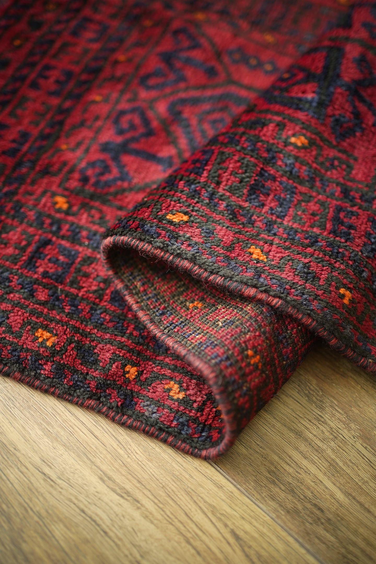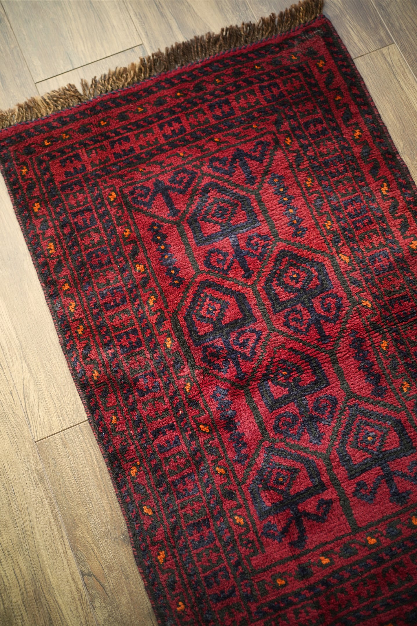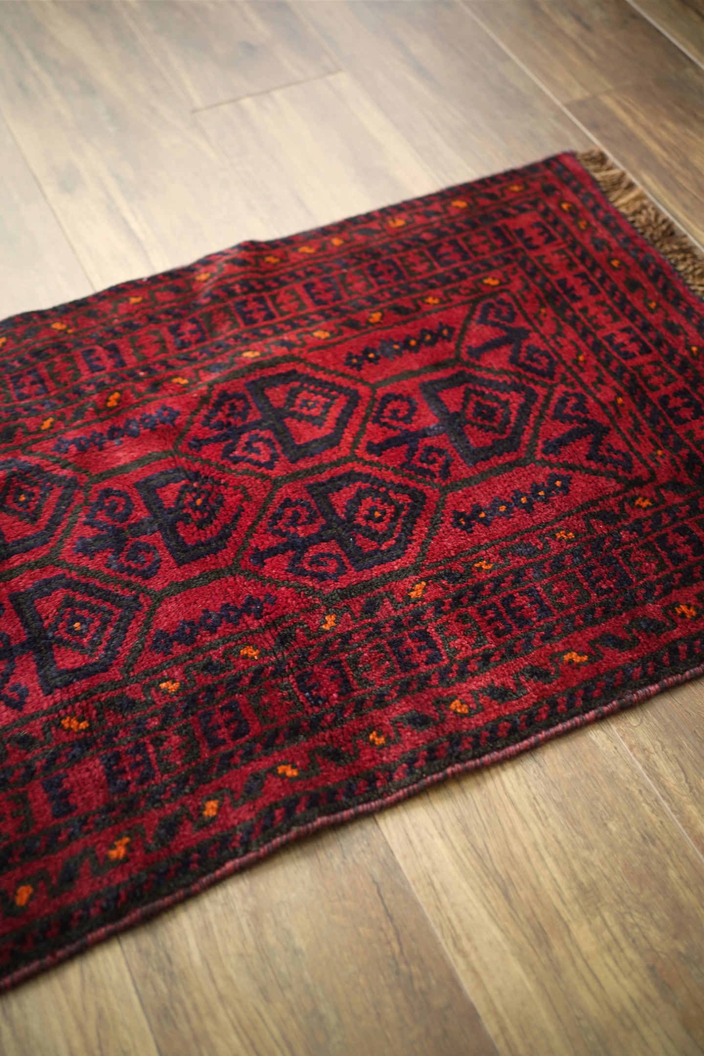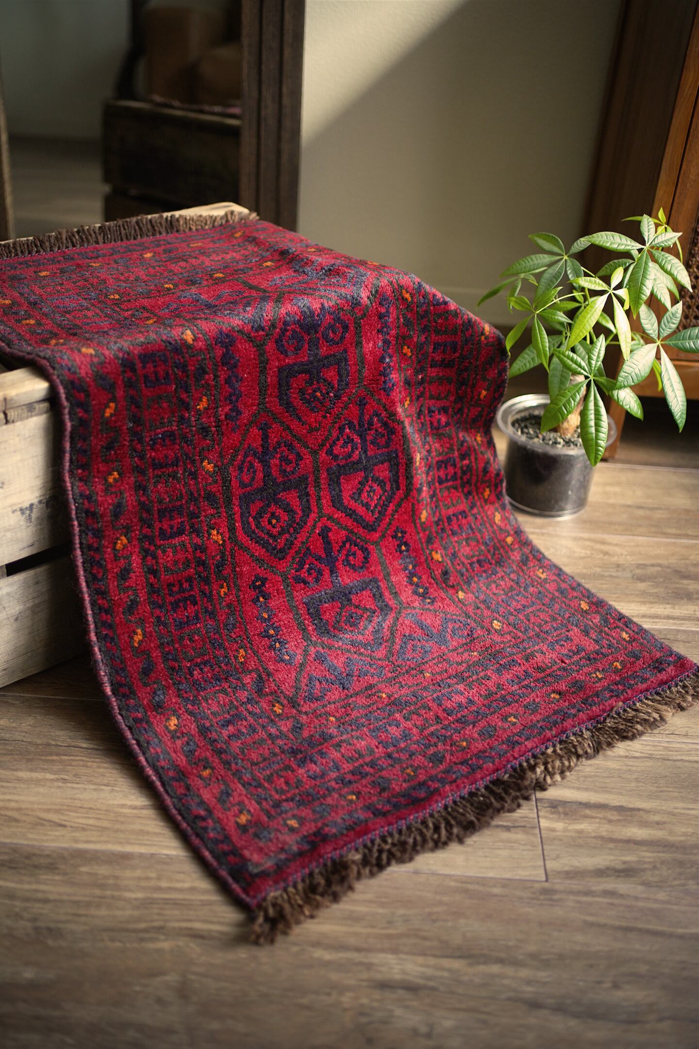 約40年前に織られたアフガニスタン産のバルーチラグ。落ち着いた赤に濃紺の組み合わせで、パイルに艶も感じられる美しい一枚です。表面はふわっと柔らかく優しい肌触りで、厚みは8mm程度。ダメージや補修された跡もなく、大変良好なコンディション。玄関スペースをはじめ、全身鏡の前に敷いたり、キャビネットやラックの前などにもオススメです。小さめの赤いラグをお探しの方に。