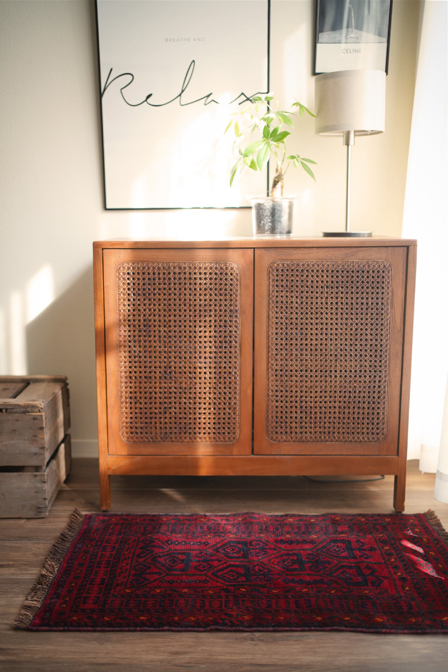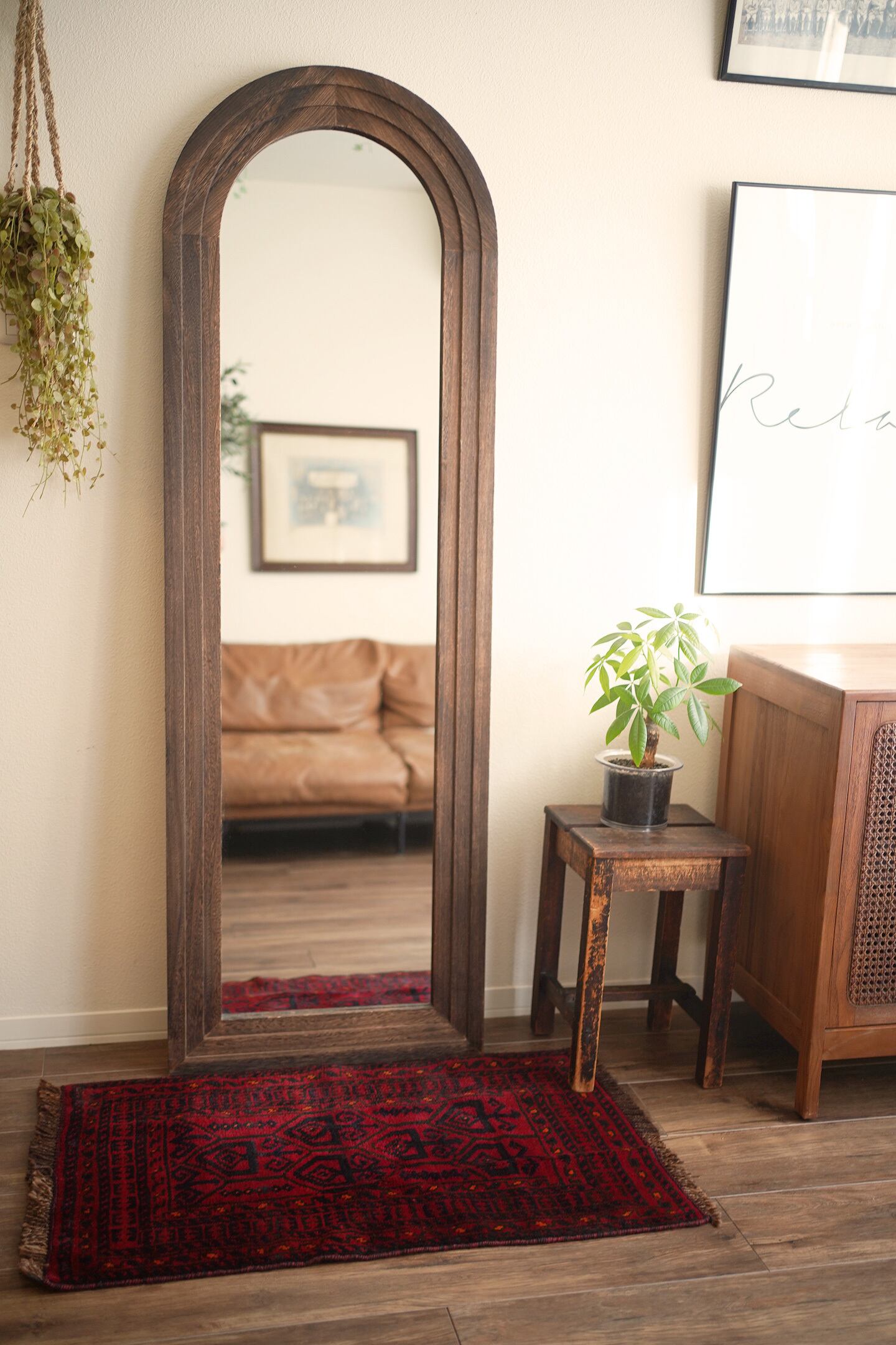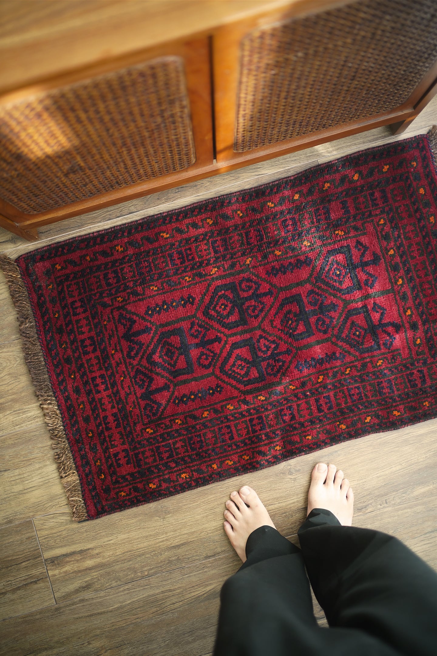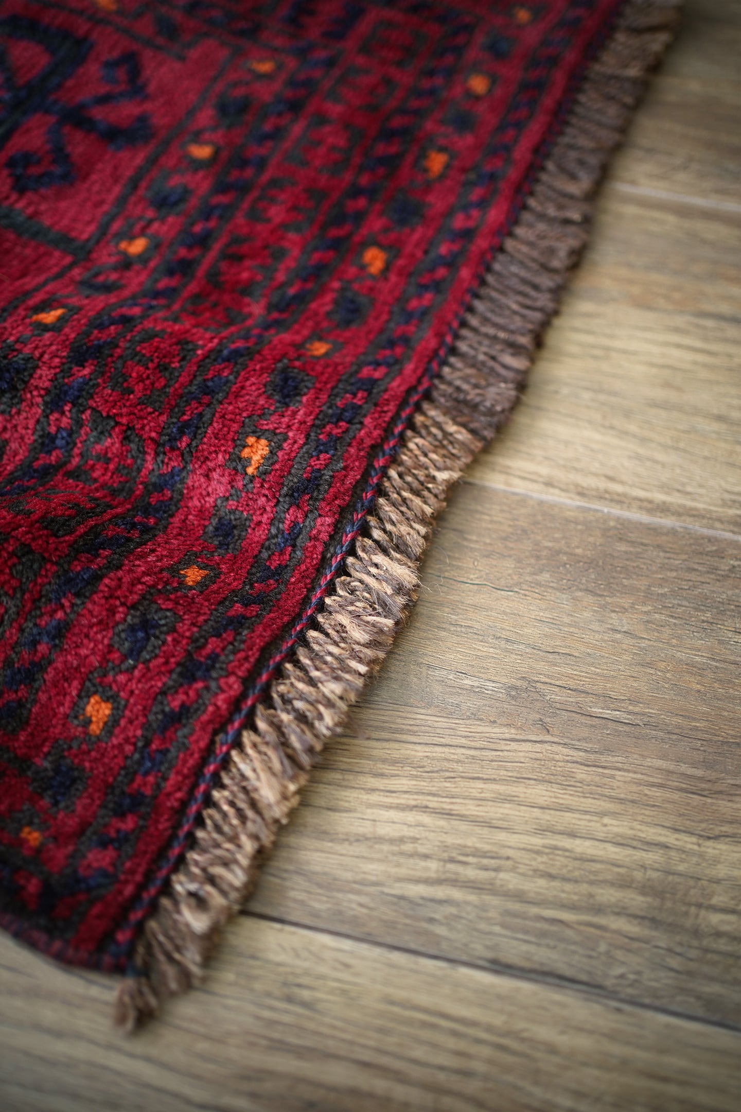 約40年前に織られたアフガニスタン産のバルーチラグ。落ち着いた赤に濃紺の組み合わせで、パイルに艶も感じられる美しい一枚です。表面はふわっと柔らかく優しい肌触りで、厚みは8mm程度。ダメージや補修された跡もなく、大変良好なコンディション。玄関スペースをはじめ、全身鏡の前に敷いたり、キャビネットやラックの前などにもオススメです。小さめの赤いラグをお探しの方に。