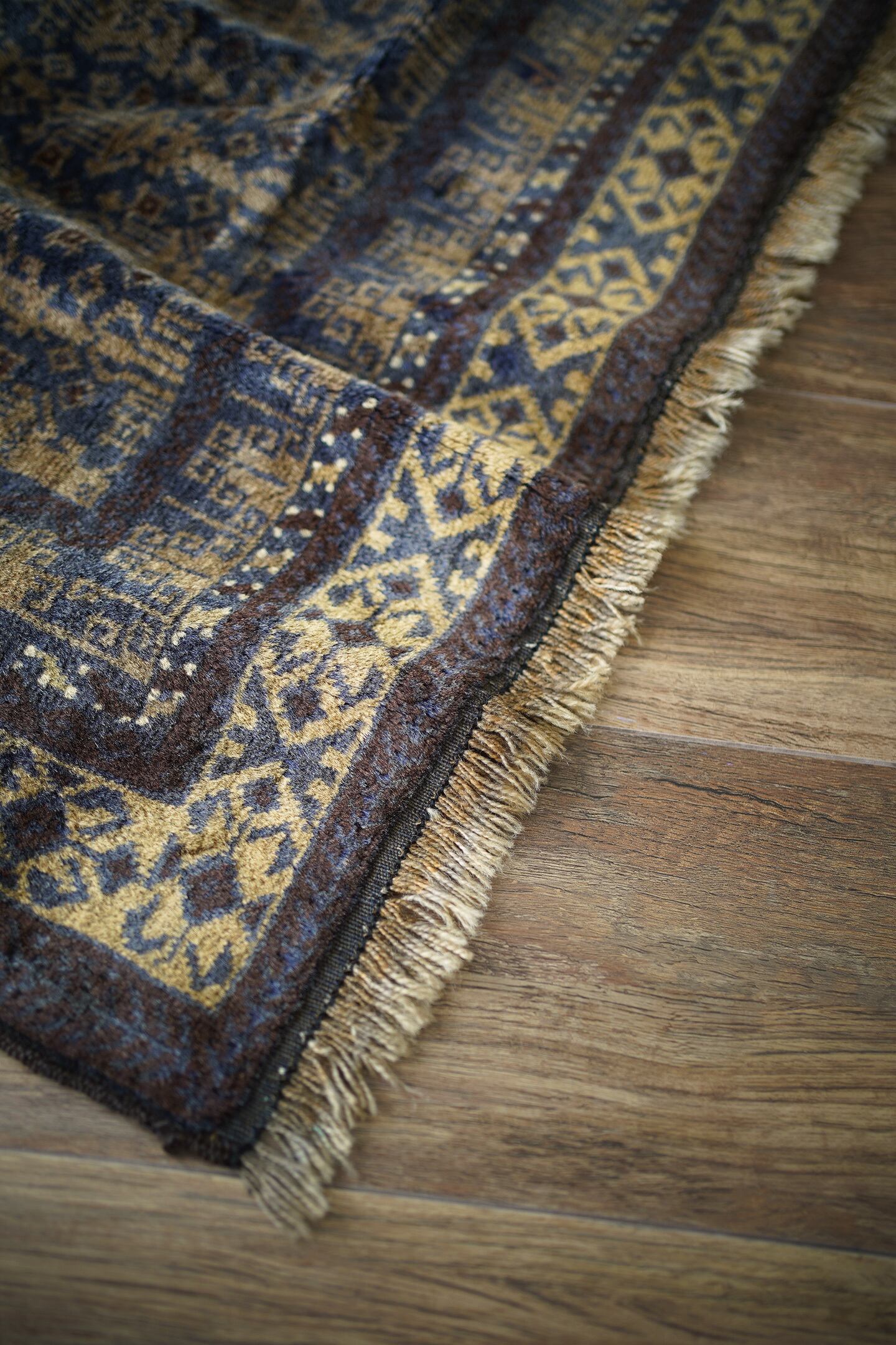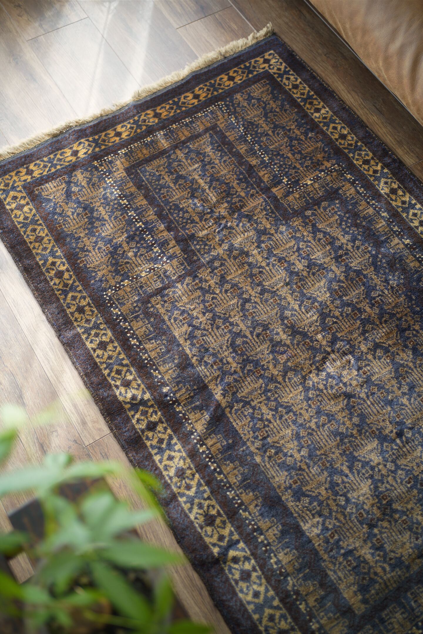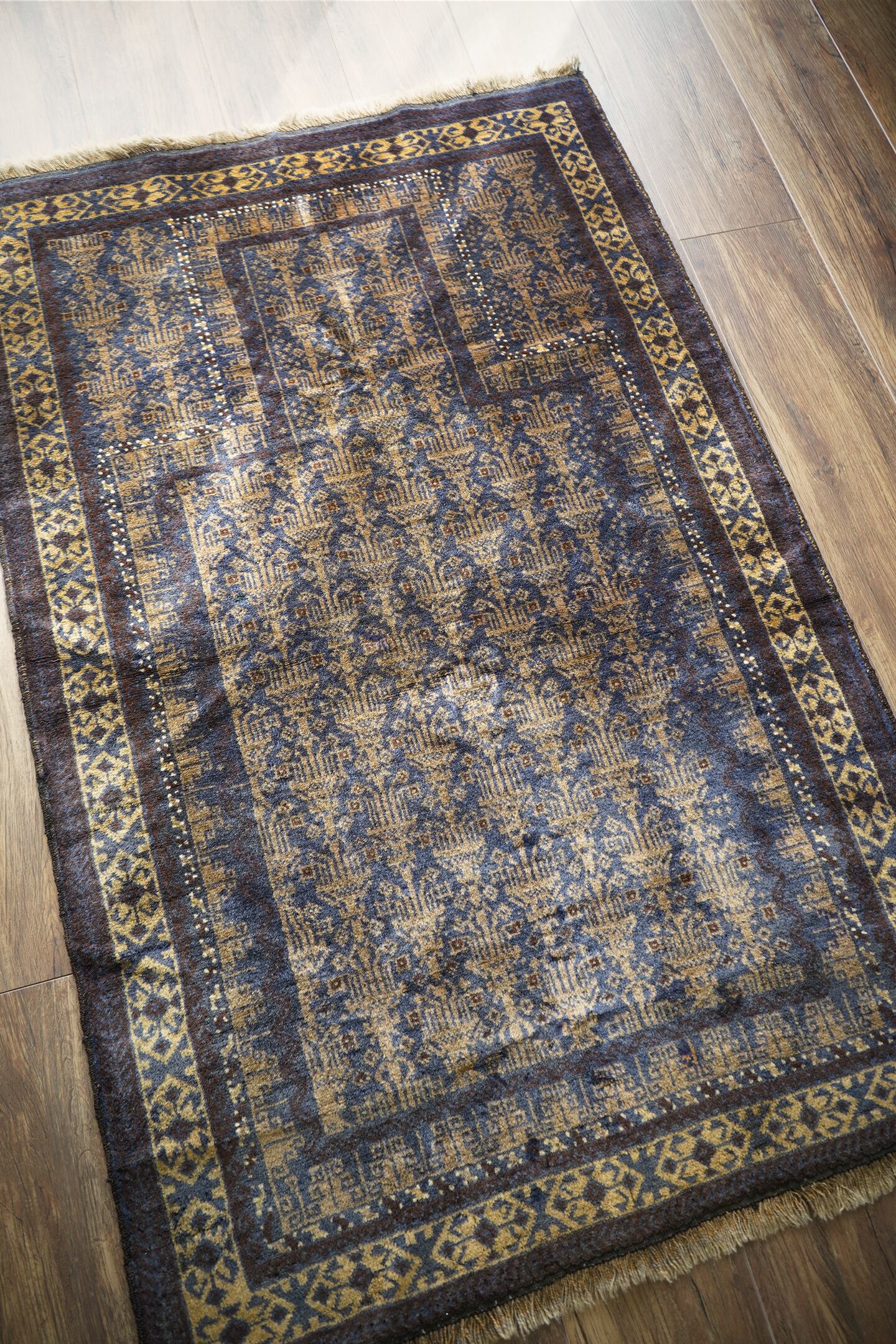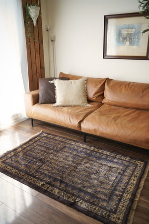 経年約60年のアフガニスタン産バルーチラグ。プレイヤーラグ(祈祷用ラグ)の凸型のデザインなのですが、特有の凸型をあまり感じさせない統一感のあるデザインが美しく魅力的です。色褪せた渋い風合いで、濃紺と薄いブラウンの珍しい色合いの組み合わせが目を惹きます。表面のパイルはふわっと滑らかで優しい肌触りをしており、厚みは5mm〜6mm程度。ダメージや補修された跡も見受けられず状態良好です。一人掛けのチェアと合わせたり、洗面スペースに敷いたりと敷く場所を考えて悩むのも楽しいですね♫