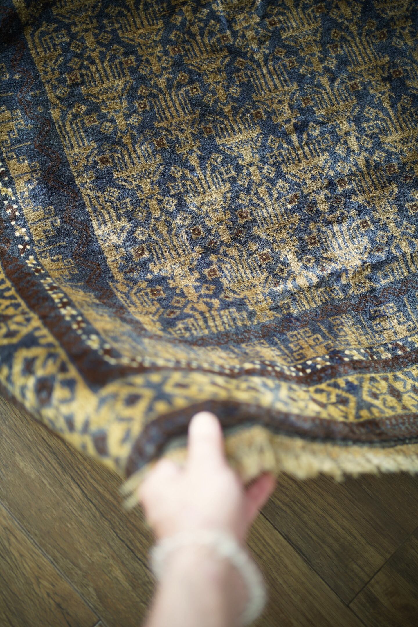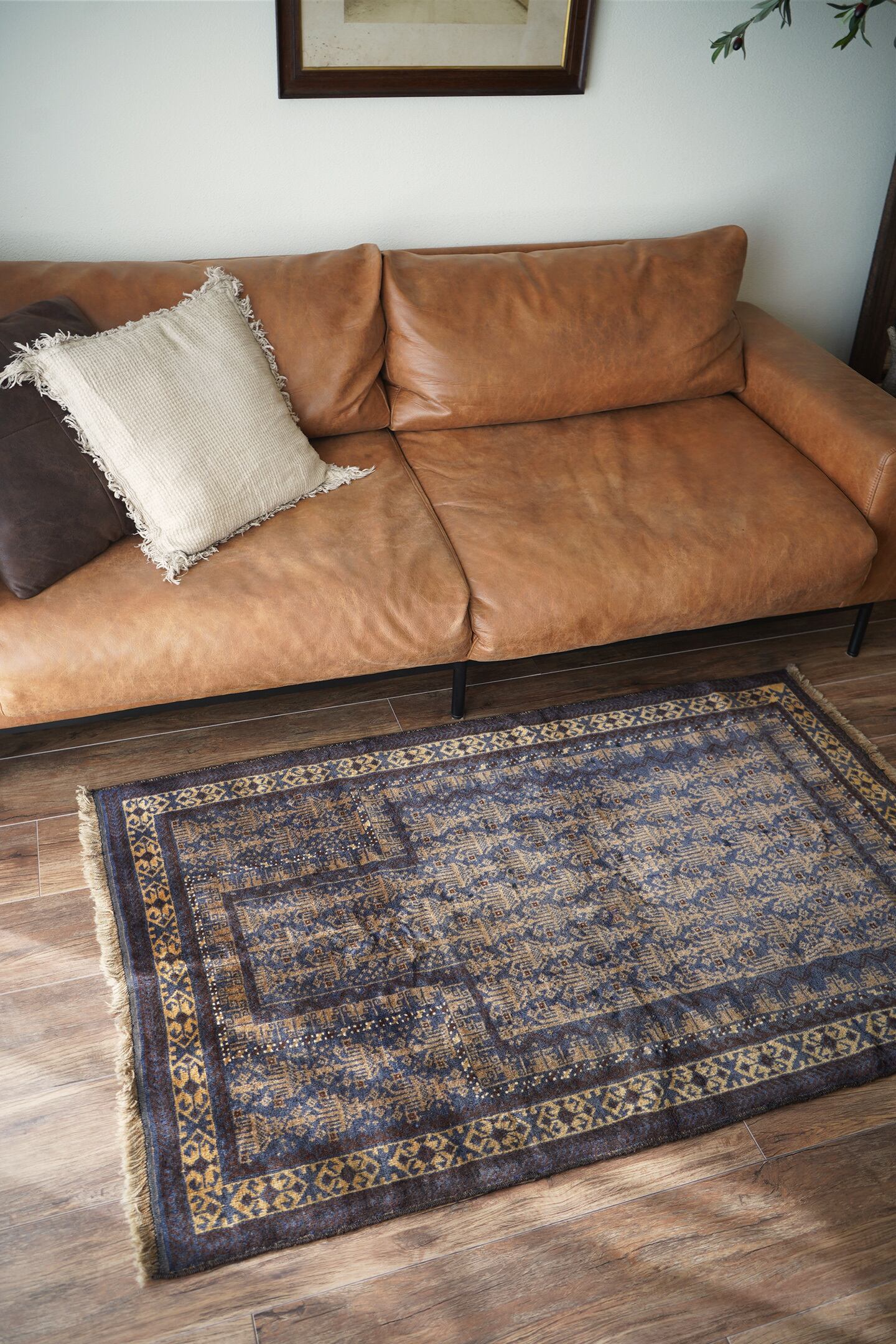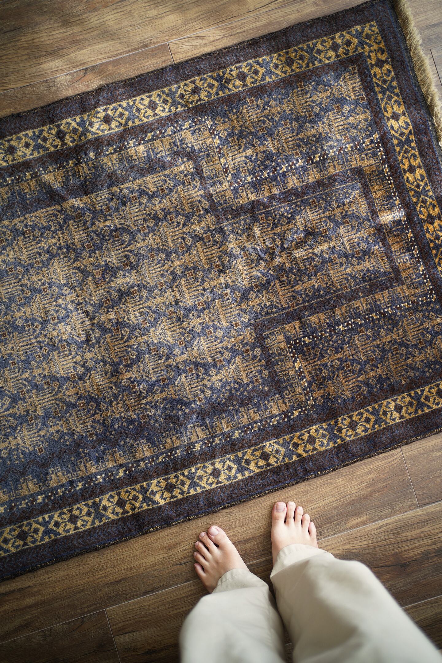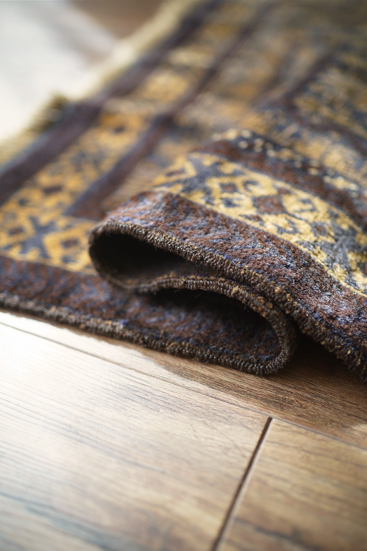 経年約60年のアフガニスタン産バルーチラグ。プレイヤーラグ(祈祷用ラグ)の凸型のデザインなのですが、特有の凸型をあまり感じさせない統一感のあるデザインが美しく魅力的です。色褪せた渋い風合いで、濃紺と薄いブラウンの珍しい色合いの組み合わせが目を惹きます。表面のパイルはふわっと滑らかで優しい肌触りをしており、厚みは5mm〜6mm程度。ダメージや補修された跡も見受けられず状態良好です。一人掛けのチェアと合わせたり、洗面スペースに敷いたりと敷く場所を考えて悩むのも楽しいですね♫