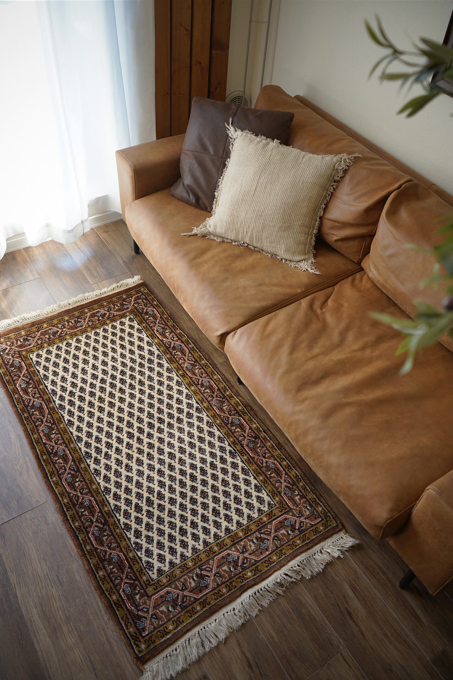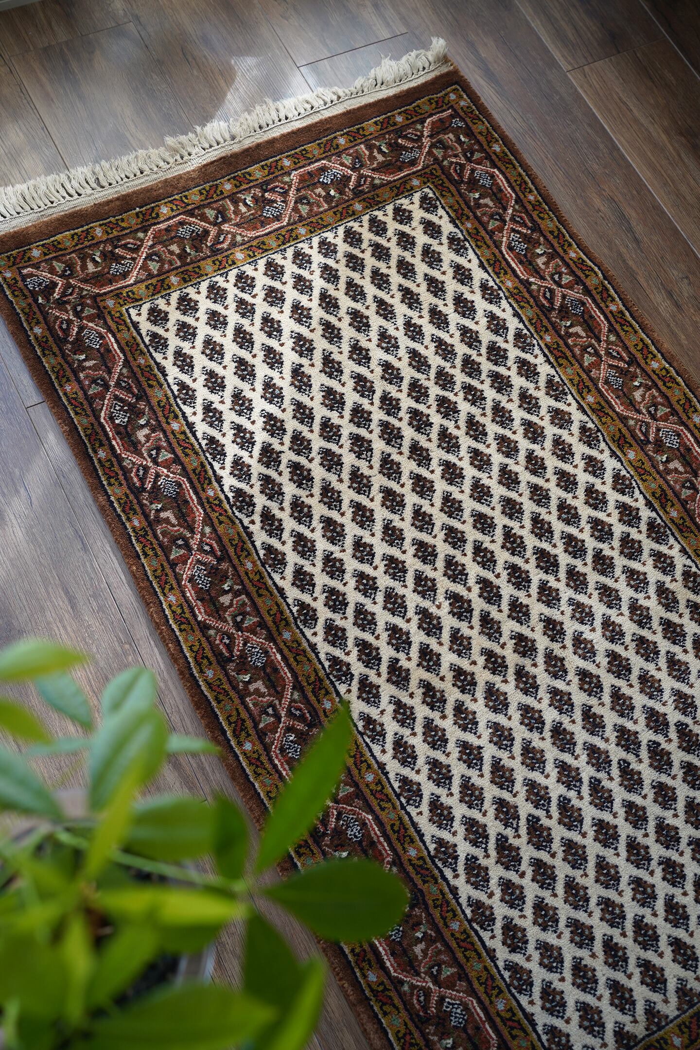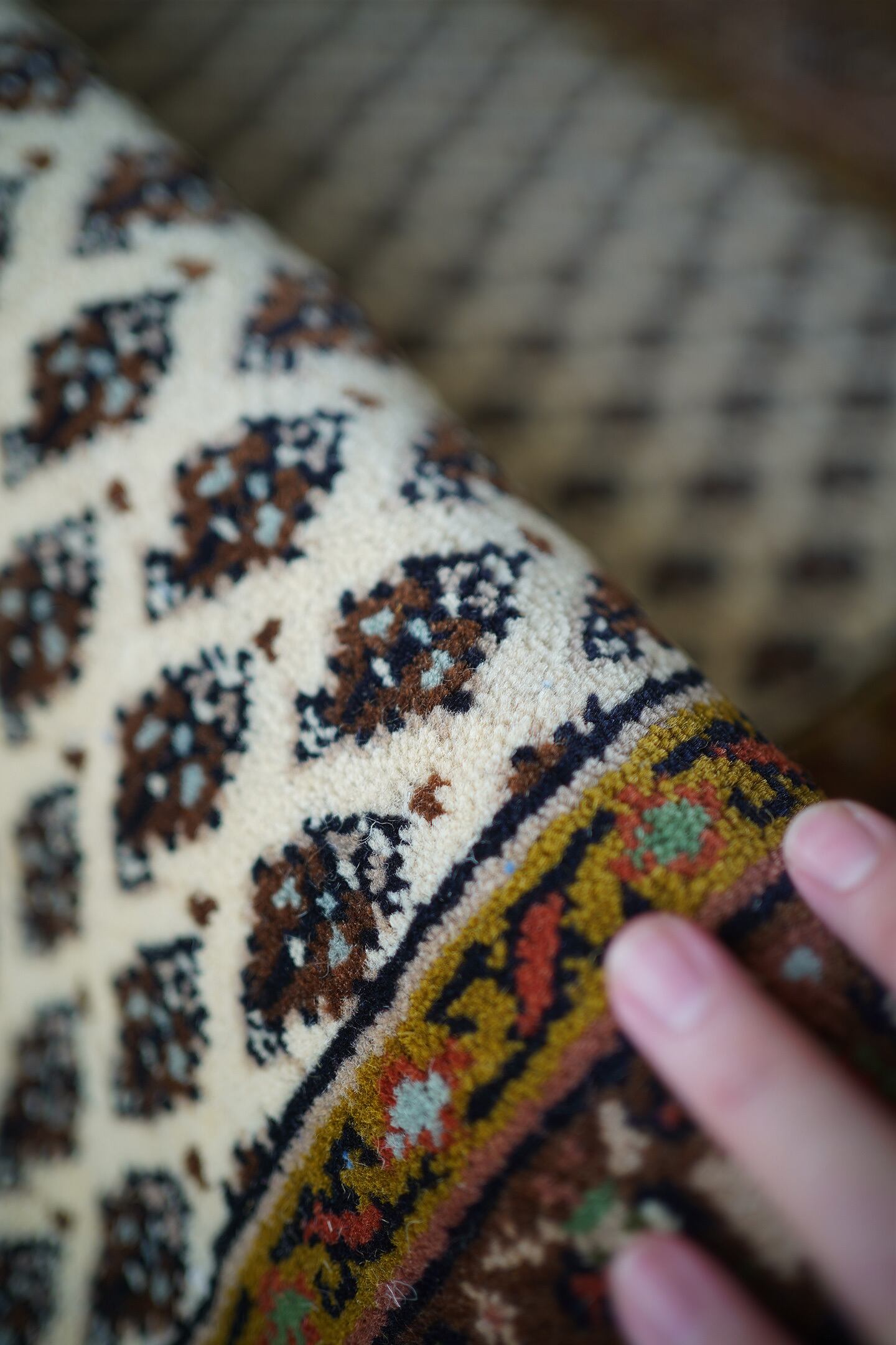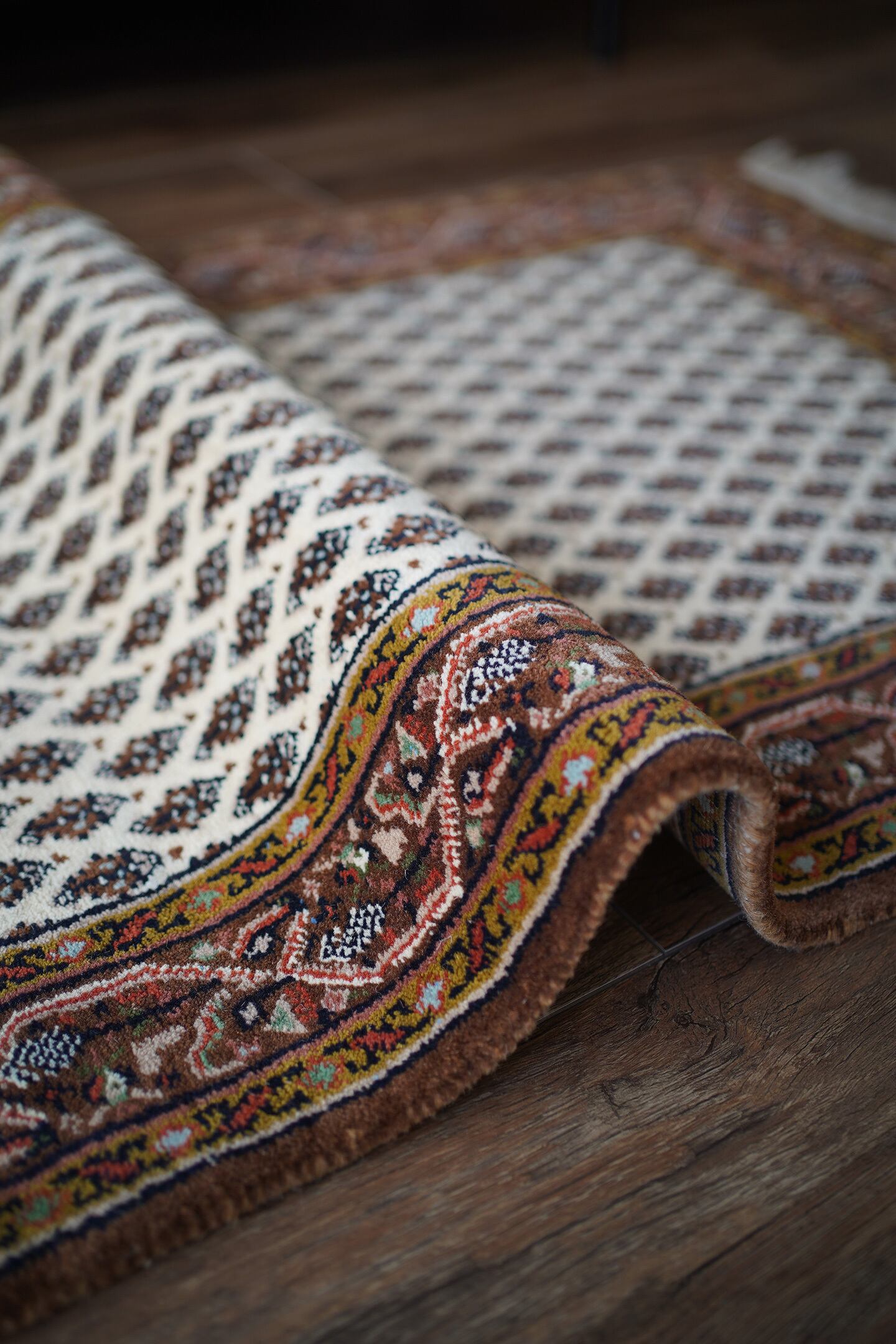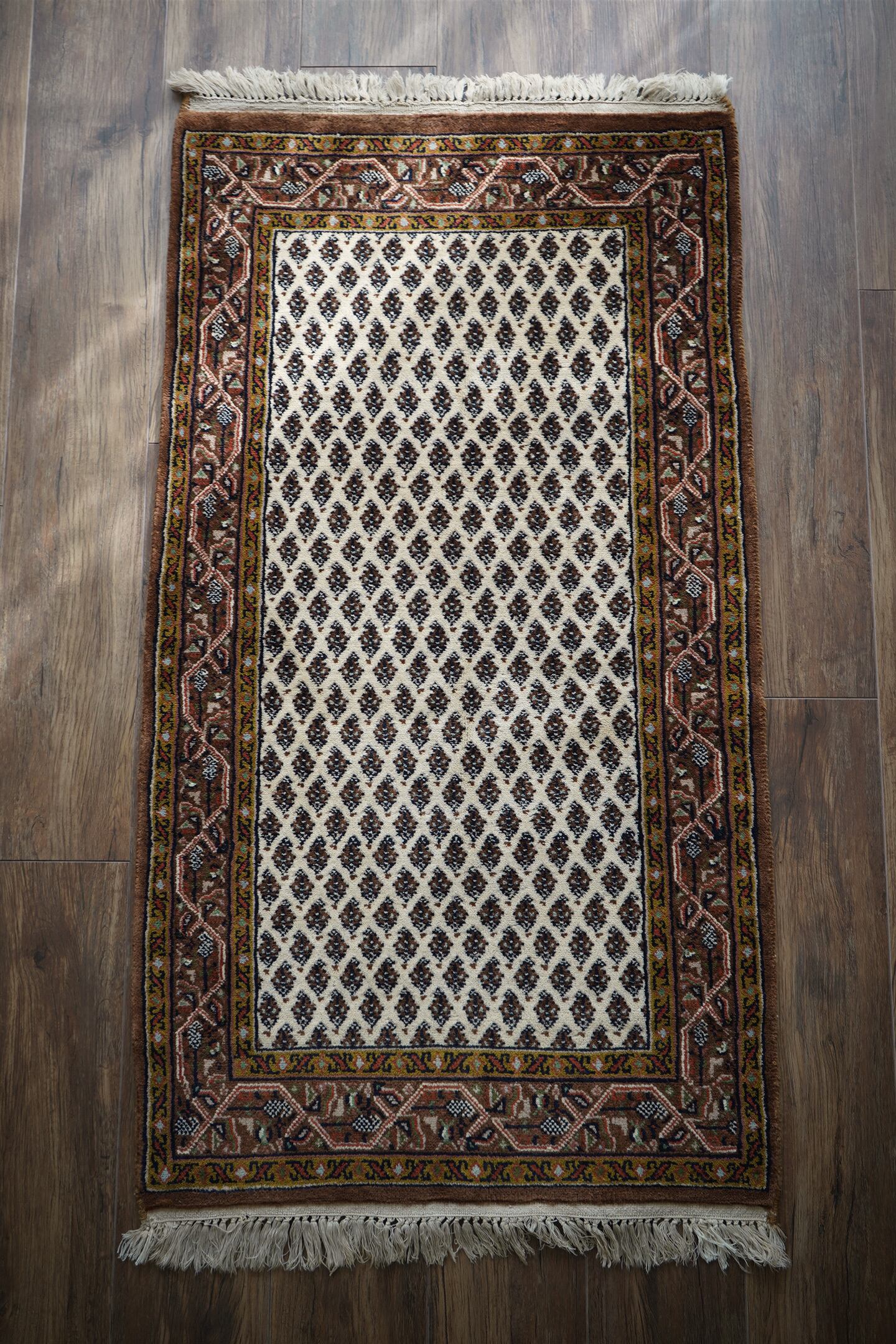 イラン中西部のアラークの南西にあるセラバンド地域で作られた経年約20年のヴィンテージラグ。ボテ(ペイズリー)文様を簡素化したとされる"ミール文様(松ぼっくり)"がフィールド一面に配されたデザイン。アイボリー、ブラウン、焦茶などの配色にアクセントでオリーブ、キャロットオレンジが使われた色合い。表面は目の詰まった織りで、ふわっと柔らかく弾力を感じる肌触り。厚みは1cm程度で、重みもあり堅牢な作りをしています。あまり使用された形跡もなく、ダメージや補修跡を見受けられず大変良好なコンディション。玄関をはじめ、お気に入りのスペースに。