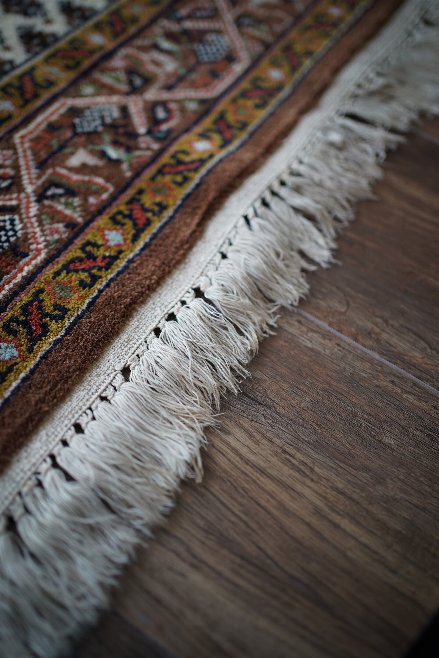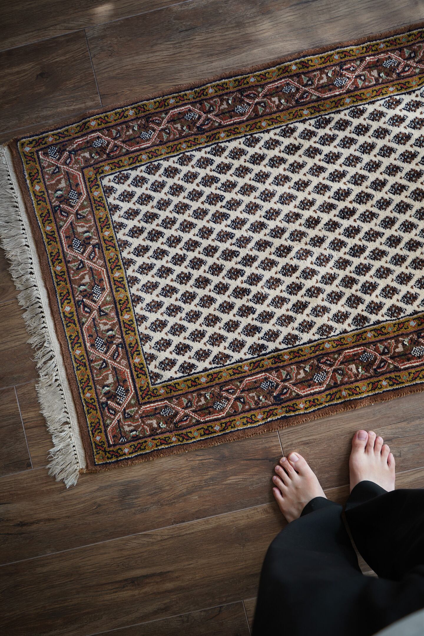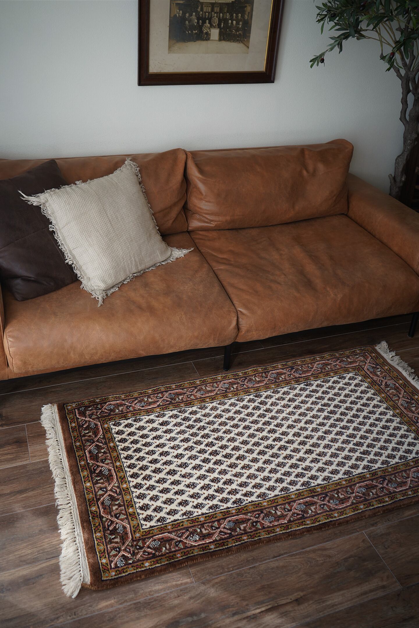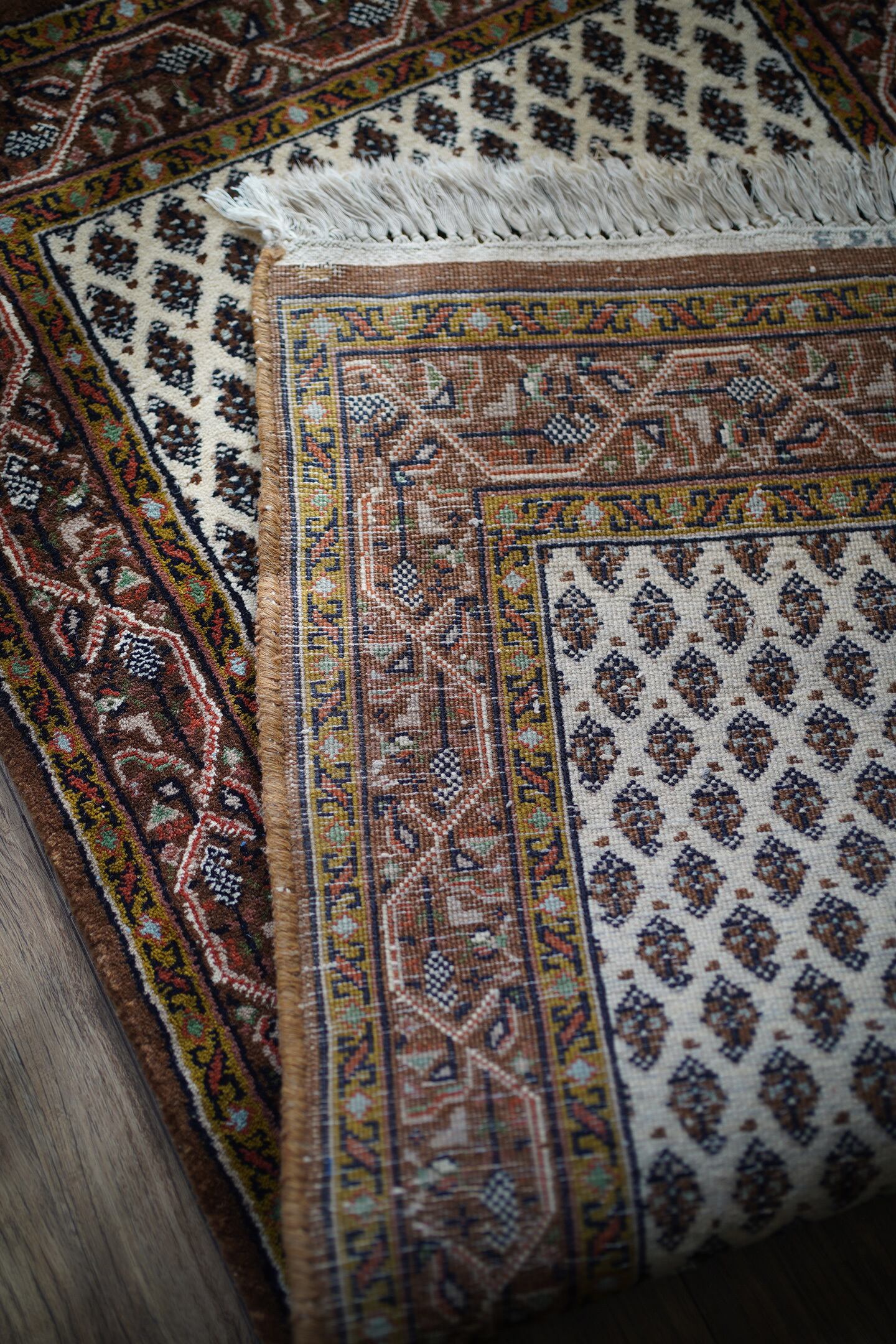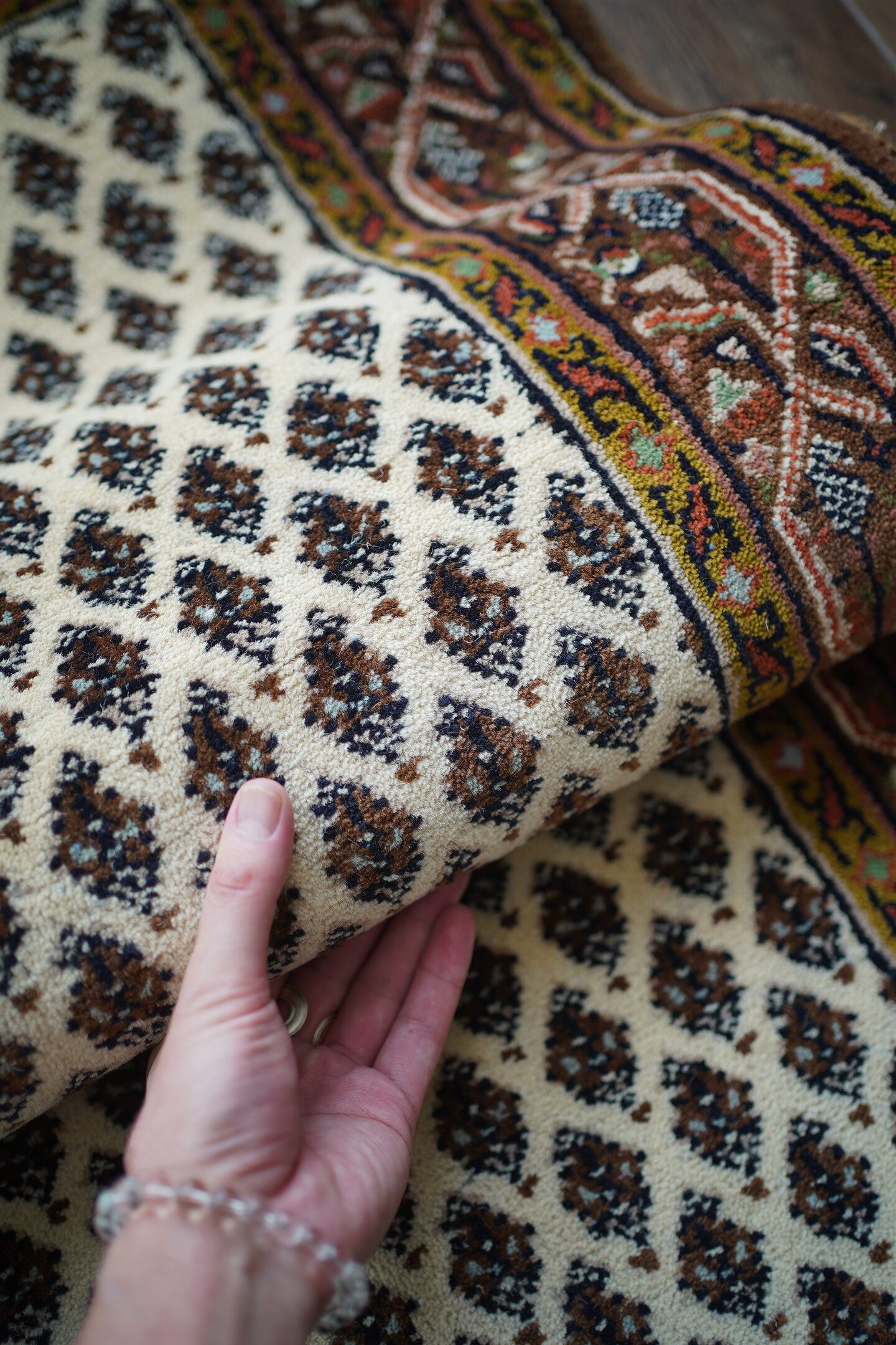 イラン中西部のアラークの南西にあるセラバンド地域で作られた経年約20年のヴィンテージラグ。ボテ(ペイズリー)文様を簡素化したとされる"ミール文様(松ぼっくり)"がフィールド一面に配されたデザイン。アイボリー、ブラウン、焦茶などの配色にアクセントでオリーブ、キャロットオレンジが使われた色合い。表面は目の詰まった織りで、ふわっと柔らかく弾力を感じる肌触り。厚みは1cm程度で、重みもあり堅牢な作りをしています。あまり使用された形跡もなく、ダメージや補修跡を見受けられず大変良好なコンディション。玄関をはじめ、お気に入りのスペースに。