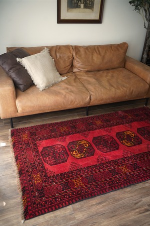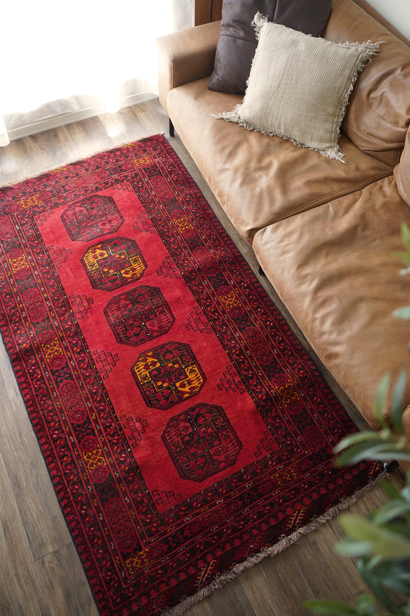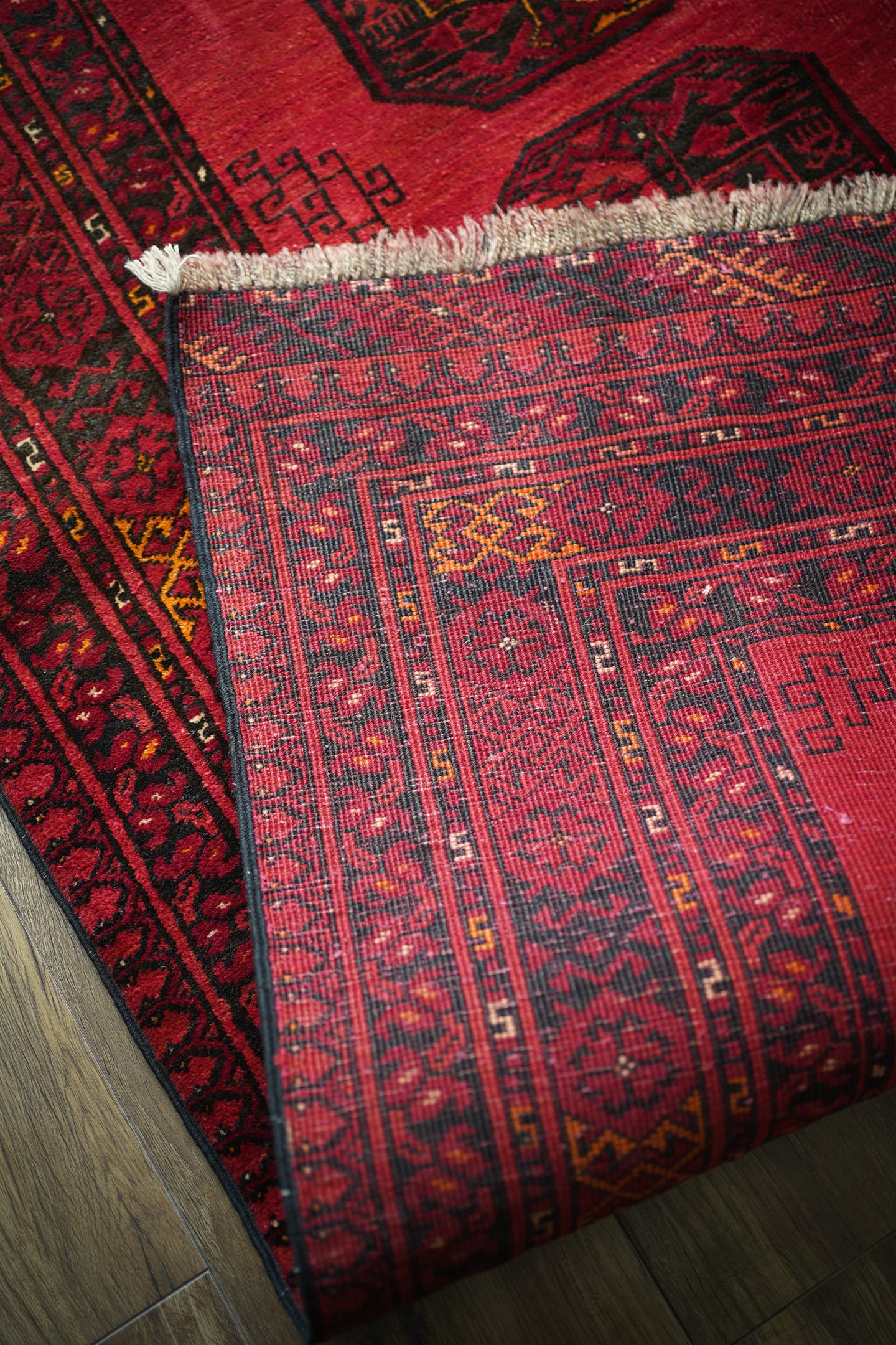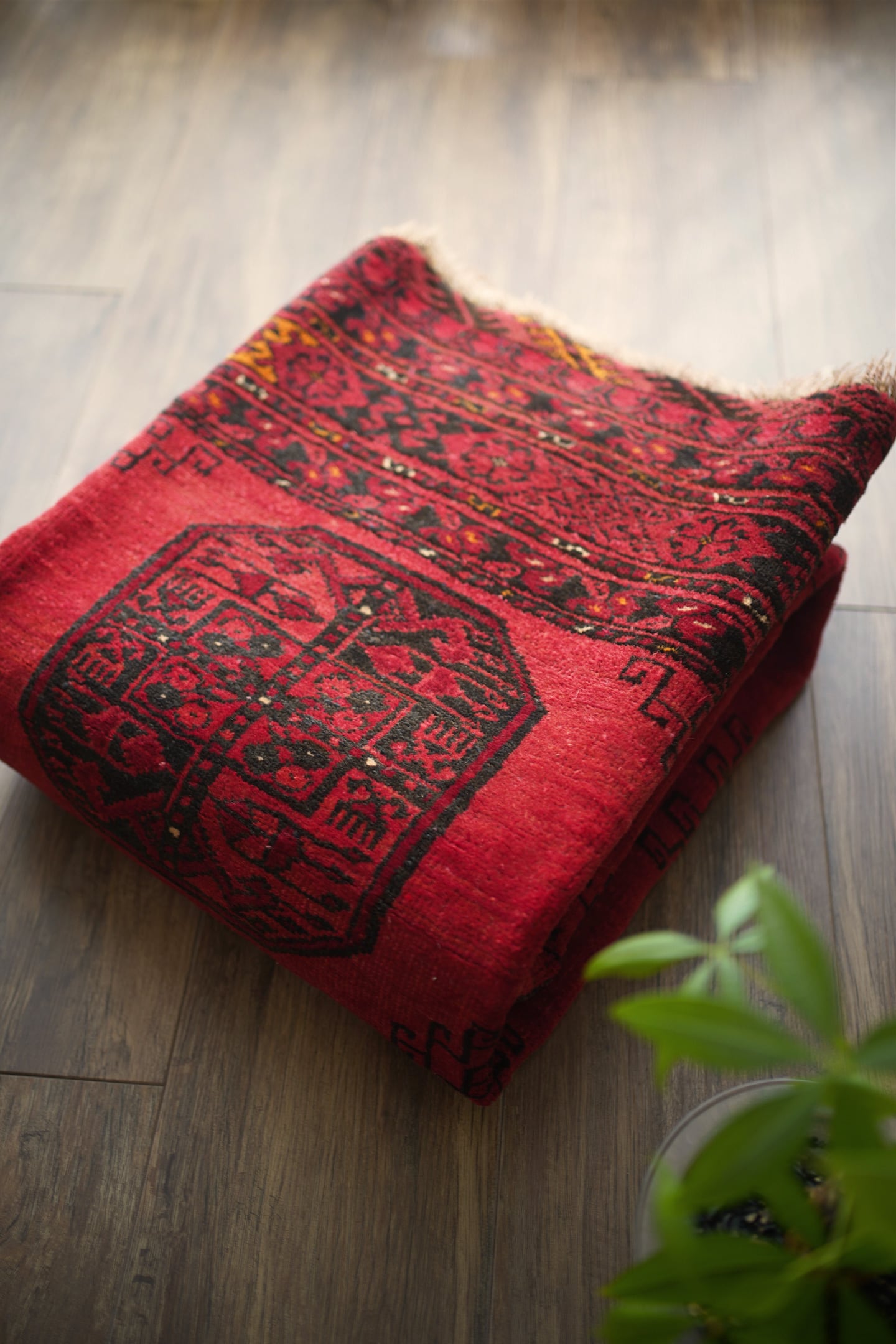 おおよそ60年前にトルクメン族によって織られたヴィンテージラグ。四方の三つ葉のクローバーのようなデザインはエルサリと呼ばれる部族の家紋由来の紋様で、大きなギュルが特徴的でフィルパイとも呼ばれています。深く濃い赤に綺麗に並んだフィルパイはまさにトルクメンといった印象の一枚で、山吹色がアクセントカラーになっているところが大変ユニークです。厚みは7mm程度で、トルクメン特有の目の詰まった織りで作られており、非常に重量感もある堅牢な作りをしています。表面はふわっと滑らかな肌触りで、裏面はコシのある質感。お写真では中央が比較的赤みが強く見えますが、肉眼で見ると全体的に同じ色合いに見えます。目立ったダメージなども見受けられず良好なコンディション。ベッドサイドなどにどうぞ♫