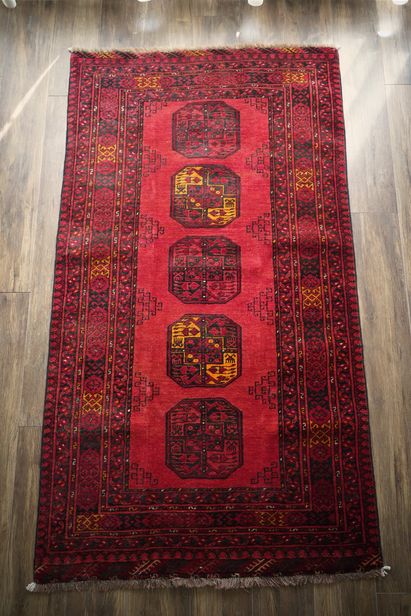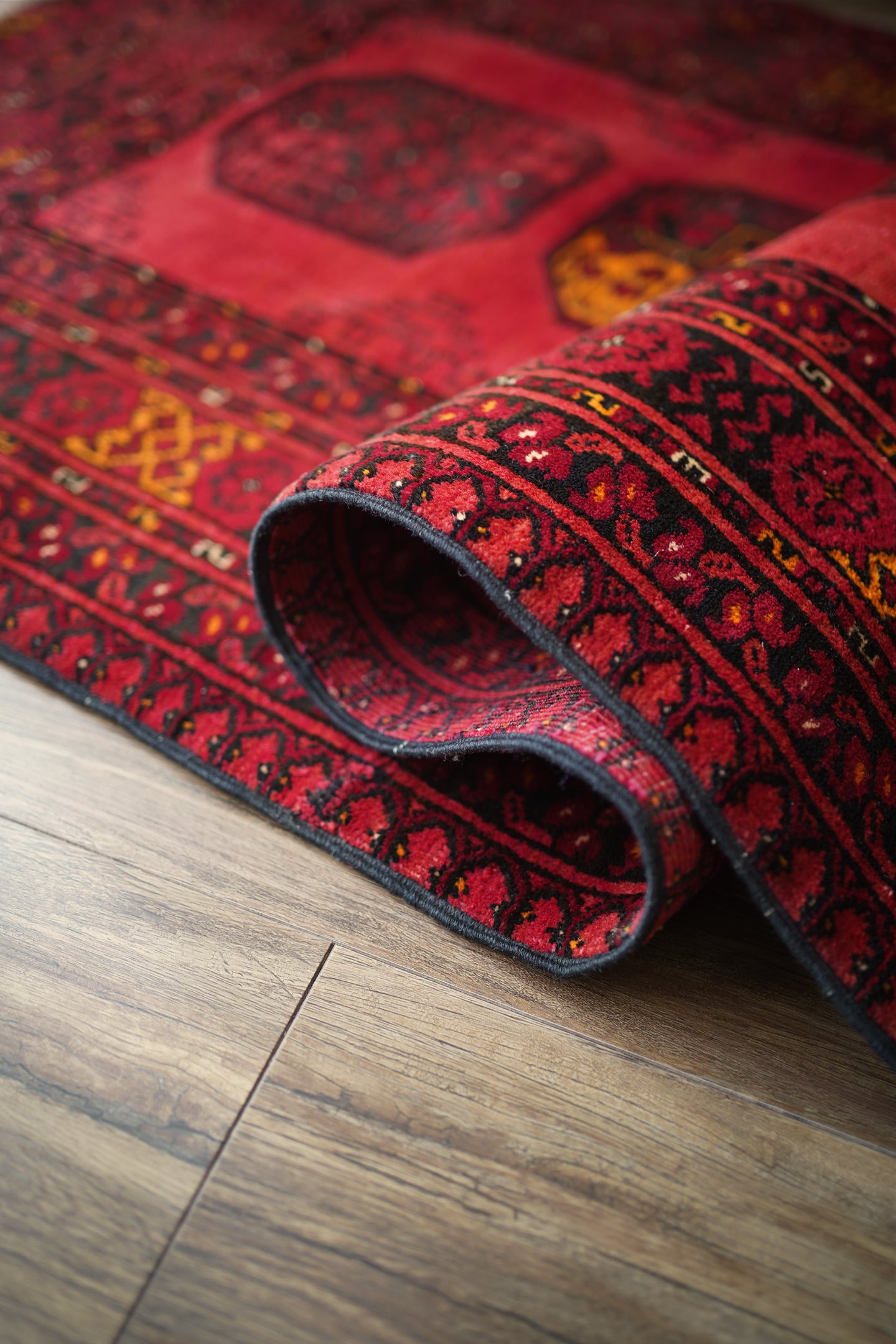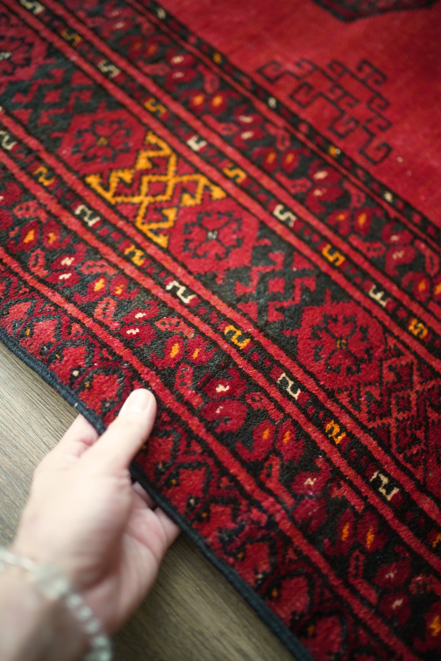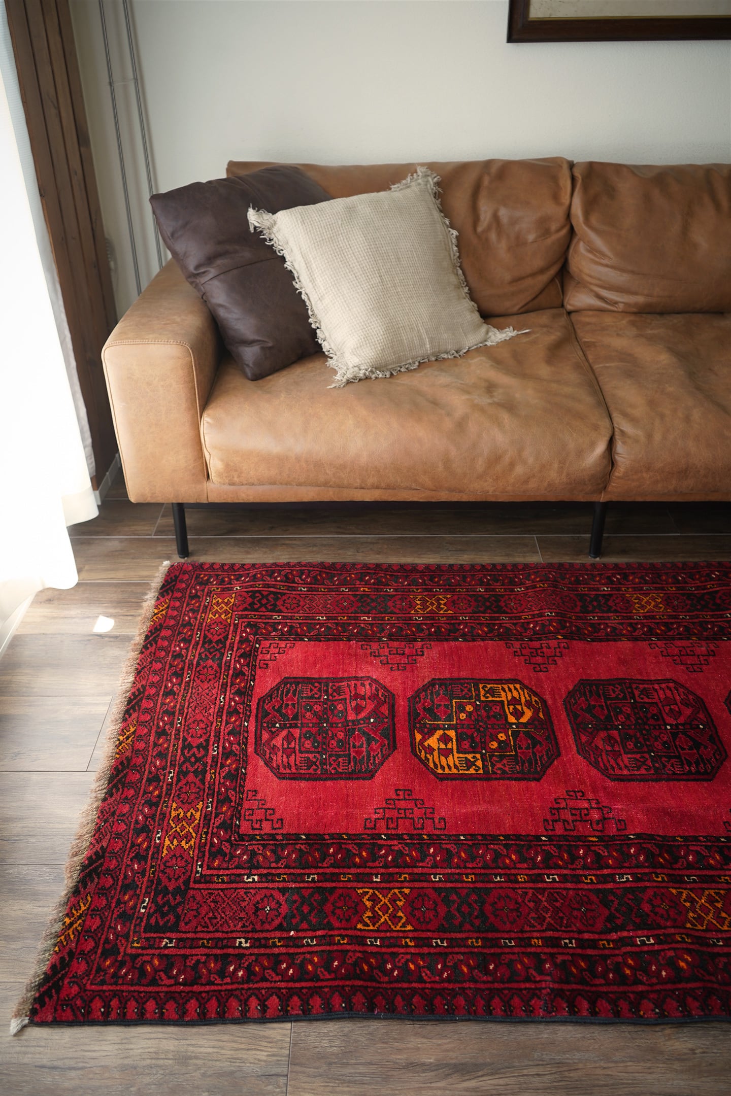 おおよそ60年前にトルクメン族によって織られたヴィンテージラグ。四方の三つ葉のクローバーのようなデザインはエルサリと呼ばれる部族の家紋由来の紋様で、大きなギュルが特徴的でフィルパイとも呼ばれています。深く濃い赤に綺麗に並んだフィルパイはまさにトルクメンといった印象の一枚で、山吹色がアクセントカラーになっているところが大変ユニークです。厚みは7mm程度で、トルクメン特有の目の詰まった織りで作られており、非常に重量感もある堅牢な作りをしています。表面はふわっと滑らかな肌触りで、裏面はコシのある質感。お写真では中央が比較的赤みが強く見えますが、肉眼で見ると全体的に同じ色合いに見えます。目立ったダメージなども見受けられず良好なコンディション。ベッドサイドなどにどうぞ♫