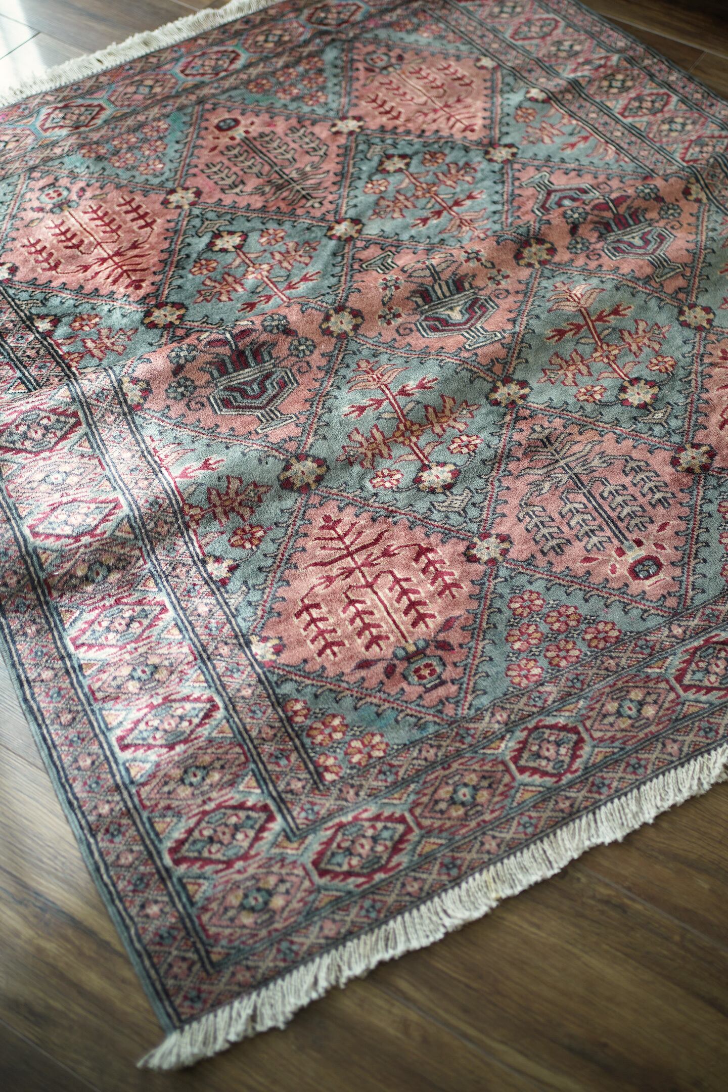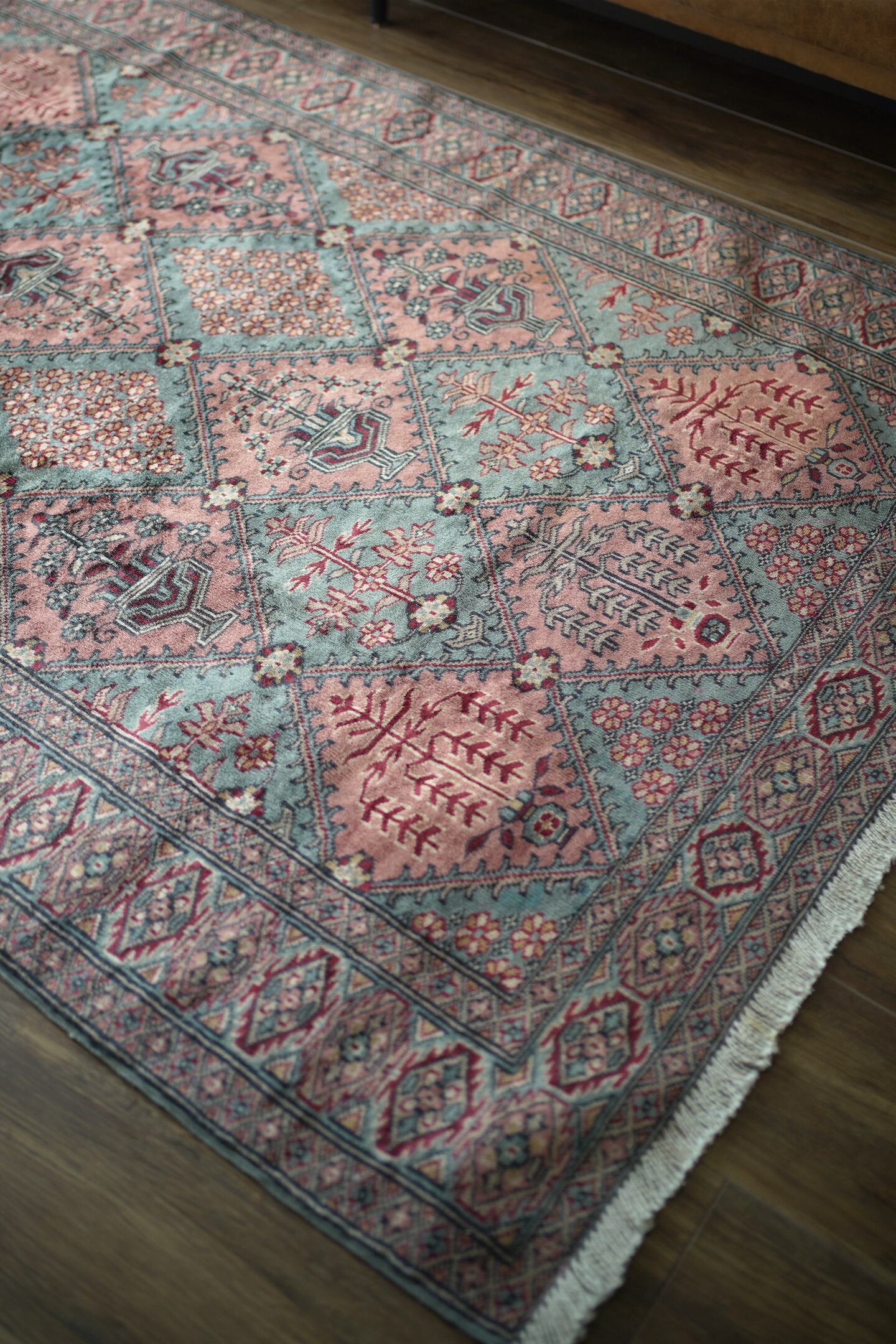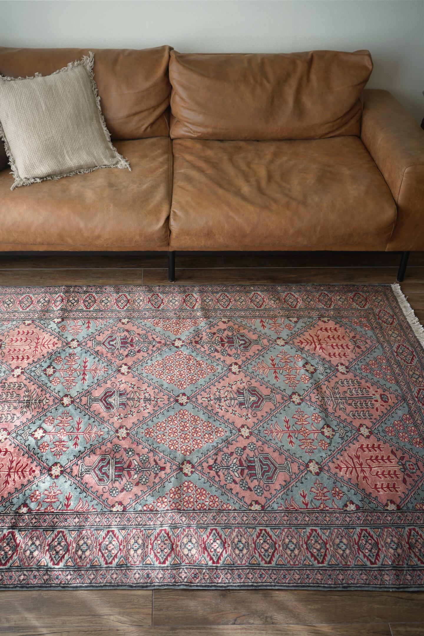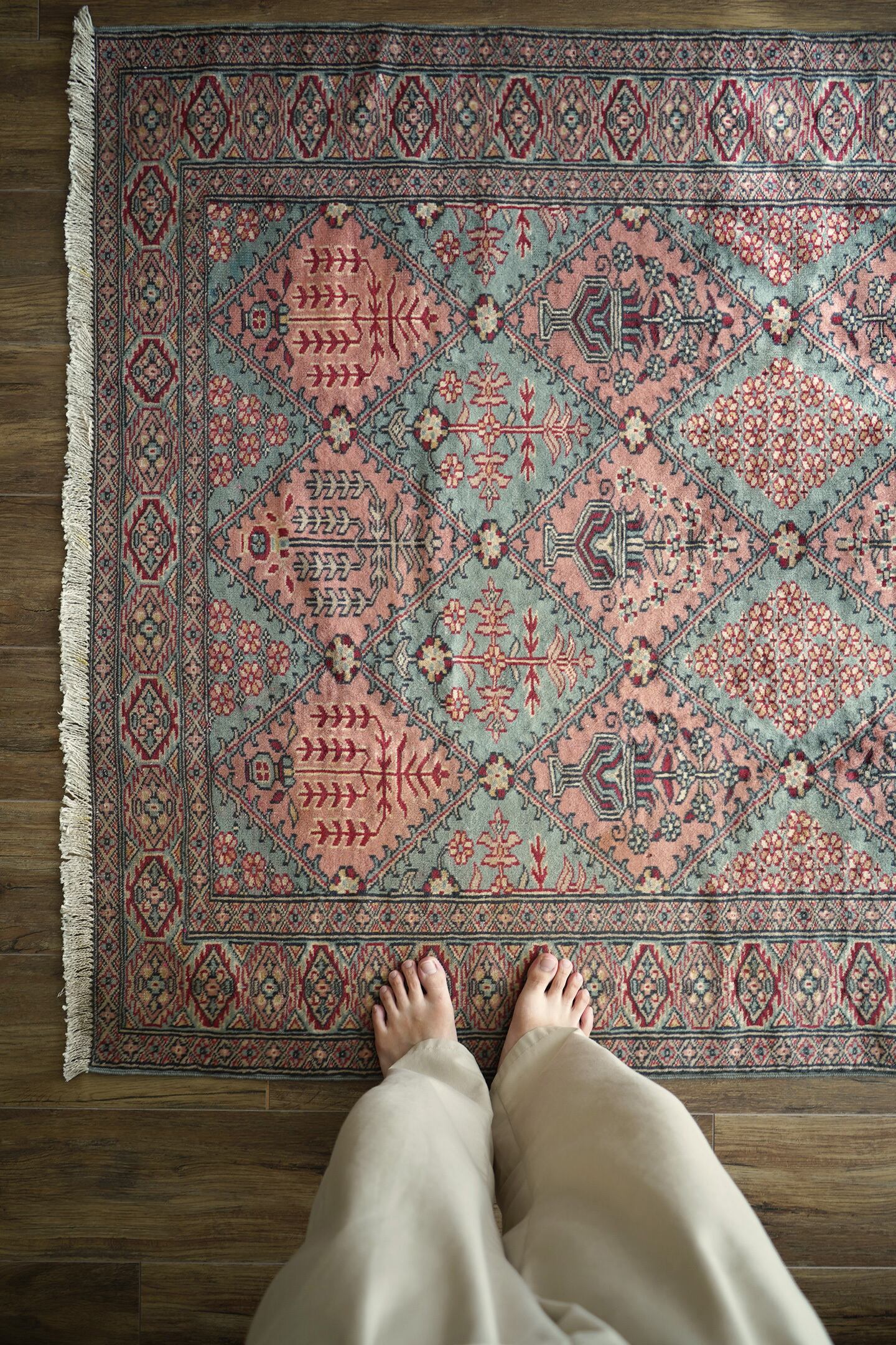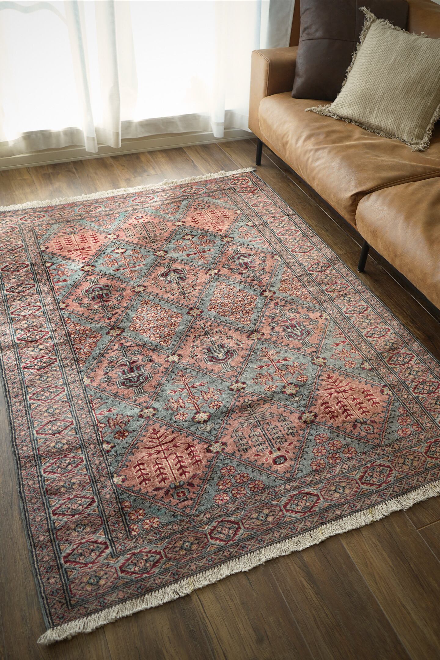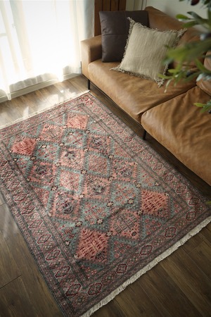 約30年ほど前に作られたパキスタン産ラグ。バクティアリ産のペルシャ絨毯を彷彿とさせる可愛らしい花モチーフの可憐な菱形パターンに、淡いピンク×スモーキーな水色の色味が非常にユニークな一枚です。全体的に色褪せとくすみがあり、使い込まれたヴィンテージ感溢れる一枚です。パイルは短めでサラッと滑らかな肌触り。厚みは4mm程度。薄手のラグですが程よく重みもあり、上を歩いてもずれる心配はなさそうです。コンディションとしてはいくつかパイルが薄くなっている箇所がある点と蛍光色のピンクが見えている部分がございます(お写真最後をご参照ください)。またお写真は日差しが強めの日に撮影しており、肉眼で見るともう少し暗めに見えるかと思います。