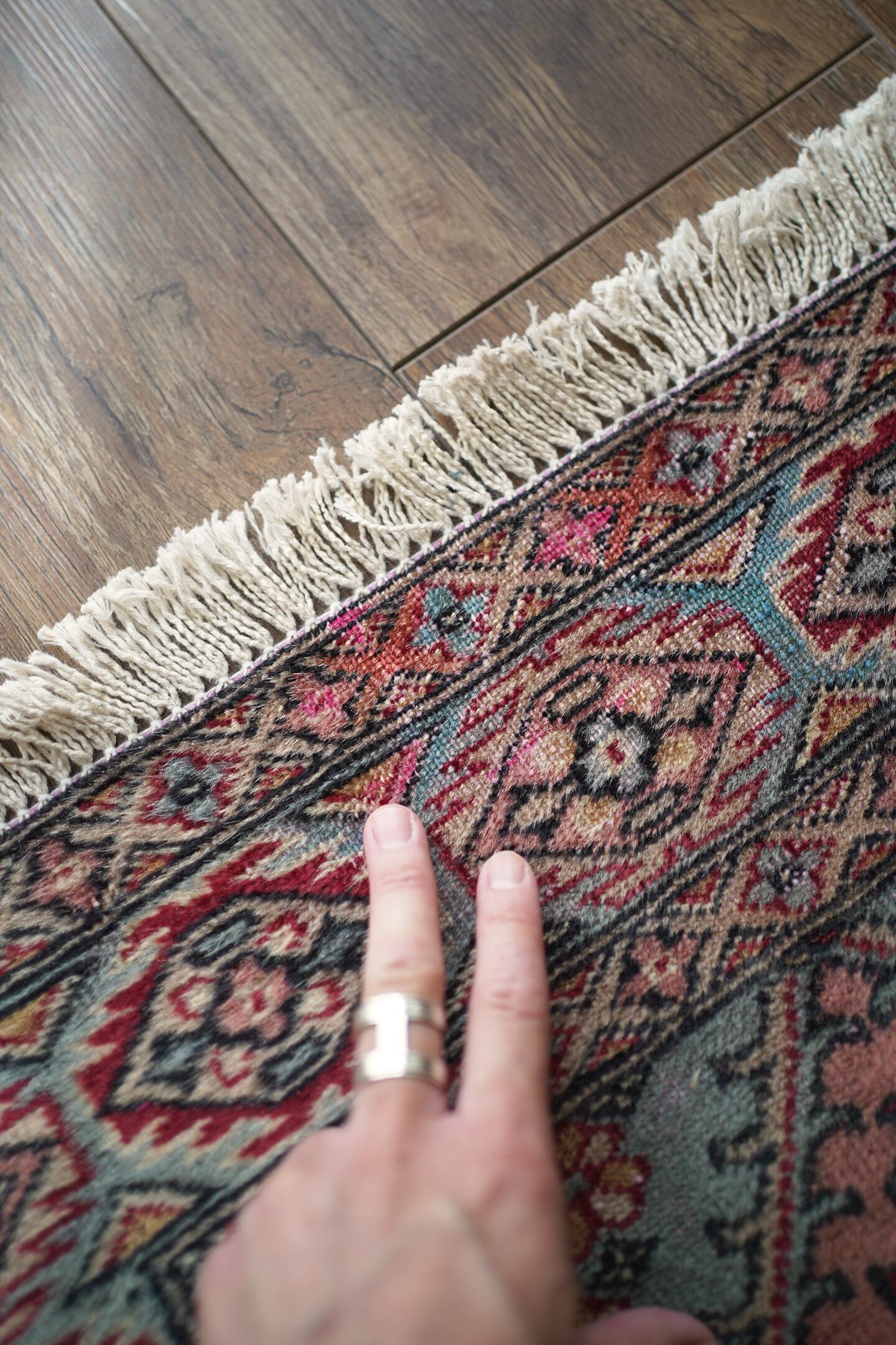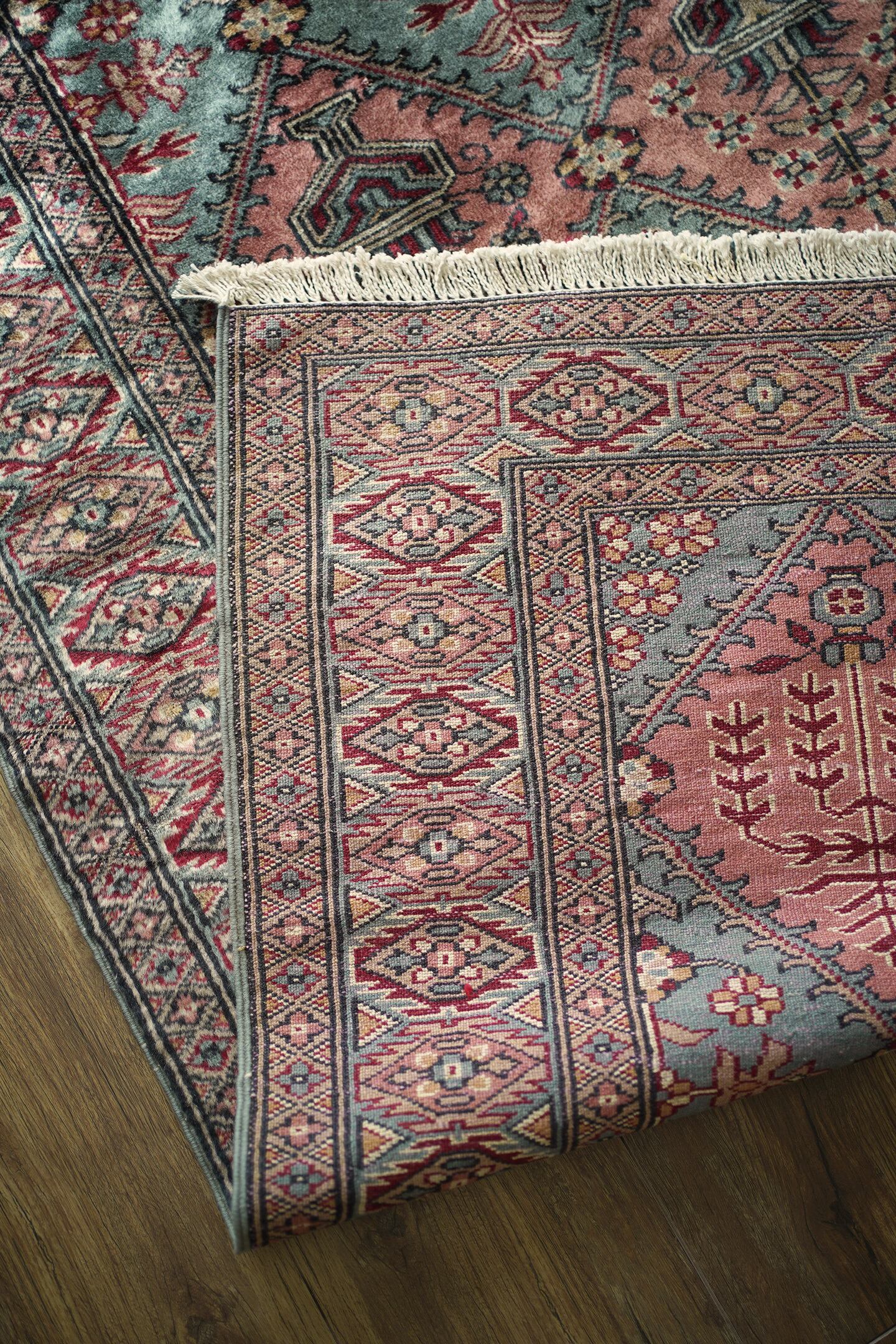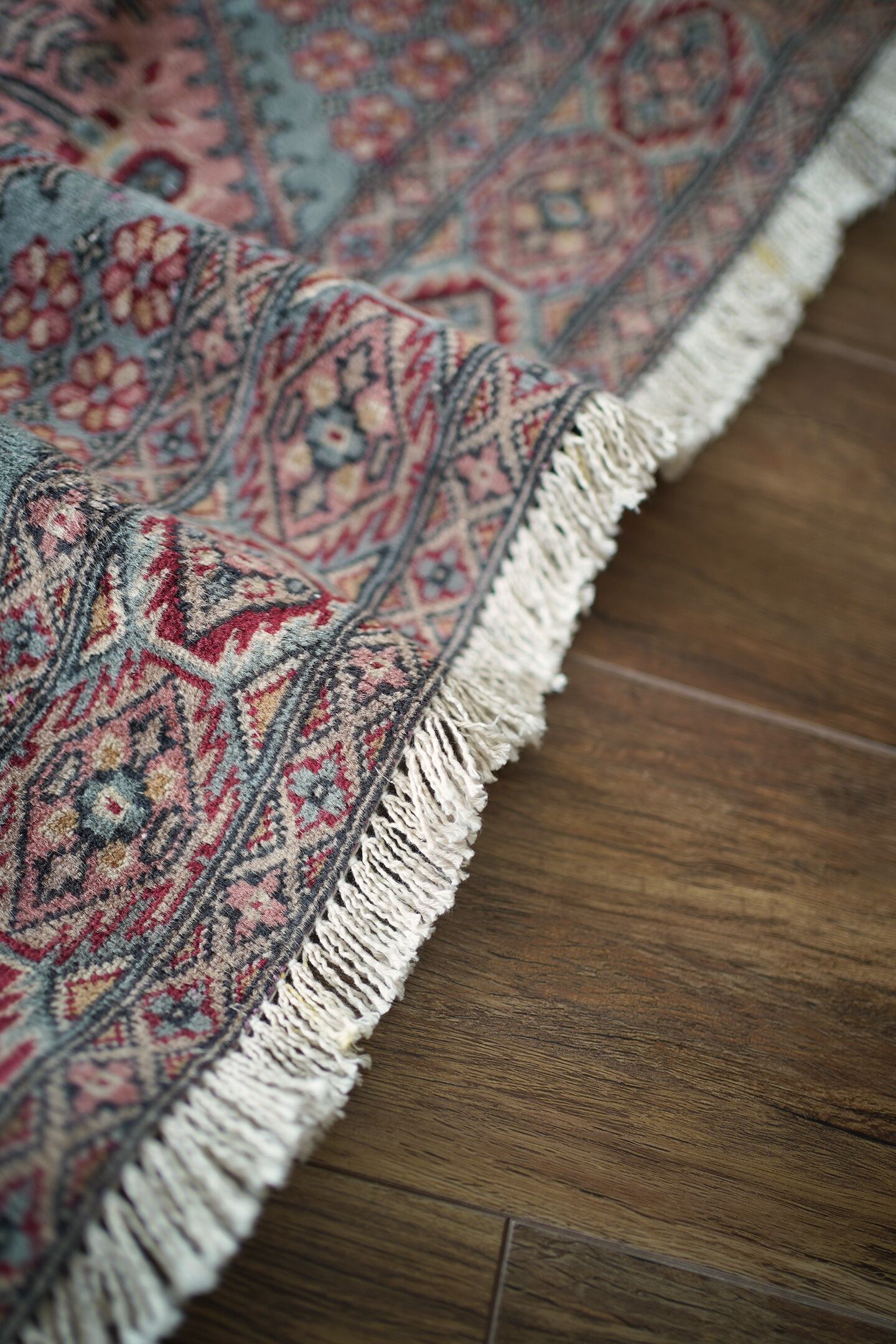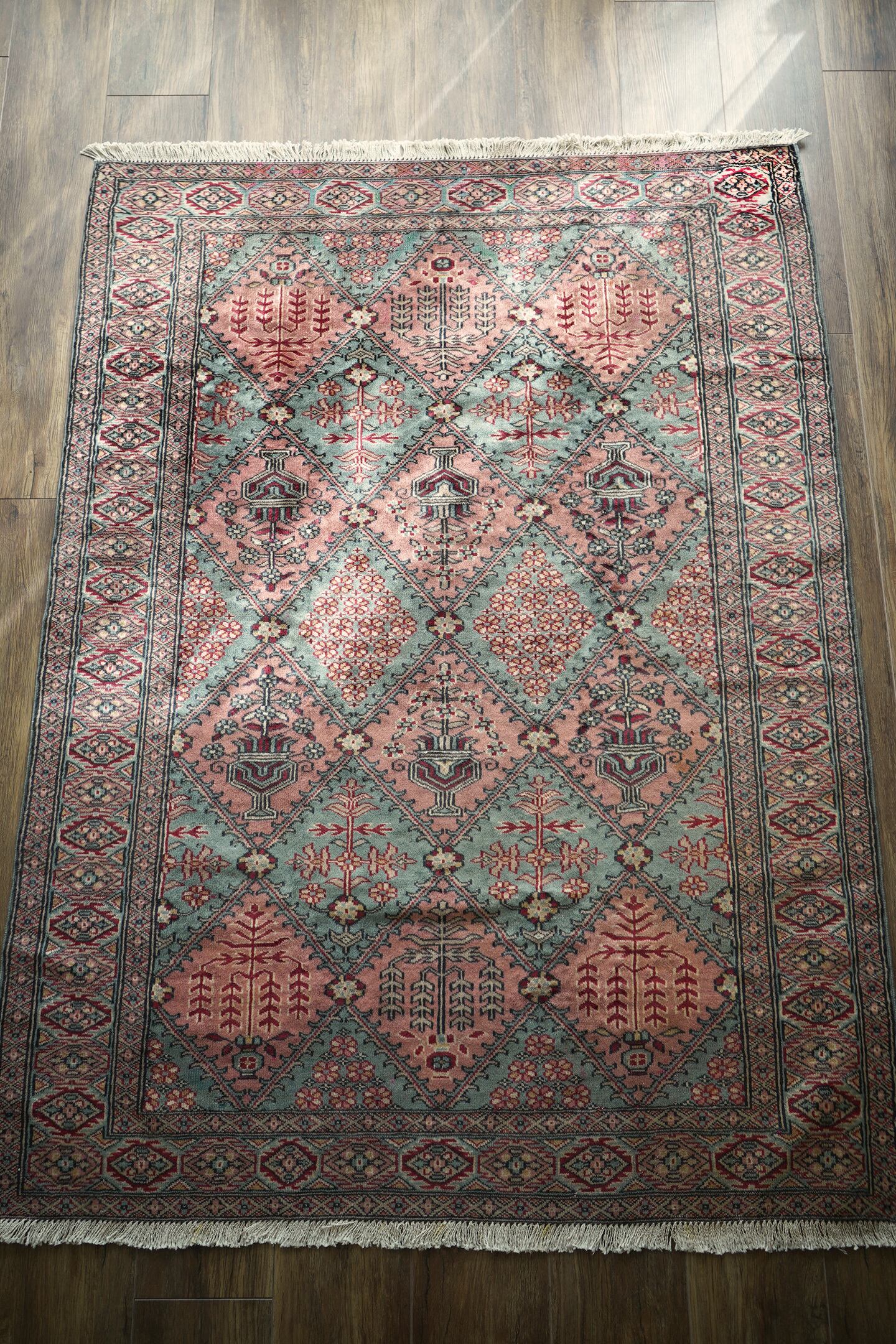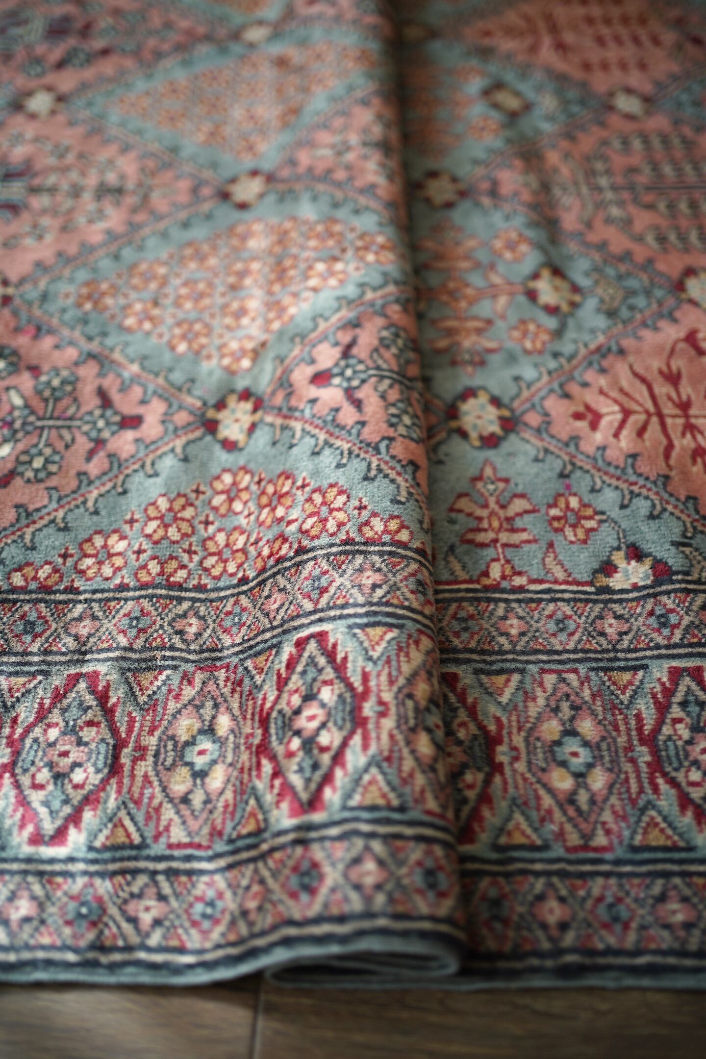 約30年ほど前に作られたパキスタン産ラグ。バクティアリ産のペルシャ絨毯を彷彿とさせる可愛らしい花モチーフの可憐な菱形パターンに、淡いピンク×スモーキーな水色の色味が非常にユニークな一枚です。全体的に色褪せとくすみがあり、使い込まれたヴィンテージ感溢れる一枚です。パイルは短めでサラッと滑らかな肌触り。厚みは4mm程度。薄手のラグですが程よく重みもあり、上を歩いてもずれる心配はなさそうです。コンディションとしてはいくつかパイルが薄くなっている箇所がある点と蛍光色のピンクが見えている部分がございます(お写真最後をご参照ください)。またお写真は日差しが強めの日に撮影しており、肉眼で見るともう少し暗めに見えるかと思います。