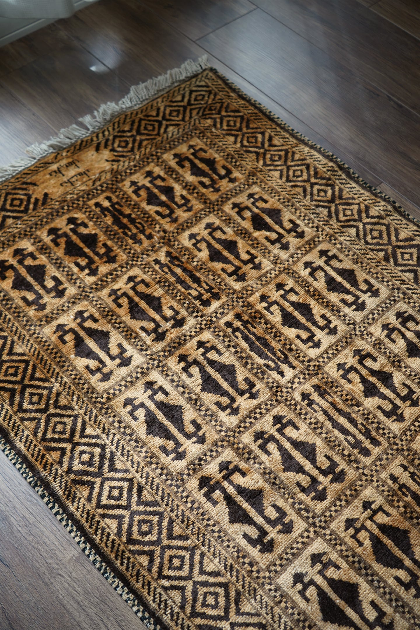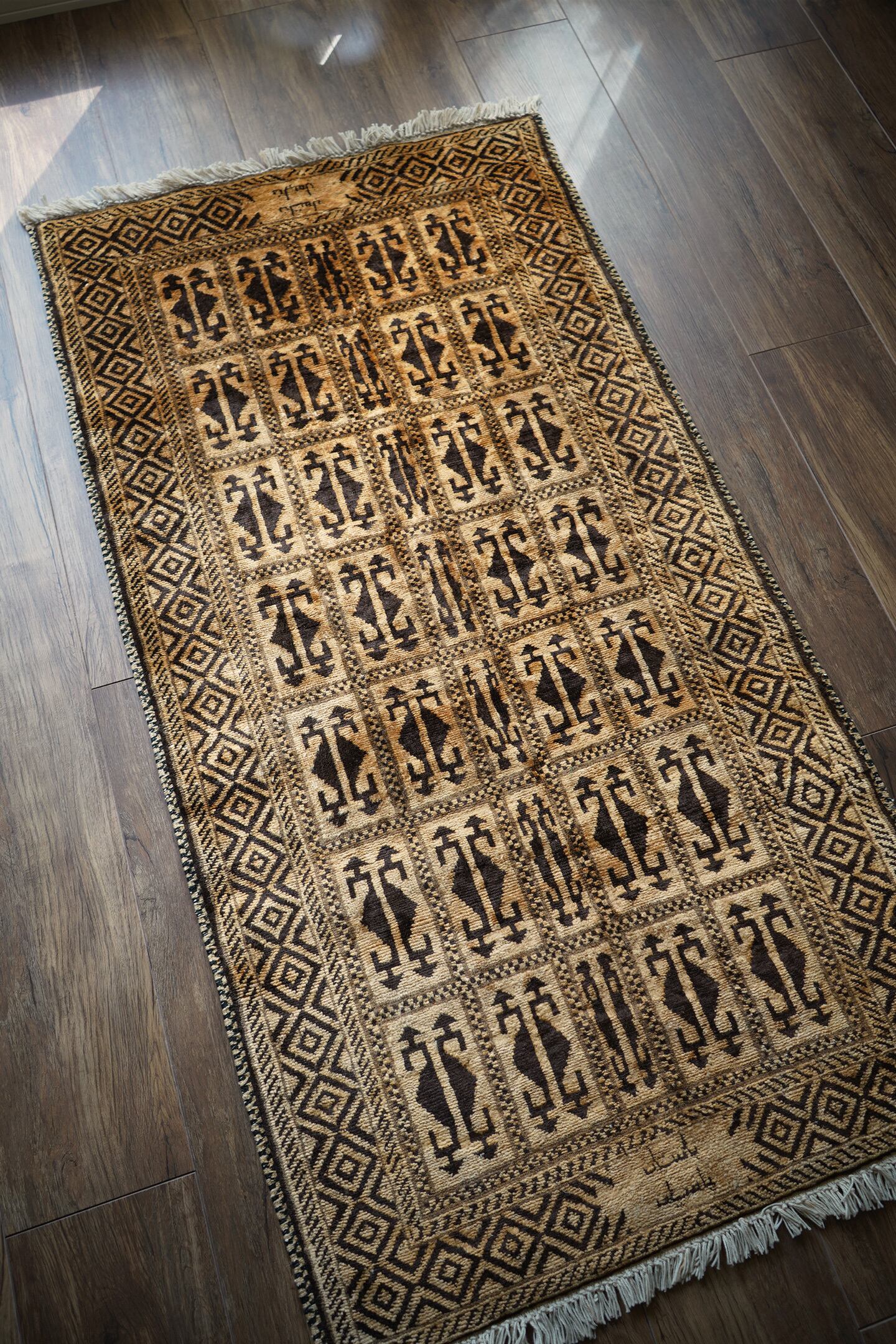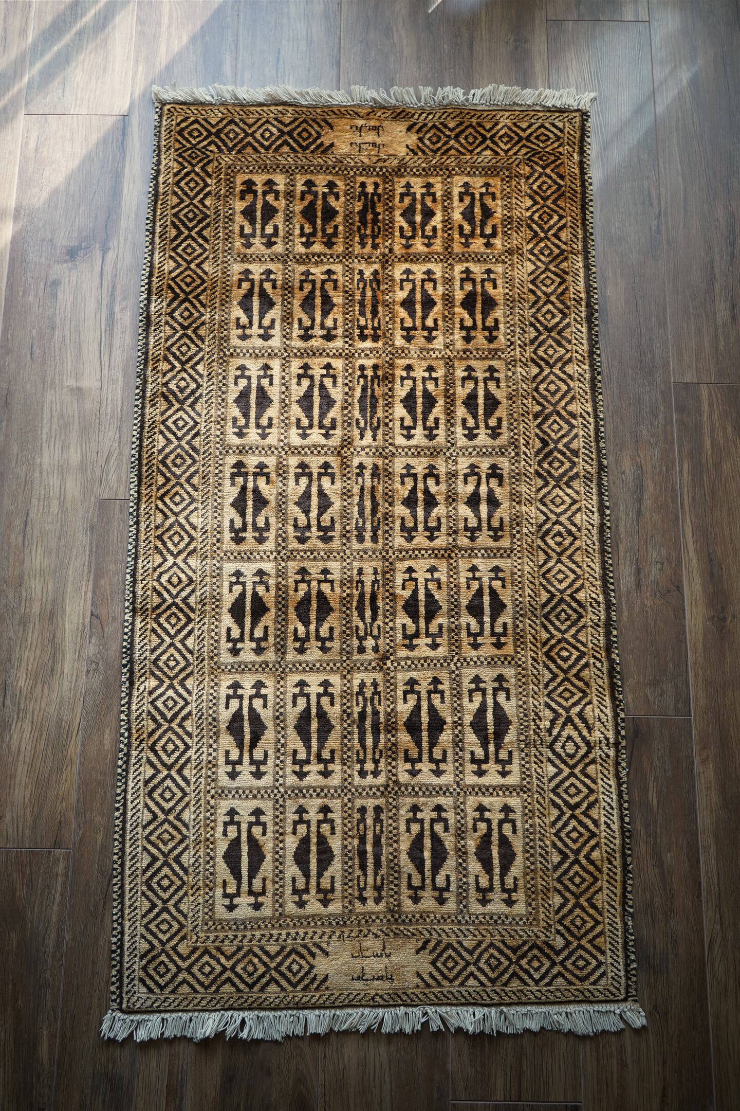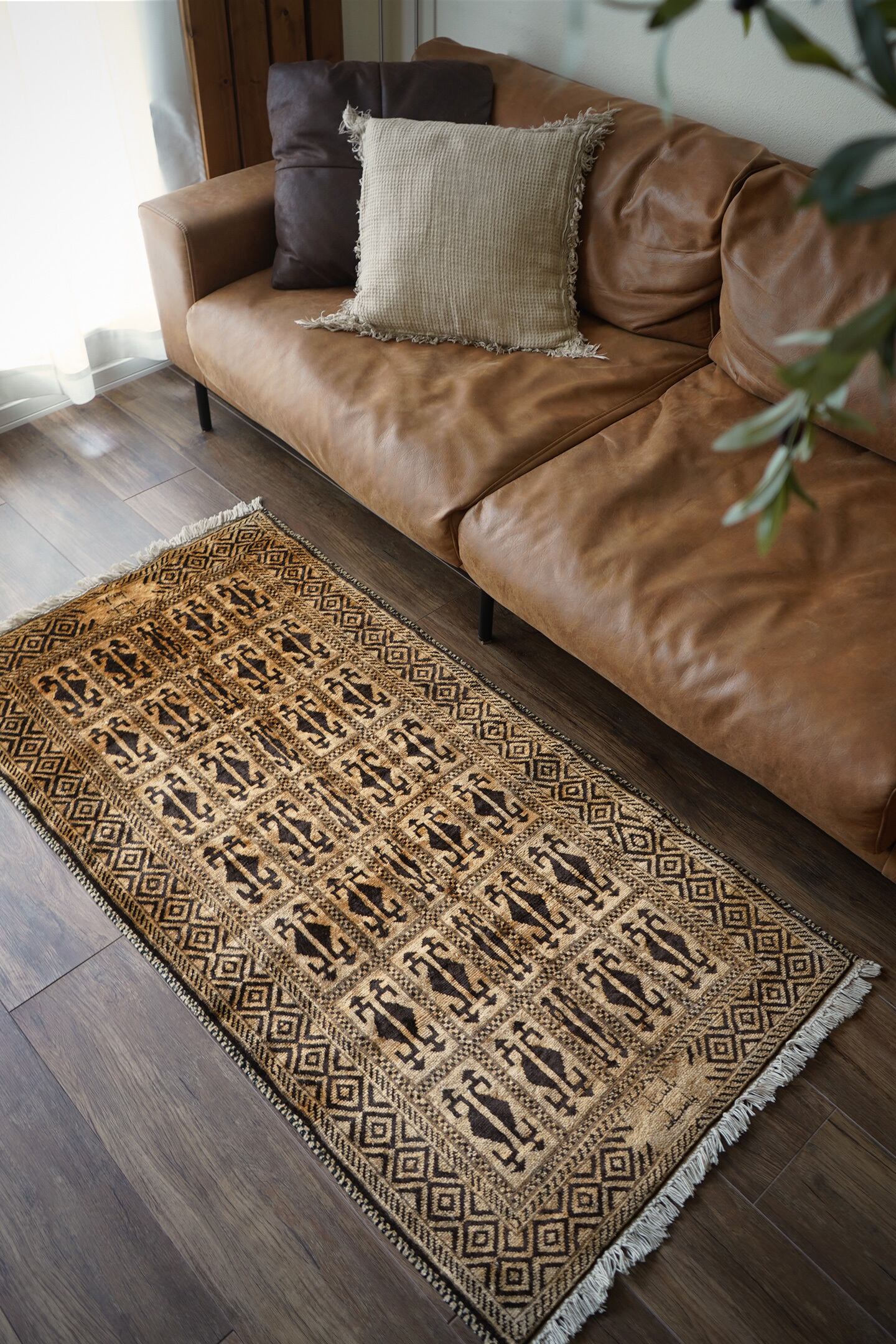 アフガニスタンのほぼ中央に位置するバーミヤンという町でモンゴル系民族のハザラ人によって織られた珍しいラグです(現在のハザラ人はアフガニスタンの都市カブールに居住しています)。フィールド、ボーダー、シラゼ(フレーム箇所)にかけて全てがとてもユニークでお洒落なデザインで、フリンジ近辺には作られた地域の名称である″バーミアン″の文字が織り込まれています。ゴールドとベージュの中間色のような素晴らしい色合いで、とてもカッコいい印象です。表面のパイルはふわサラッとした滑らかな肌触りで、厚みは7mm程度。状態も言うことなしのパーフェクトコンディション。なかなか見かけないデザインなので、ピンと来た方はお見逃しなく。
