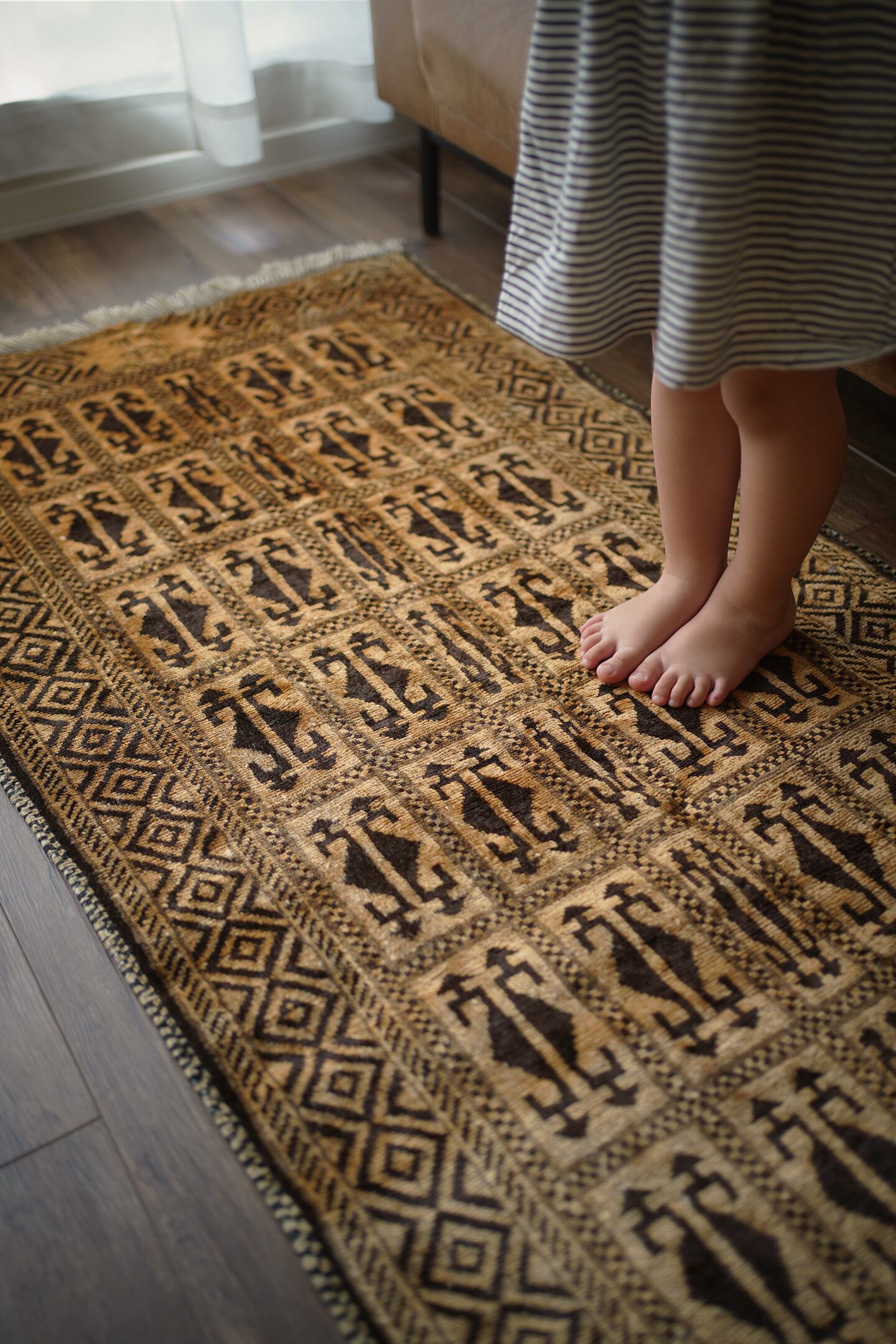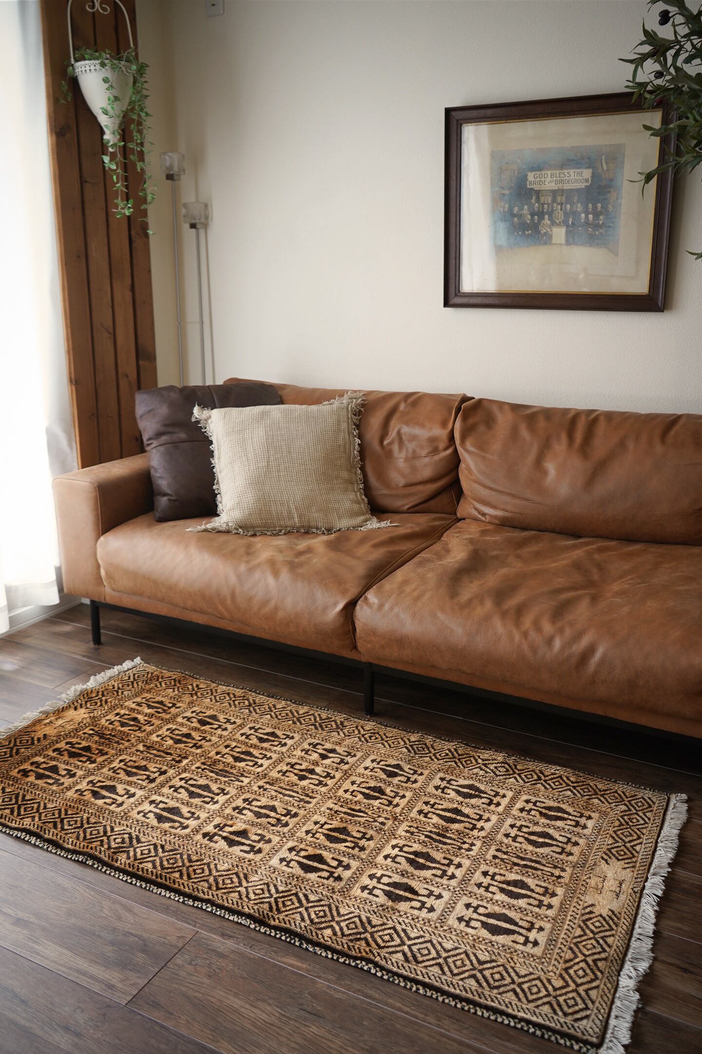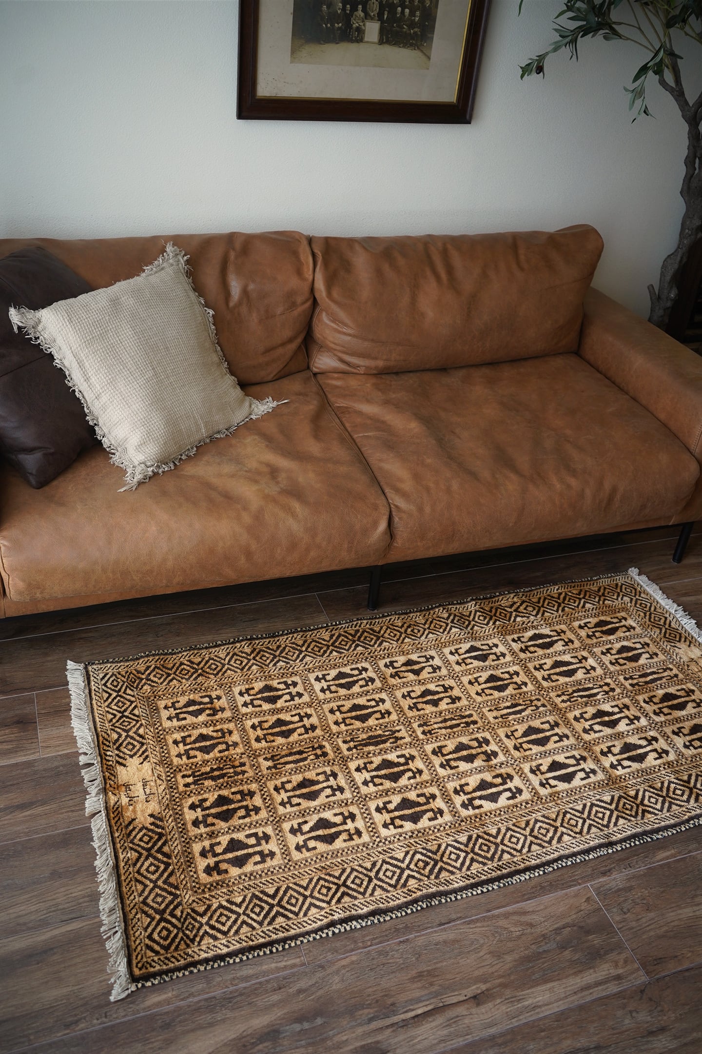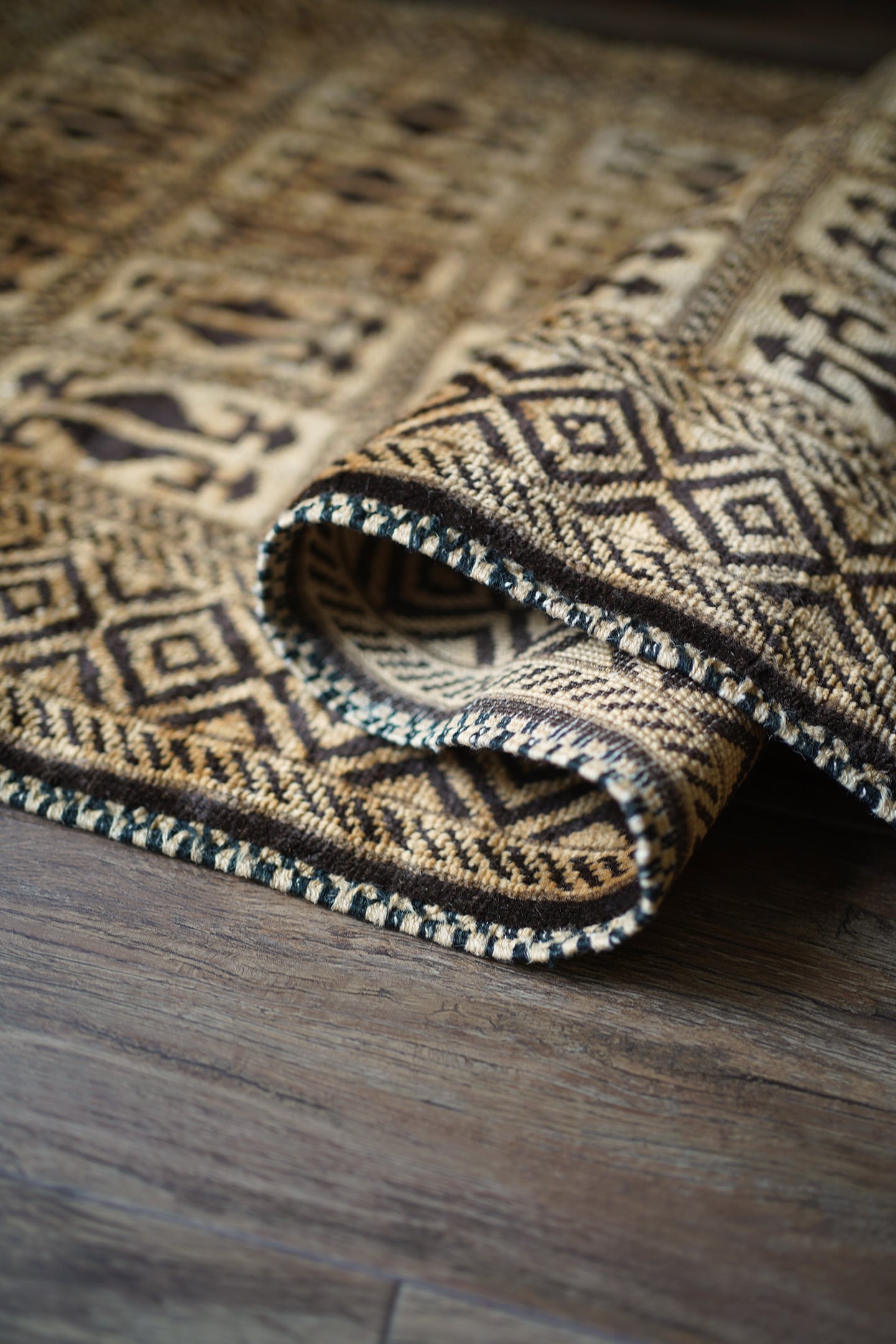 アフガニスタンのほぼ中央に位置するバーミヤンという町でモンゴル系民族のハザラ人によって織られた珍しいラグです(現在のハザラ人はアフガニスタンの都市カブールに居住しています)。フィールド、ボーダー、シラゼ(フレーム箇所)にかけて全てがとてもユニークでお洒落なデザインで、フリンジ近辺には作られた地域の名称である″バーミアン″の文字が織り込まれています。ゴールドとベージュの中間色のような素晴らしい色合いで、とてもカッコいい印象です。表面のパイルはふわサラッとした滑らかな肌触りで、厚みは7mm程度。状態も言うことなしのパーフェクトコンディション。なかなか見かけないデザインなので、ピンと来た方はお見逃しなく。