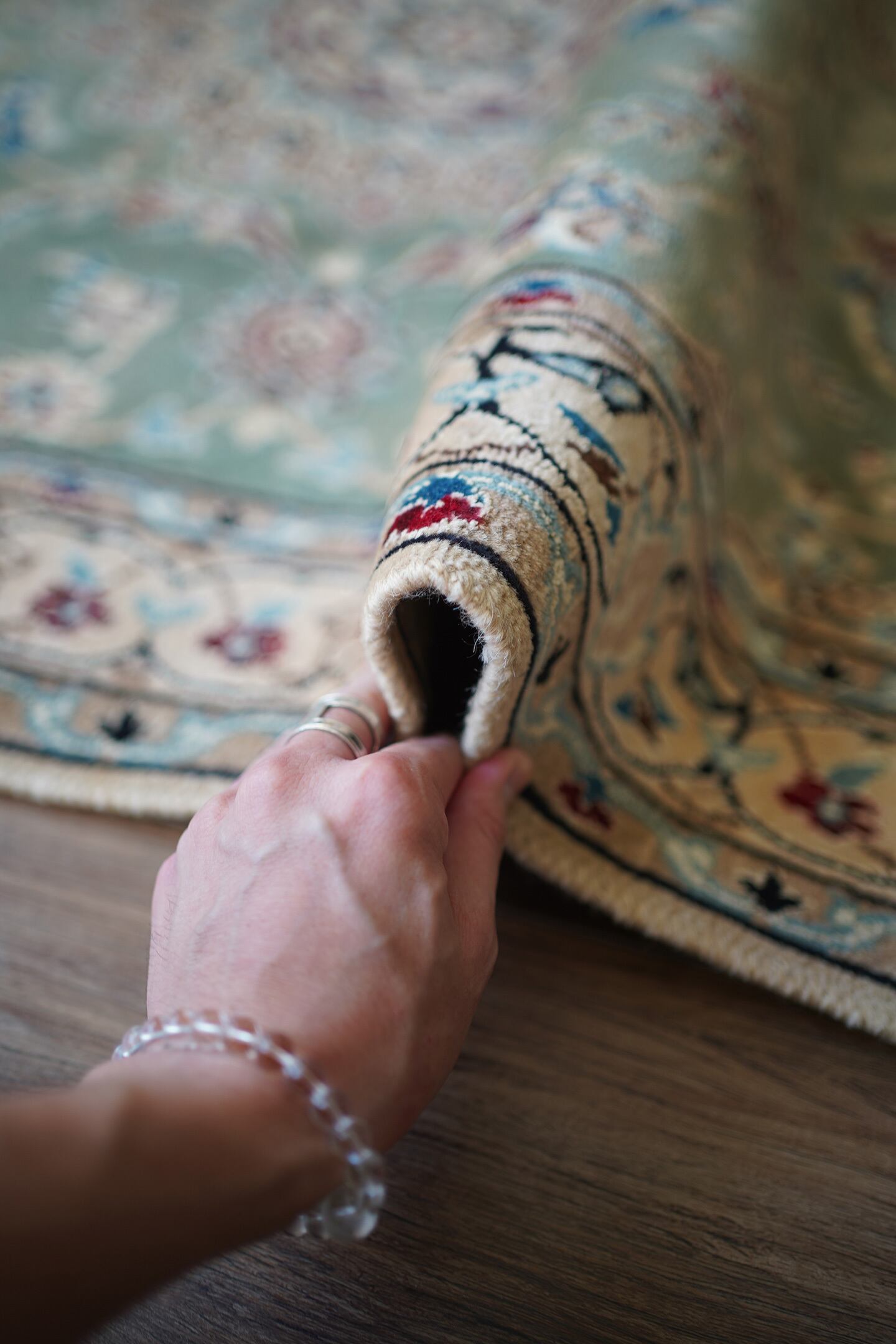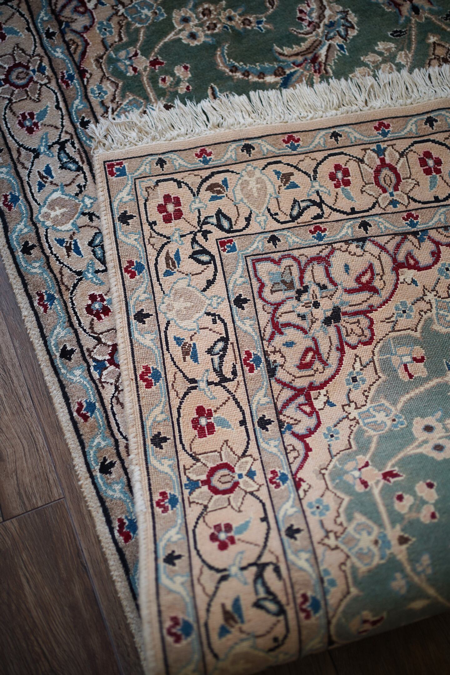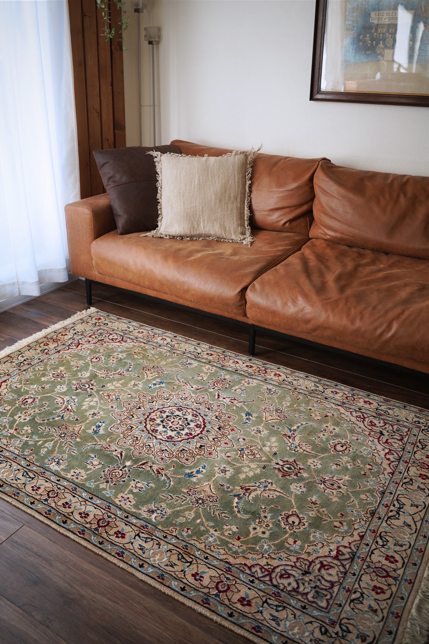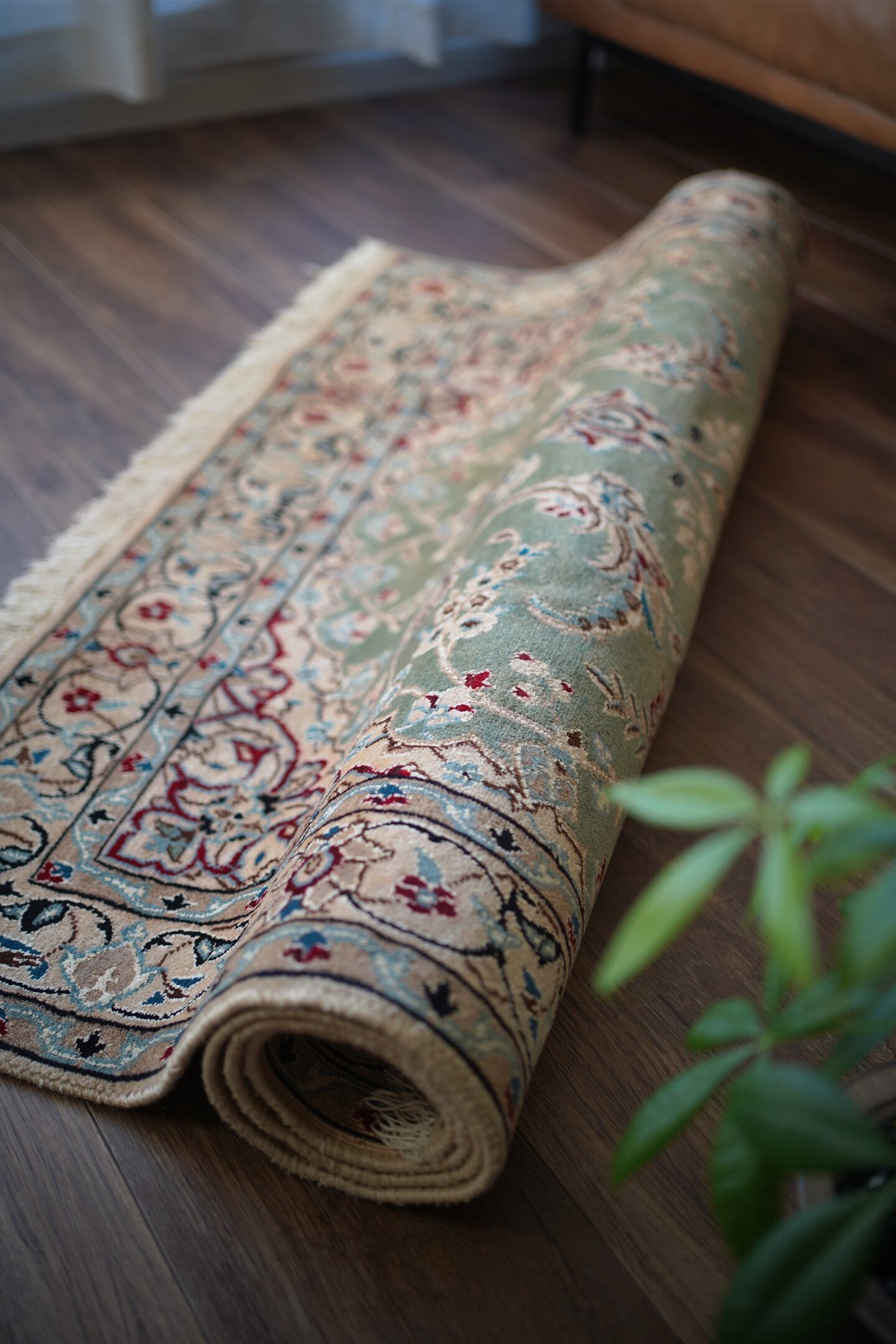 優美で落ち着いたデザインで人気のイラン中央部の都市ナイン産のラグ。ペルシャ絨毯5大産地の一つで華やかな草花モチーフのパターンが代表的です。淡いグリーンとアイボリーの優しいカラーをベースに、赤紫、水色などのアクセントカラーが使われた柔らかい雰囲気が魅力の一枚。フラットに整った長さの上質感を感じるパイルで、表面はふわっと柔らかく優しい肌触りをしています。厚みは7mmほど。模様のふちどりの白いラインでシルクの糸が使用されています。一部薄らとシミのような汚れがありましたので、現在クリーニングとシミ抜き作業中となります。お写真よりも綺麗な状態でお届けできますので、ご安心いただければと思います。ベッドサイドやリビングのソファ前などお好みのスペースに。