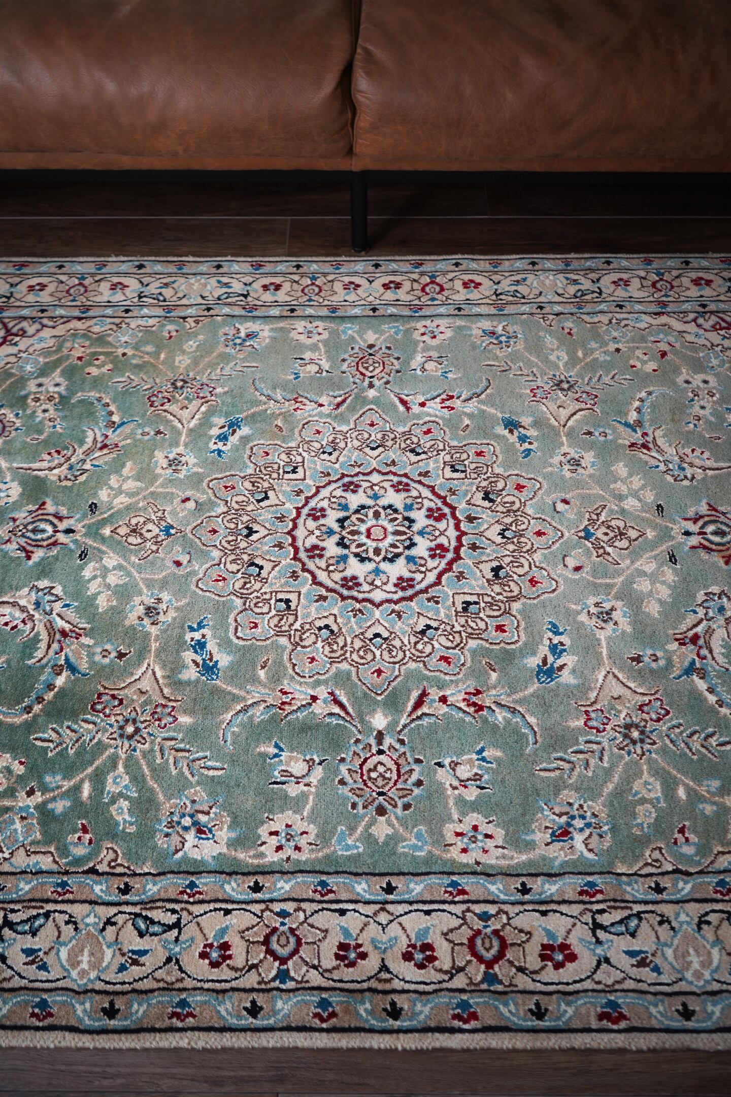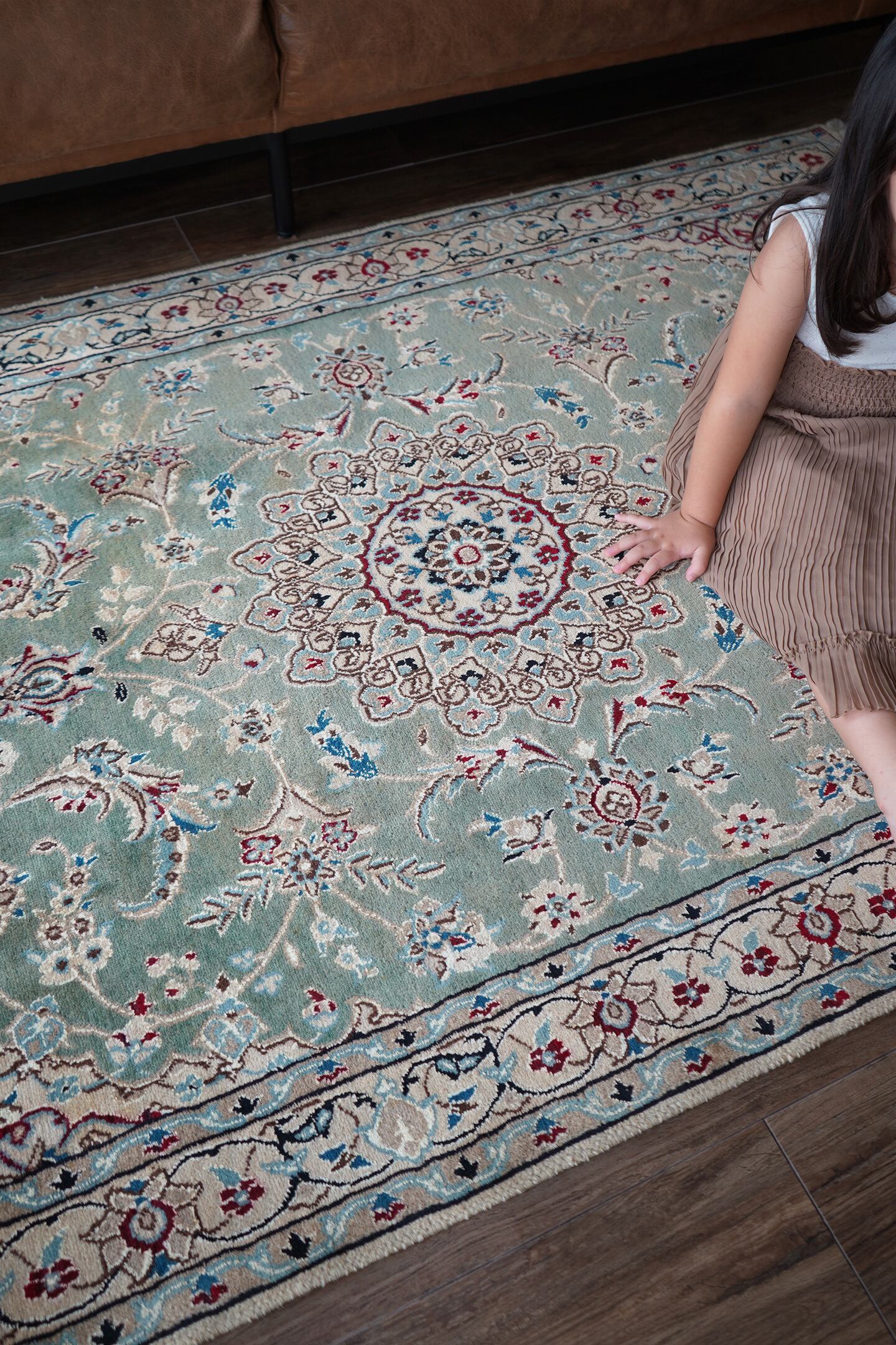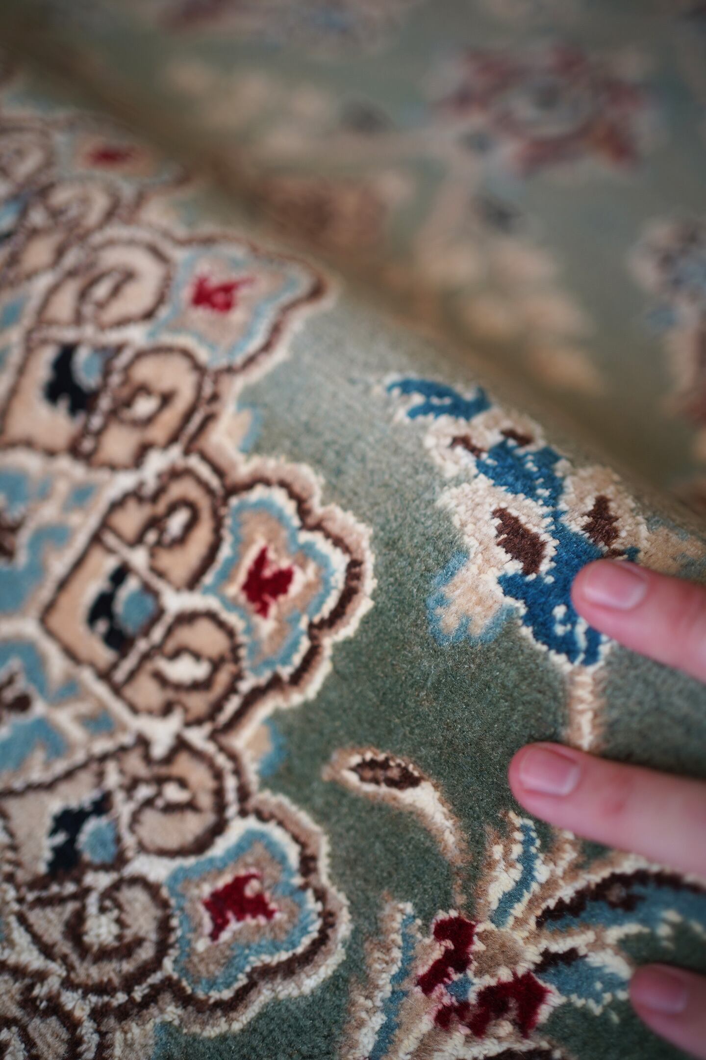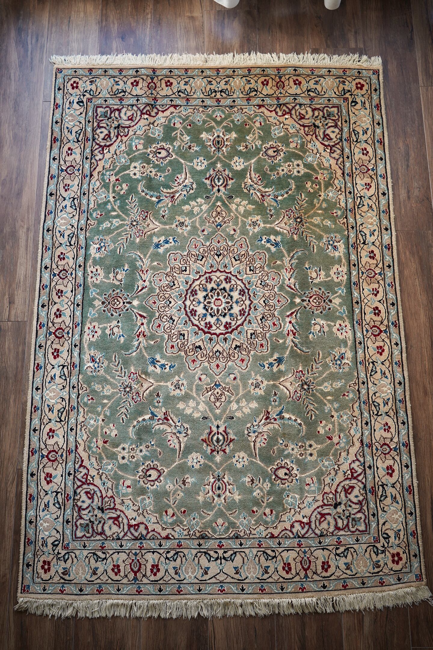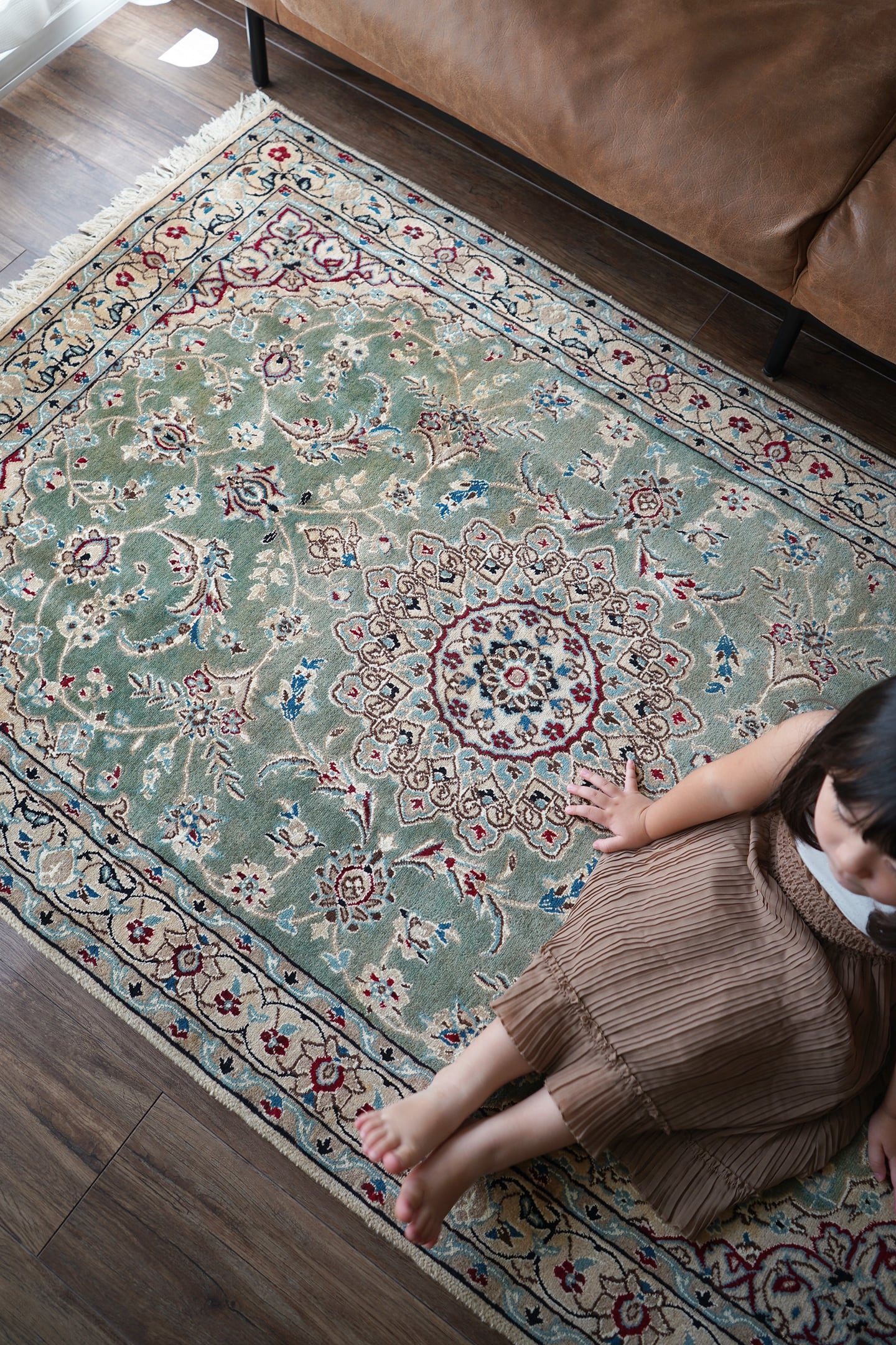 優美で落ち着いたデザインで人気のイラン中央部の都市ナイン産のラグ。ペルシャ絨毯5大産地の一つで華やかな草花モチーフのパターンが代表的です。淡いグリーンとアイボリーの優しいカラーをベースに、赤紫、水色などのアクセントカラーが使われた柔らかい雰囲気が魅力の一枚。フラットに整った長さの上質感を感じるパイルで、表面はふわっと柔らかく優しい肌触りをしています。厚みは7mmほど。模様のふちどりの白いラインでシルクの糸が使用されています。一部薄らとシミのような汚れがありましたので、現在クリーニングとシミ抜き作業中となります。お写真よりも綺麗な状態でお届けできますので、ご安心いただければと思います。ベッドサイドやリビングのソファ前などお好みのスペースに。