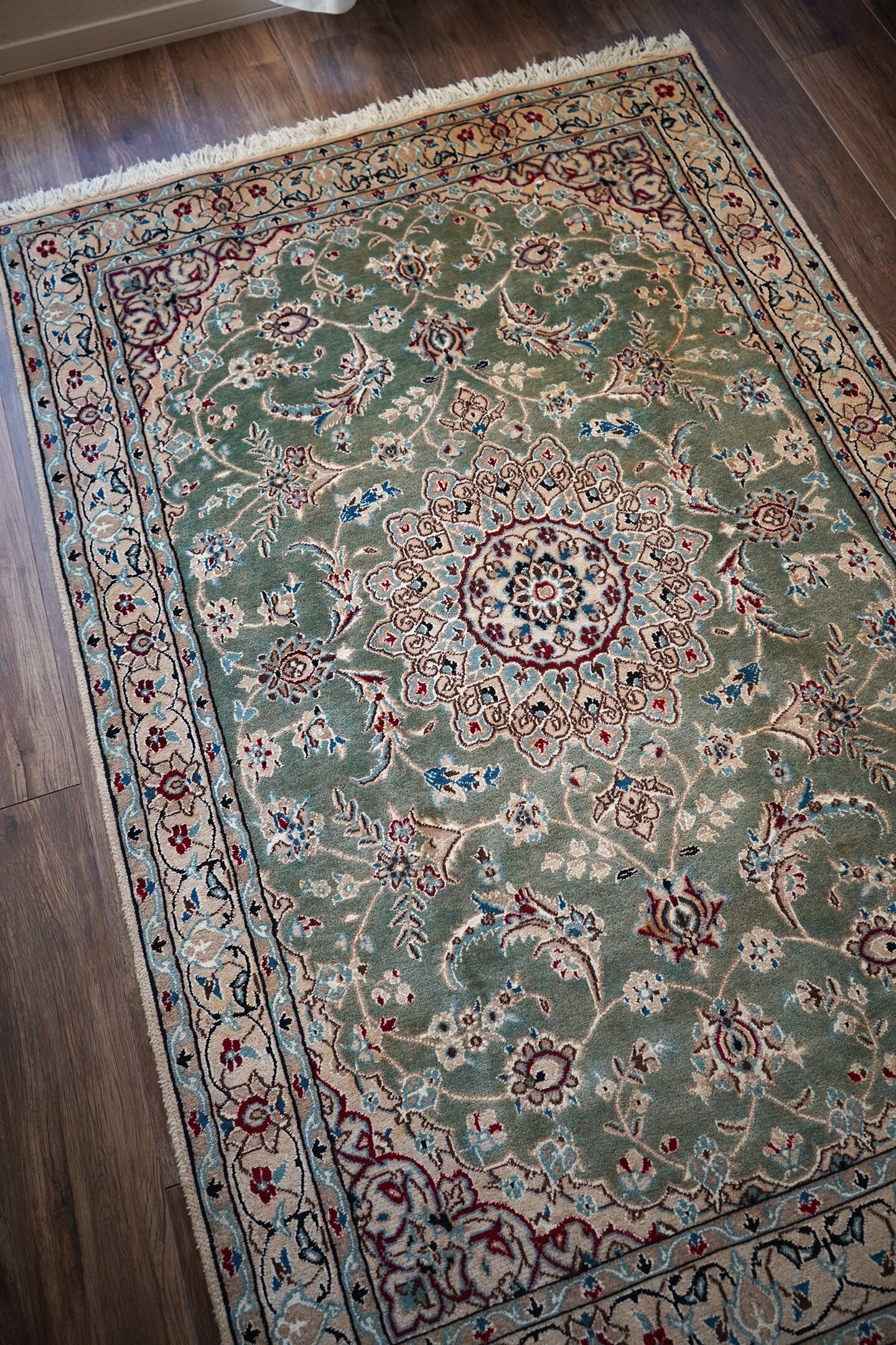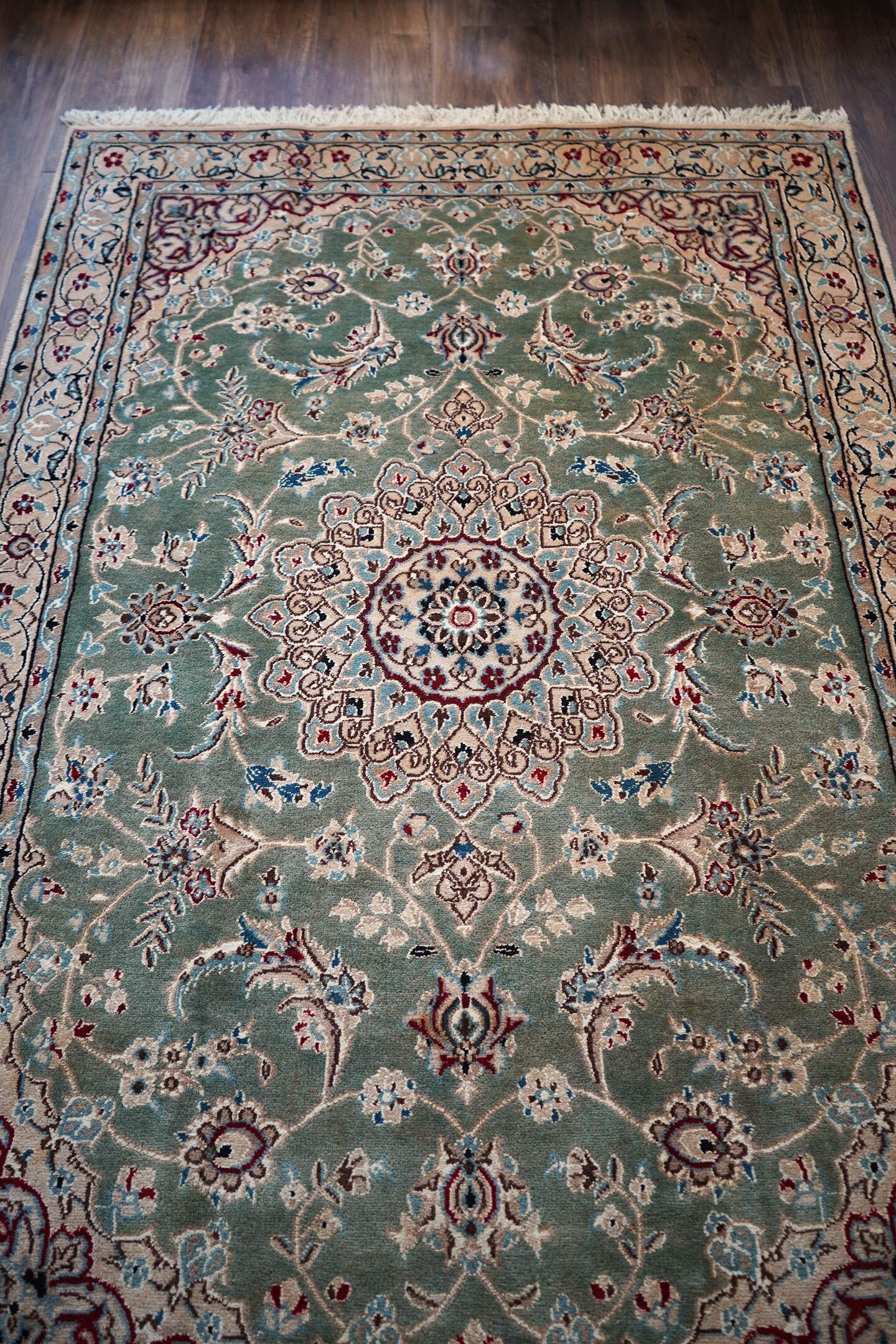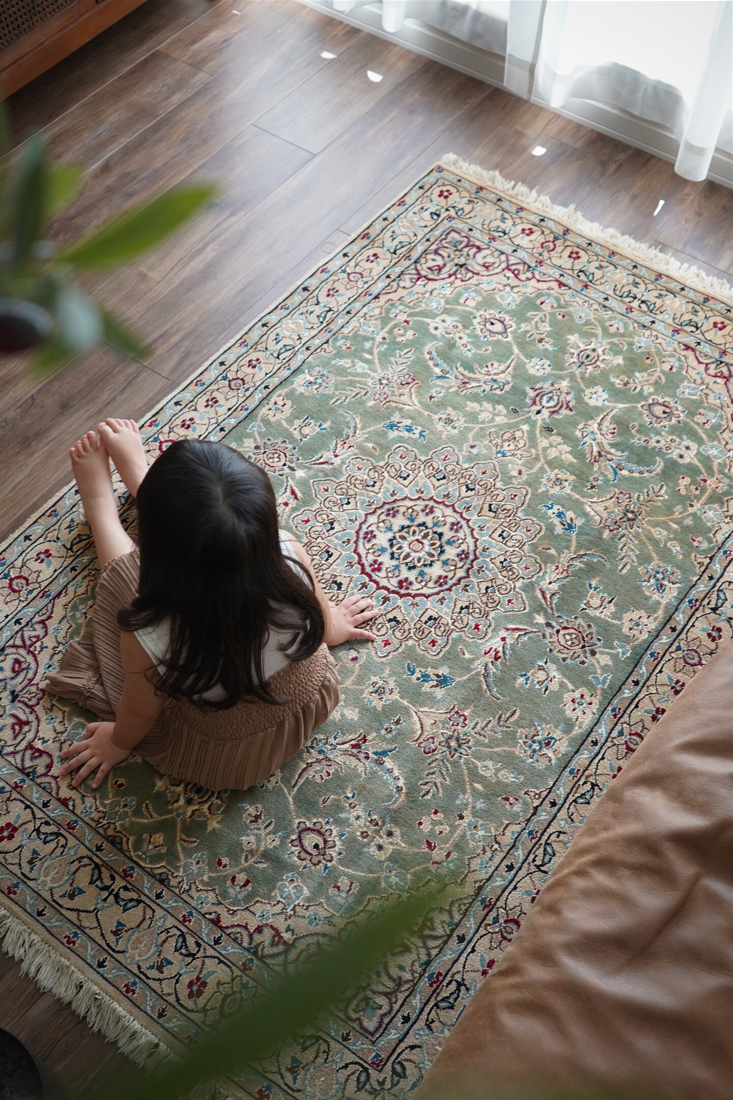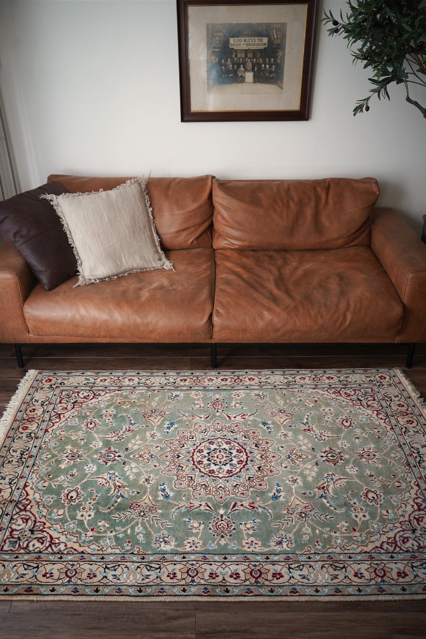 優美で落ち着いたデザインで人気のイラン中央部の都市ナイン産のラグ。ペルシャ絨毯5大産地の一つで華やかな草花モチーフのパターンが代表的です。淡いグリーンとアイボリーの優しいカラーをベースに、赤紫、水色などのアクセントカラーが使われた柔らかい雰囲気が魅力の一枚。フラットに整った長さの上質感を感じるパイルで、表面はふわっと柔らかく優しい肌触りをしています。厚みは7mmほど。模様のふちどりの白いラインでシルクの糸が使用されています。一部薄らとシミのような汚れがありましたので、現在クリーニングとシミ抜き作業中となります。お写真よりも綺麗な状態でお届けできますので、ご安心いただければと思います。ベッドサイドやリビングのソファ前などお好みのスペースに。