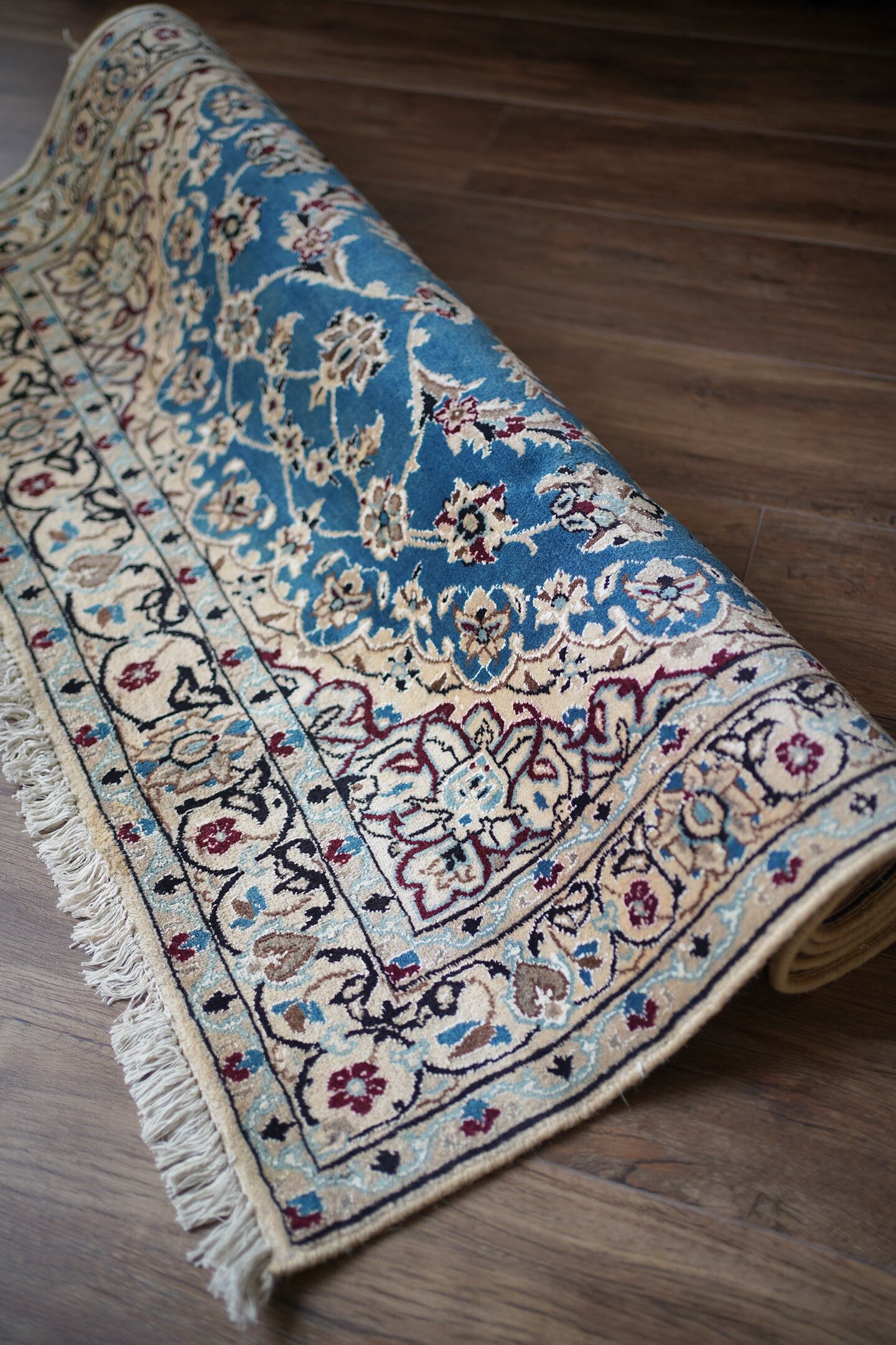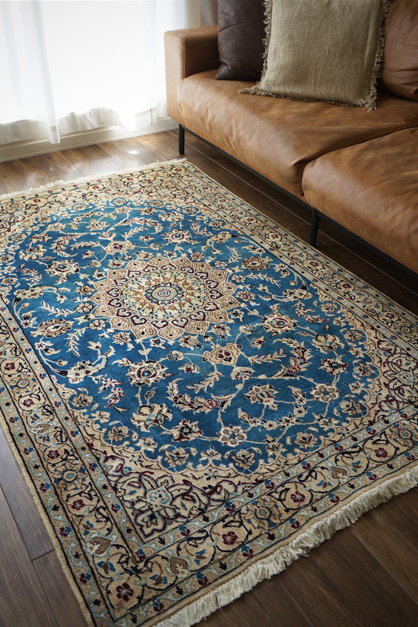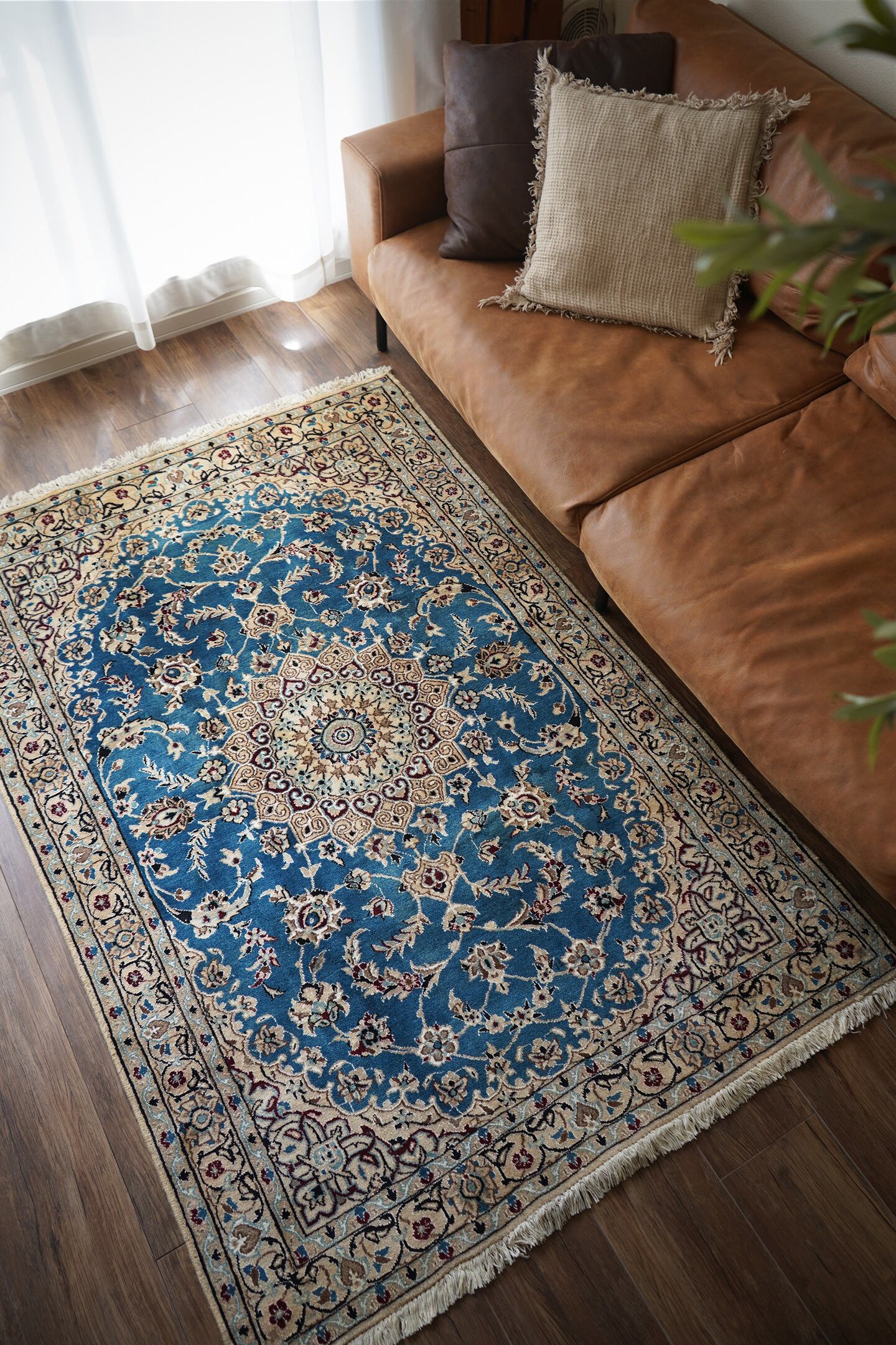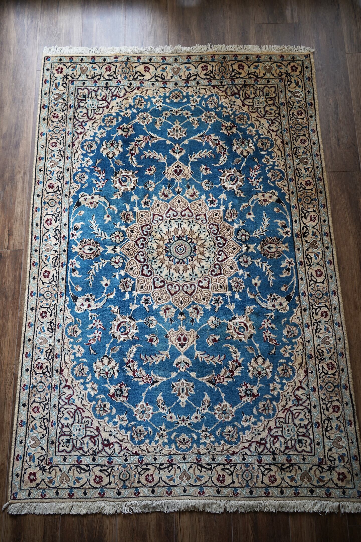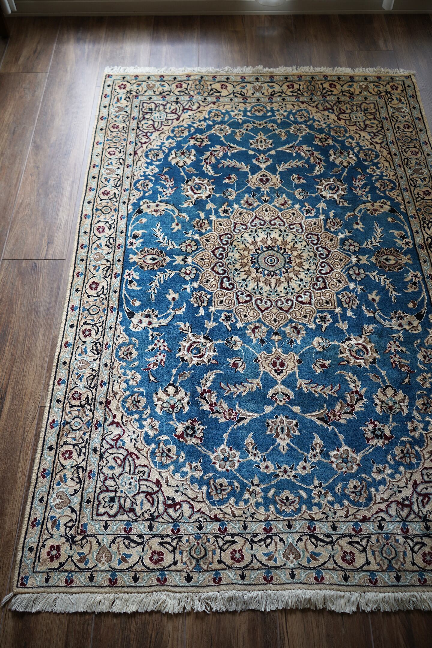 優美で落ち着いたデザインで人気のイラン中央部の都市ナイン産のラグ。ペルシャ絨毯5大産地の一つで華やかな草花モチーフのパターンが代表的です。うっとりするほど息を呑む美しさの青とアイボリーの優しいカラーをベースに、赤紫、ホワイト、濃紺などのアクセントカラーが使われた素晴らしい配色バランス。フラットに整った長さの上質感を感じるパイルで、表面はふわっと柔らかく優しい肌触りをしています。模様のふちどりの白いラインでシルクの糸が使用されています。厚みは7mmほど。状態も大変良好でパーフェクト。ベッドサイドやリビングのソファ前などお好みのスペースにどうぞ。