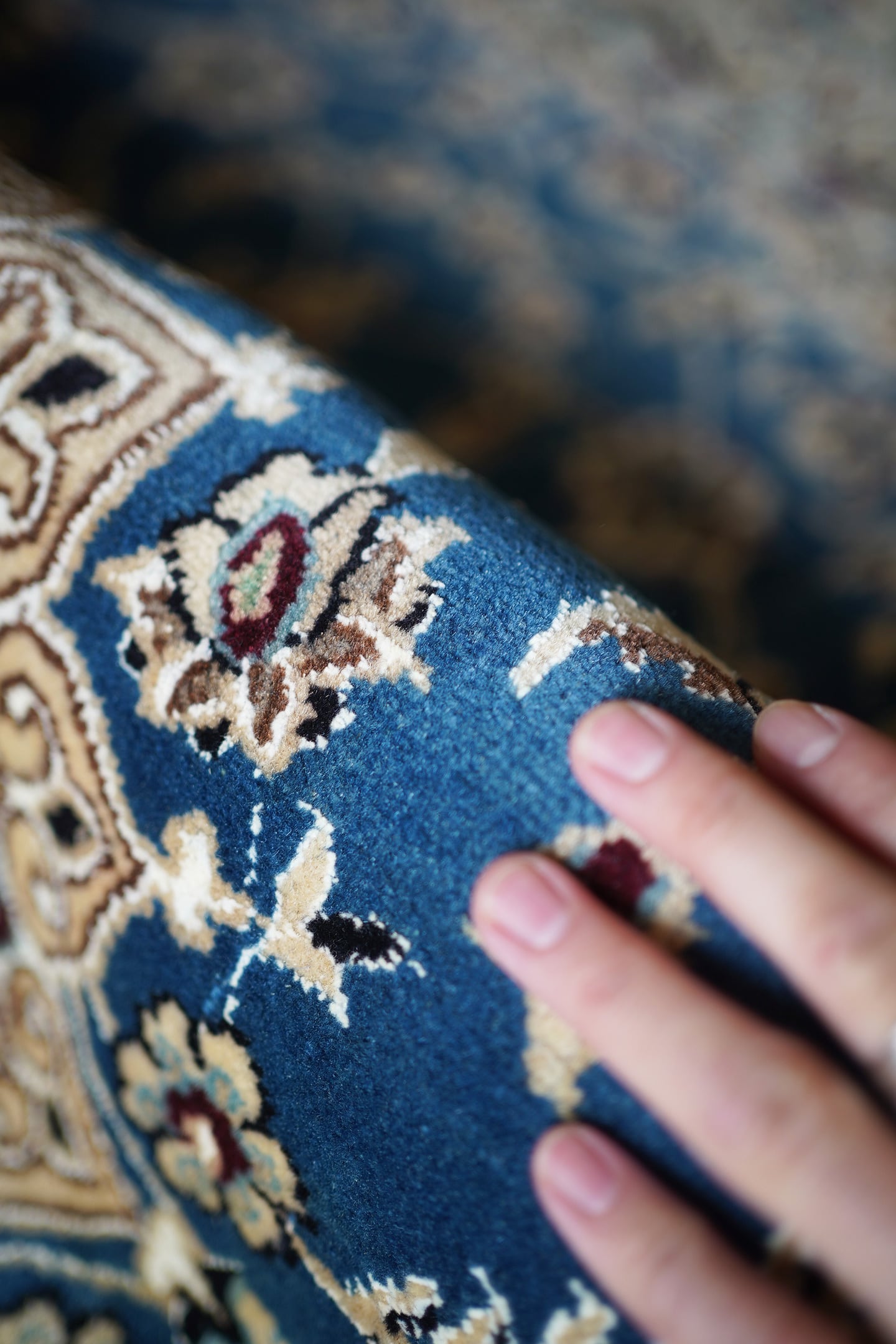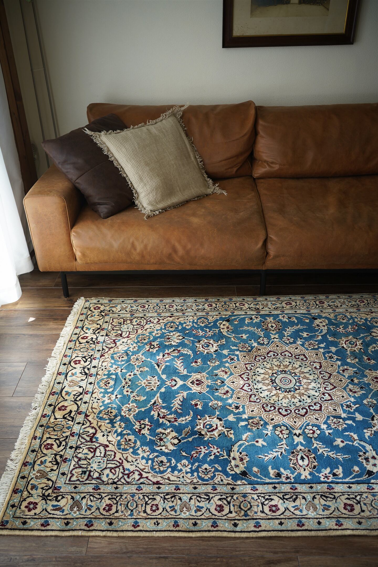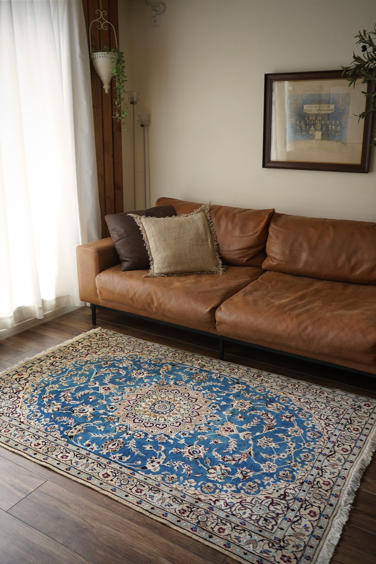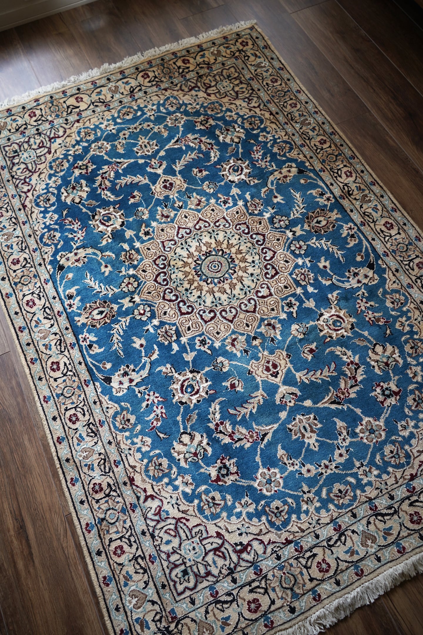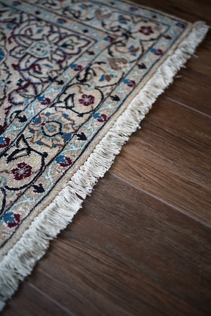 優美で落ち着いたデザインで人気のイラン中央部の都市ナイン産のラグ。ペルシャ絨毯5大産地の一つで華やかな草花モチーフのパターンが代表的です。うっとりするほど息を呑む美しさの青とアイボリーの優しいカラーをベースに、赤紫、ホワイト、濃紺などのアクセントカラーが使われた素晴らしい配色バランス。フラットに整った長さの上質感を感じるパイルで、表面はふわっと柔らかく優しい肌触りをしています。模様のふちどりの白いラインでシルクの糸が使用されています。厚みは7mmほど。状態も大変良好でパーフェクト。ベッドサイドやリビングのソファ前などお好みのスペースにどうぞ。