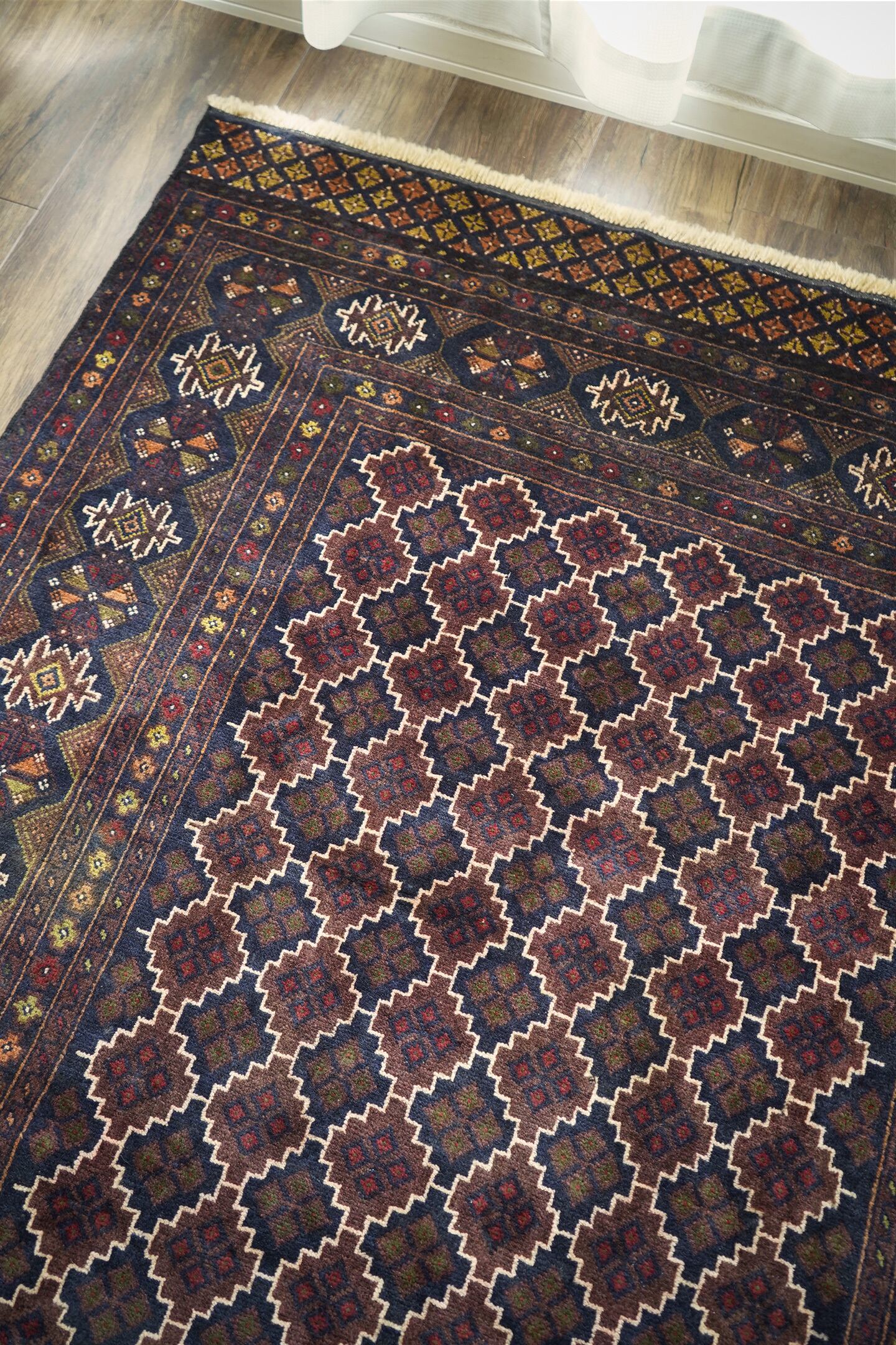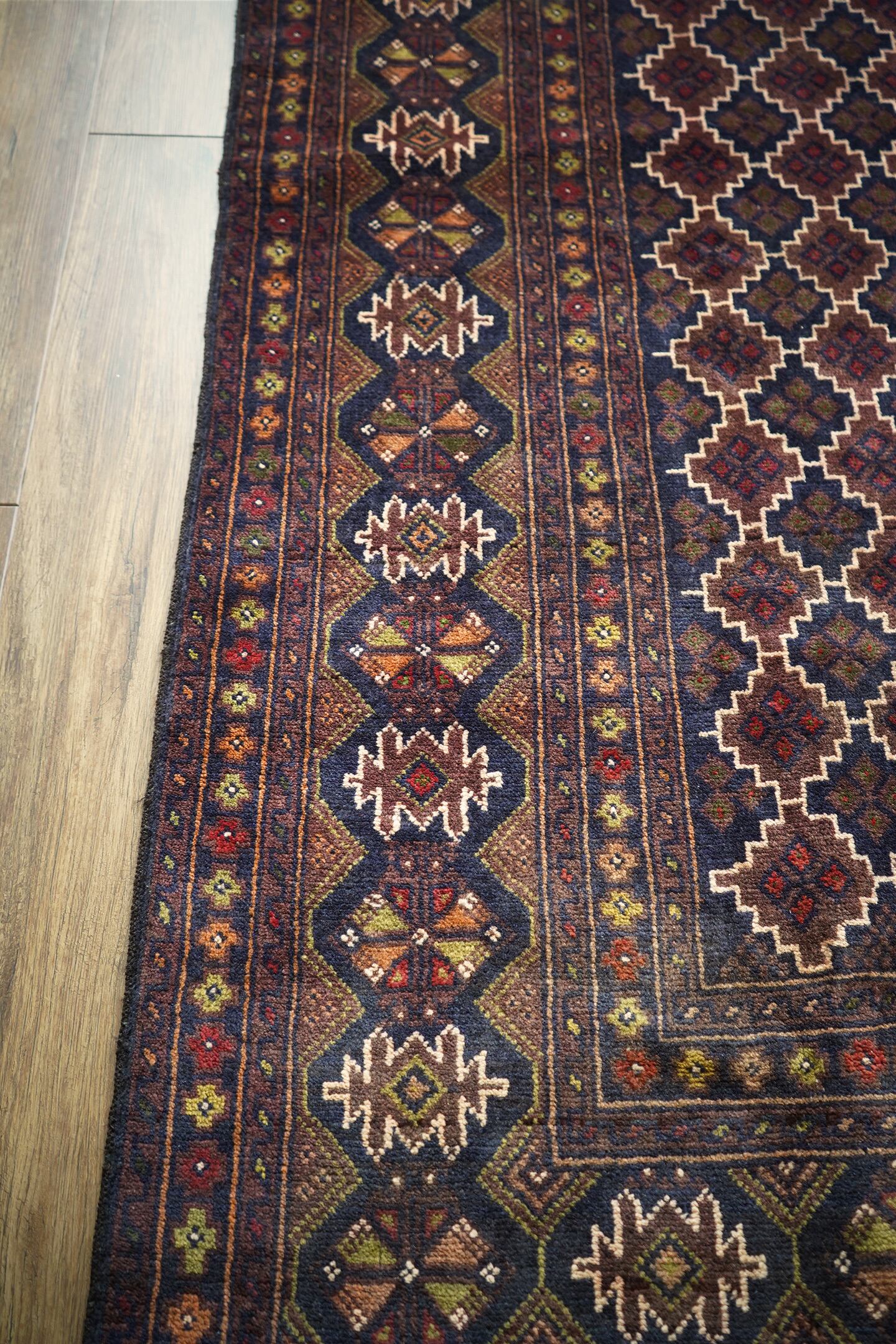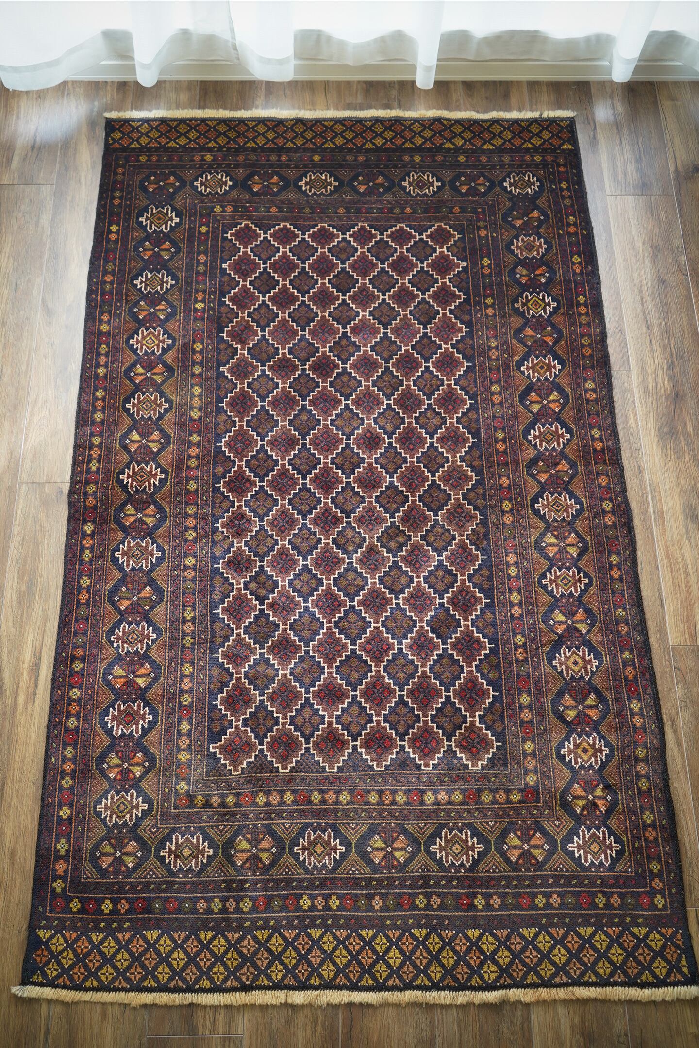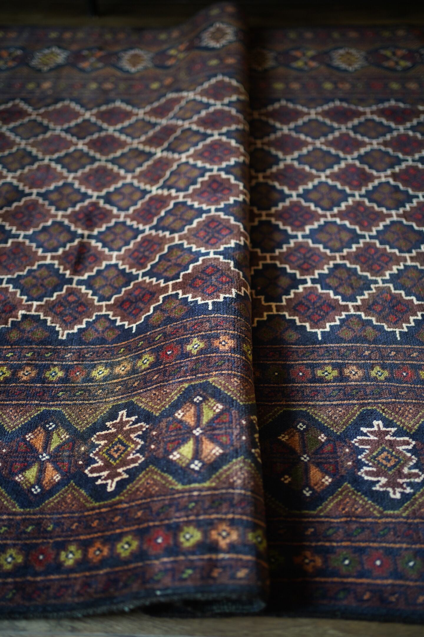 約50年ほど前に織られたアフガニスタン産のバルーチラグ。バルーチ族らしい暗めでシックな奥深い色味の一枚で、焦茶、ブラック、赤茶などの統一感を持たせつつも、オリーブやキャメルなどのちょっとしたアクセントカラーでセンスを感じさせるお洒落な配色バランス。表面のパイルは薄ら艶も見受けられ美しく、フラットに整った長さのパイルかつソフトウールなので上質感があります。肌触りはふわっと柔らかく、滑らかでとても気持ち良いです。厚みは6mm程度。ダメージや補修された跡もなく、パーフェクトなコンディション。お部屋に取り入れやすい色味のラグですのでトライバルラグが初めての方にもオススメです。リビングのソファ前やダイニングテーブル下、ベッドサイドなど、どこに敷かれても間違いない一枚♫