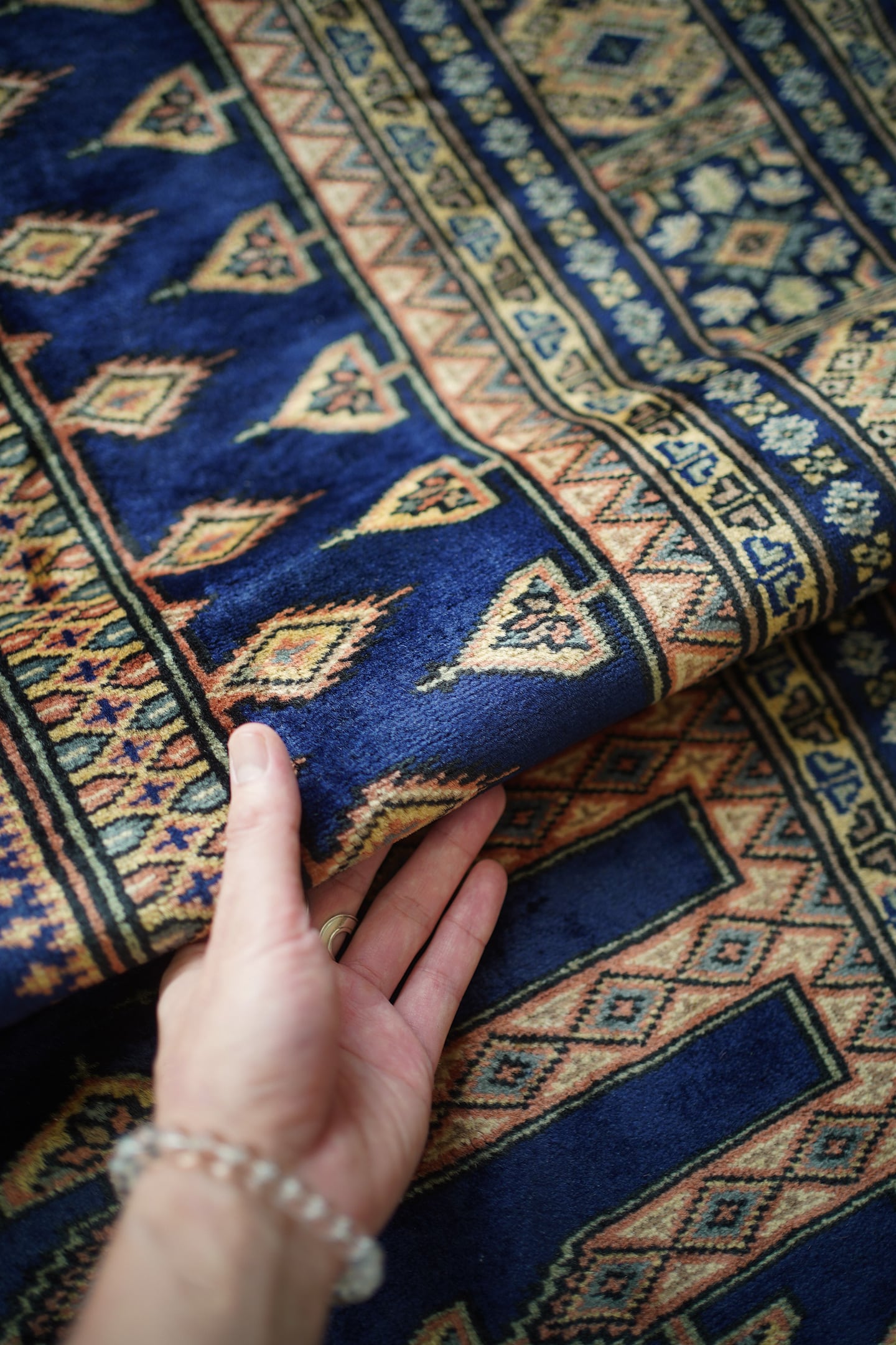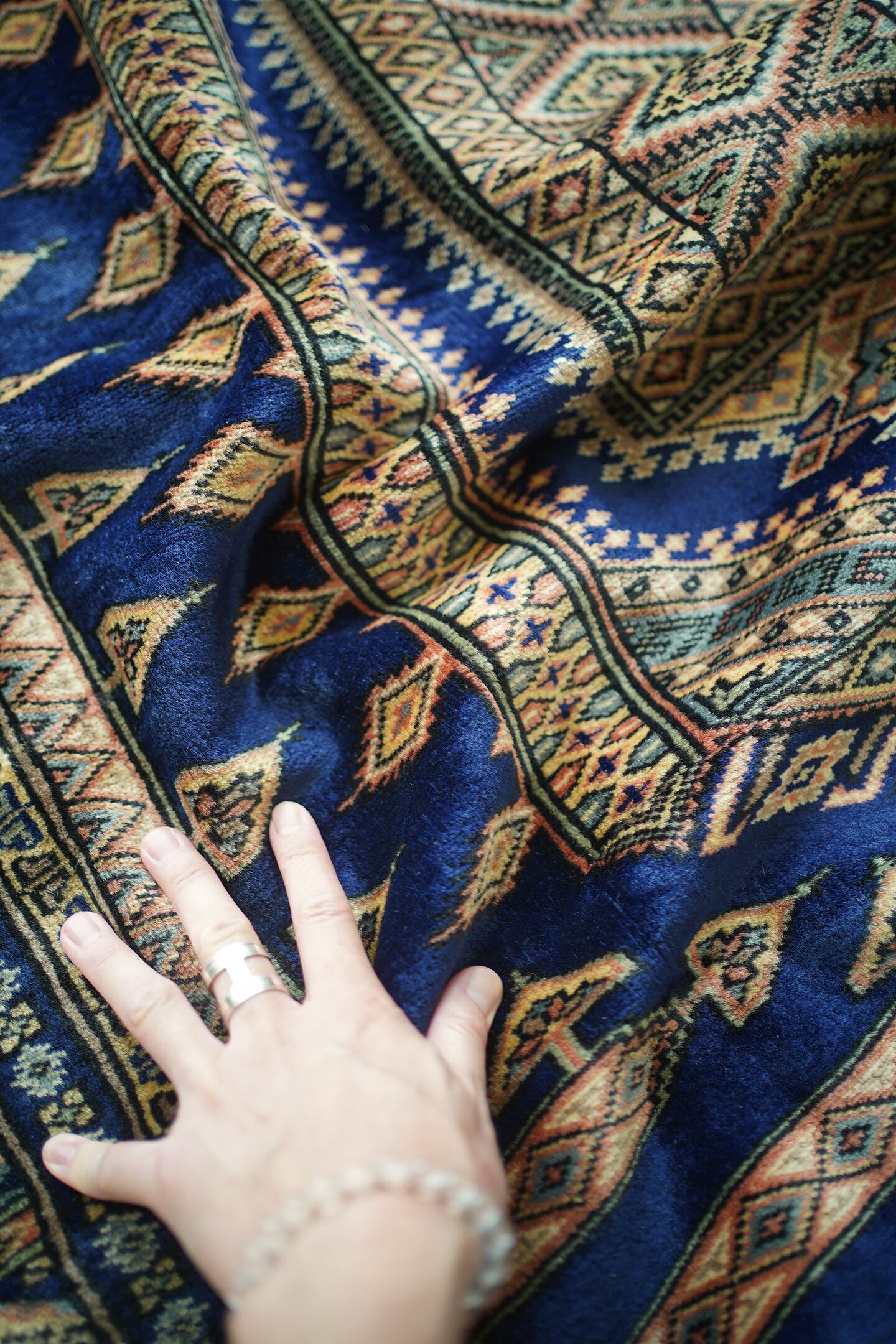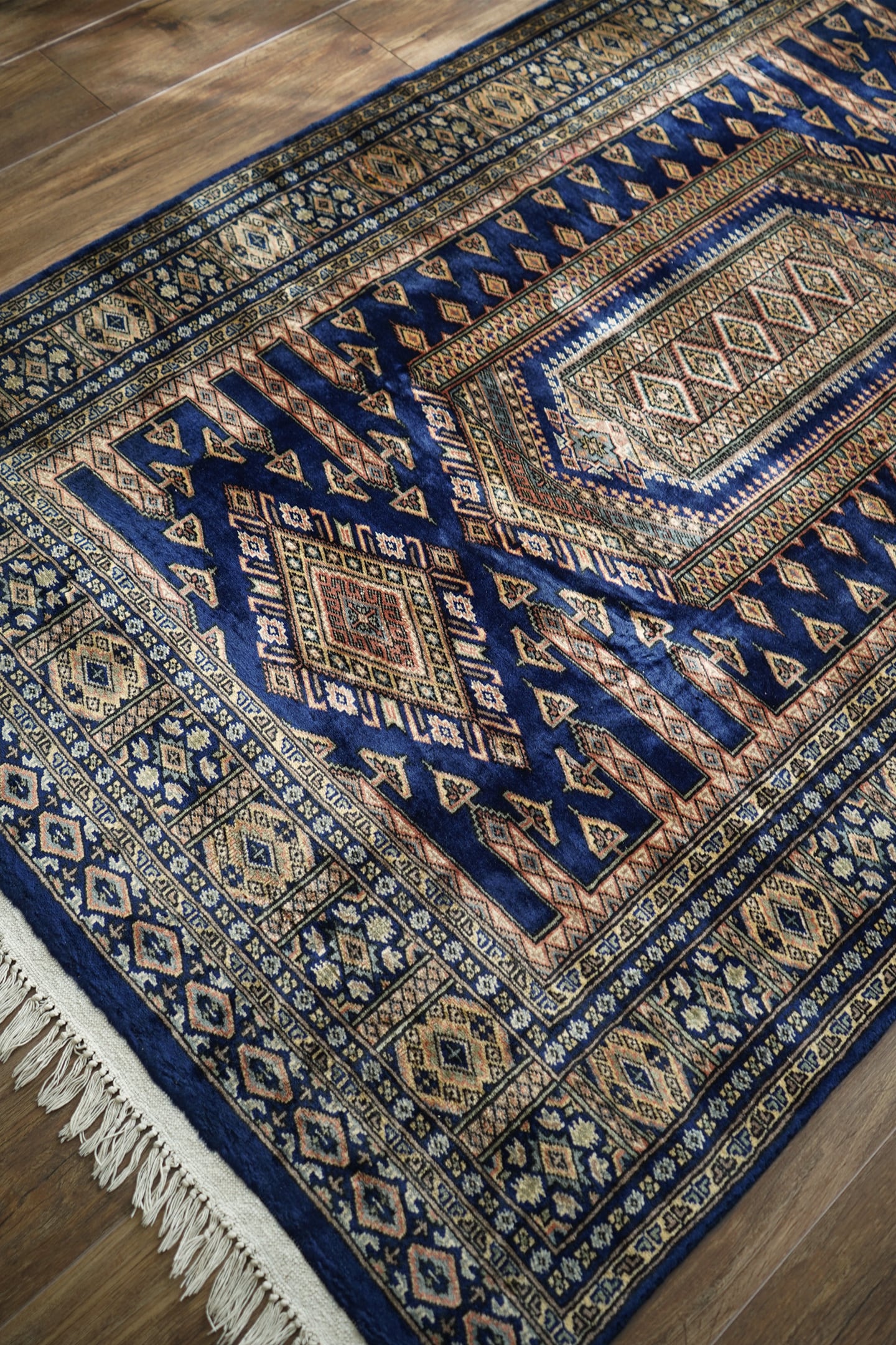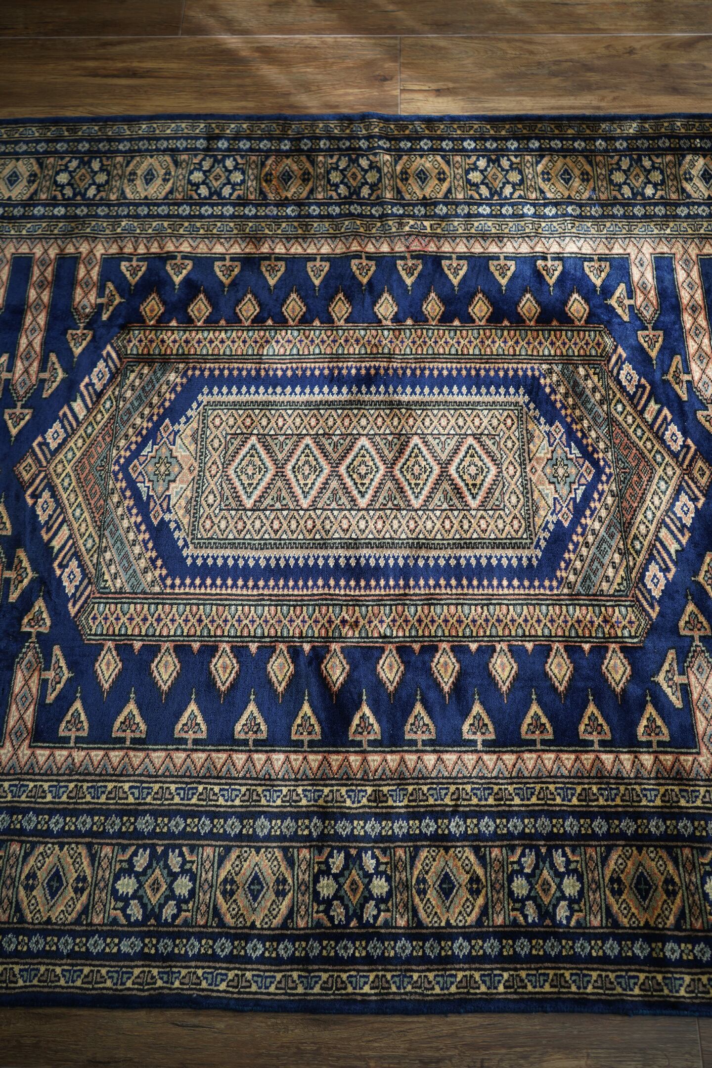 約30年ほど前に織られたヴィンテージのパキスタン産ラグ。神々しいほどに煌めく艶を放ち、目に入る度にその美しさにうっとりしてしまうほどの魅力を感じます。菱形紋様をメインにしたデザインで、ブルー、ベージュ、橙、グレージュなどの素晴らしい配色の組み合わせで、一枚お部屋に敷くだけで雰囲気をガラッと変えてくれる存在感があります。パイルは短めながらソフトウールで柔らか、しっとり滑らかな気持ちの良い肌触りです。厚みは5mmほど。一部パイルが薄くなっている箇所(お写真最後)もありますが、全体的にパイルも綺麗に残っており、大変良好なコンディション。リビングのソファ前、ベッドサイドなど日常で目に入る場所にぜひ敷いていただきたい一枚です。間違いなくあなたの宝物になってくれると思います。