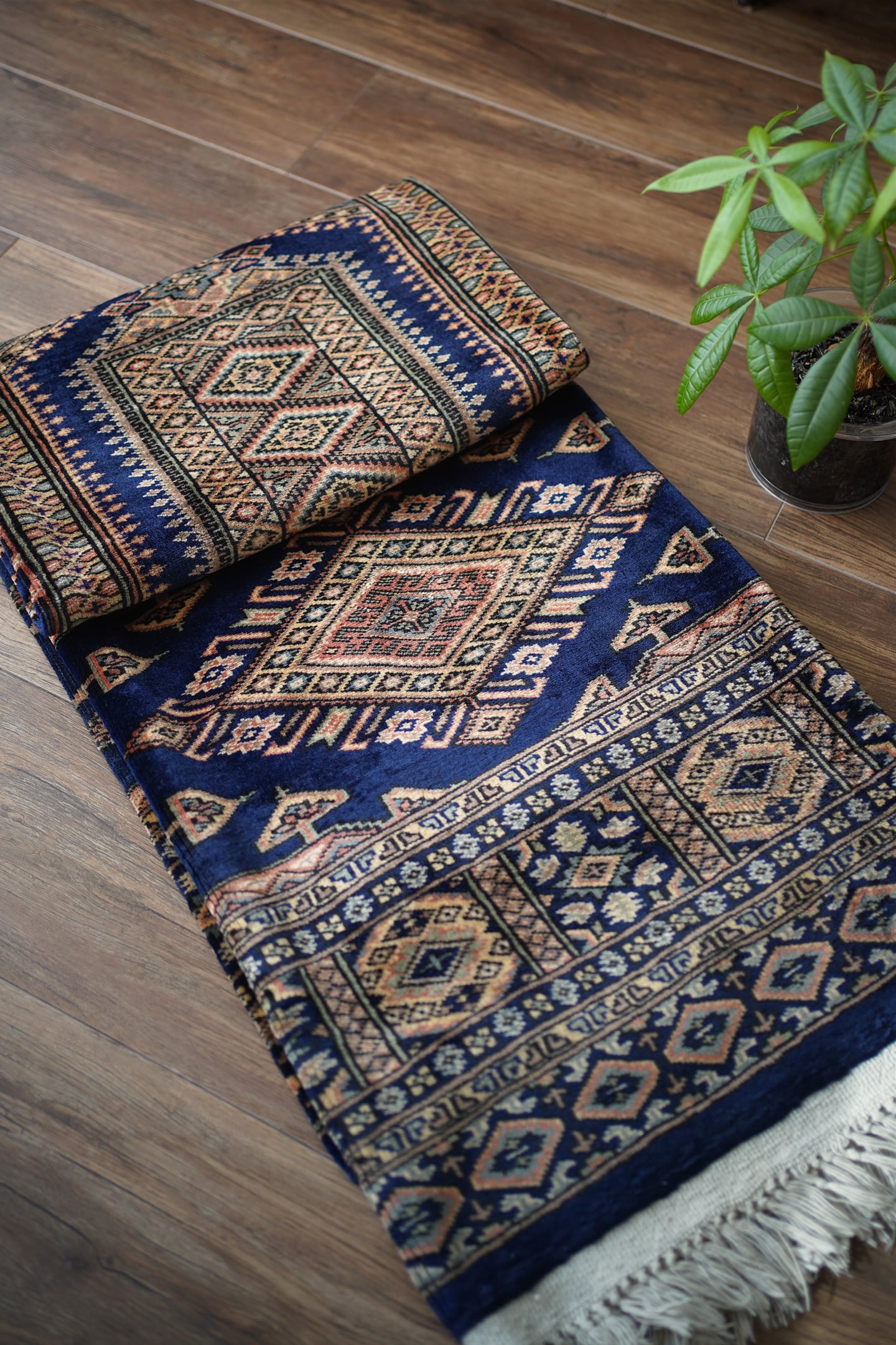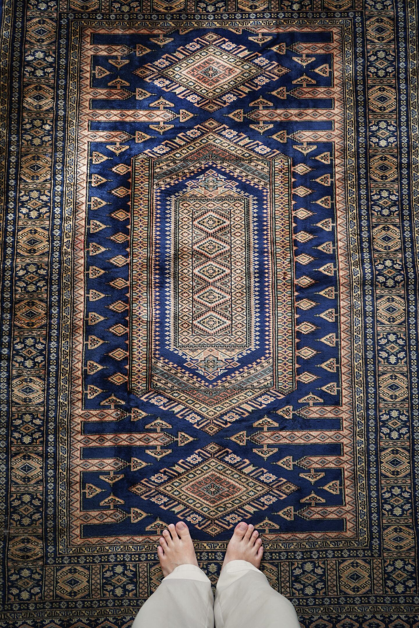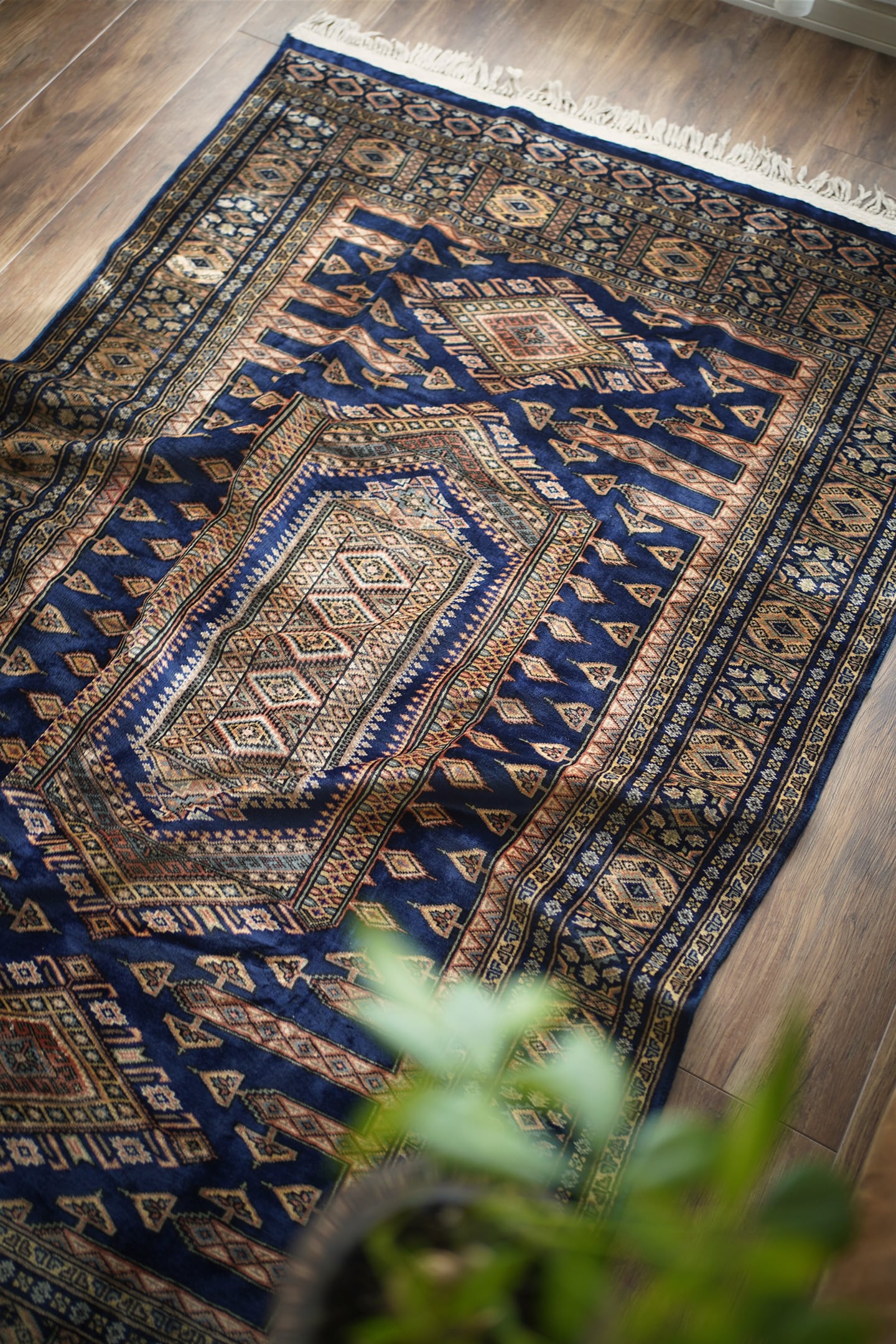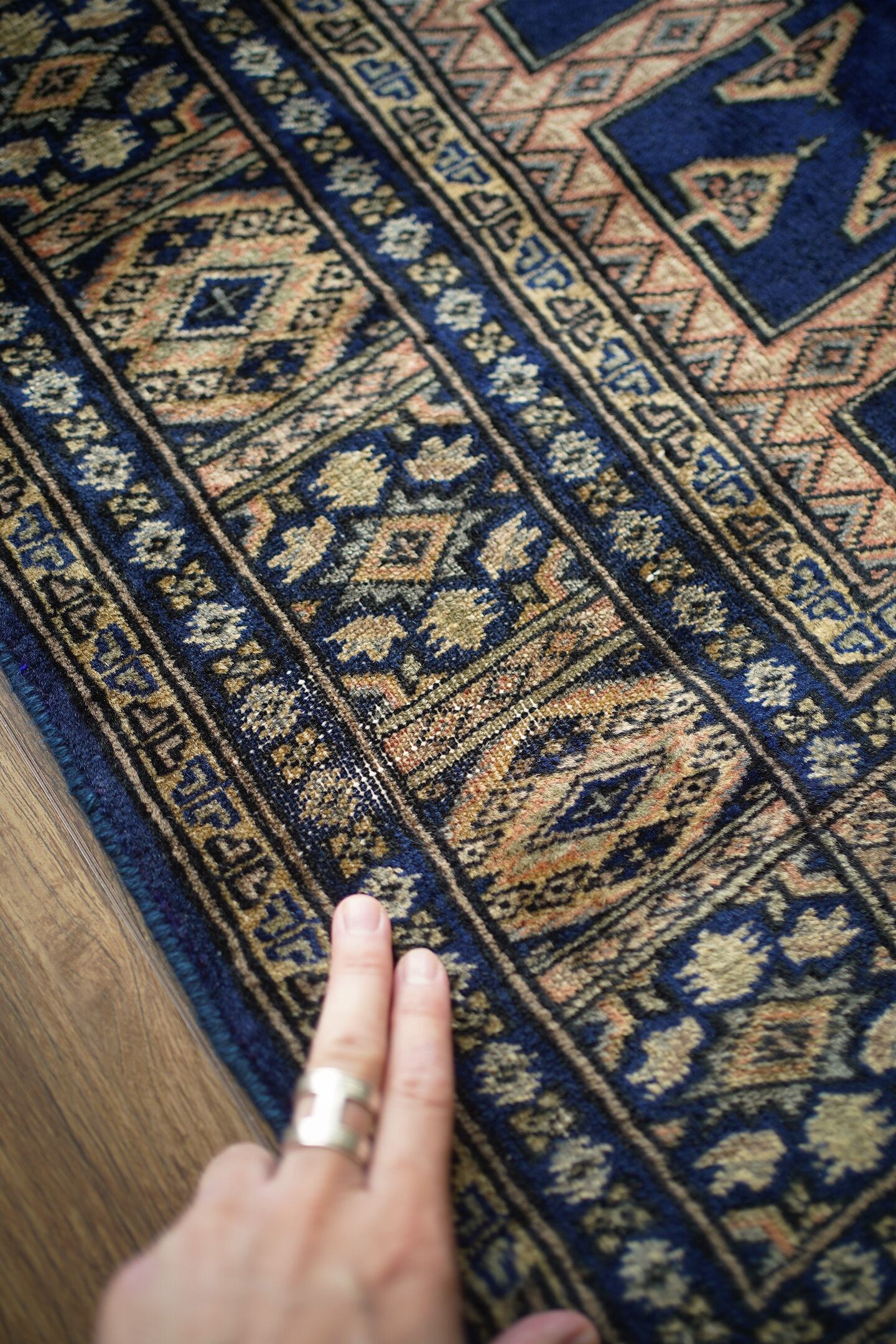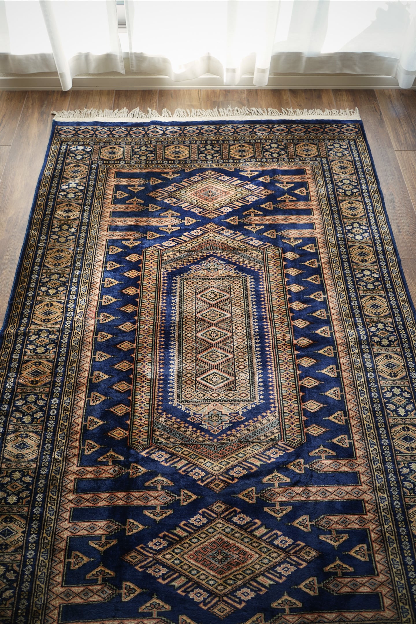 約30年ほど前に織られたヴィンテージのパキスタン産ラグ。神々しいほどに煌めく艶を放ち、目に入る度にその美しさにうっとりしてしまうほどの魅力を感じます。菱形紋様をメインにしたデザインで、ブルー、ベージュ、橙、グレージュなどの素晴らしい配色の組み合わせで、一枚お部屋に敷くだけで雰囲気をガラッと変えてくれる存在感があります。パイルは短めながらソフトウールで柔らか、しっとり滑らかな気持ちの良い肌触りです。厚みは5mmほど。一部パイルが薄くなっている箇所(お写真最後)もありますが、全体的にパイルも綺麗に残っており、大変良好なコンディション。リビングのソファ前、ベッドサイドなど日常で目に入る場所にぜひ敷いていただきたい一枚です。間違いなくあなたの宝物になってくれると思います。