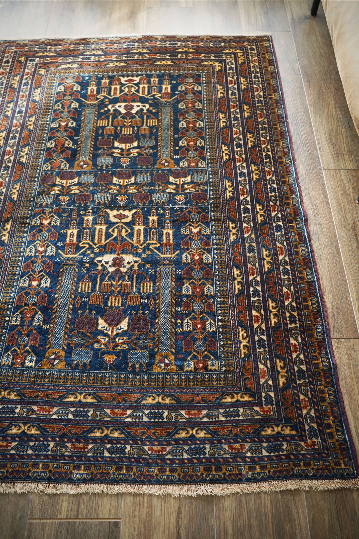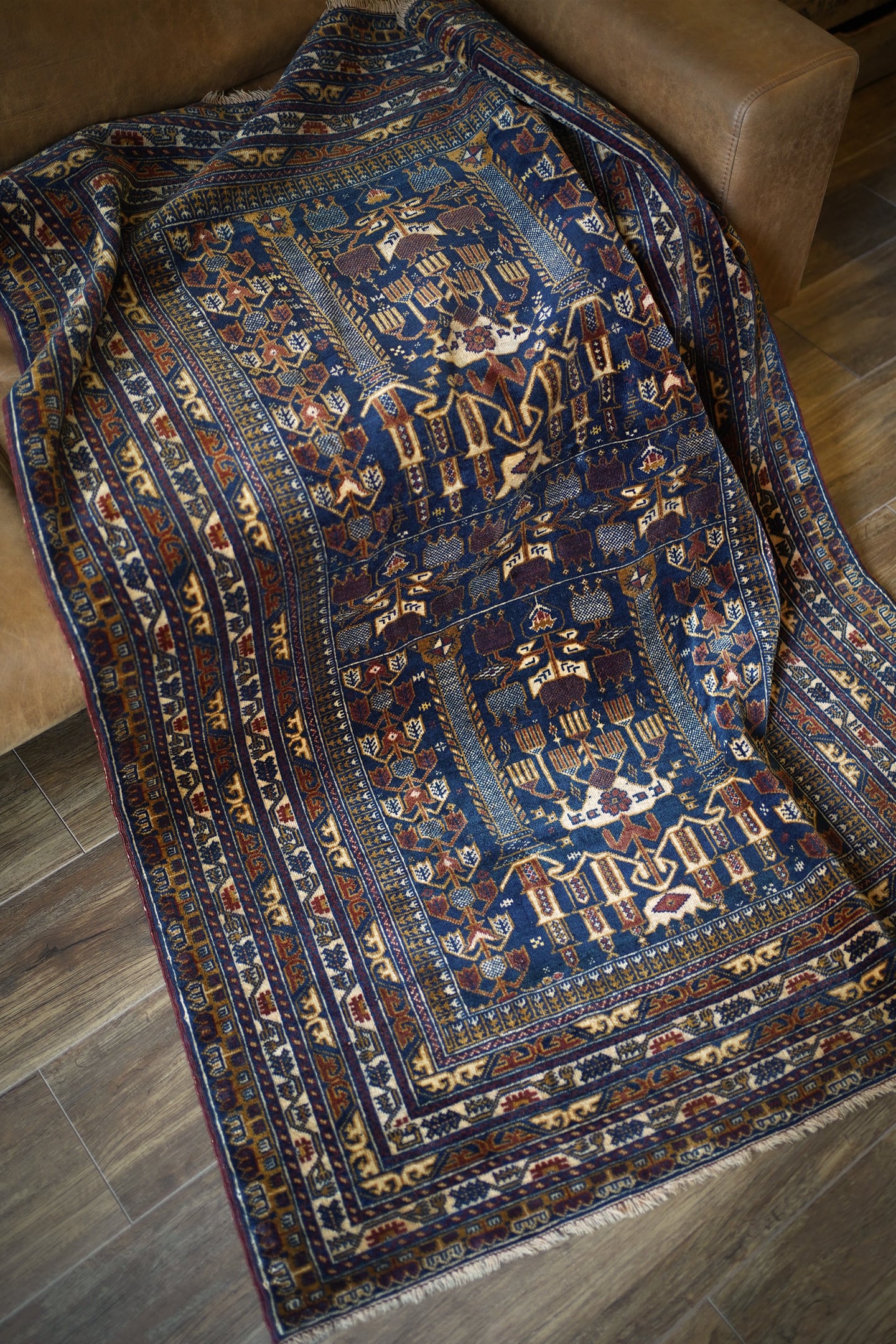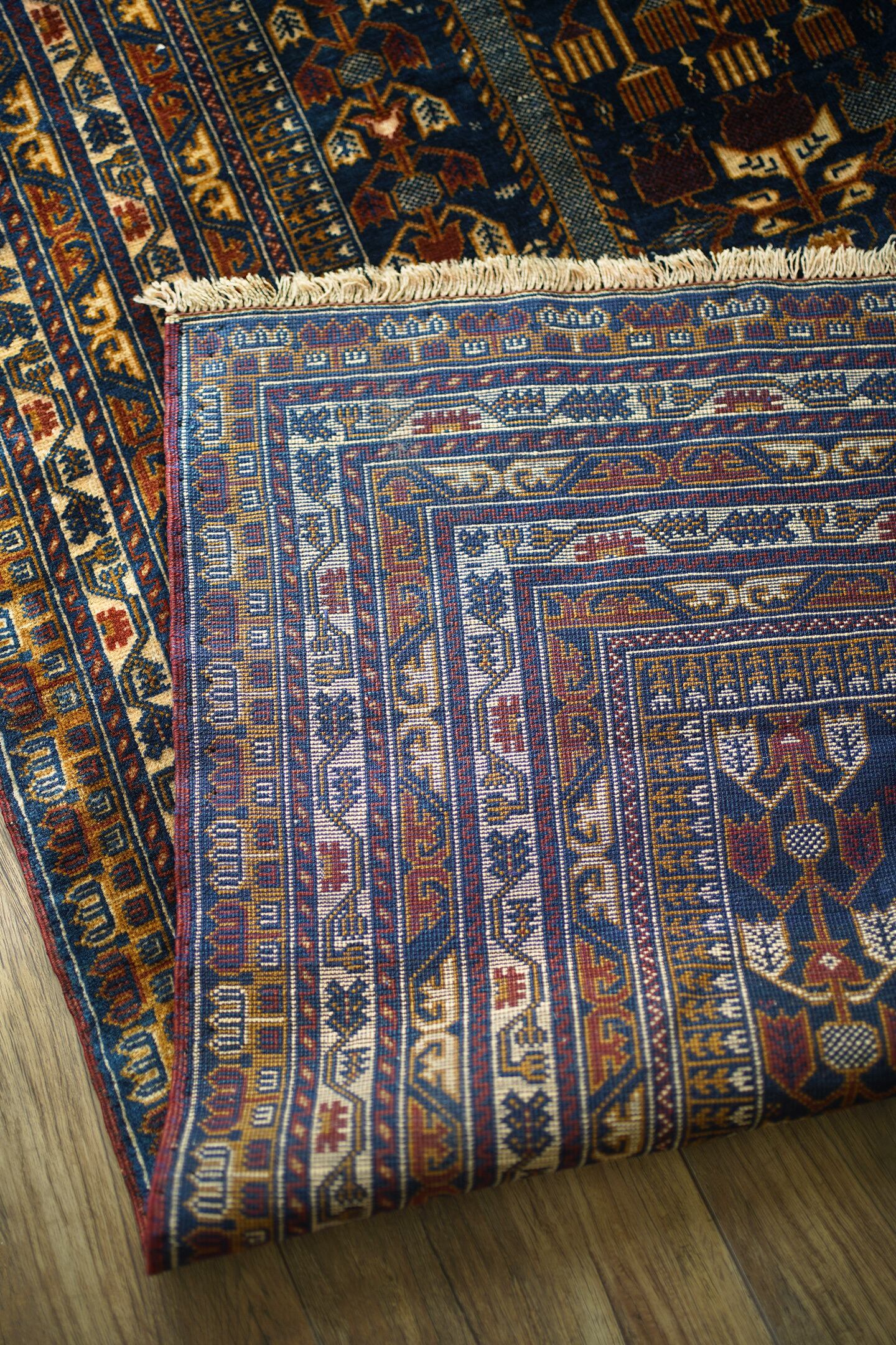 約50年ほど前にトルクメン族によって織られたアリホジャラグ。チューリップのような形の可愛いフォルムの花モチーフに、アリホジャ特有の細かい織りで表現された繊細な紋様デザインと配色バランスが素晴らしい一枚。ネイビー、ブラウン、焦茶、ベージュが使われたシックな印象の色合いで、光がパイルに差し込むと光沢感のある美しい艶が見受けられます。今までたくさんのアリホジャラグを見てきましたが、これまで見てきたアリホジャの中でも最高峰な印象を受けます。パイルは短めで、ふわサラッとした優しい肌触り。厚みは4mm程度です。ダメージや補修跡もなく、パーフェクトなコンディション。玄関やリビング、書斎などにぜひこの美しさを取り入れてみてください。