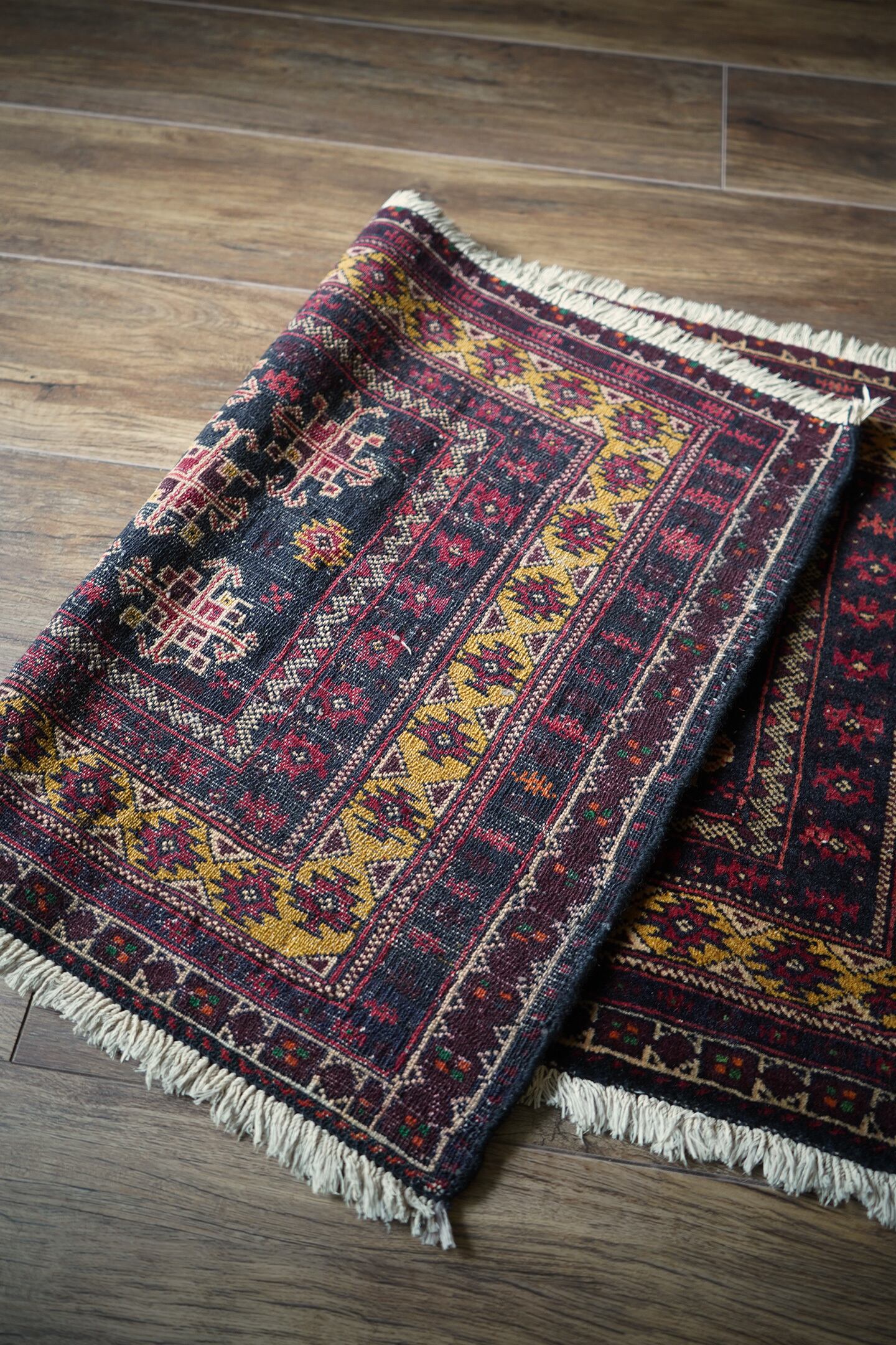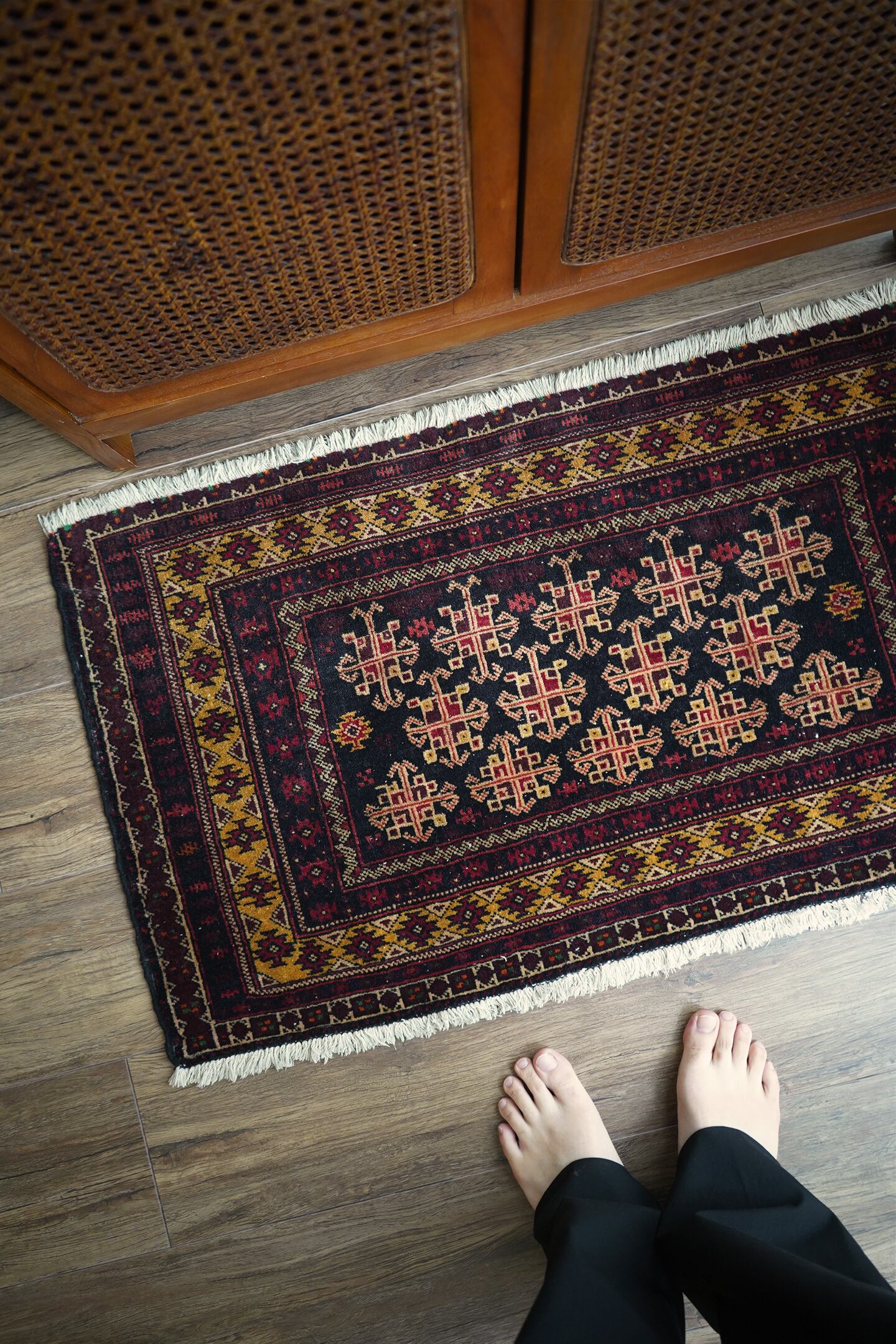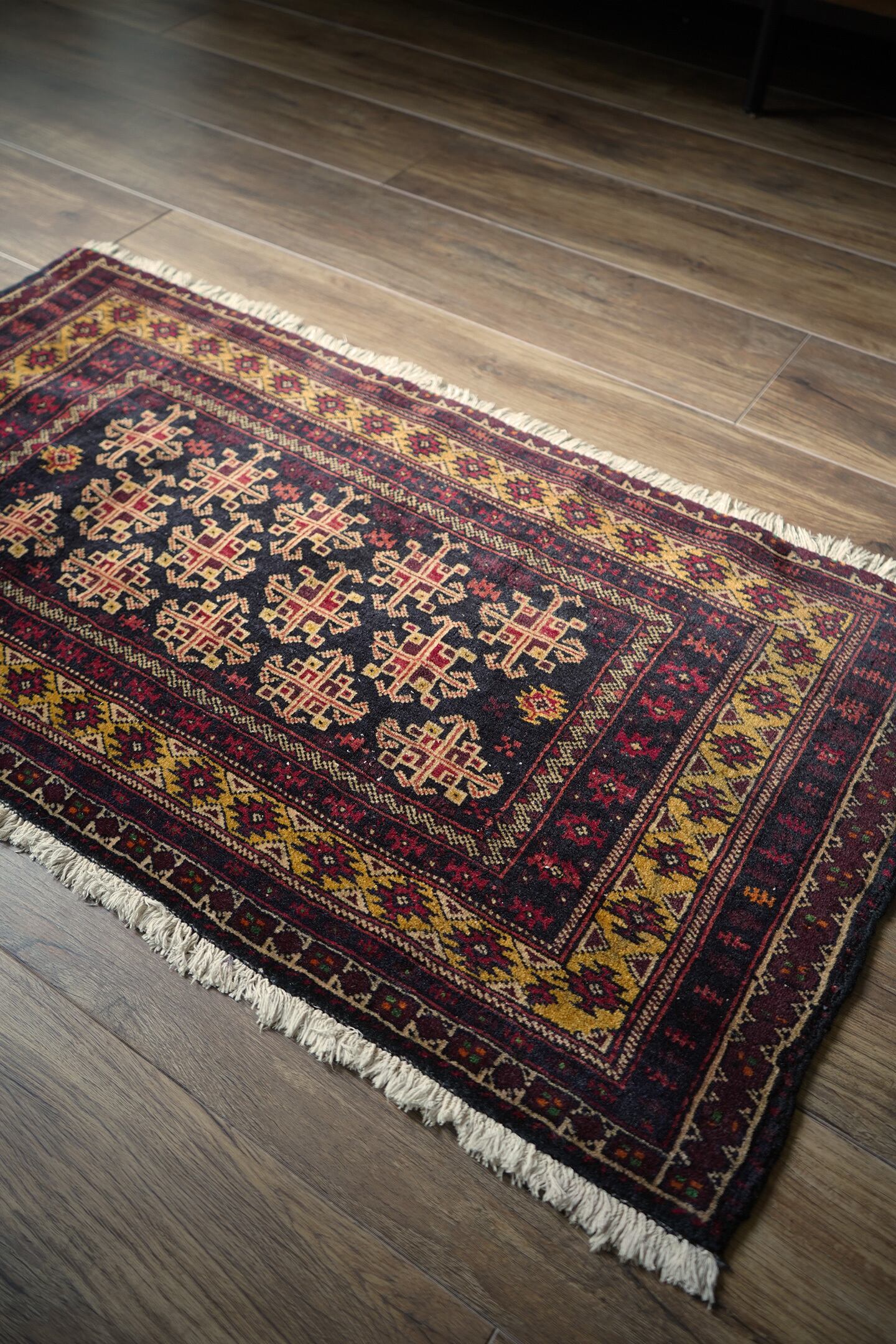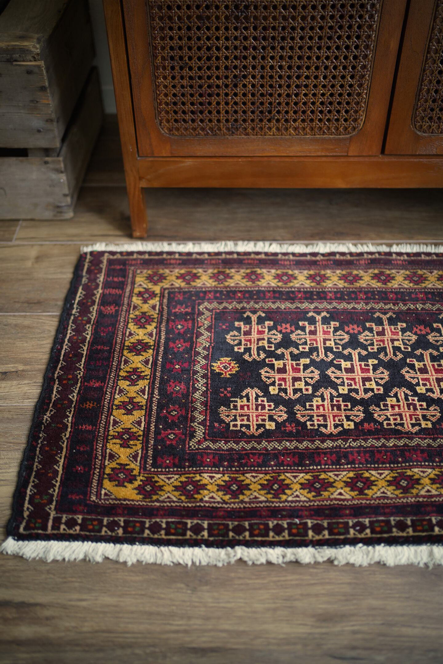 約50年前に織られたアフガニスタン産のバルーチラグ。黒、ダークレッド、黄土色、焦茶などのバランスの取れた配色でお洒落な雰囲気の一枚です。木製家具との相性も良さそうです。パイルは短めながらソフトウールで、表面はサラふわっとした滑らかな肌触り。厚みは6mm程度です。目立ったダメージもなく、良好なコンディション。玄関をはじめ、洗面スペース、全身鏡やラックの前に敷いたりと色んな場所でご使用いただけます。