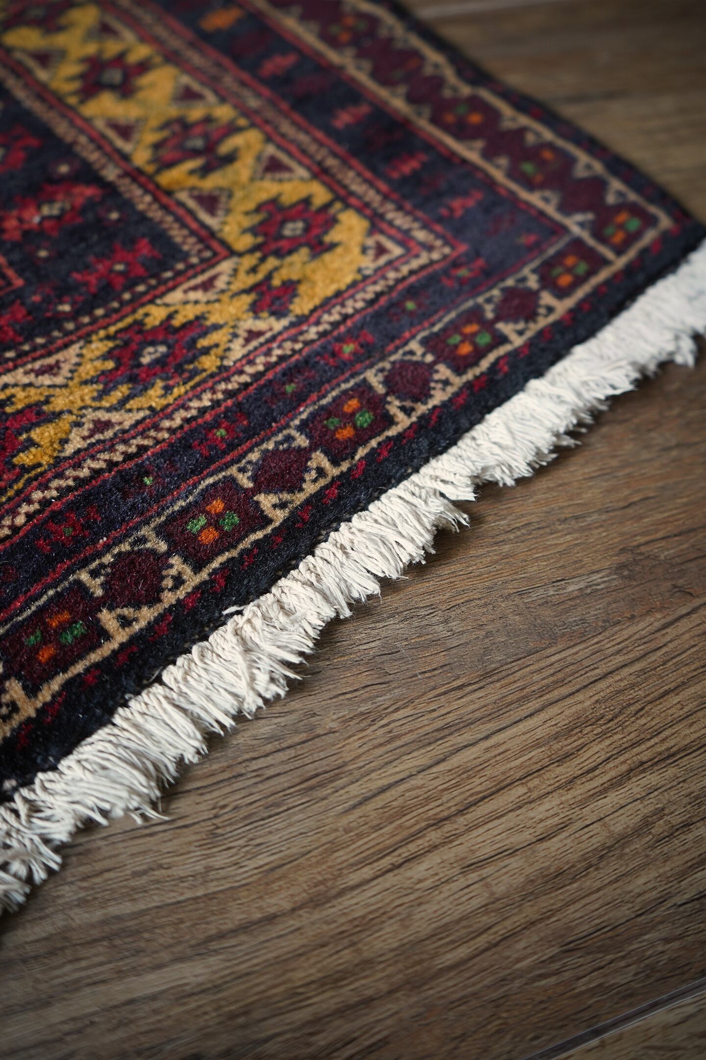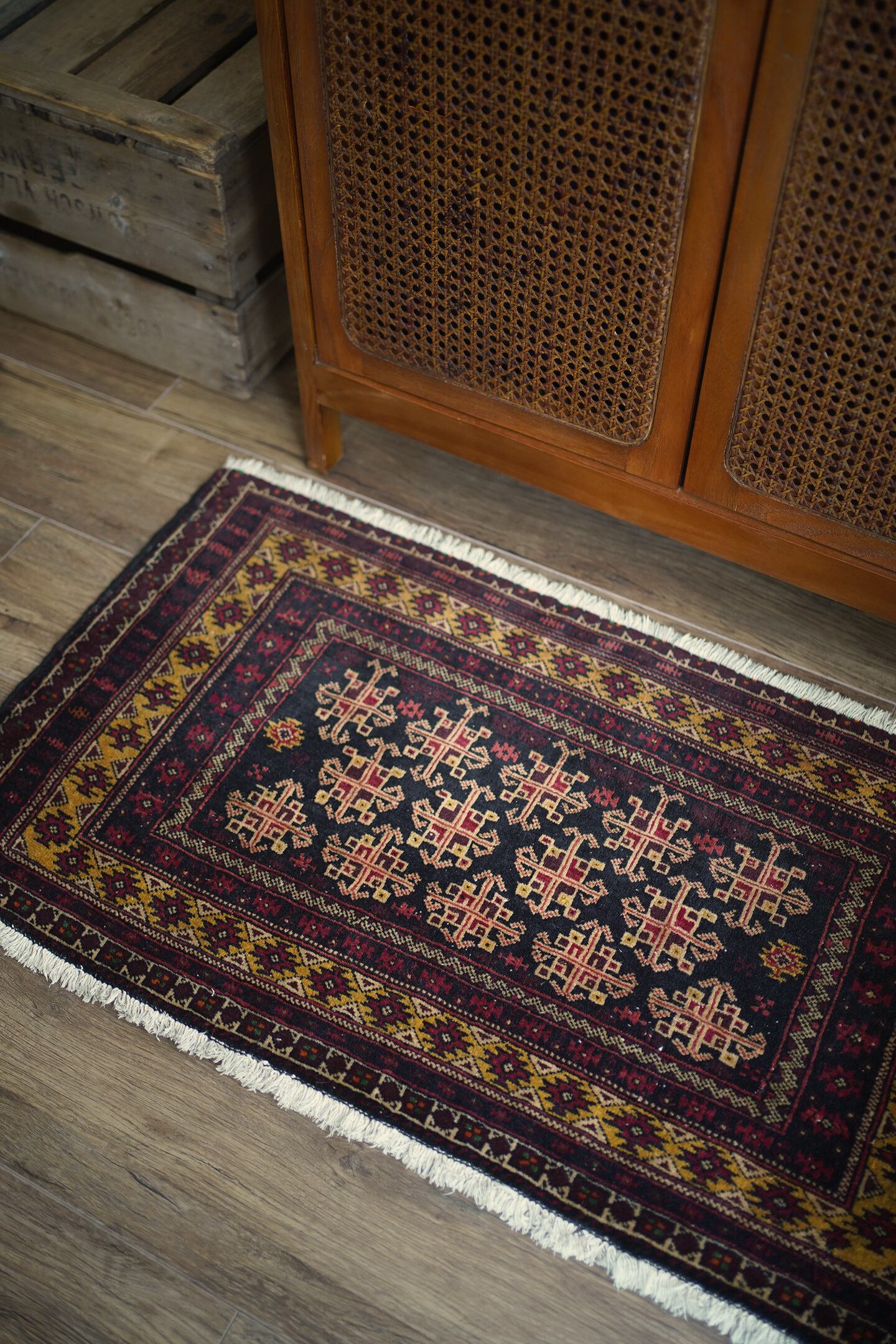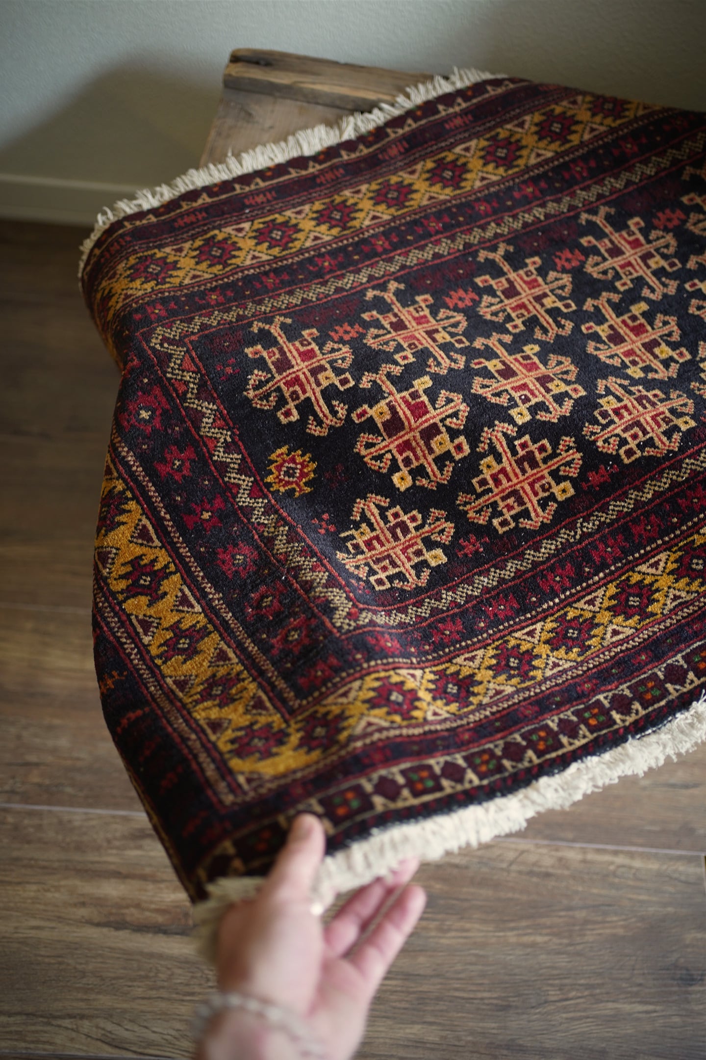 約50年前に織られたアフガニスタン産のバルーチラグ。黒、ダークレッド、黄土色、焦茶などのバランスの取れた配色でお洒落な雰囲気の一枚です。木製家具との相性も良さそうです。パイルは短めながらソフトウールで、表面はサラふわっとした滑らかな肌触り。厚みは6mm程度です。目立ったダメージもなく、良好なコンディション。玄関をはじめ、洗面スペース、全身鏡やラックの前に敷いたりと色んな場所でご使用いただけます。