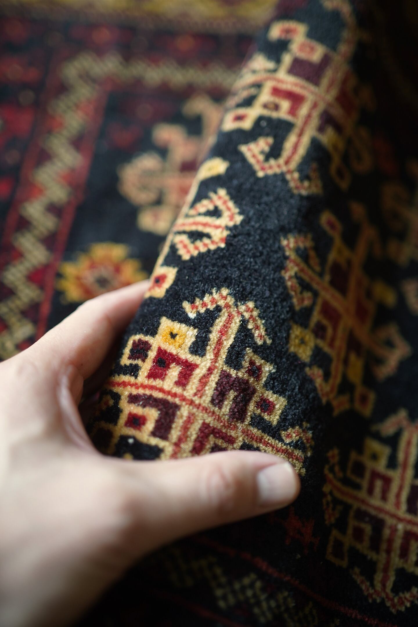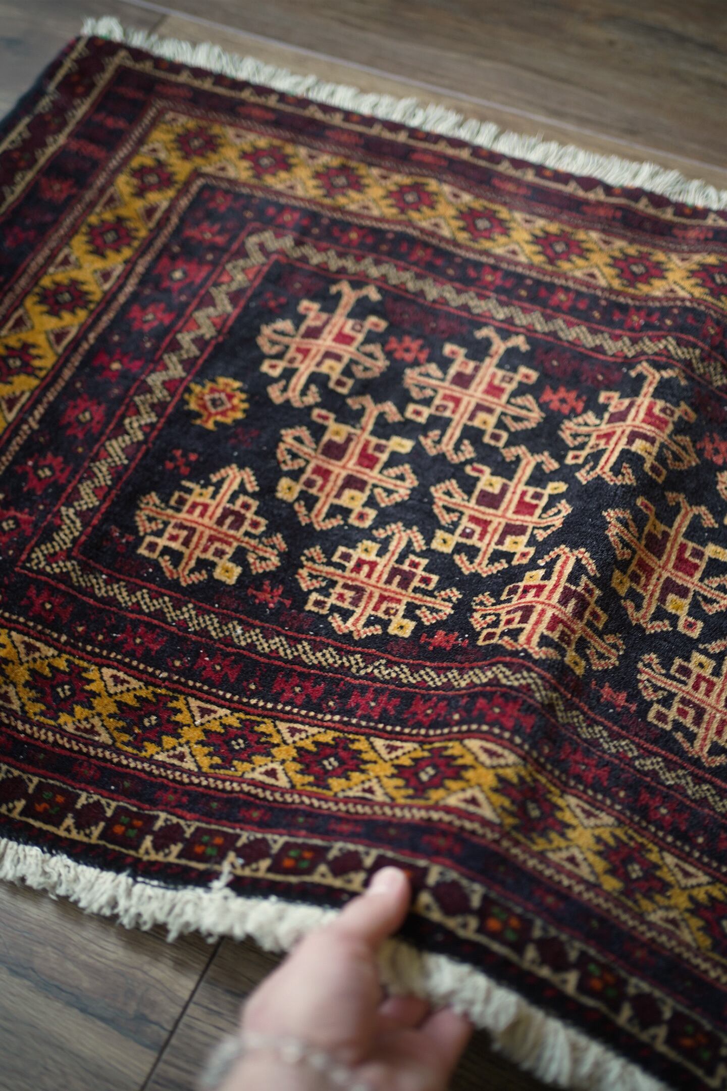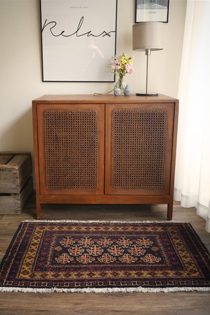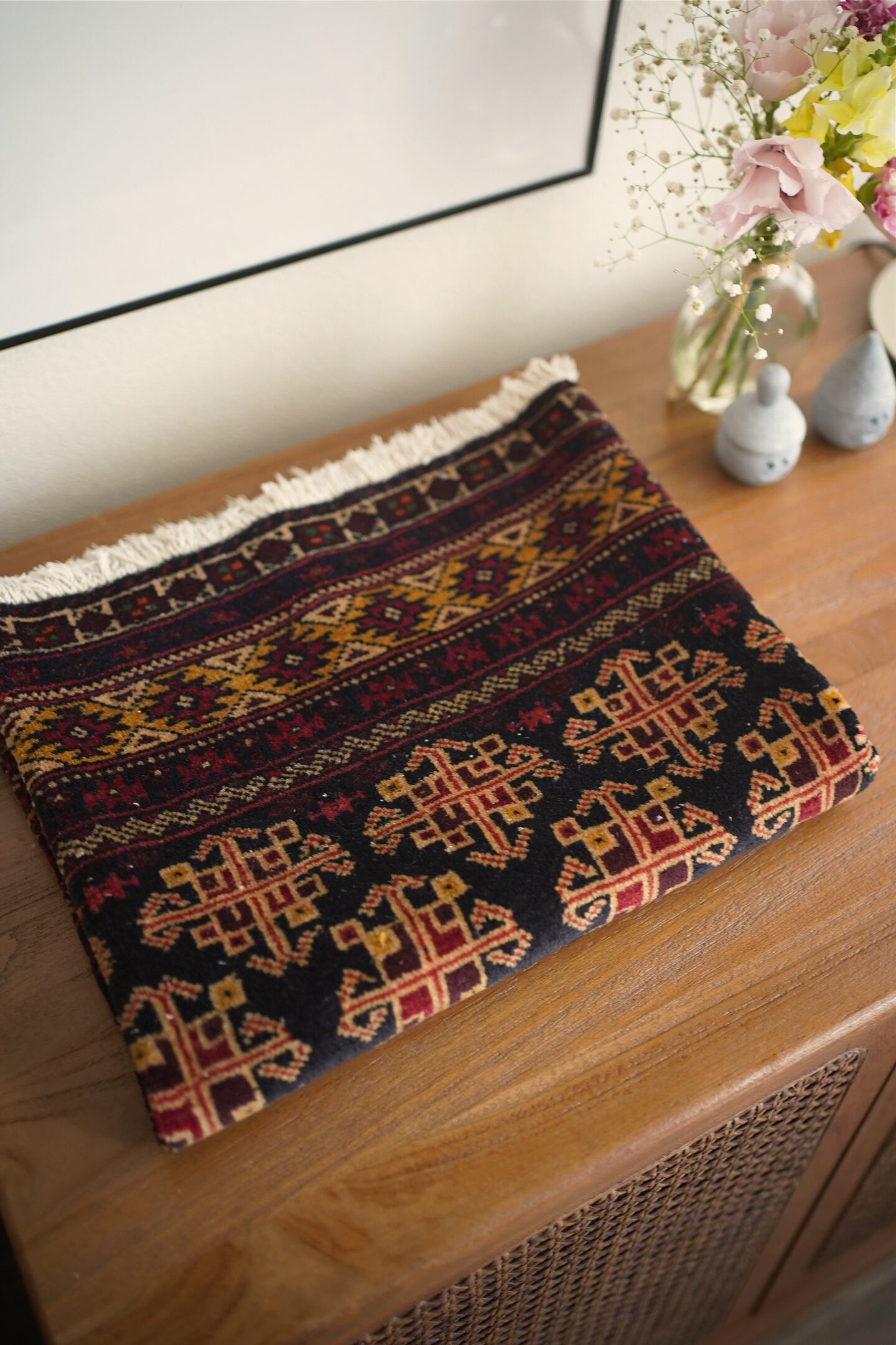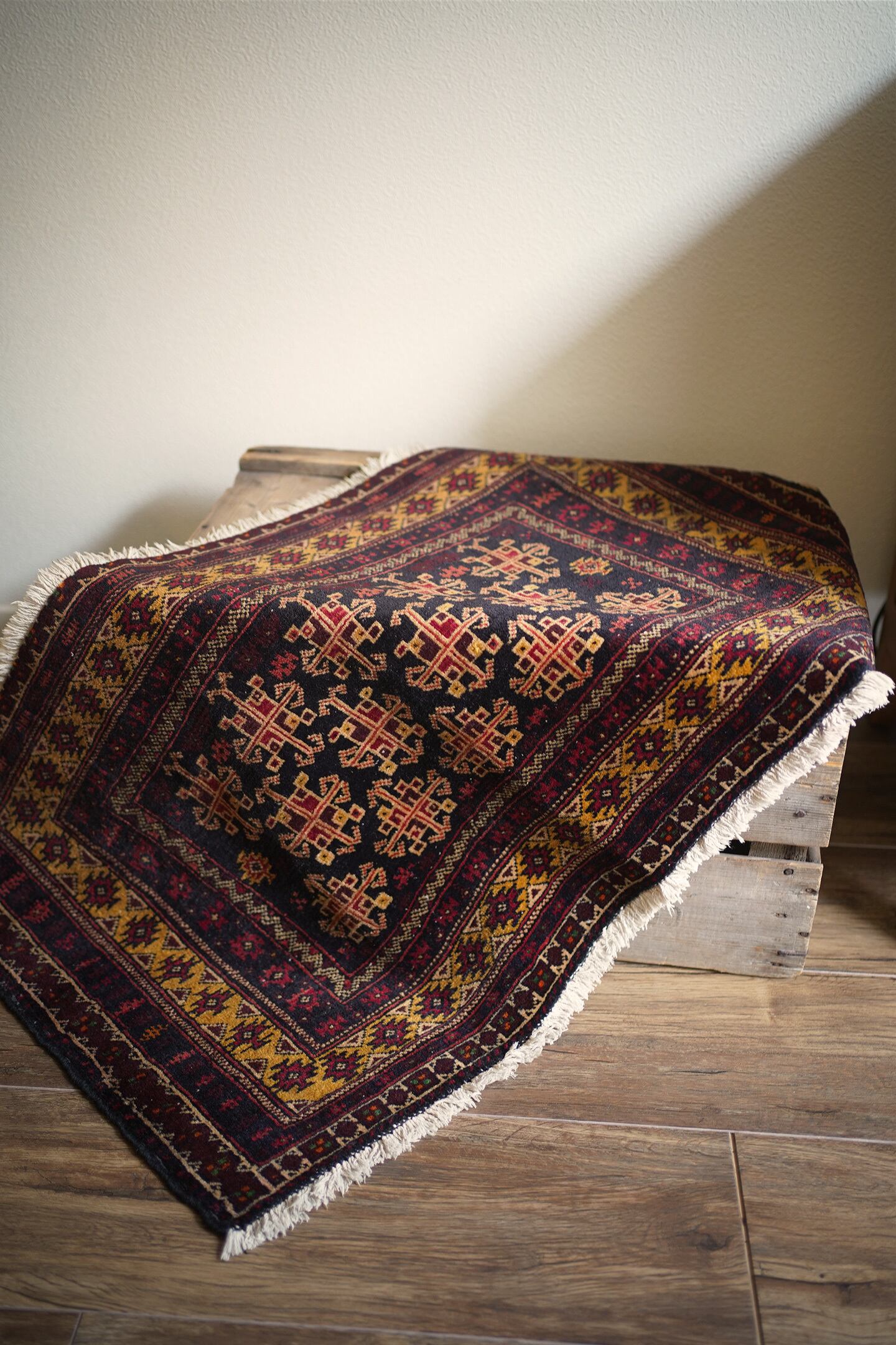 約50年前に織られたアフガニスタン産のバルーチラグ。黒、ダークレッド、黄土色、焦茶などのバランスの取れた配色でお洒落な雰囲気の一枚です。木製家具との相性も良さそうです。パイルは短めながらソフトウールで、表面はサラふわっとした滑らかな肌触り。厚みは6mm程度です。目立ったダメージもなく、良好なコンディション。玄関をはじめ、洗面スペース、全身鏡やラックの前に敷いたりと色んな場所でご使用いただけます。