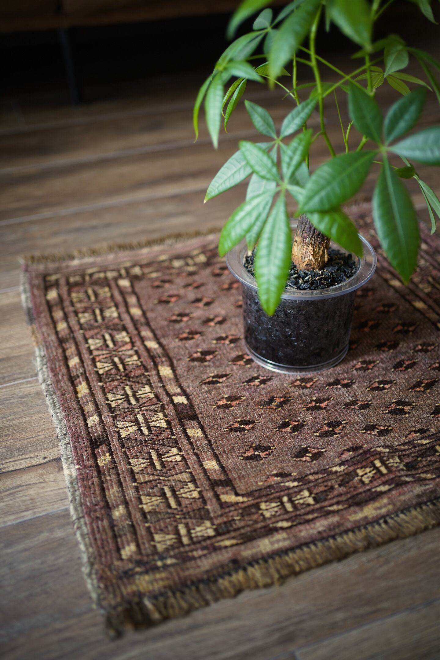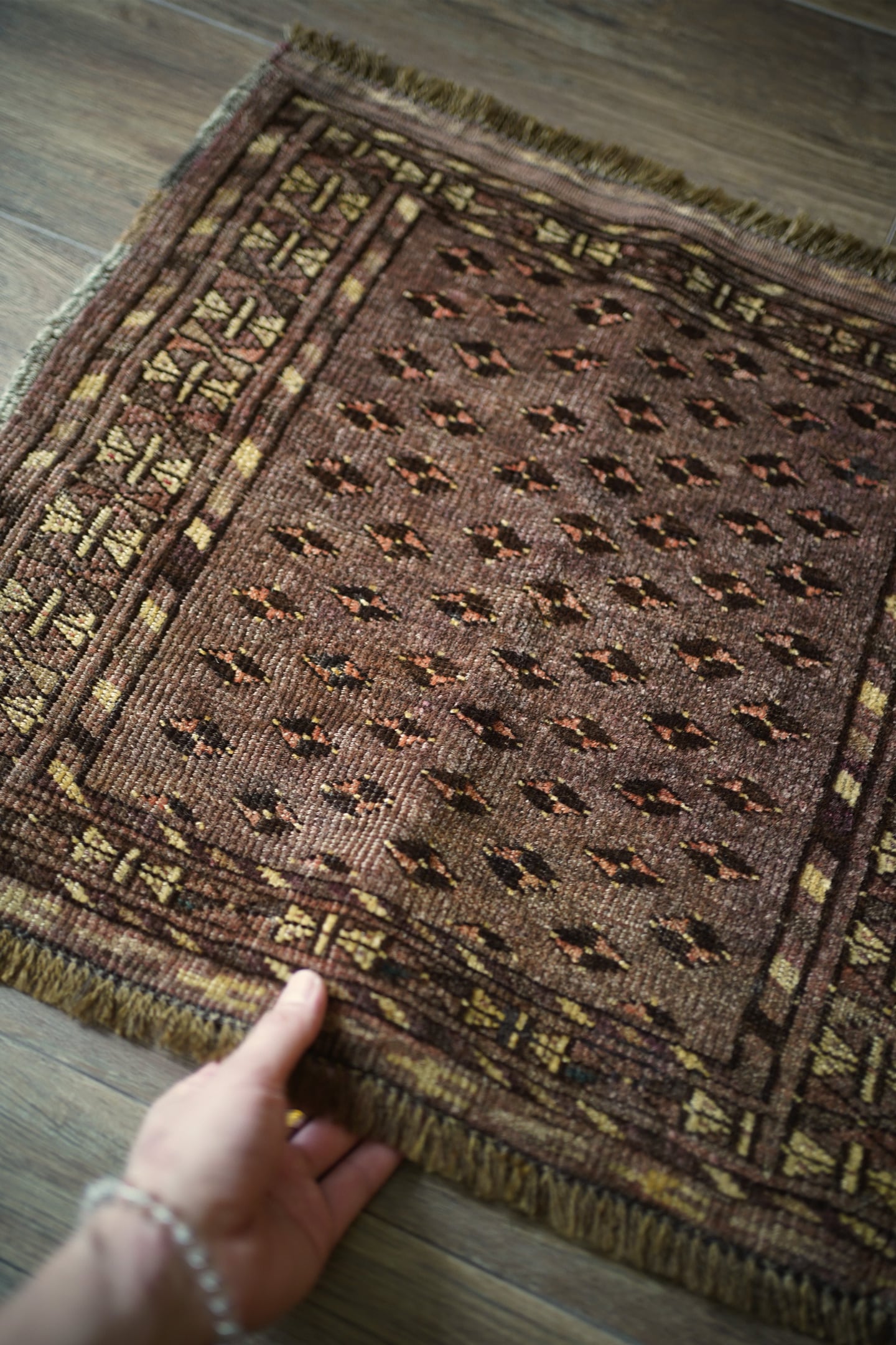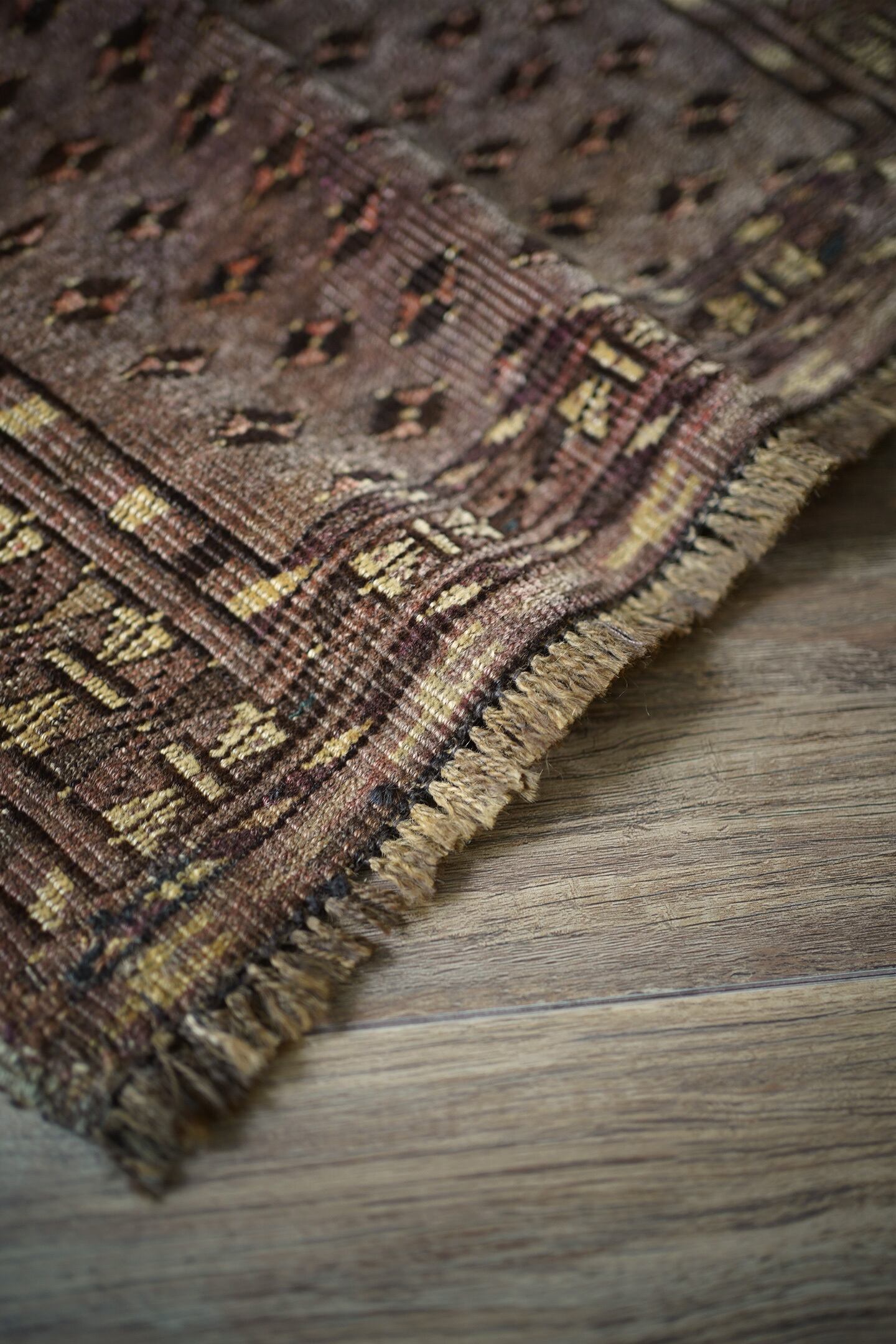 約100年前に織られた"Qazul Ayaq family"デザインのアフガニスタン産のトルクメンラグ。ブラウンとベージュがベースの落ち着いた渋い色合いの一枚で、フィールドの薄いオレンジと焦茶の小さな菱形紋様が可愛らしい雰囲気を醸し出しています。フリンジ部分は片側のみキリムエンドの作り。パイルは短めで、表面はサラふわっとした優しい肌触りをしています。厚みは4mm〜5mm程度。目立ったダメージもなく良好なコンディションです。観葉植物に合わせると非常に素敵かと思います♫