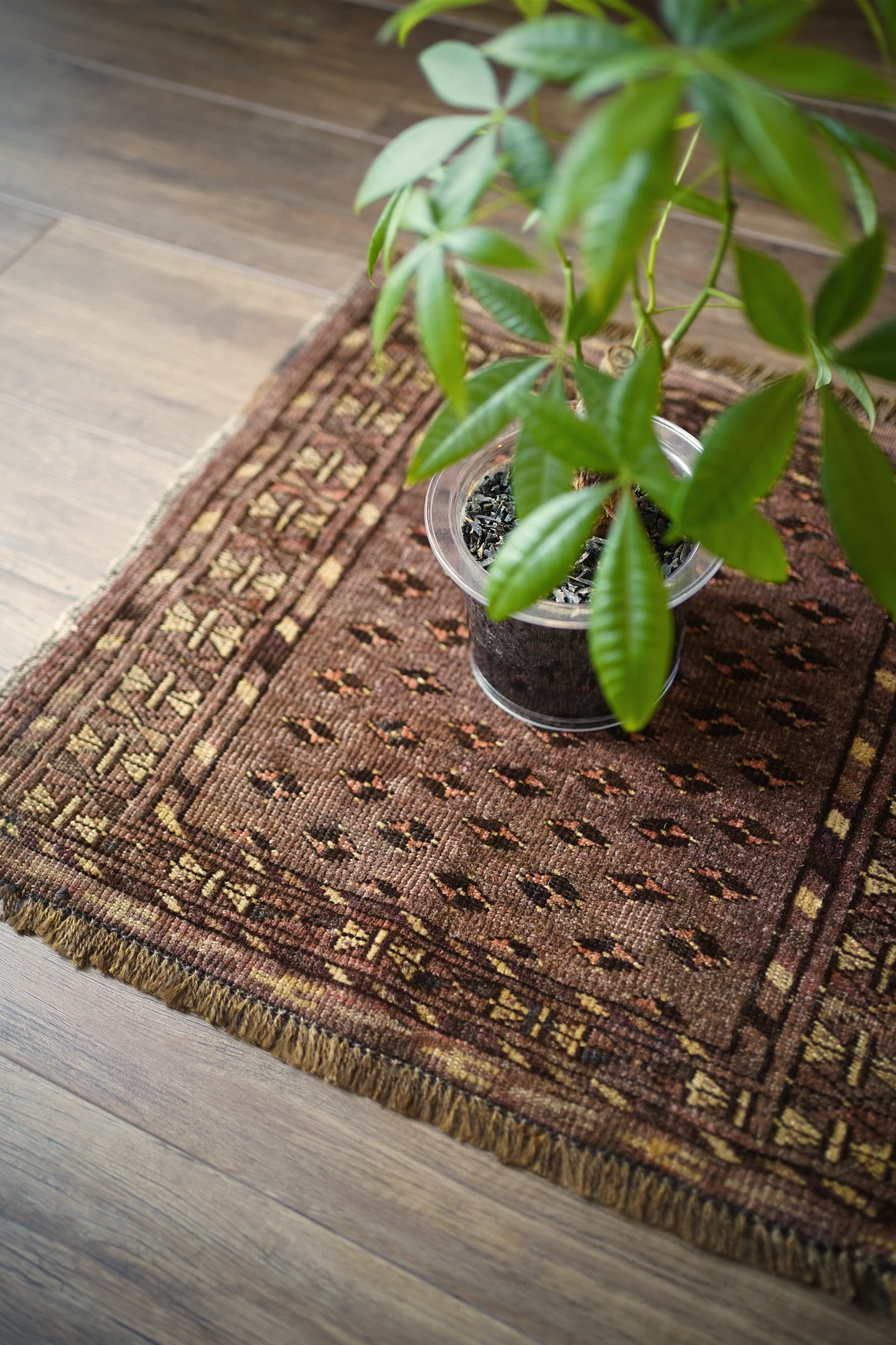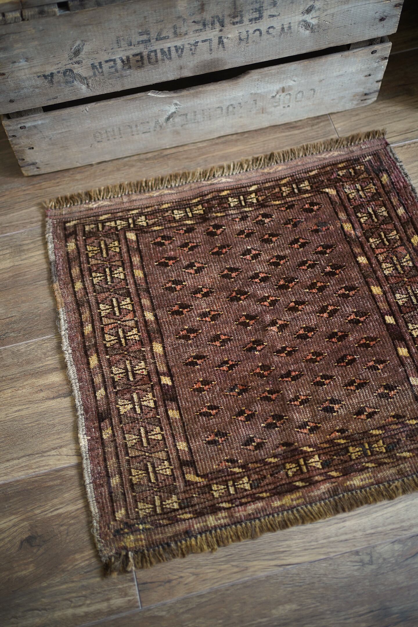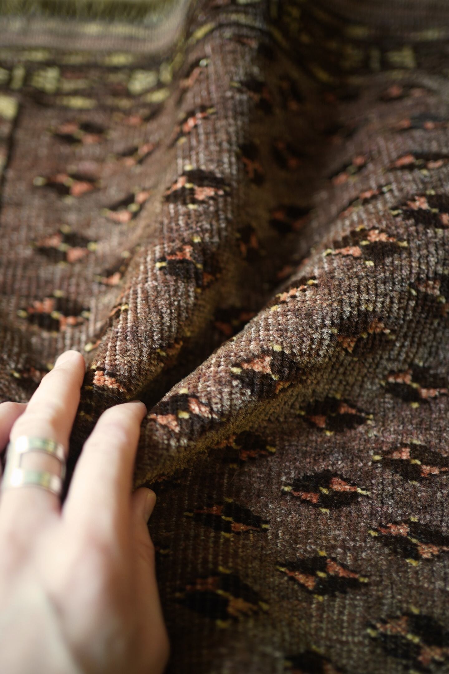 約100年前に織られた"Qazul Ayaq family"デザインのアフガニスタン産のトルクメンラグ。ブラウンとベージュがベースの落ち着いた渋い色合いの一枚で、フィールドの薄いオレンジと焦茶の小さな菱形紋様が可愛らしい雰囲気を醸し出しています。フリンジ部分は片側のみキリムエンドの作り。パイルは短めで、表面はサラふわっとした優しい肌触りをしています。厚みは4mm〜5mm程度。目立ったダメージもなく良好なコンディションです。観葉植物に合わせると非常に素敵かと思います♫