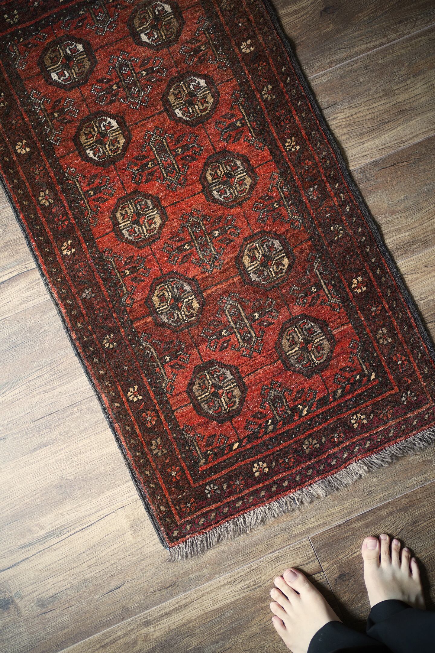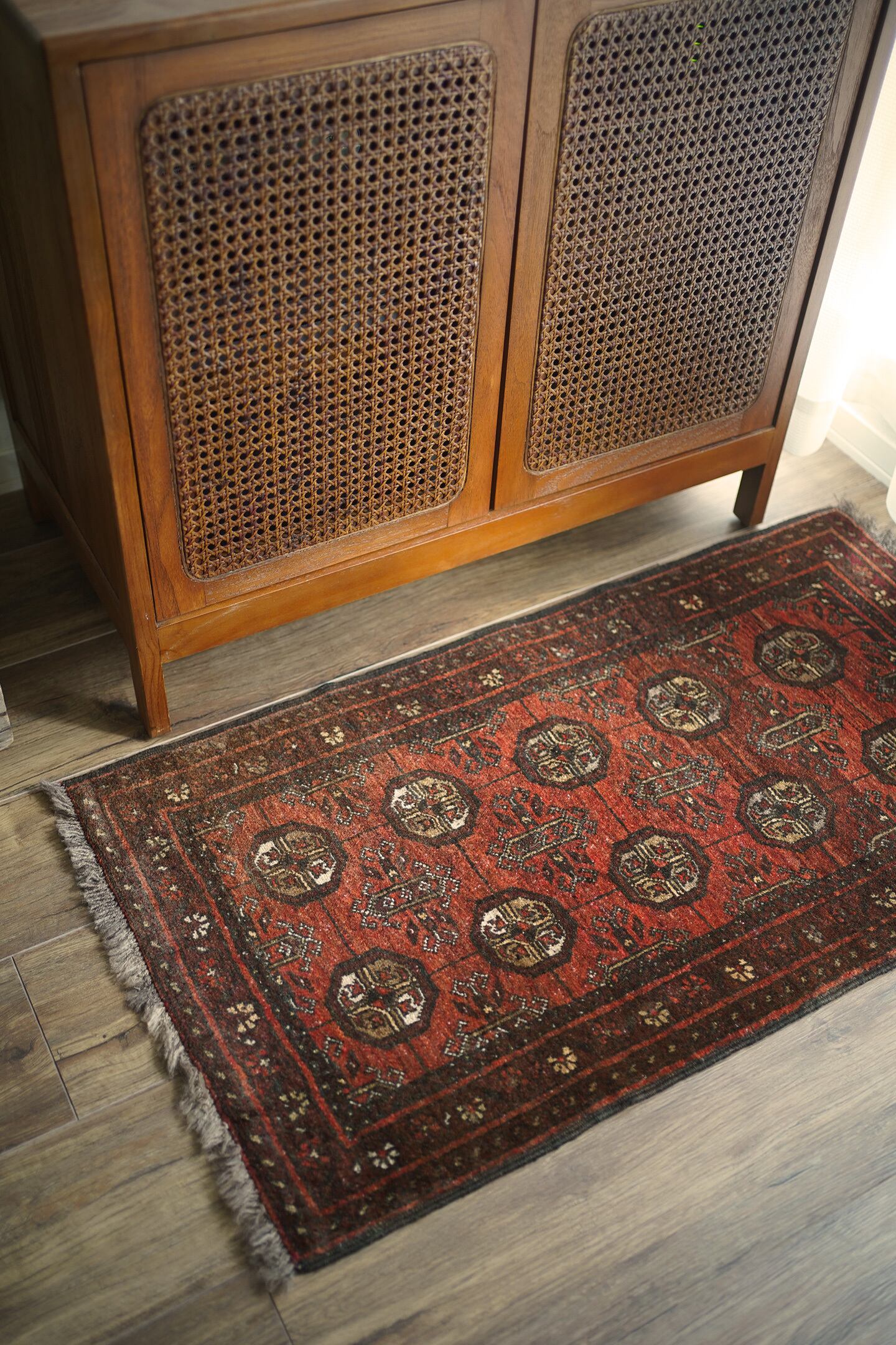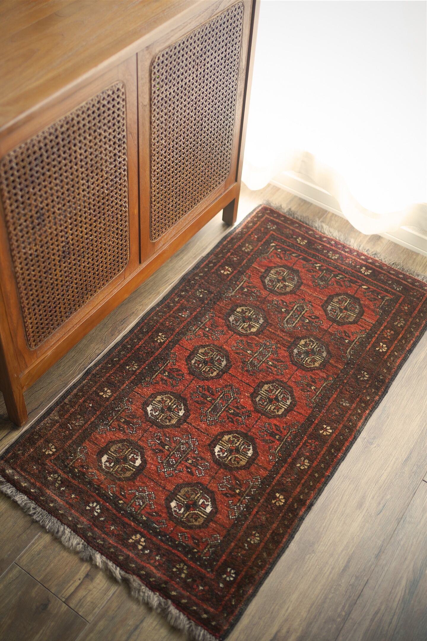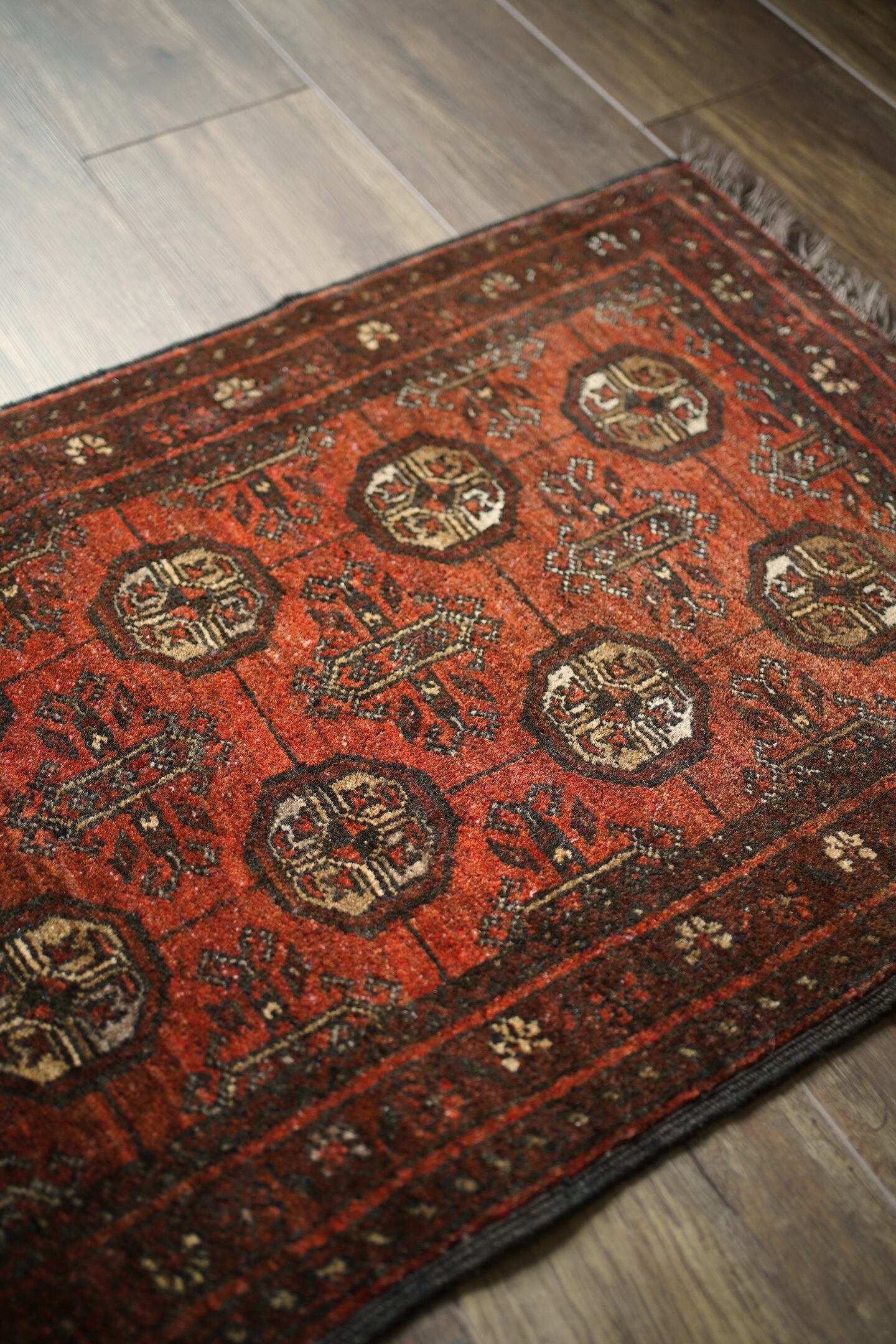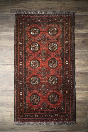 経年約60年のアフガニスタン産のトルクメンラグ。深い茜色のような赤色と焦茶のコントラストが目を惹く一枚で、落ち着いた雰囲気ながらお洒落な配色とデザインで空間を素敵に引き立ててくれそうです。表面はふわっと柔らかい優しい肌触りで、厚みは7mm程度。ダメージや補修された跡も見受けられず、大変良好なコンディション。ラック前や全身鏡の前、ちょっとしたスペースにどうぞ♫