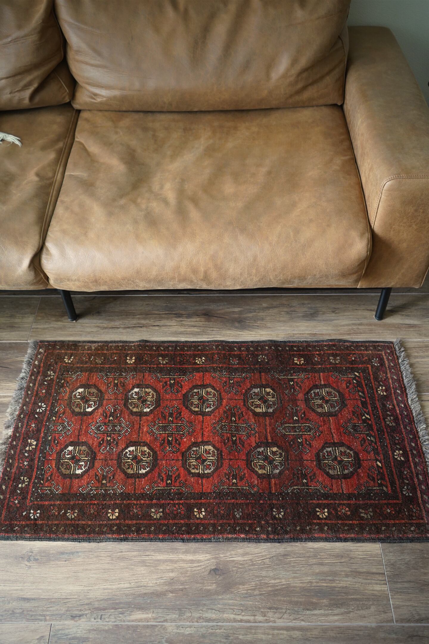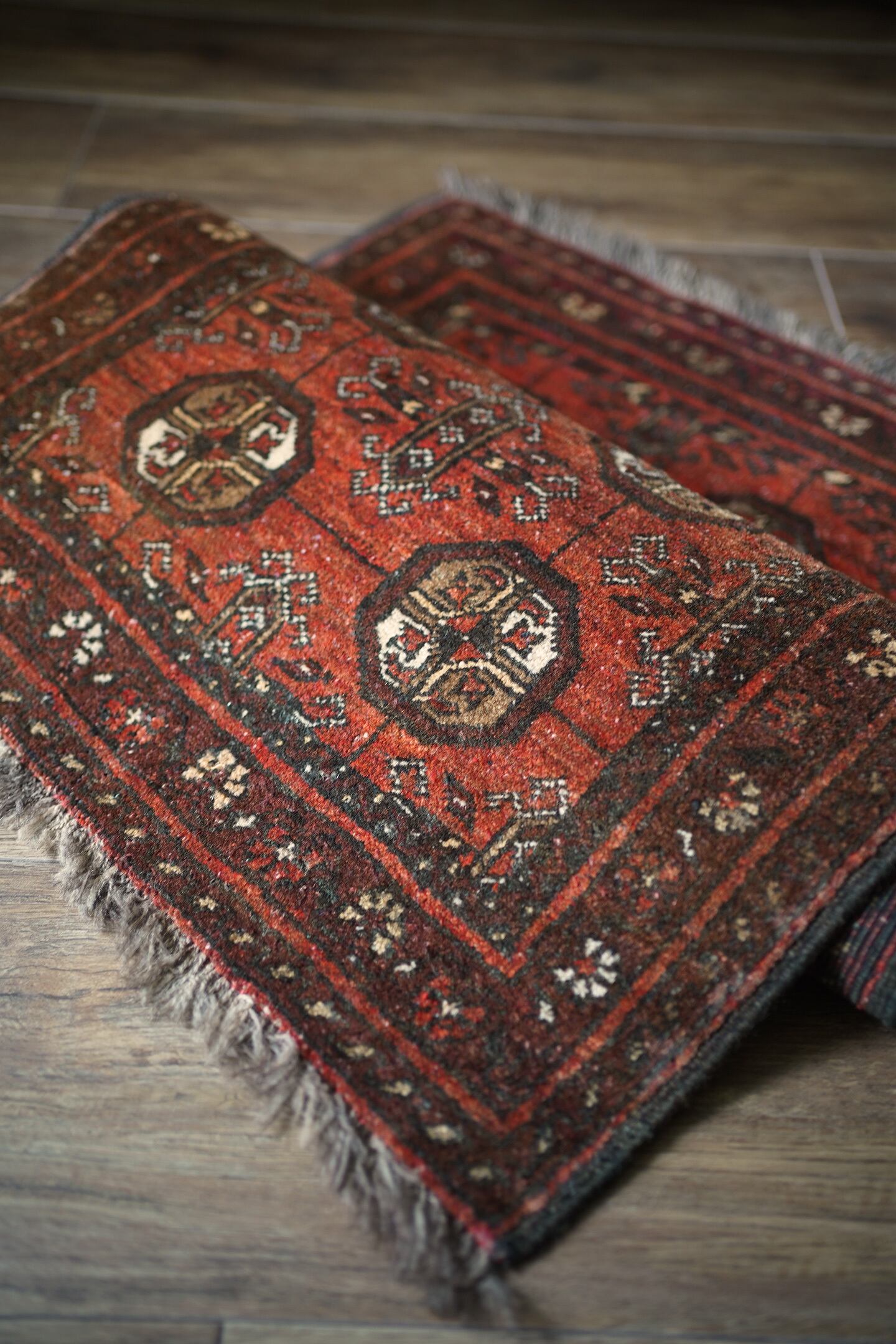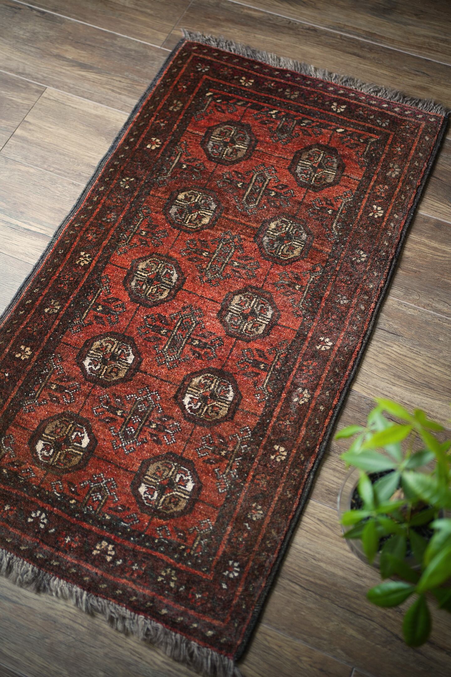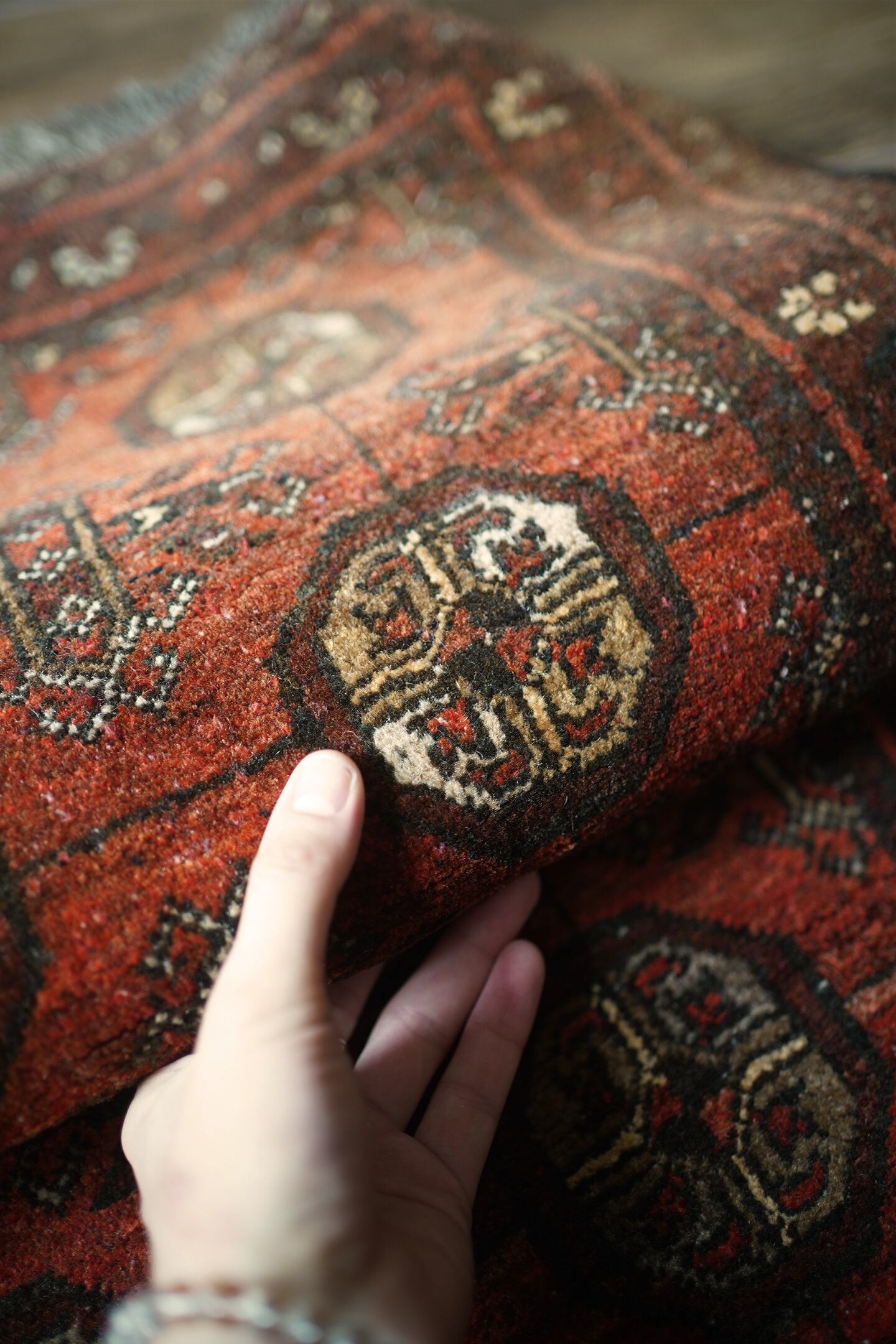 経年約60年のアフガニスタン産のトルクメンラグ。深い茜色のような赤色と焦茶のコントラストが目を惹く一枚で、落ち着いた雰囲気ながらお洒落な配色とデザインで空間を素敵に引き立ててくれそうです。表面はふわっと柔らかい優しい肌触りで、厚みは7mm程度。ダメージや補修された跡も見受けられず、大変良好なコンディション。ラック前や全身鏡の前、ちょっとしたスペースにどうぞ♫