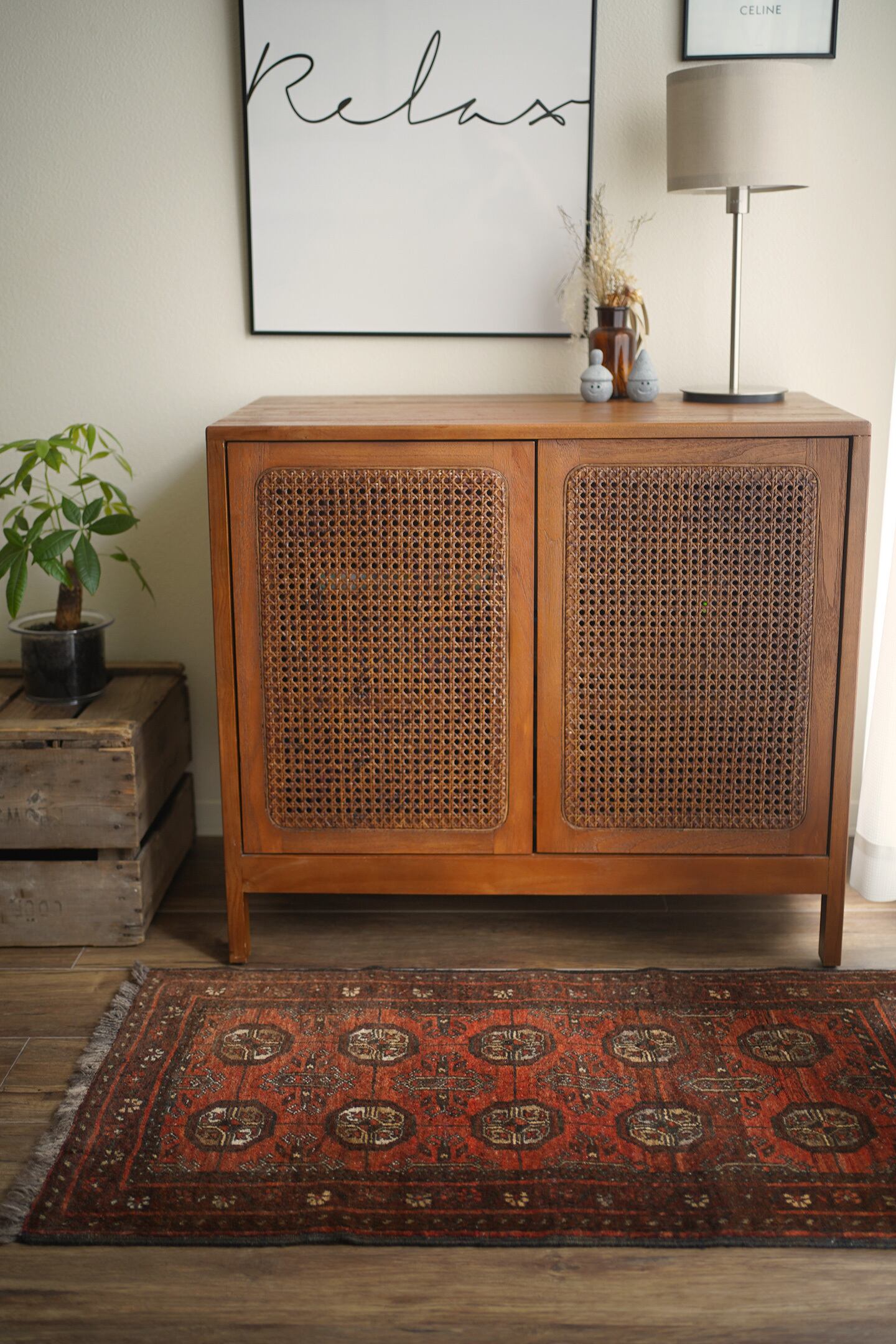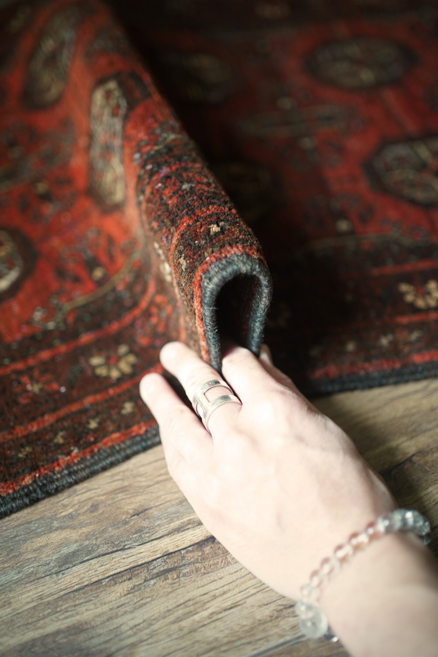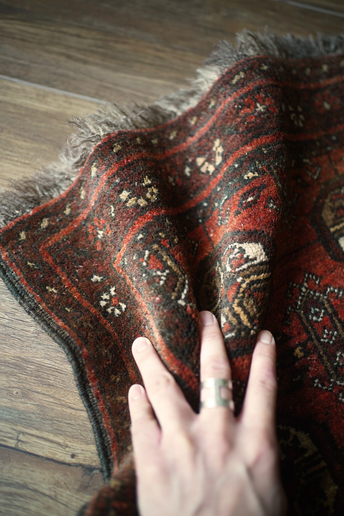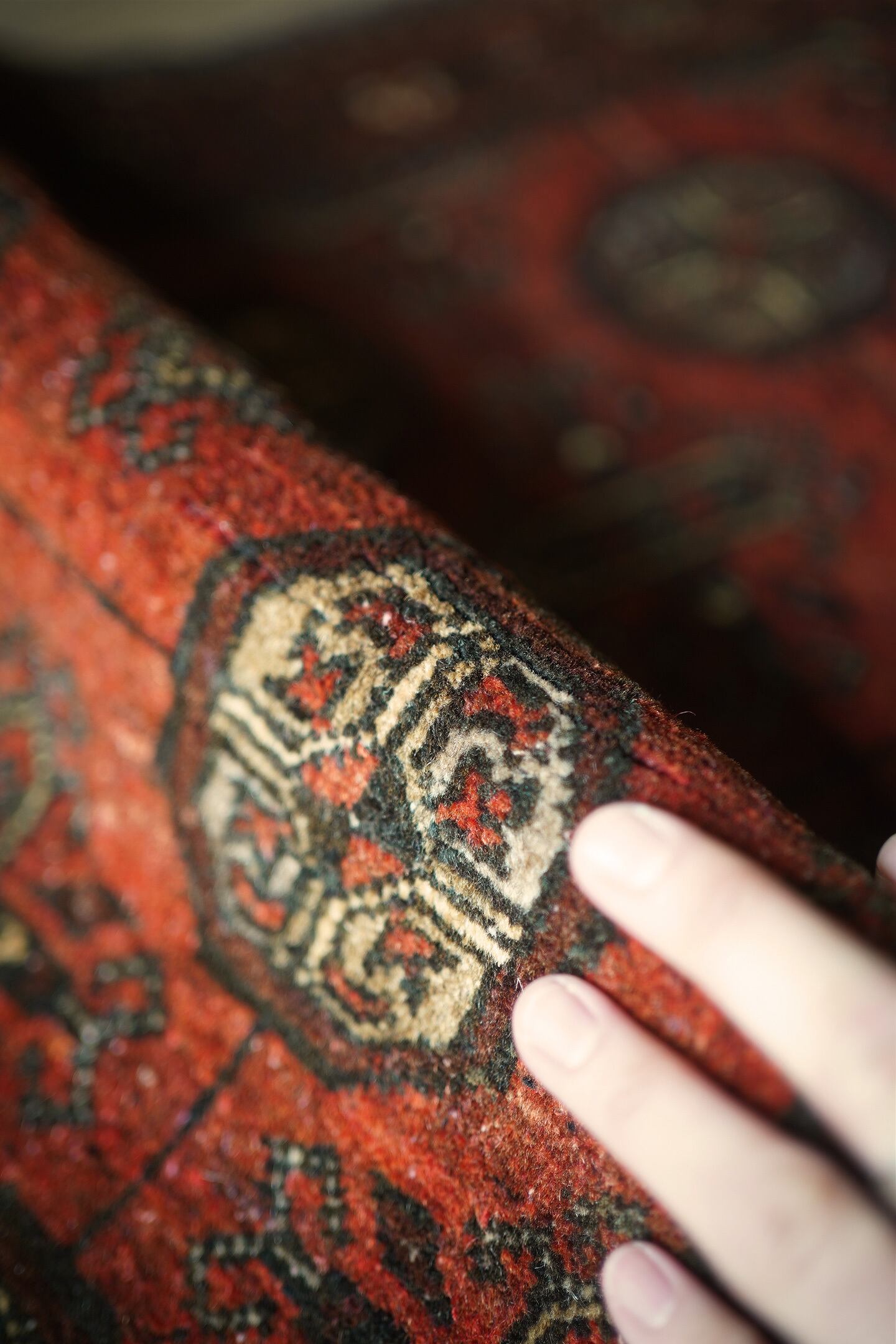 経年約60年のアフガニスタン産のトルクメンラグ。深い茜色のような赤色と焦茶のコントラストが目を惹く一枚で、落ち着いた雰囲気ながらお洒落な配色とデザインで空間を素敵に引き立ててくれそうです。表面はふわっと柔らかい優しい肌触りで、厚みは7mm程度。ダメージや補修された跡も見受けられず、大変良好なコンディション。ラック前や全身鏡の前、ちょっとしたスペースにどうぞ♫