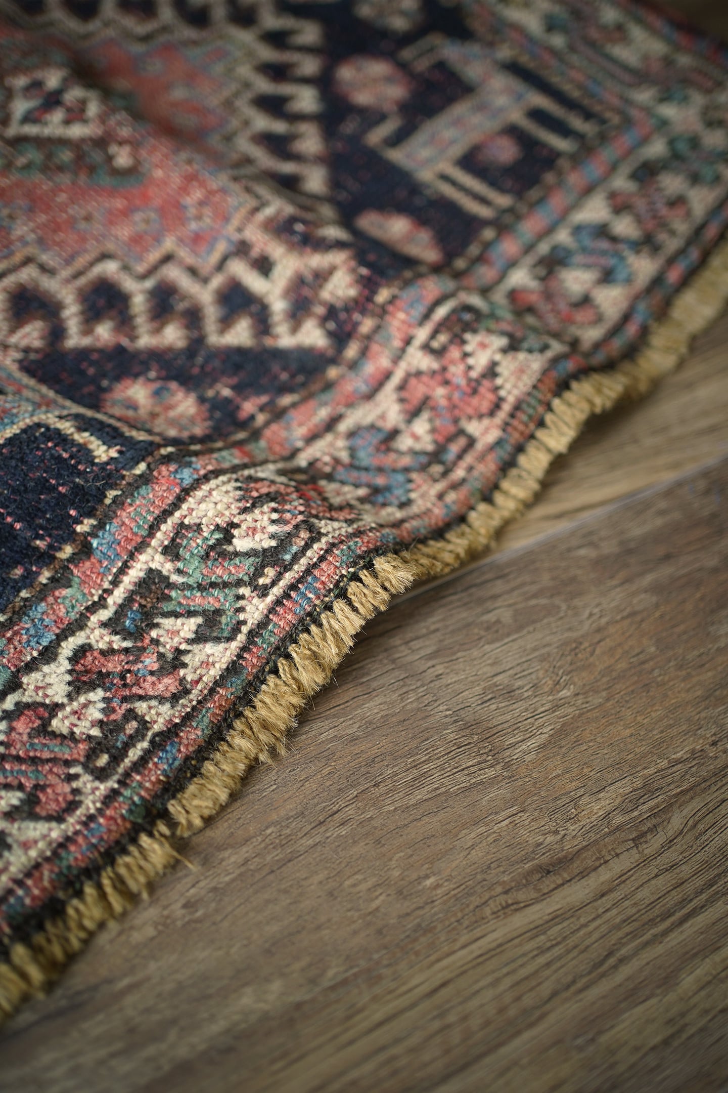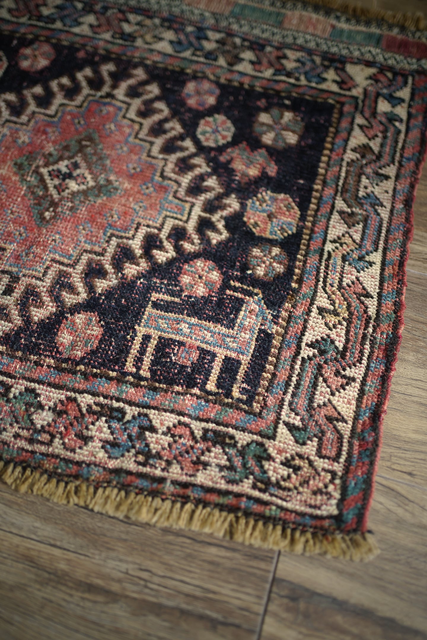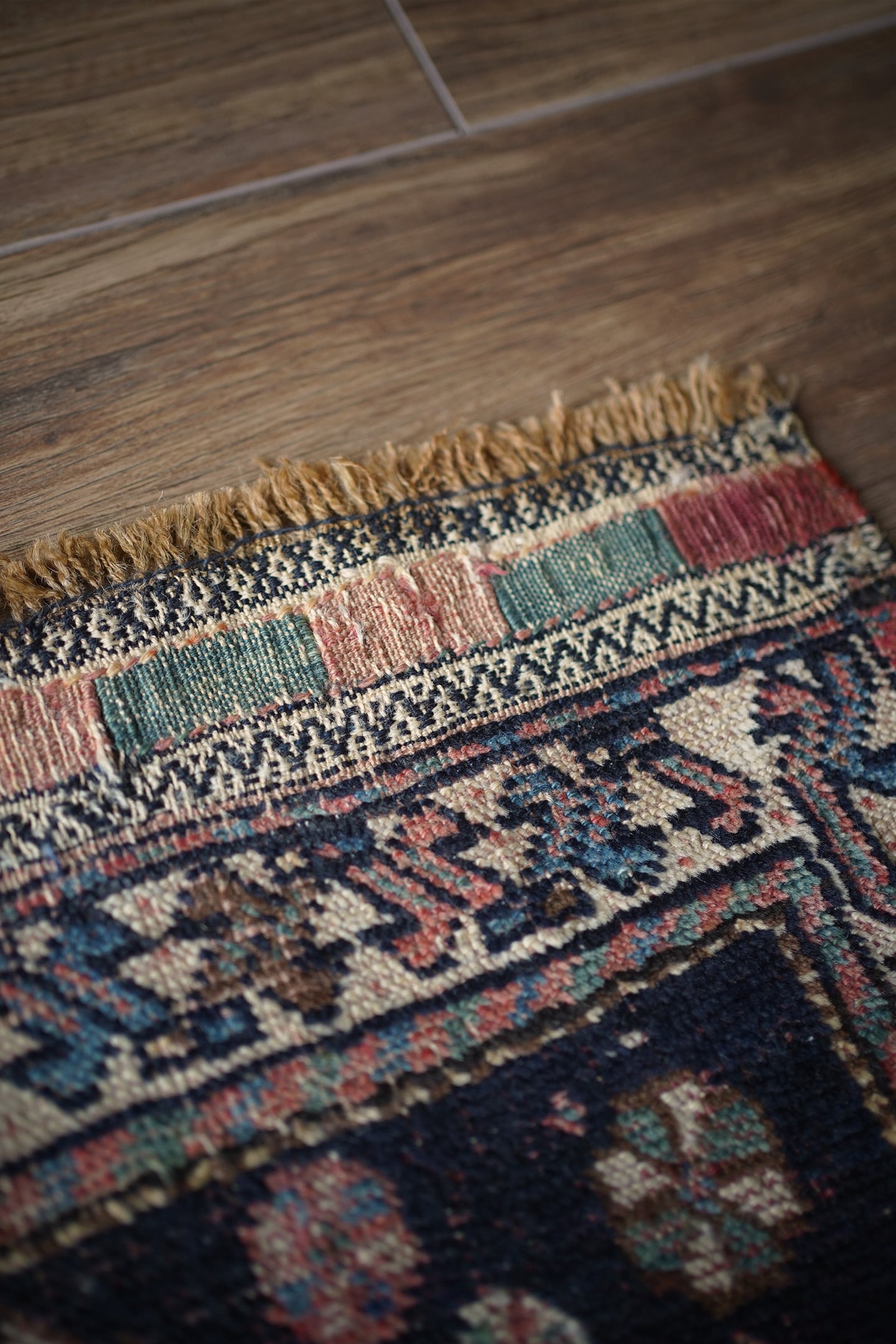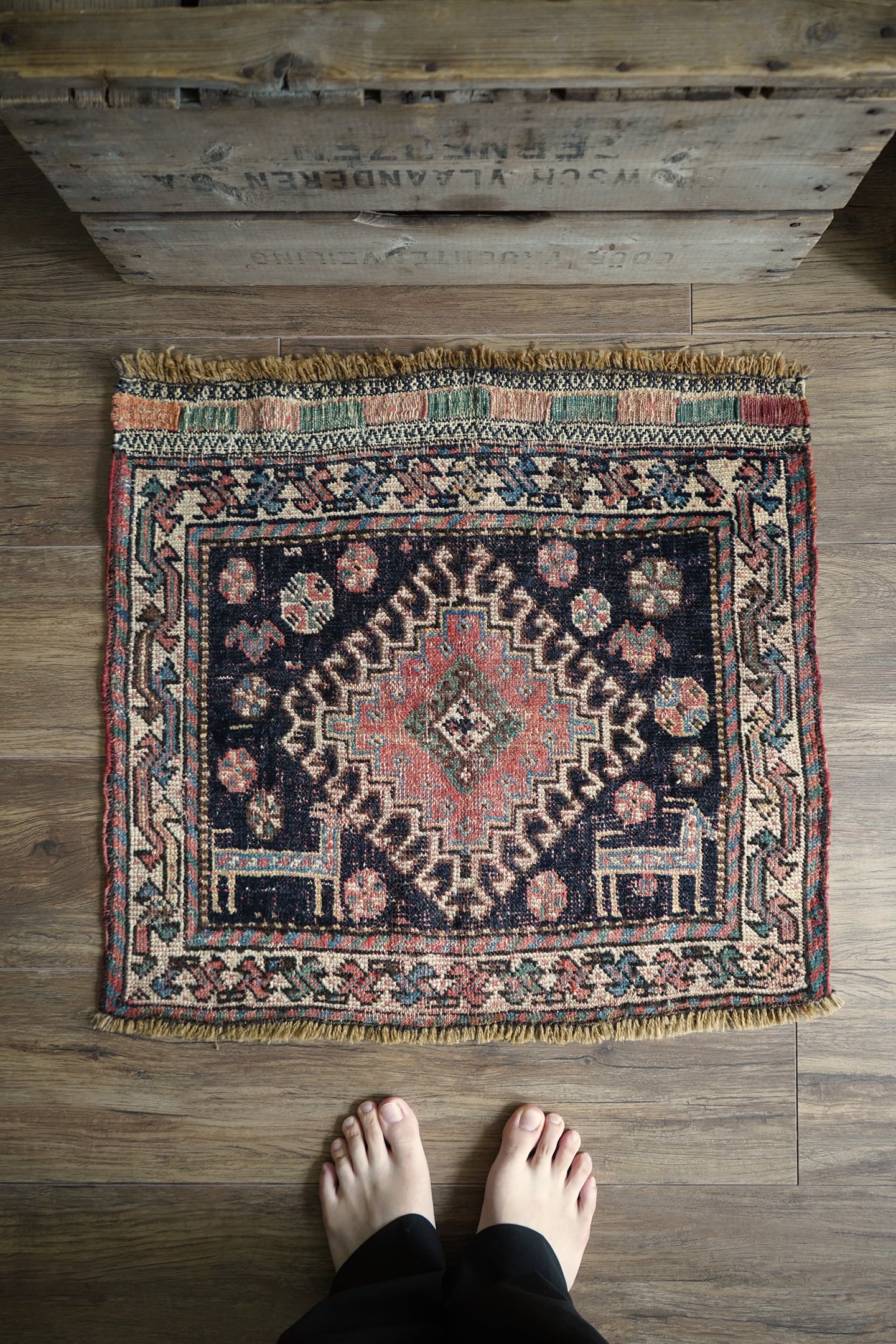 おおよそ120年前にアフシャール族によって織られたサドルバック(ホルジン)を表面のみに切り取って加工したラグです。色褪せた質感の一枚で、濃紺に薄いエメラルドグリーンとサーモンピンクのカラーリングの組み合わせが非常にお洒落です。経年が醸し出す渋めの存在感が素晴らしくアンティークの風合いを堪能できます。中央に大きく配置されたフックドメダリオンの周りには魔除を意味する狼の足跡の紋様や可愛らしい鹿の文様が印象的です。表面はサラッとした肌触りで、厚みは4mm程度。目立ったダメージなども見受けられずグッドコンディション。ぜひタペストリーとしてお家の玄関などに飾っていただければと思います♫