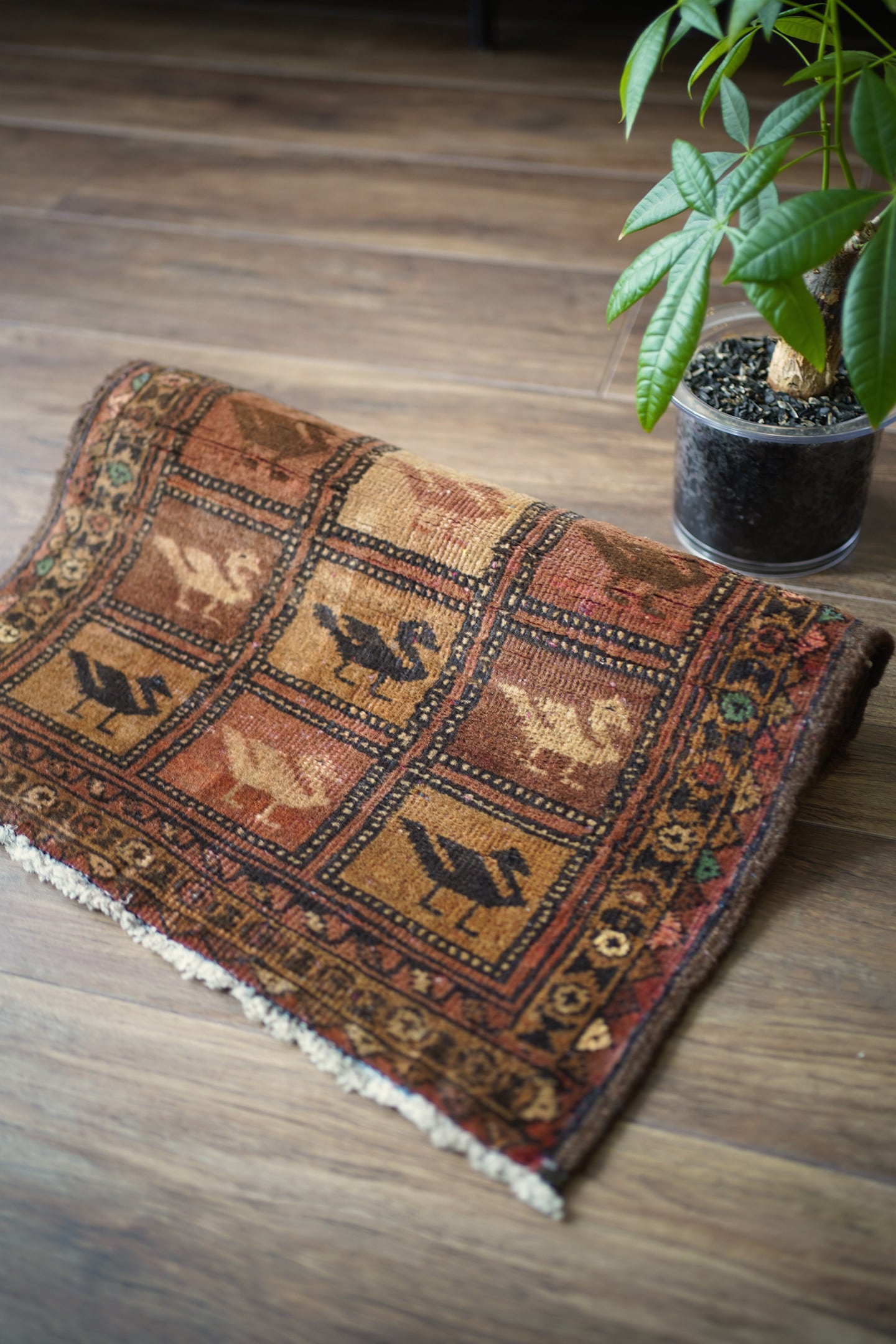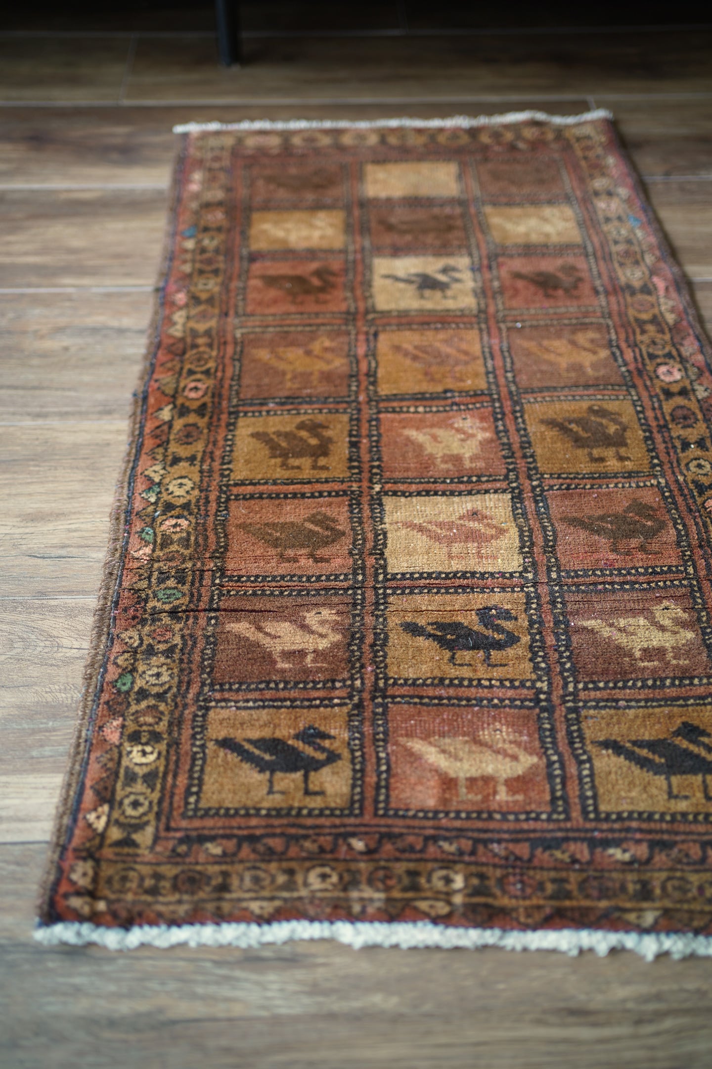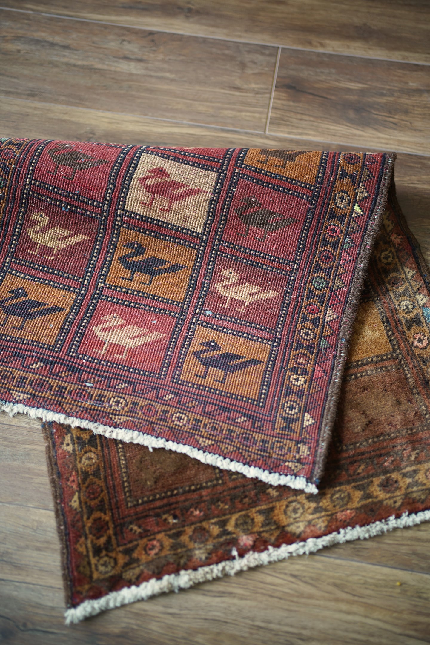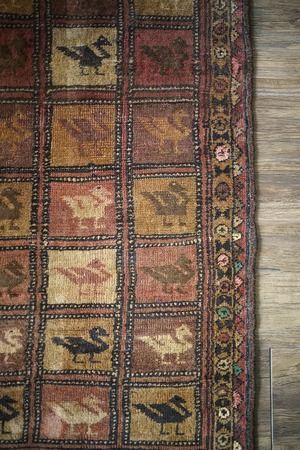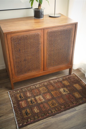 約50年前に織られたアフガニスタン産のバルーチラグ。格子状のデザインに可愛らしい鳥の紋様が織り込まれた一枚で、ヴィンテージを感じさせる風合いもあり、渋さと可愛らしさの両方を持ち合わせています。ブラウン系統で統一された配色にアクセントカラーでブルーグリーンや薄いピンクが使われているところもポイントです。表面はサラふわっとした肌触りで、厚みは6mm〜7mm程度。裏面は張りのある硬めの質感をしています。パイルが低くなっているところもありますが、目立ったダメージも見受けられずグッドコンディション。珍しいデザインなのでピンと来た方はお見逃しなく♫