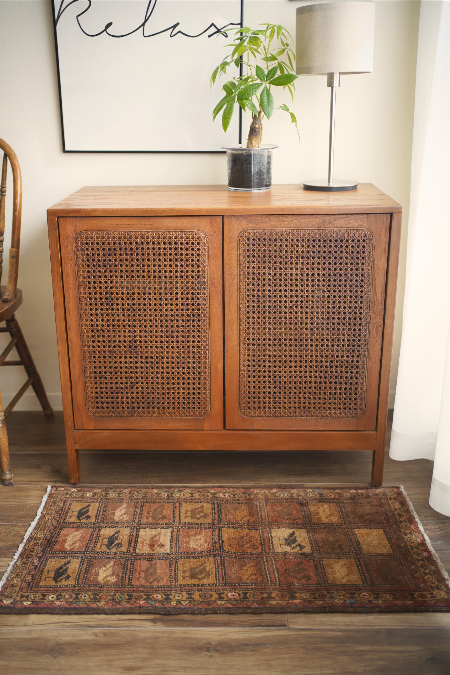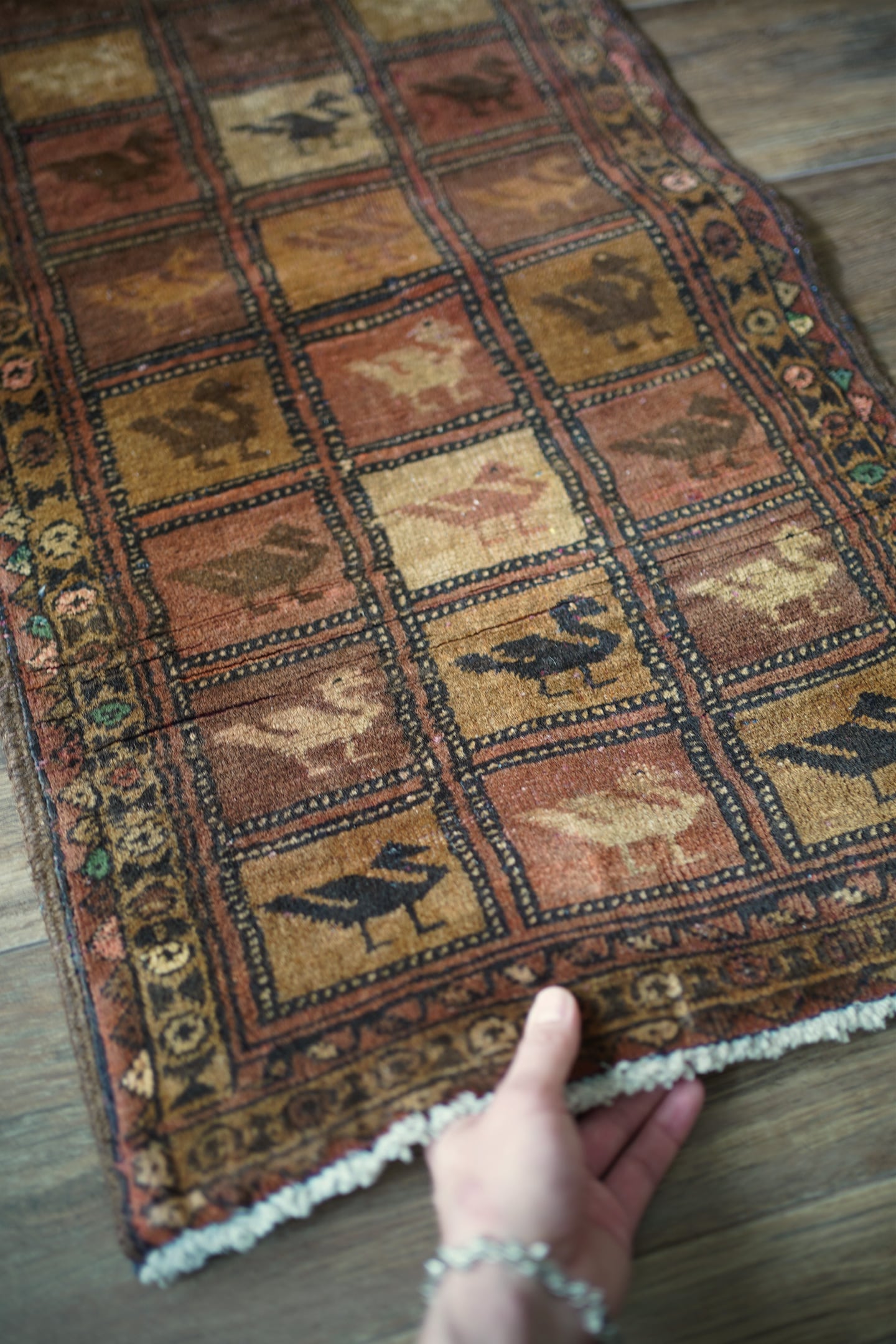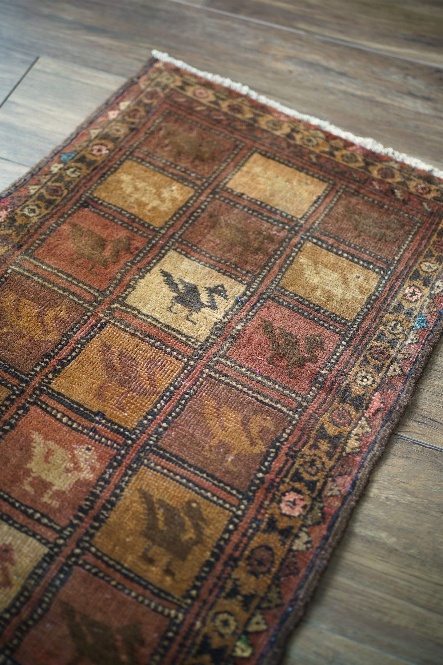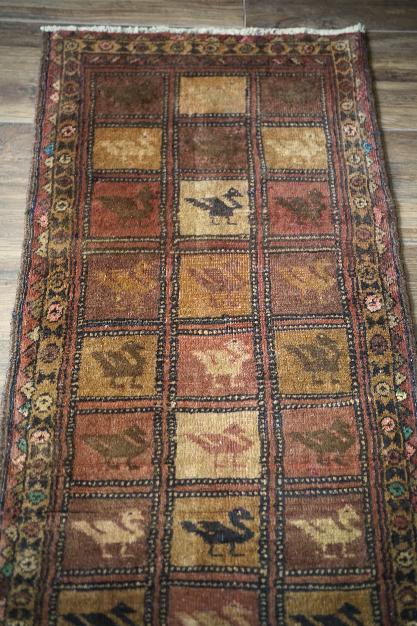 約50年前に織られたアフガニスタン産のバルーチラグ。格子状のデザインに可愛らしい鳥の紋様が織り込まれた一枚で、ヴィンテージを感じさせる風合いもあり、渋さと可愛らしさの両方を持ち合わせています。ブラウン系統で統一された配色にアクセントカラーでブルーグリーンや薄いピンクが使われているところもポイントです。表面はサラふわっとした肌触りで、厚みは6mm〜7mm程度。裏面は張りのある硬めの質感をしています。パイルが低くなっているところもありますが、目立ったダメージも見受けられずグッドコンディション。珍しいデザインなのでピンと来た方はお見逃しなく♫