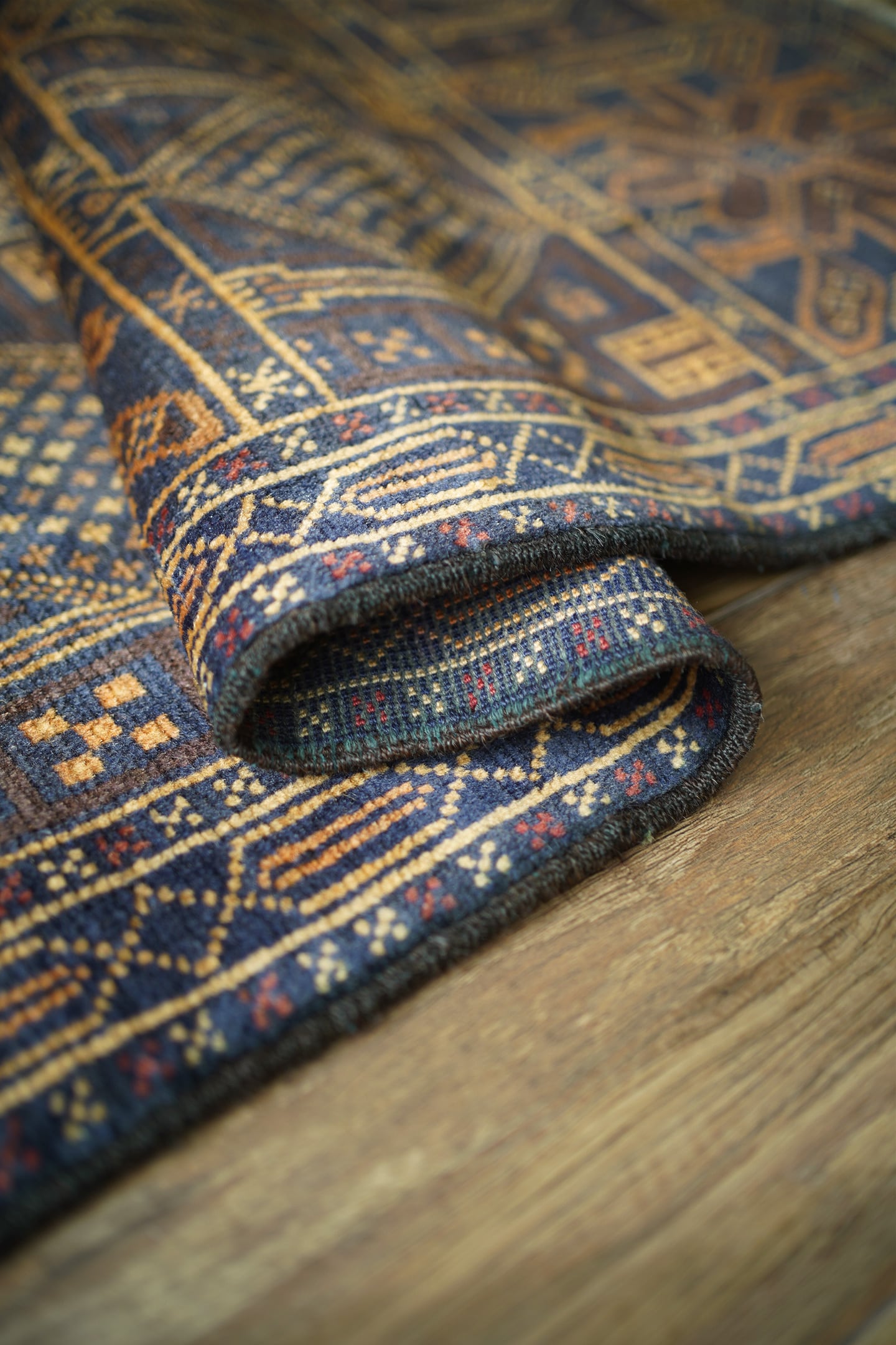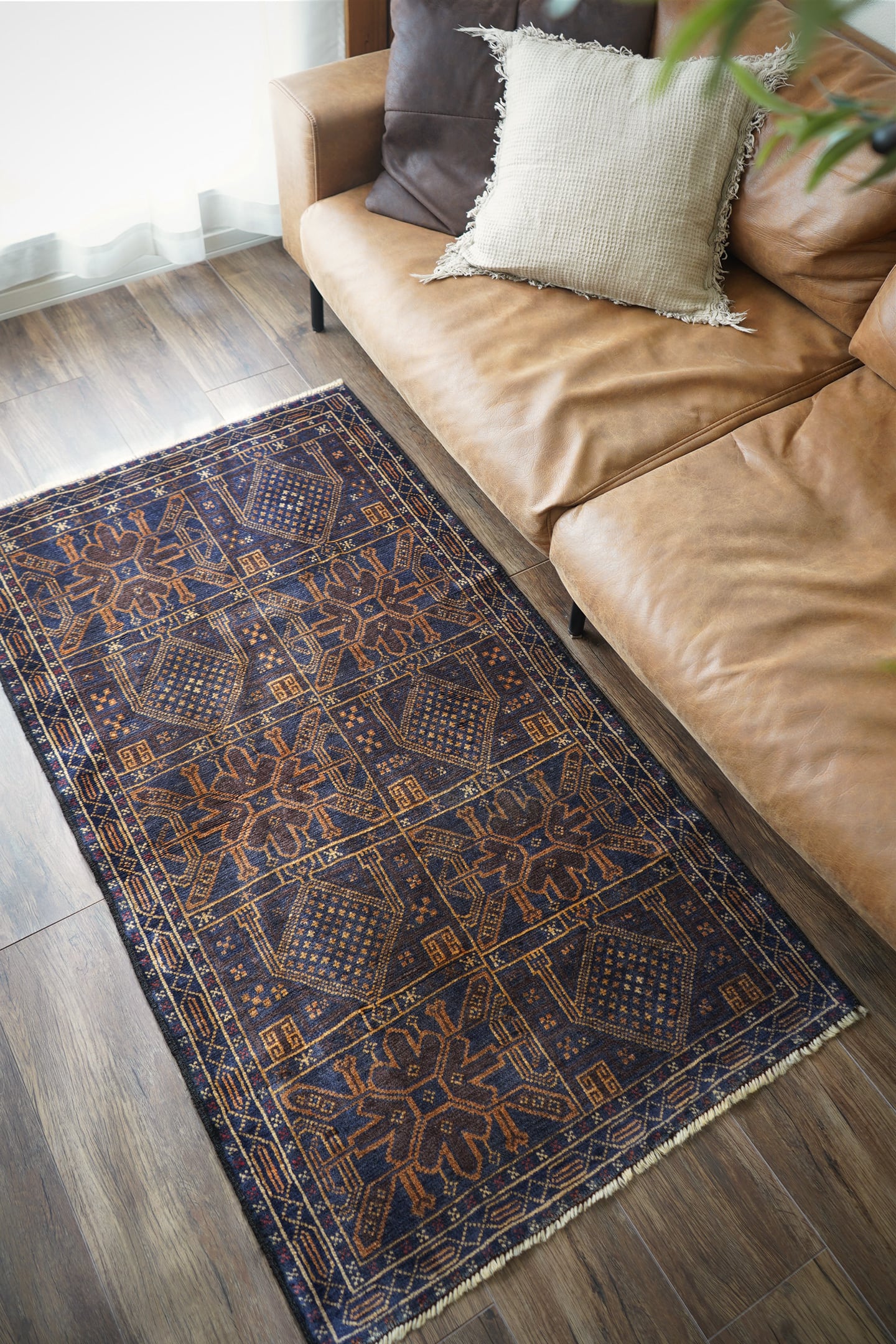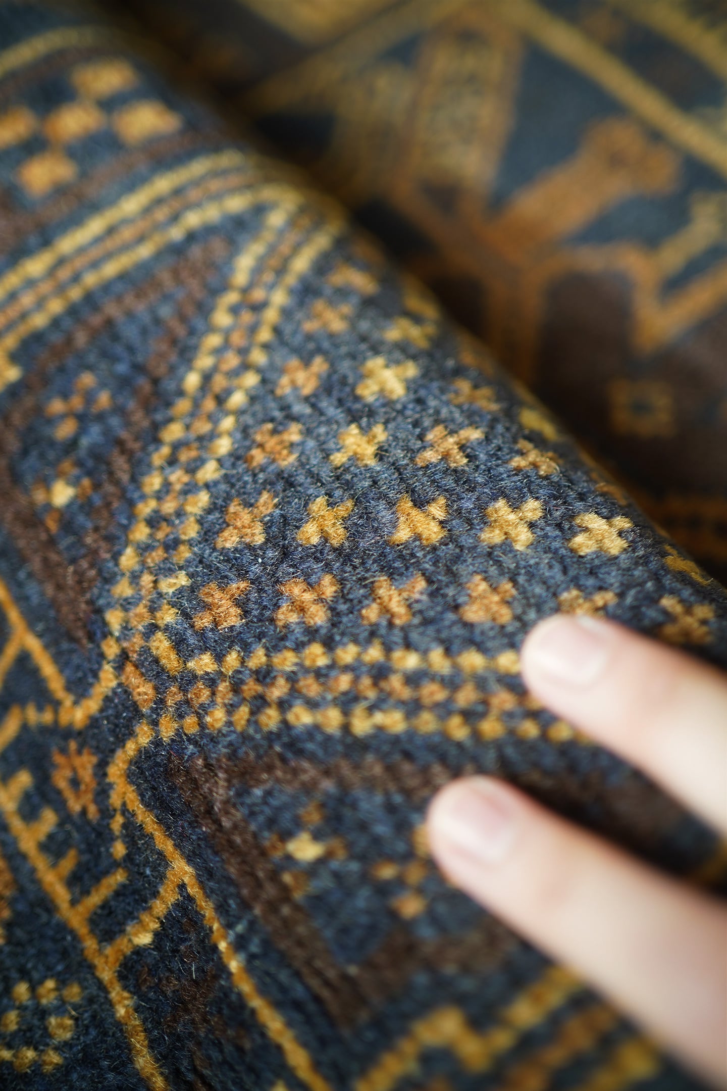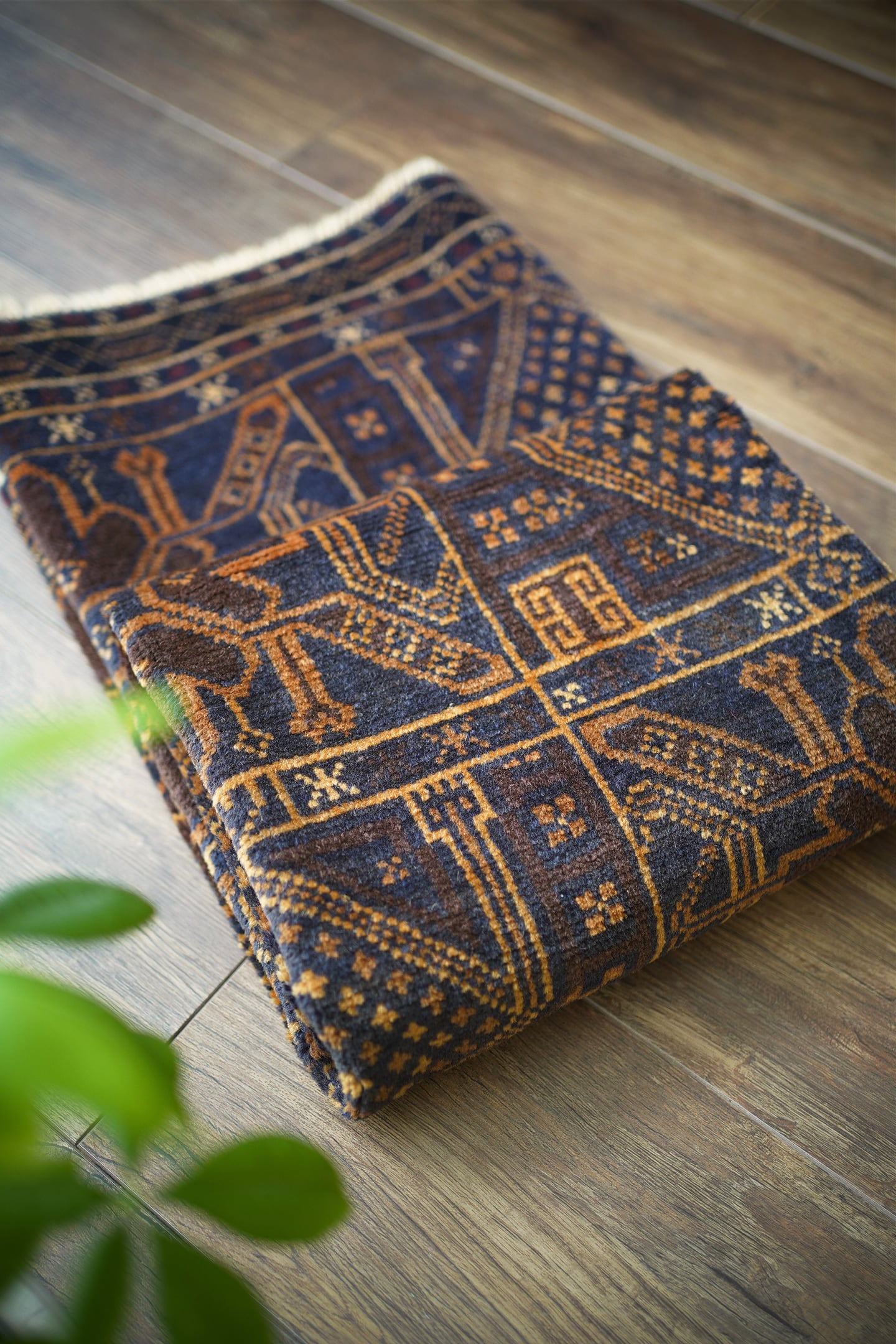 経年30年のアフガニスタン産のバルーチラグ。濃紺、ブラウン、キャメルの落ち着いた色合いの組み合わせに洗練された紋様デザインで様々なインテリアとも合わせやすく、スッとお部屋に馴染んでくれる一枚かと思います。パイルは短めでサラふわっと滑らかな肌触りをしており、オールシーズン快適にお使いいただける質感です。厚みは6mmほど。ダメージや補修された跡もなく大変良好なコンディション。ウォークインクローゼットやリビングのちょっとしたスペースなどお好きな場所に。