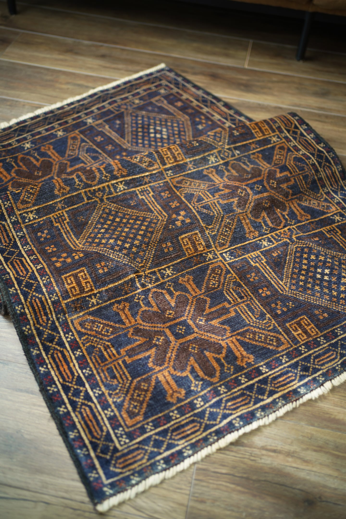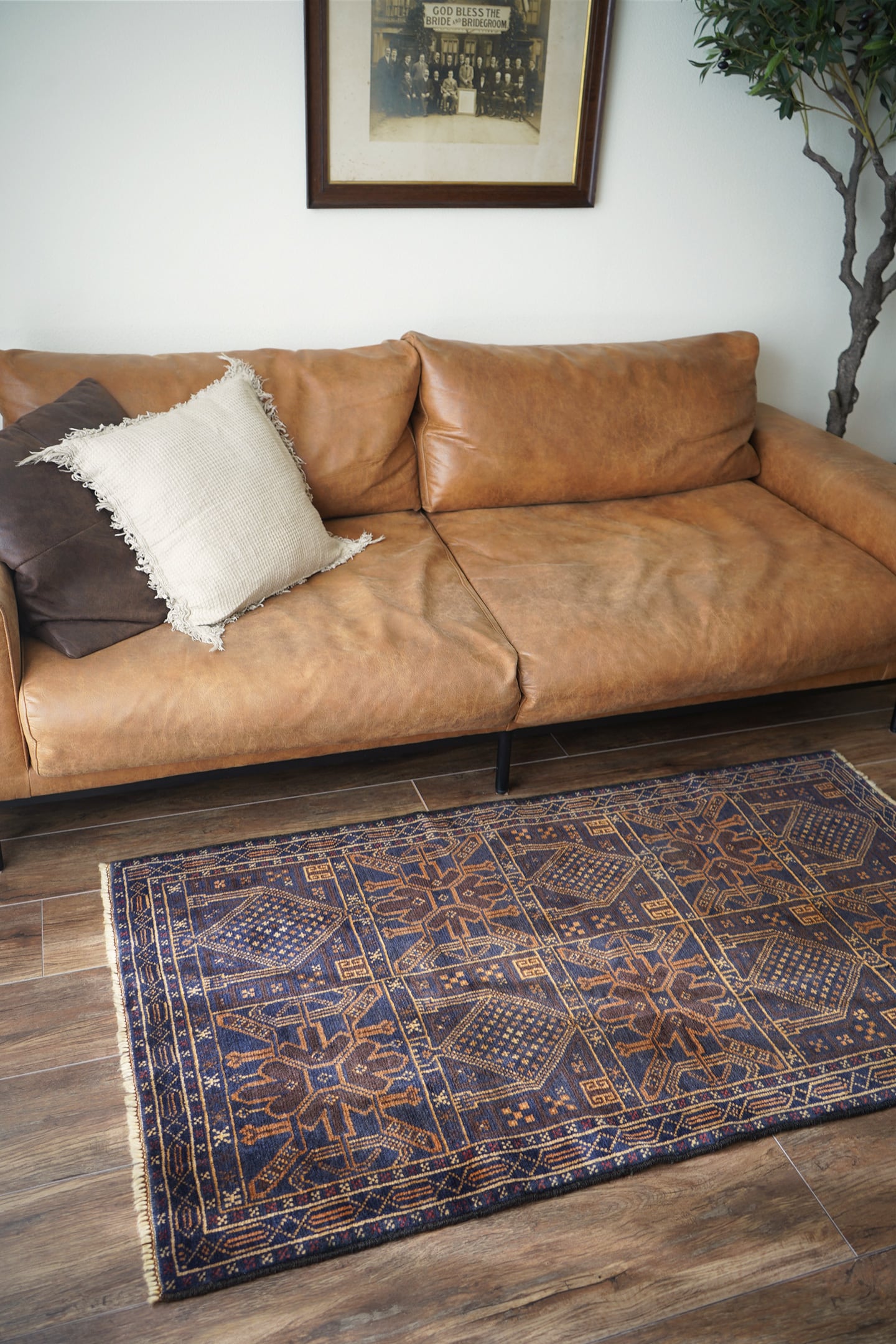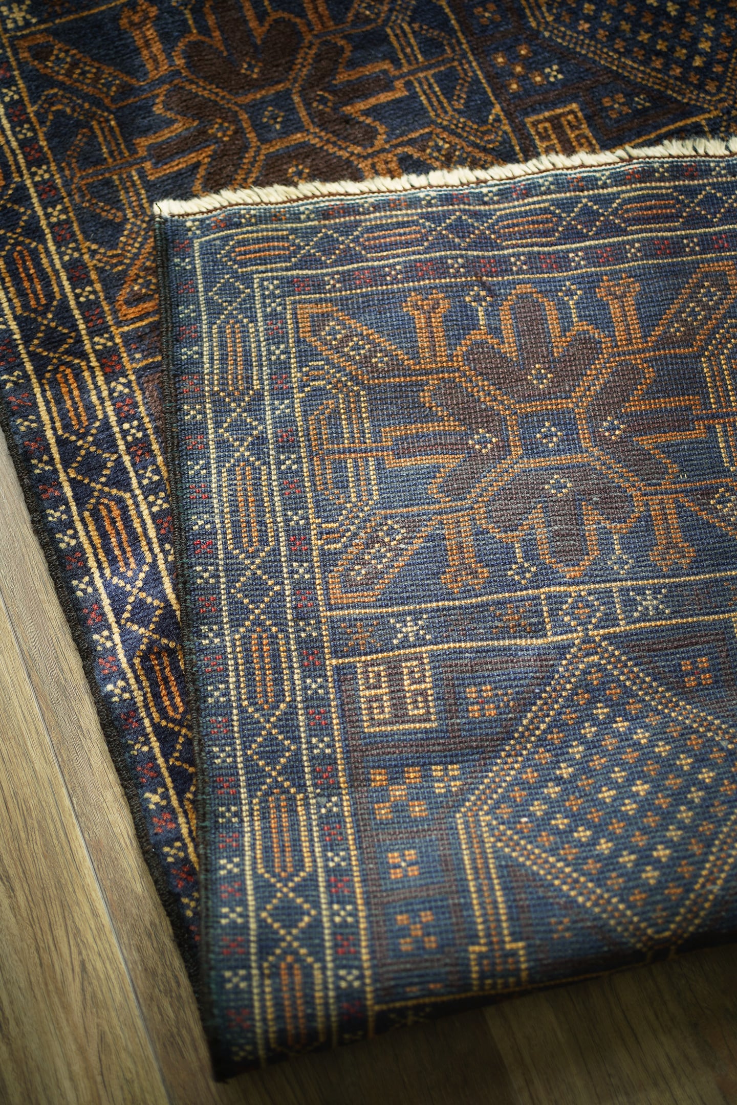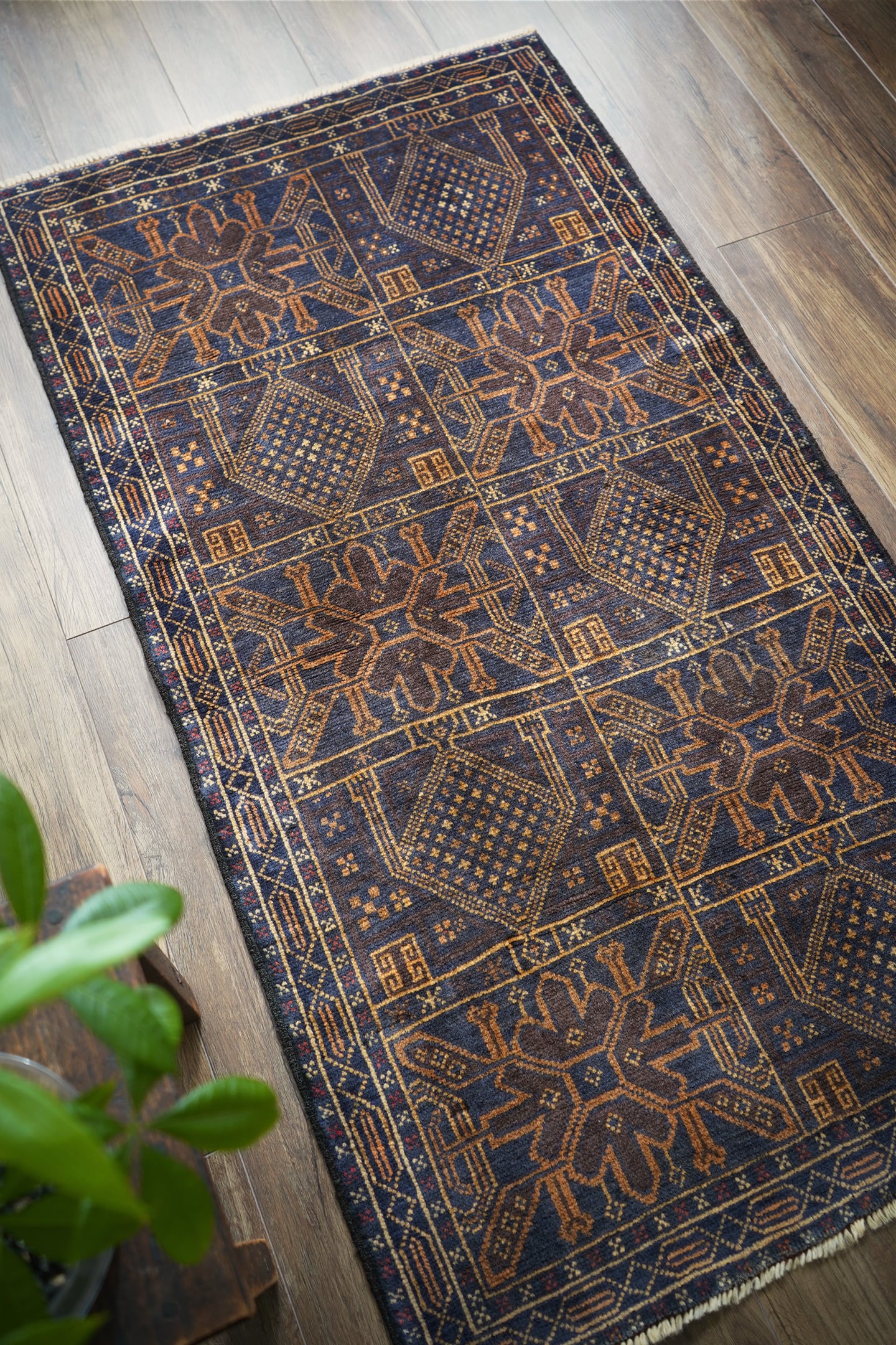 経年30年のアフガニスタン産のバルーチラグ。濃紺、ブラウン、キャメルの落ち着いた色合いの組み合わせに洗練された紋様デザインで様々なインテリアとも合わせやすく、スッとお部屋に馴染んでくれる一枚かと思います。パイルは短めでサラふわっと滑らかな肌触りをしており、オールシーズン快適にお使いいただける質感です。厚みは6mmほど。ダメージや補修された跡もなく大変良好なコンディション。ウォークインクローゼットやリビングのちょっとしたスペースなどお好きな場所に。