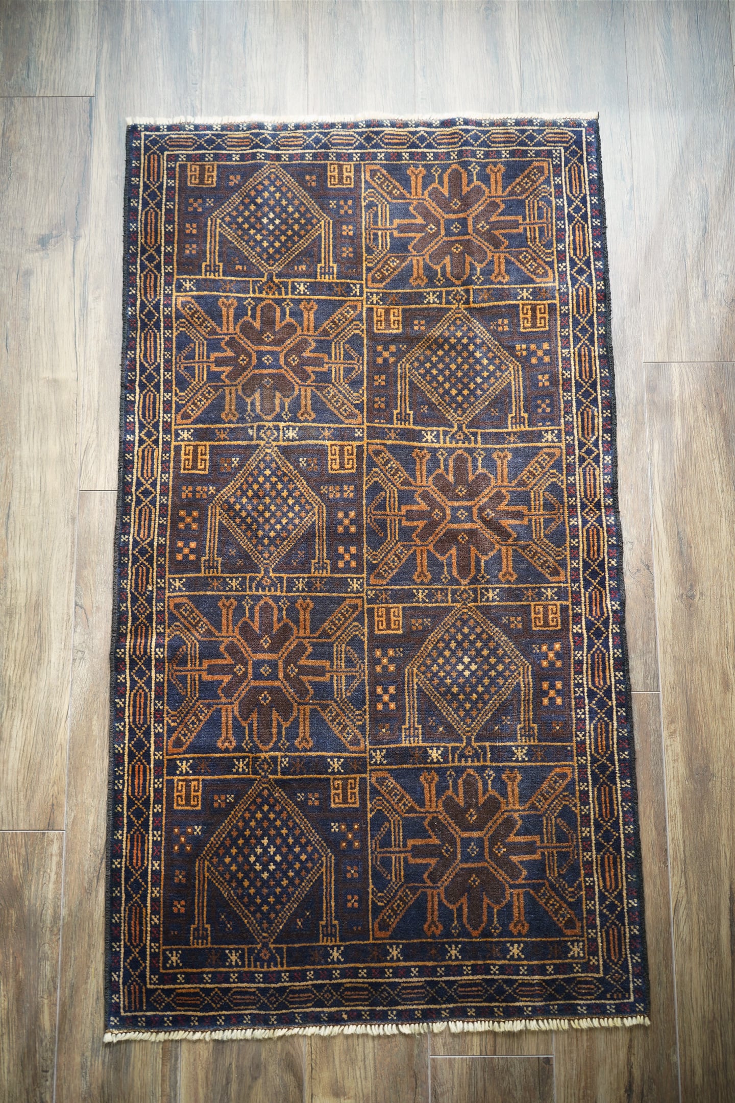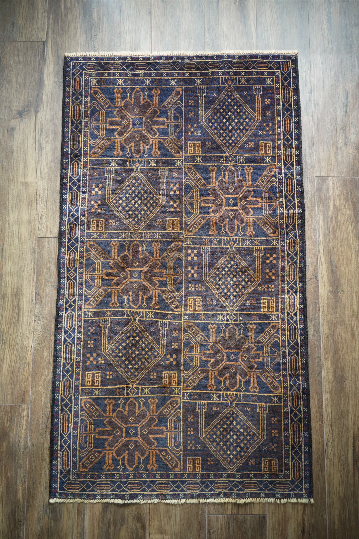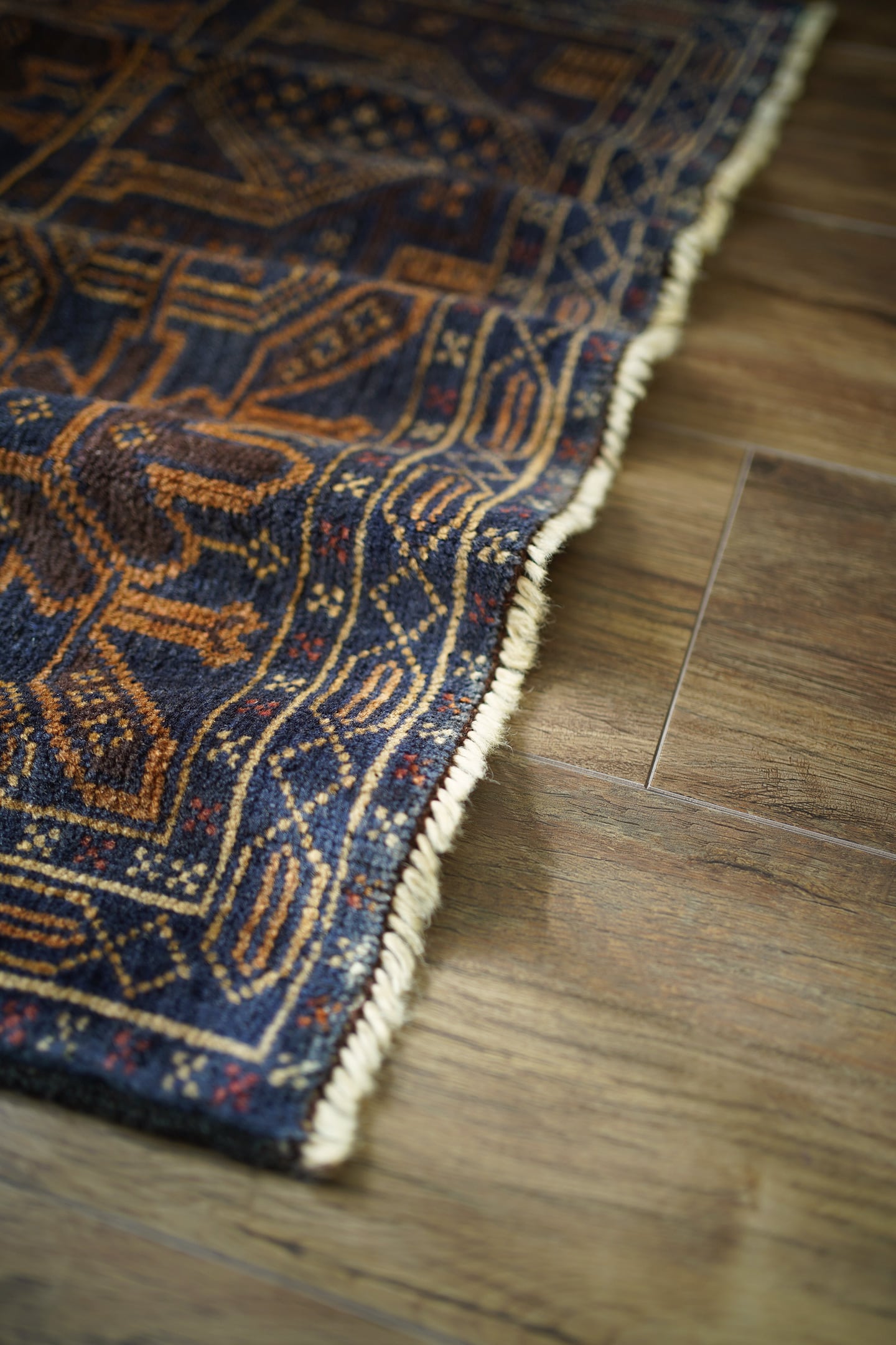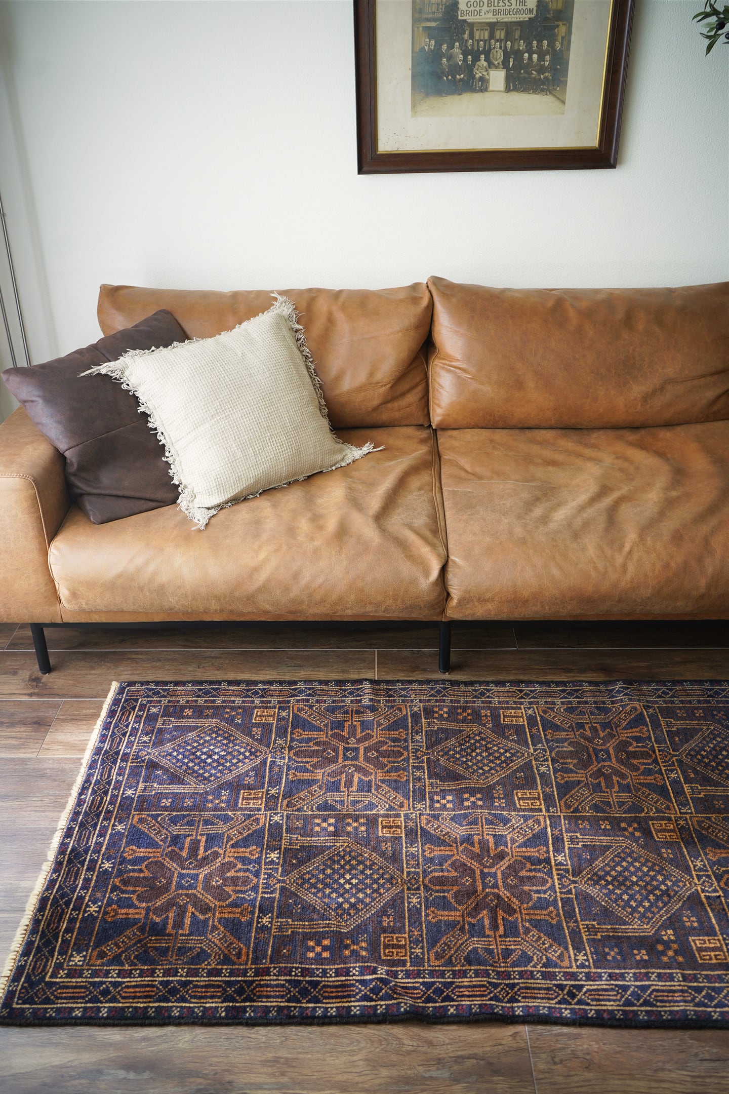 経年30年のアフガニスタン産のバルーチラグ。濃紺、ブラウン、キャメルの落ち着いた色合いの組み合わせに洗練された紋様デザインで様々なインテリアとも合わせやすく、スッとお部屋に馴染んでくれる一枚かと思います。パイルは短めでサラふわっと滑らかな肌触りをしており、オールシーズン快適にお使いいただける質感です。厚みは6mmほど。ダメージや補修された跡もなく大変良好なコンディション。ウォークインクローゼットやリビングのちょっとしたスペースなどお好きな場所に。
